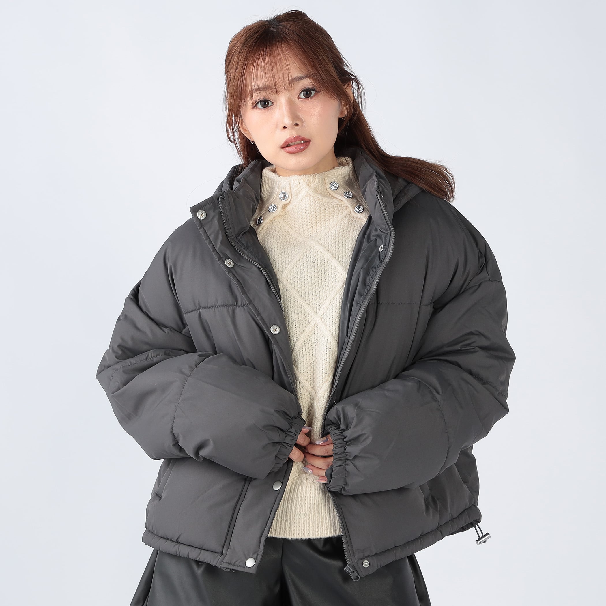 "後裾が長くなっているデザインがポイントの中綿キルトコート。ファイバーダウンを使用している為、従来の中綿よりもボリュームがあり暖かいです。裾部分がドロスト仕様になっているので、絞ると丸みのあるシルエットになり着用感が可愛いです。"