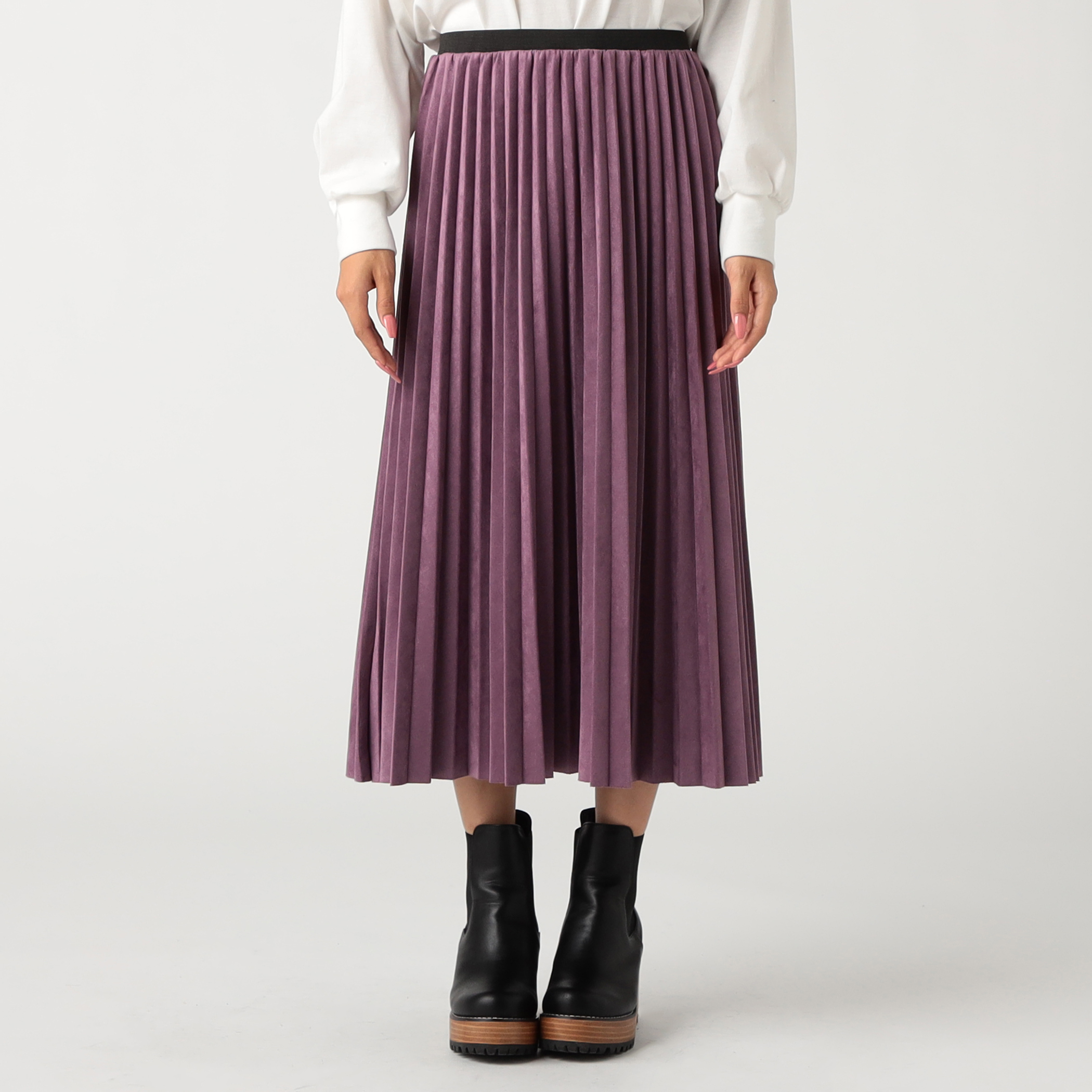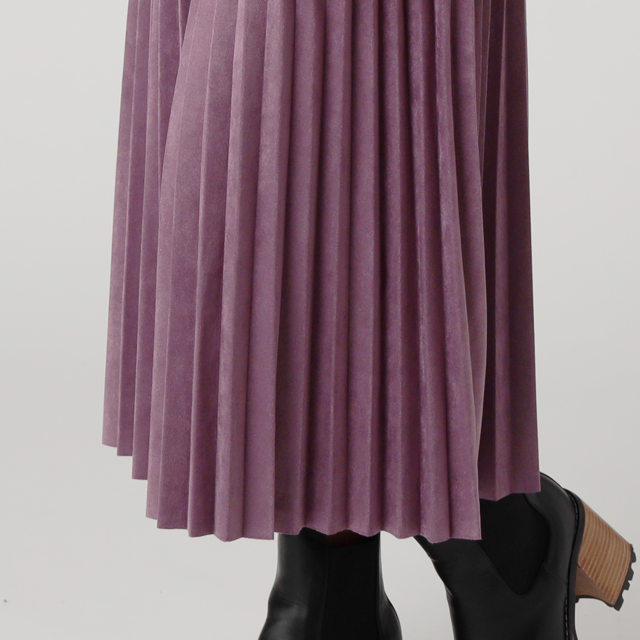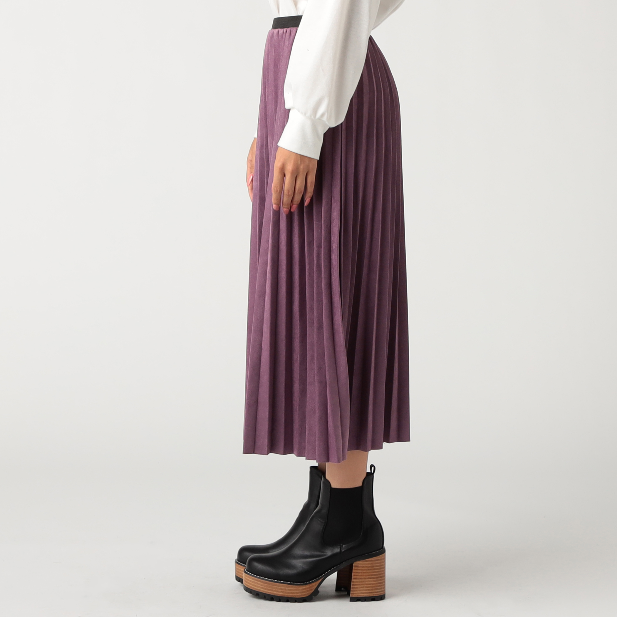 エレガントなスタイルを楽しめるアコーディオンプリーツスカート。ウエストはラクラク快適なゴム仕様です。マットな質感のスウェード調ポンチを使用していて、秋冬らしい目にも暖かな一枚へと仕上げています。安心のロング丈です。