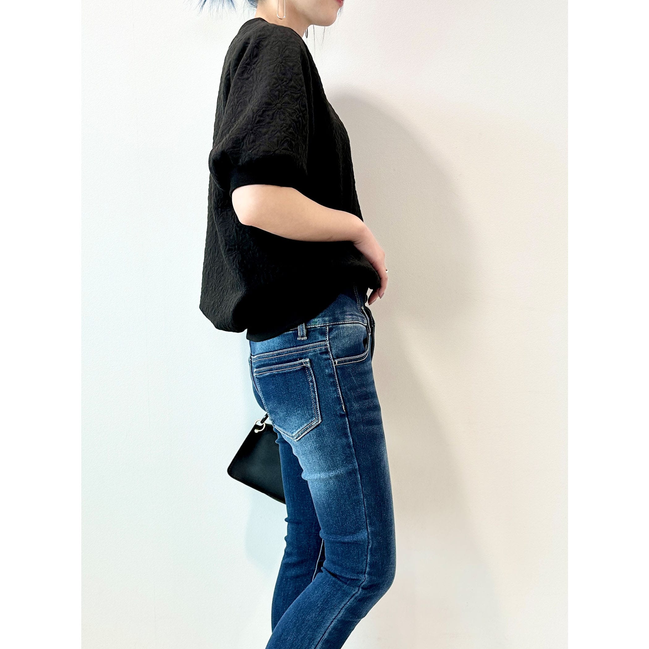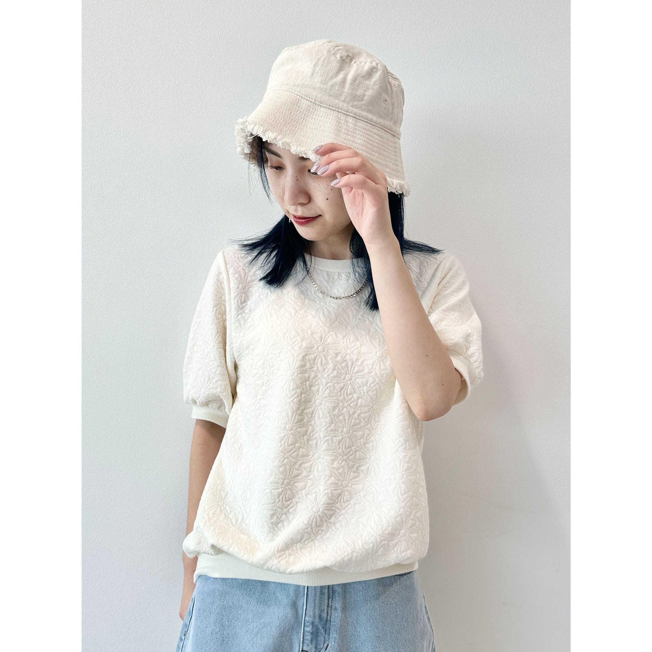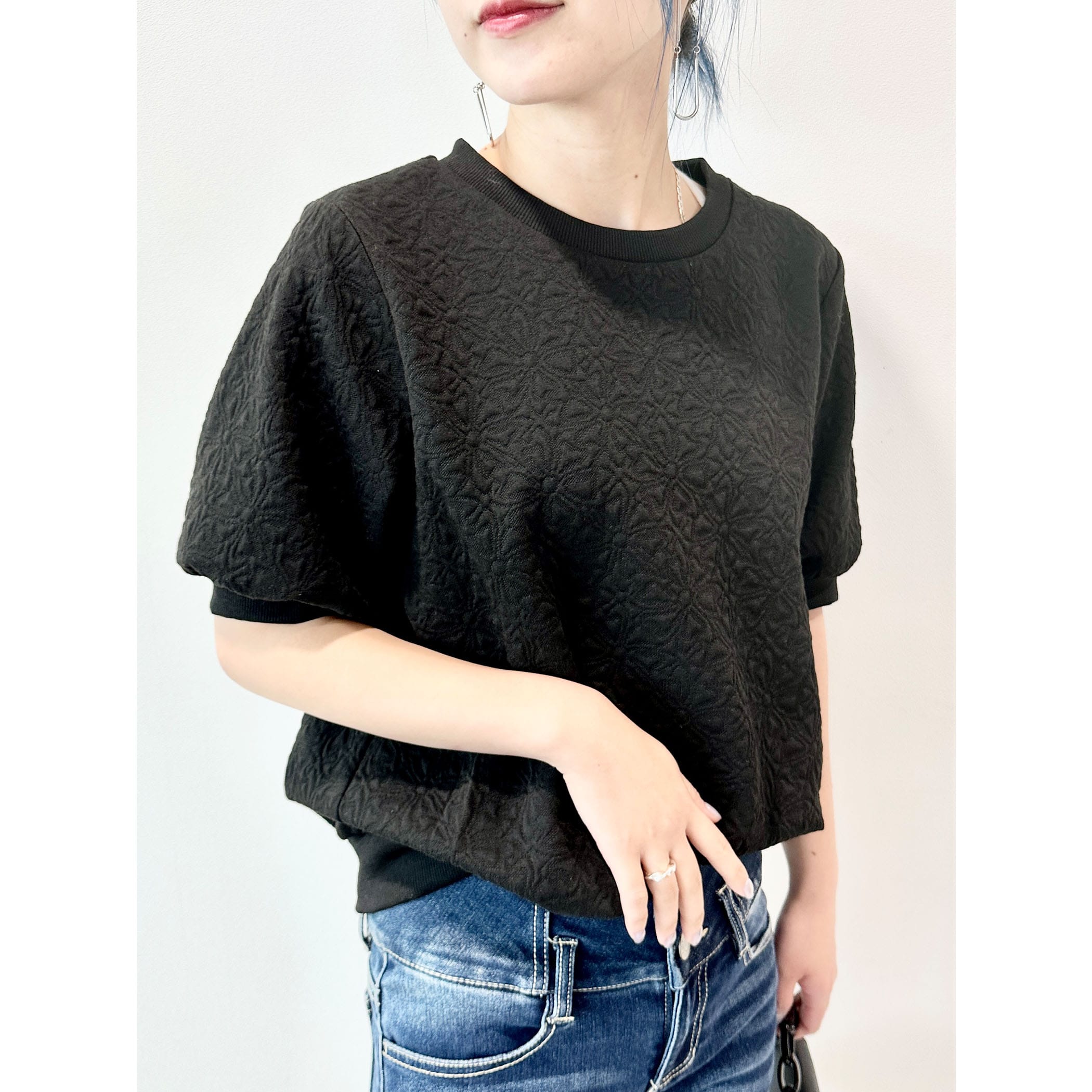 凹凸感のある花柄が新鮮な半袖プルオーバー。形はベーシックなので、スカートにもパンツにも合わせやすい一枚です。一枚で存在感のある素材なので着るだけでコーディネートのアクセントになります。お手持ちのワードローブに加えていただきたいアイテムです。