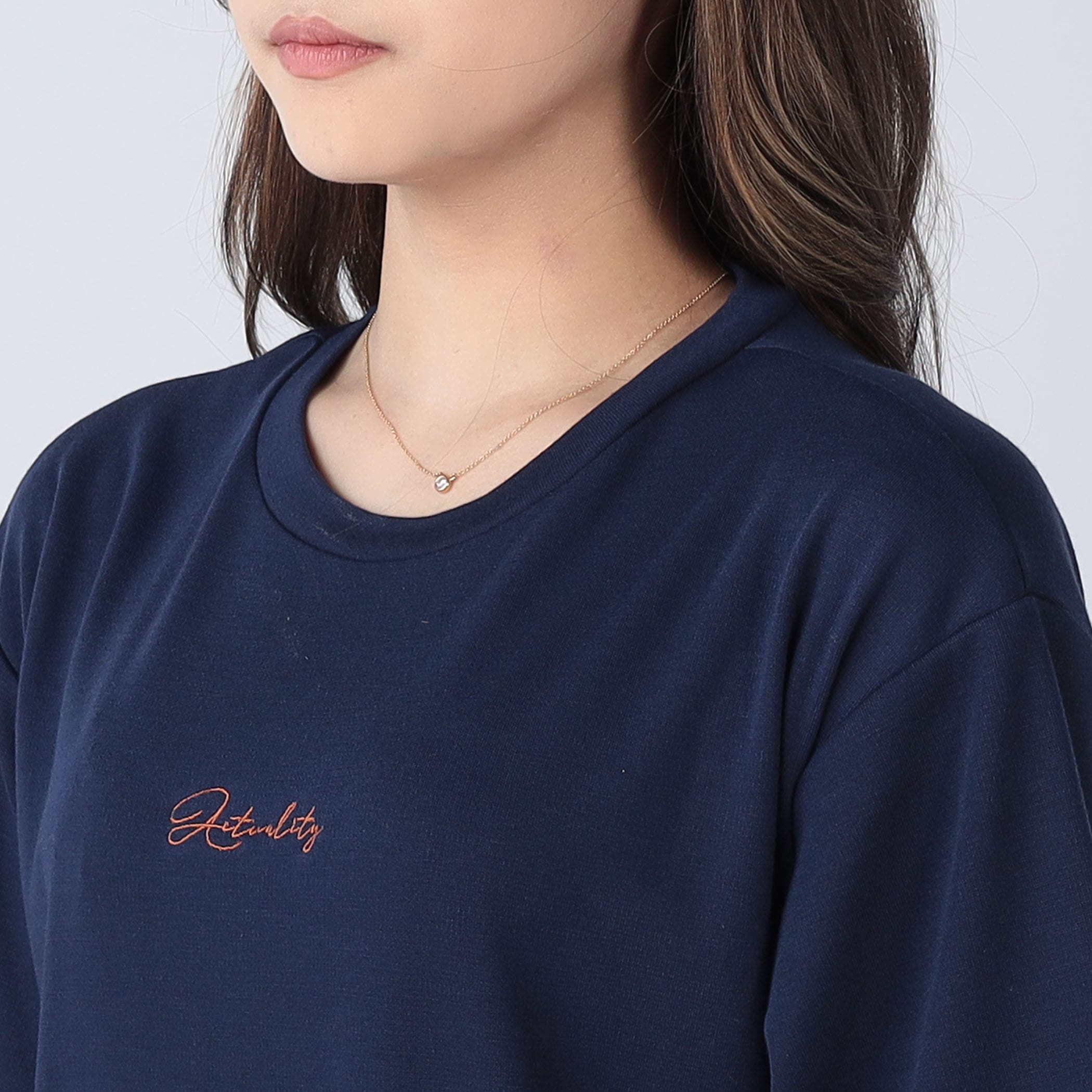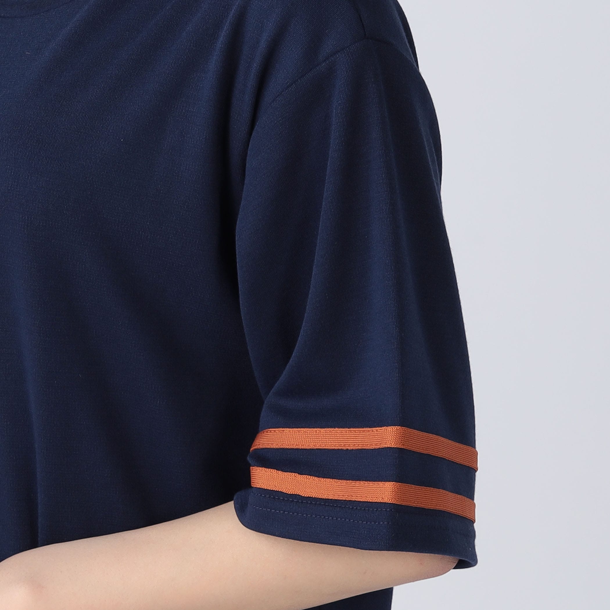 袖のラインがアクセントになったTシャツワンピース。さりげなく入った胸元の刺繍がこなれたおしゃれ感を演出してくれます。伸縮性のある素材で脇裾部分にスリットが入っているので、動きやすいのが嬉しいポイント◎