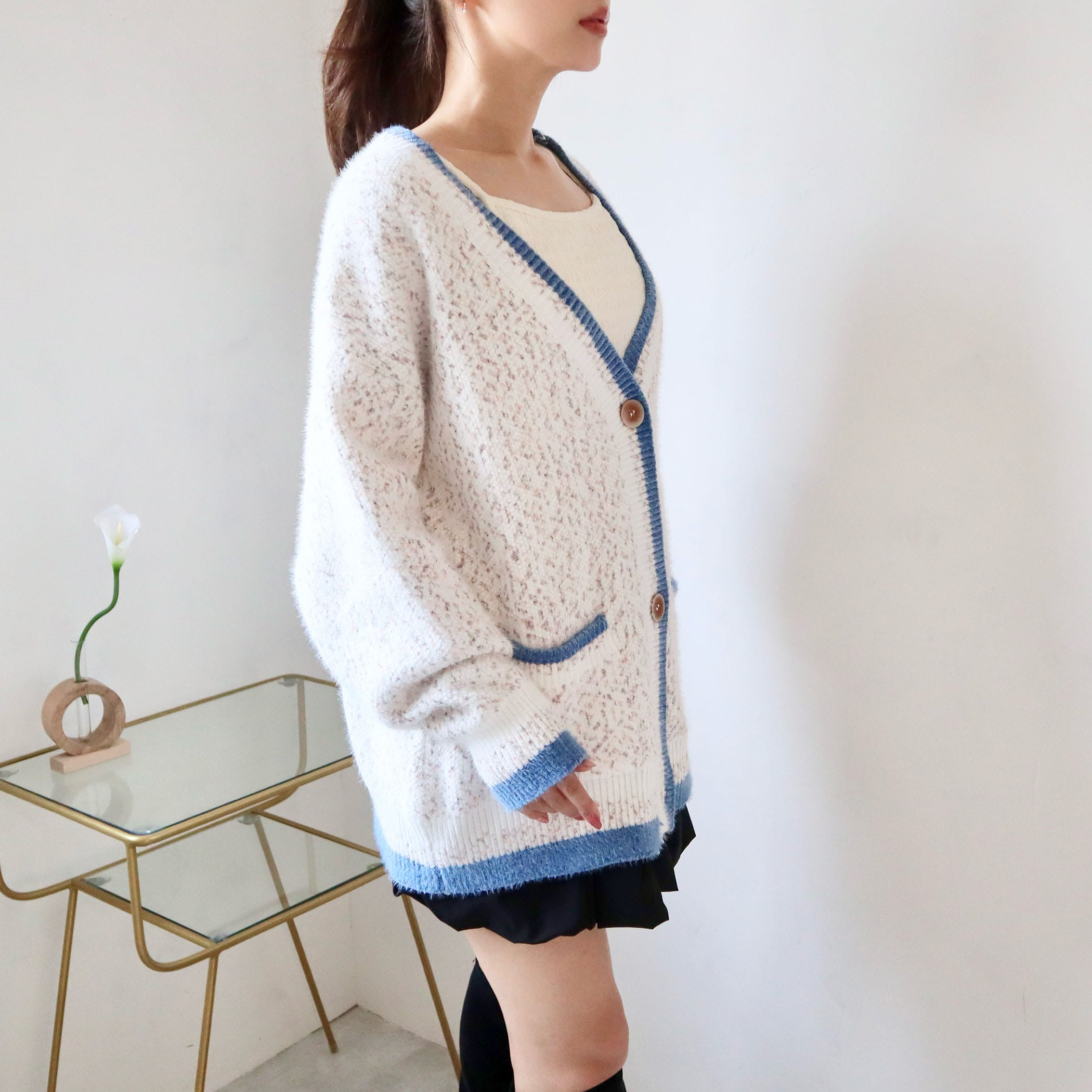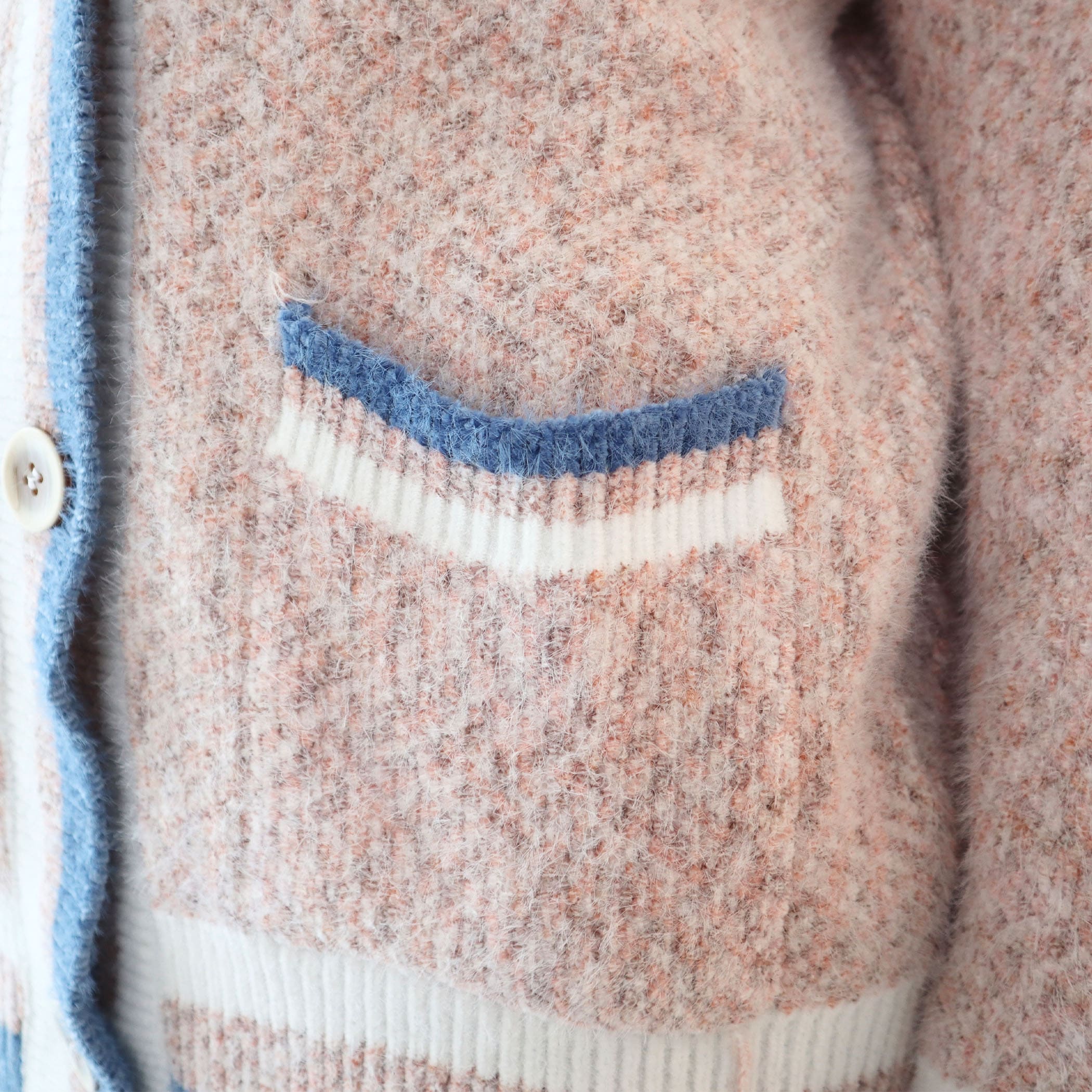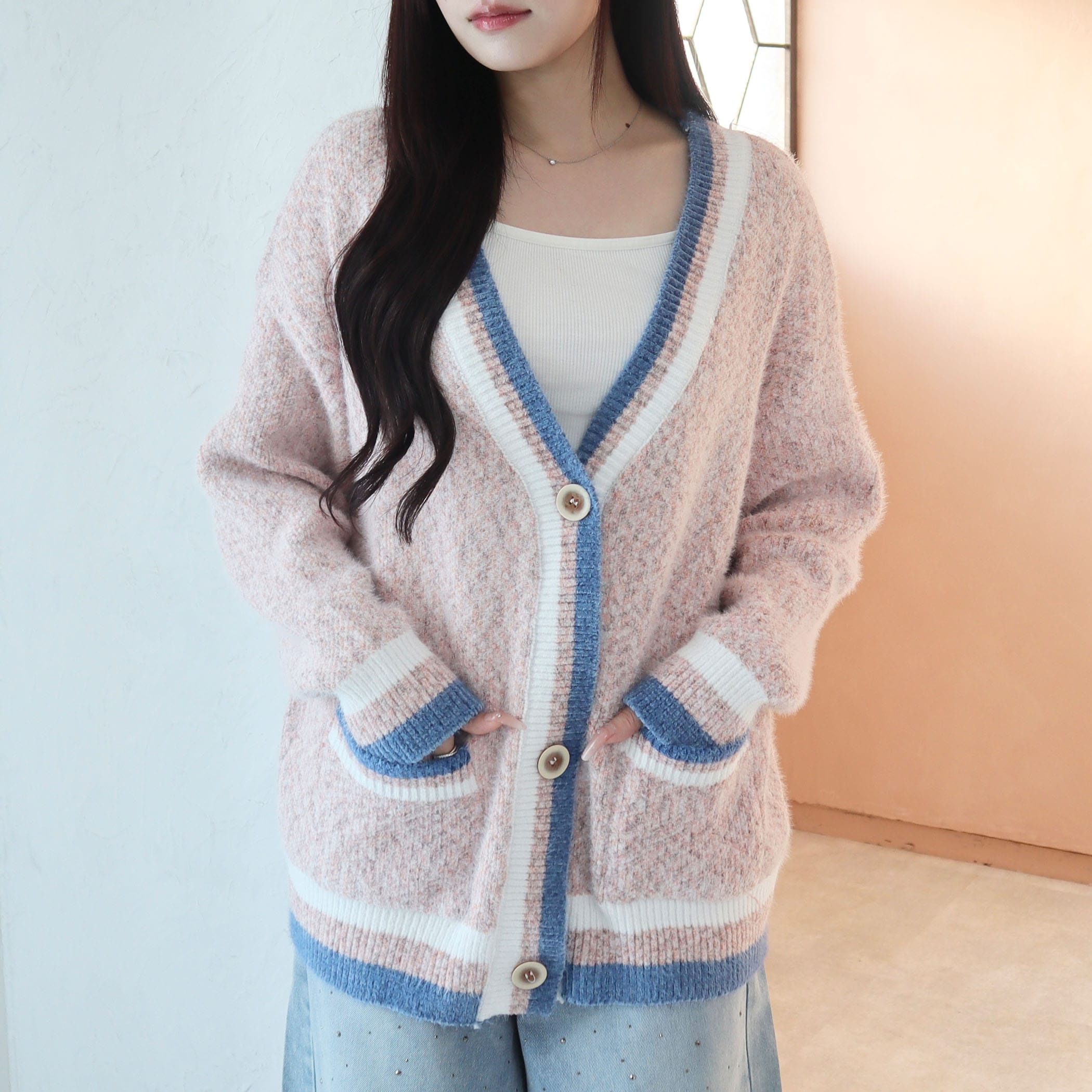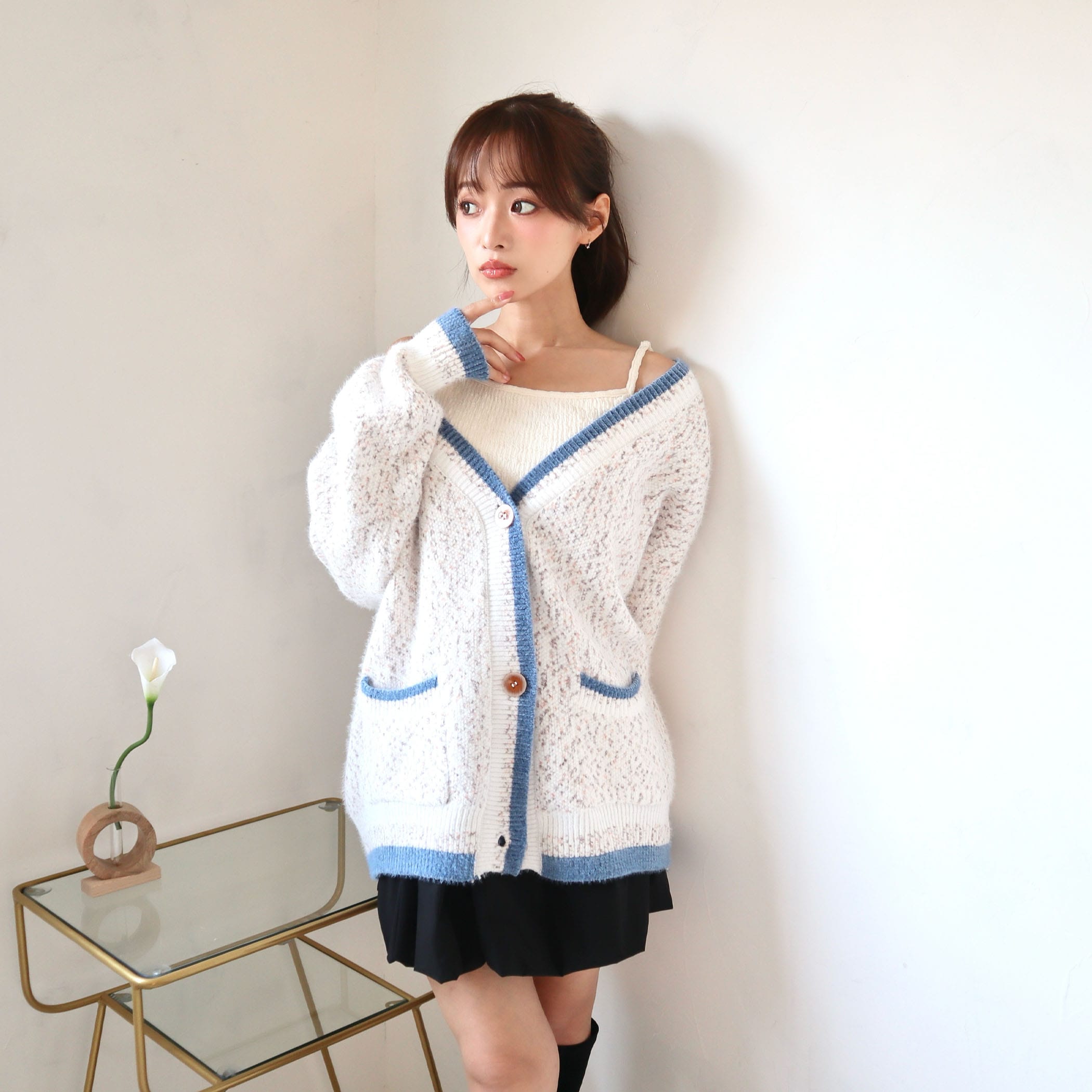オーバサイズが可愛い配色ニットカーディガン。ゆったりシルエットで、ネックラインの配色トリミングや、オシャレな色の組み合わせがポイント!ポケットが付いているため、リップや小物などを忍ばせたり実用性も抜群。前開けで羽織るようにさらっと着ても映え、様々な着こなしが楽しめます◎