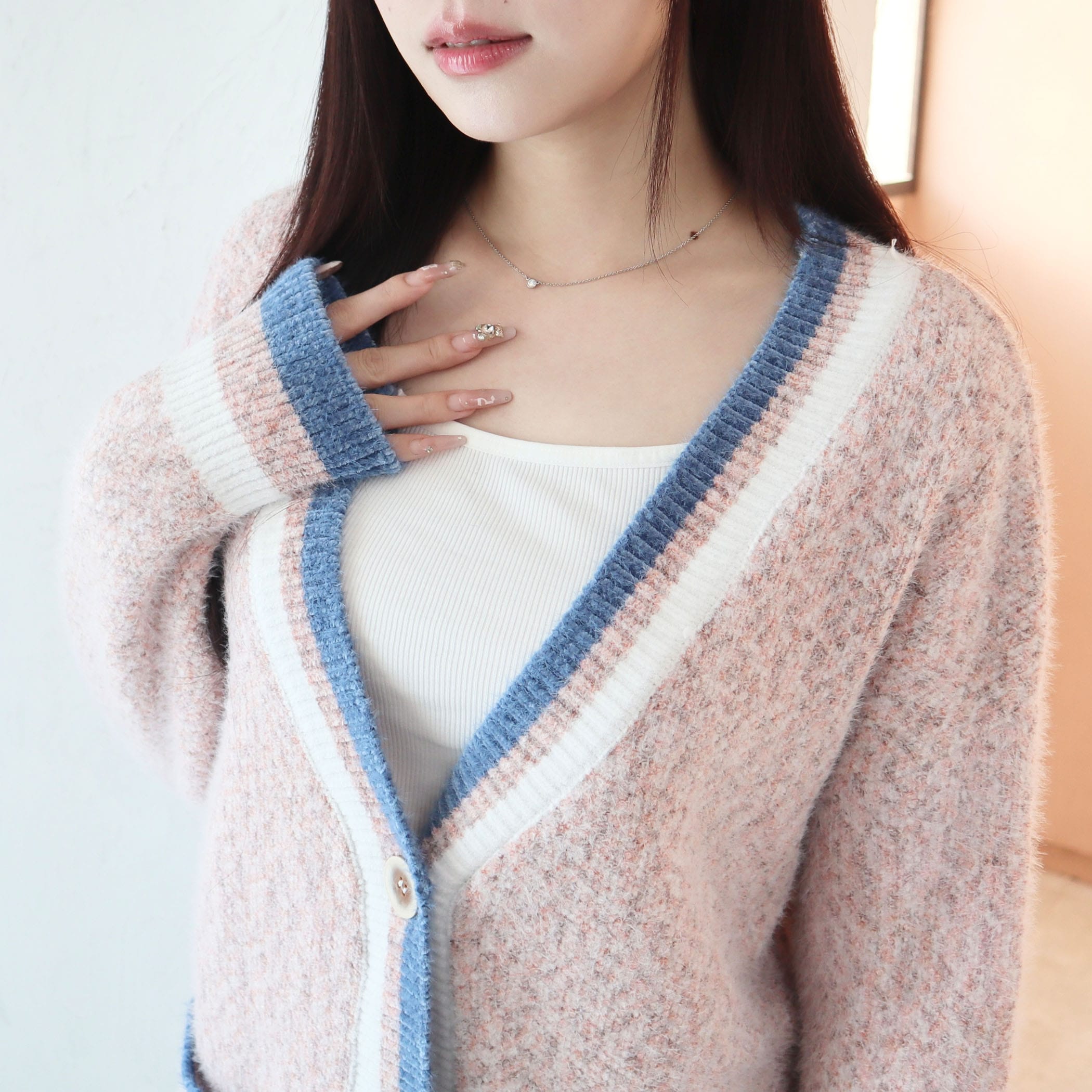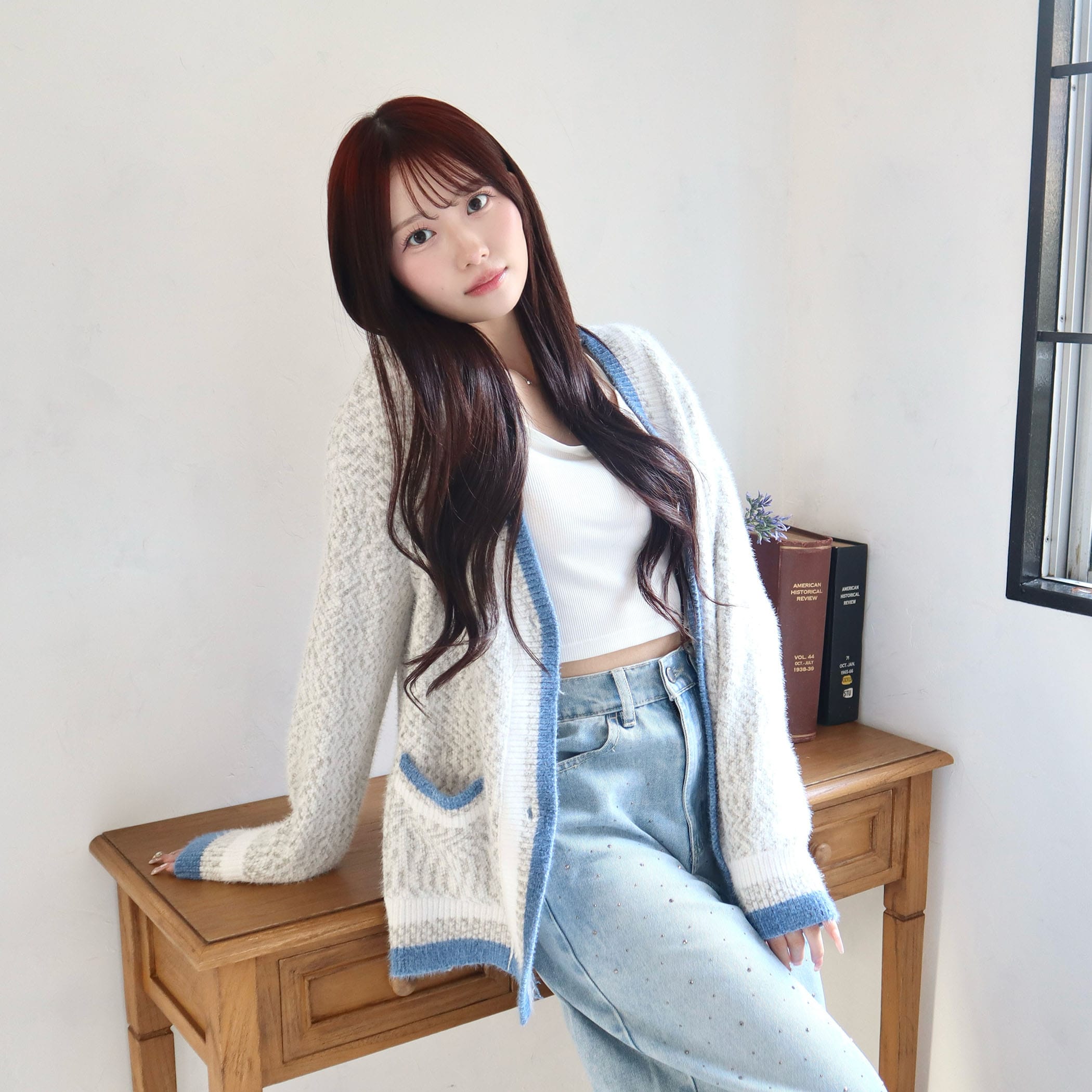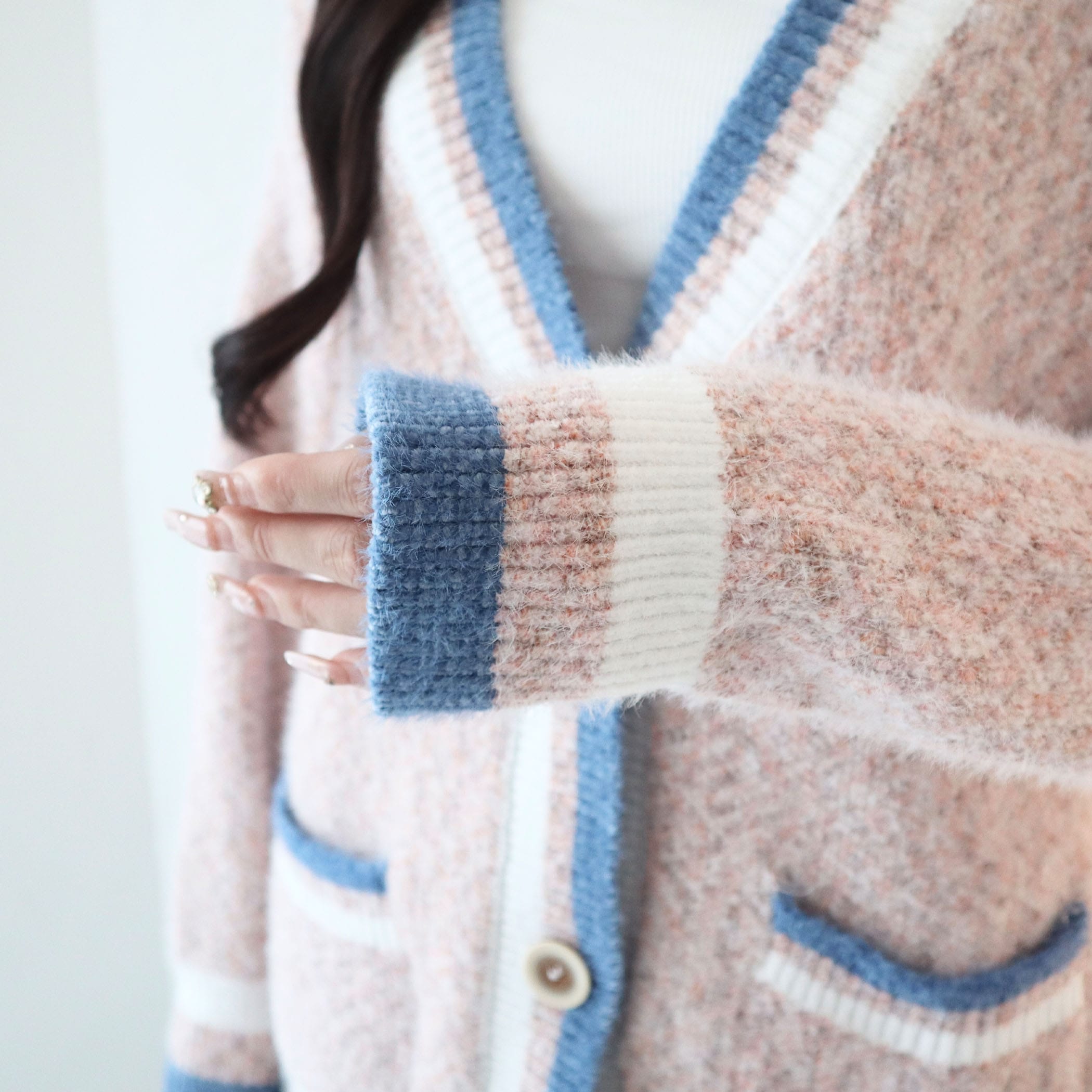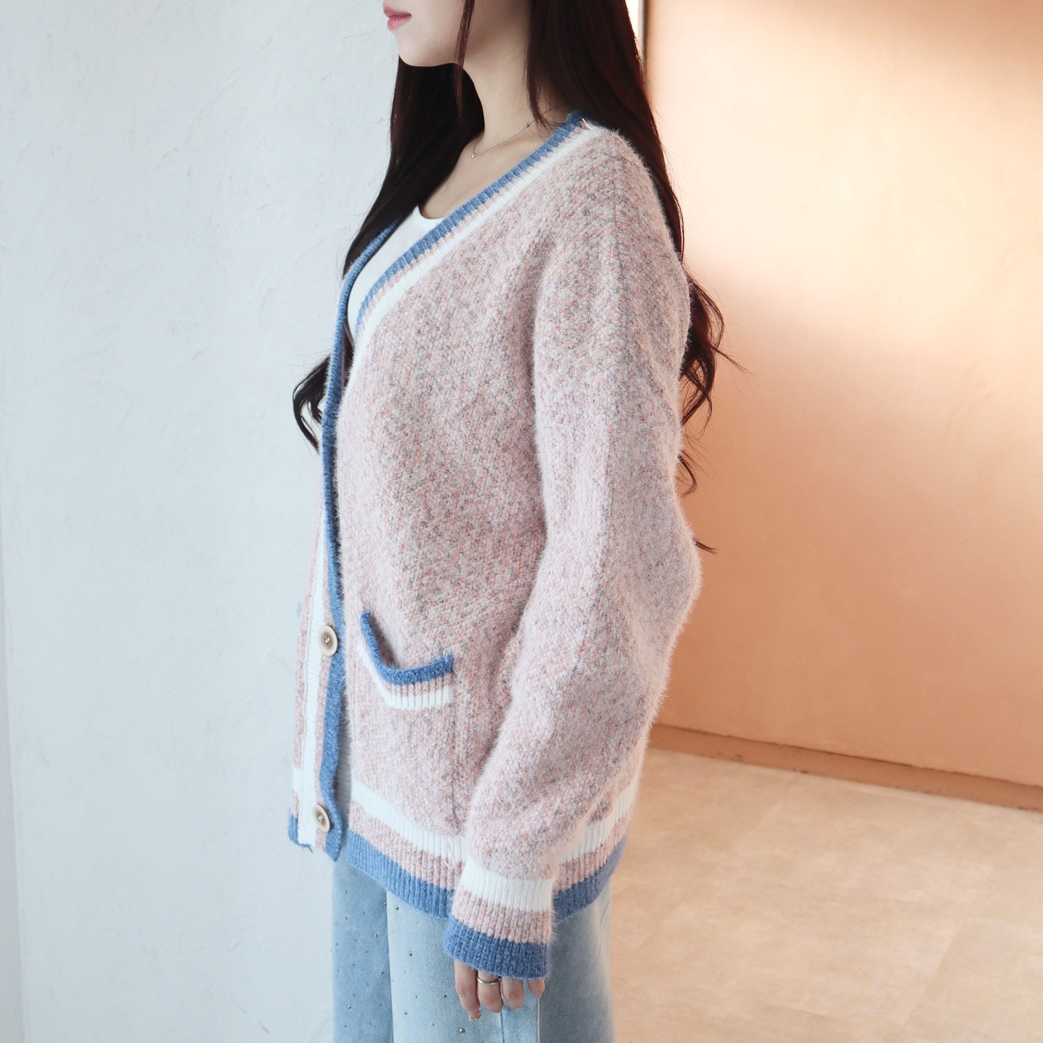 オーバサイズが可愛い配色ニットカーディガン。ゆったりシルエットで、ネックラインの配色トリミングや、オシャレな色の組み合わせがポイント!ポケットが付いているため、リップや小物などを忍ばせたり実用性も抜群。前開けで羽織るようにさらっと着ても映え、様々な着こなしが楽しめます◎