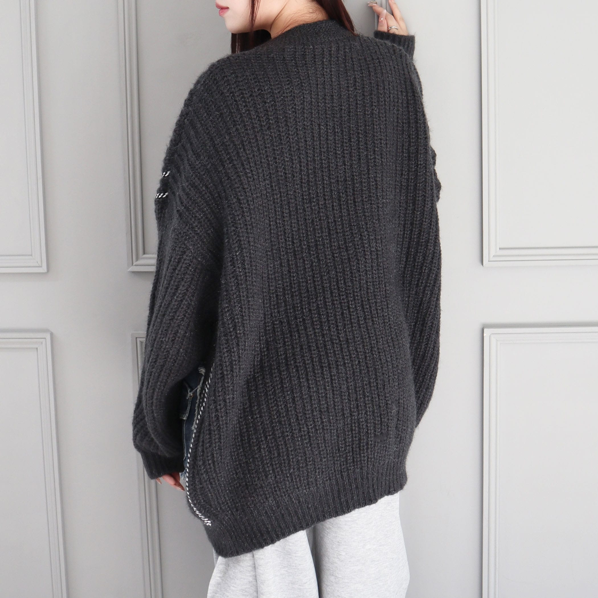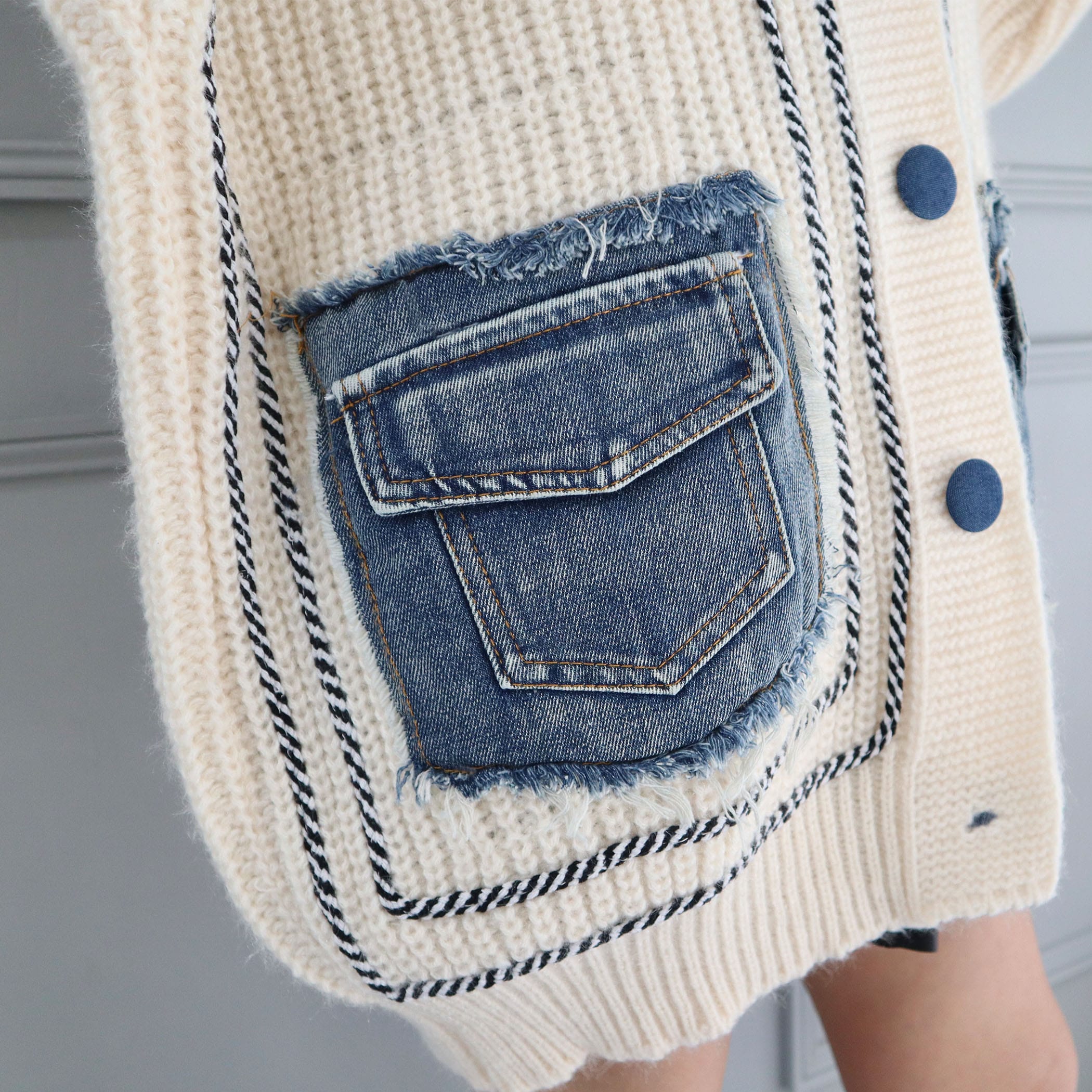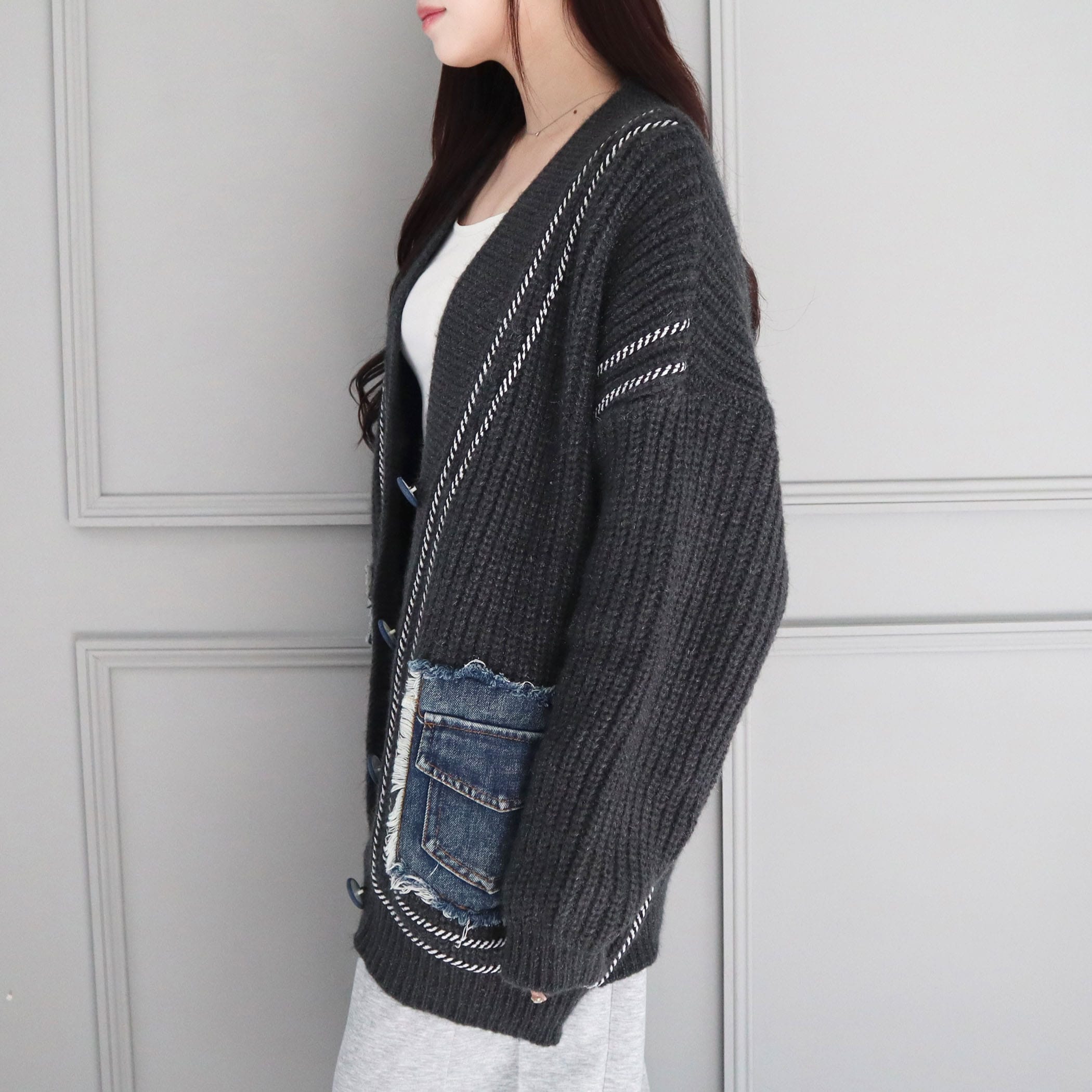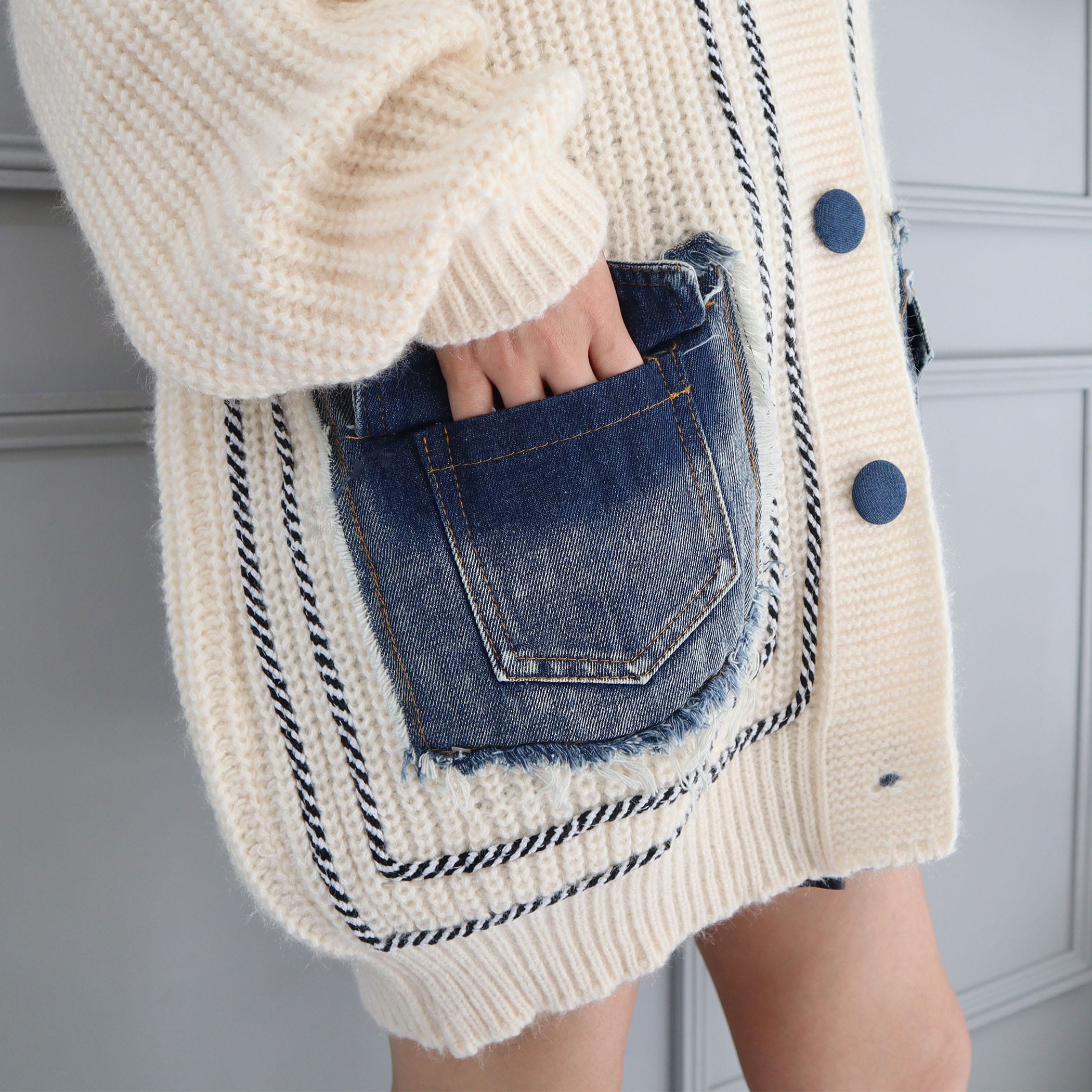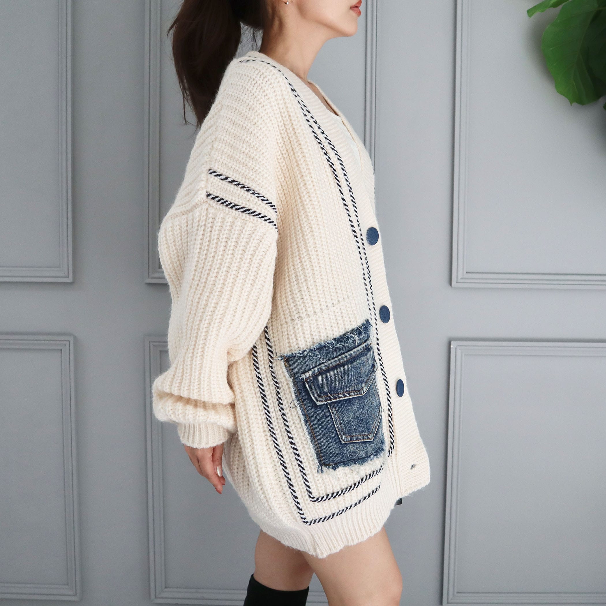 デニムポケットライン入りリブニットBIGカーディガン