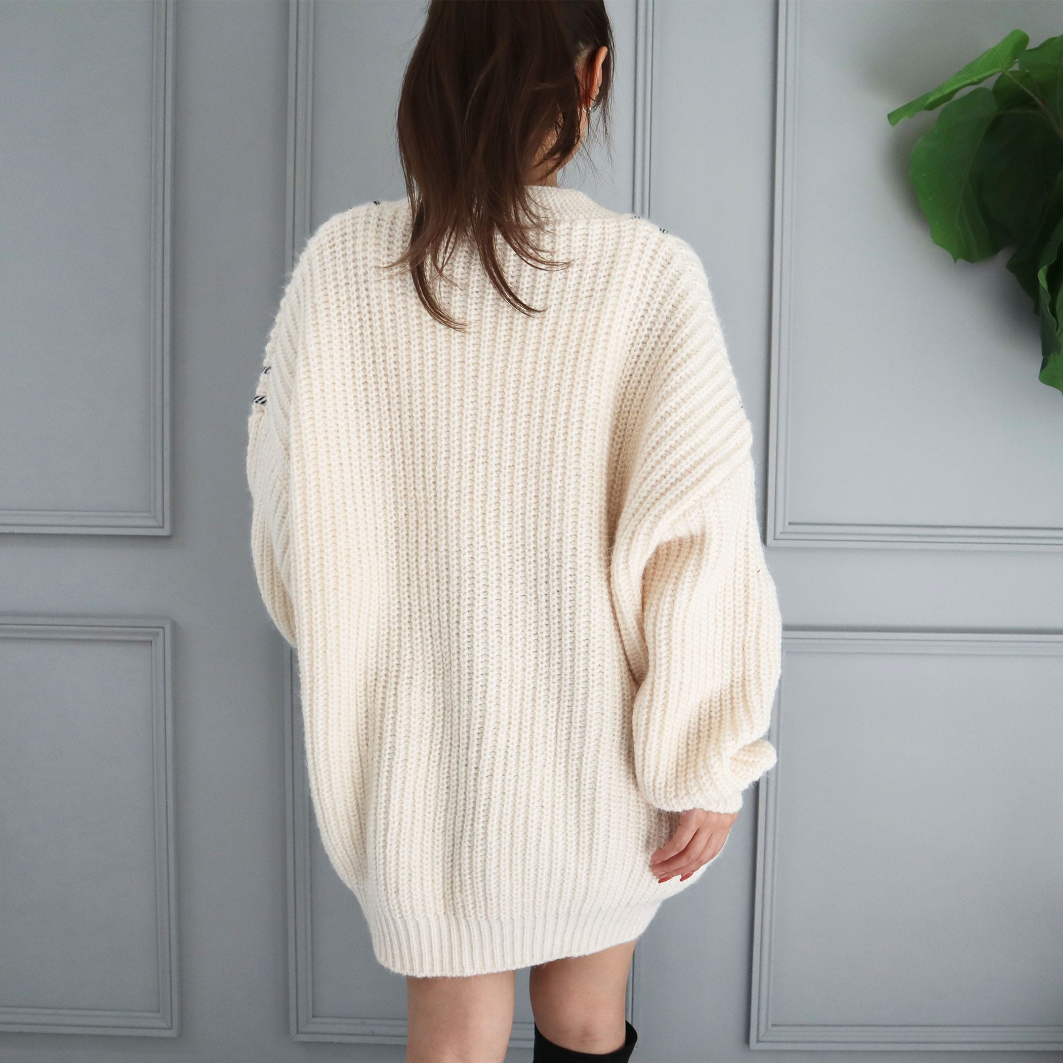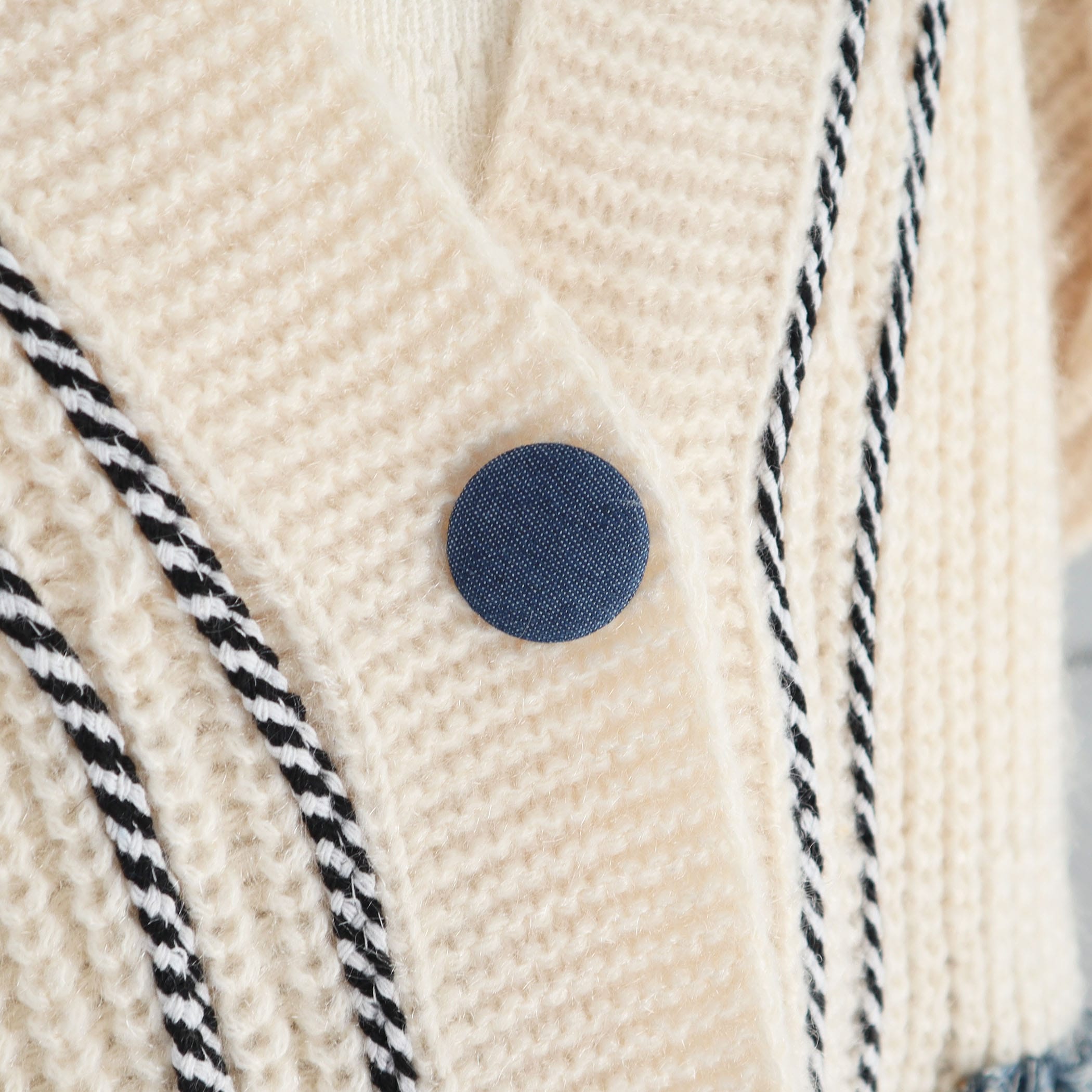 個性的なデザインが魅力のニットカーディガン。ざっくり編みニット×デニムのコンビネーションが、コーデにお洒落なアクセントを加えてくれます◎シンプルなインナーと合わせるだけで、存在感のあるスタイリングが完成♪