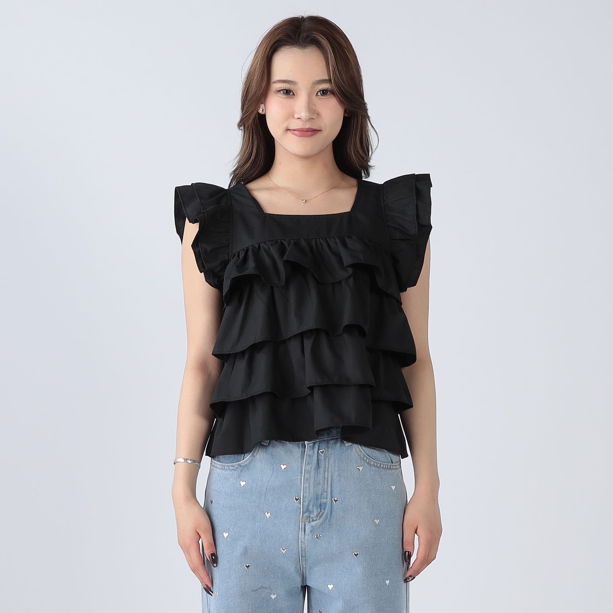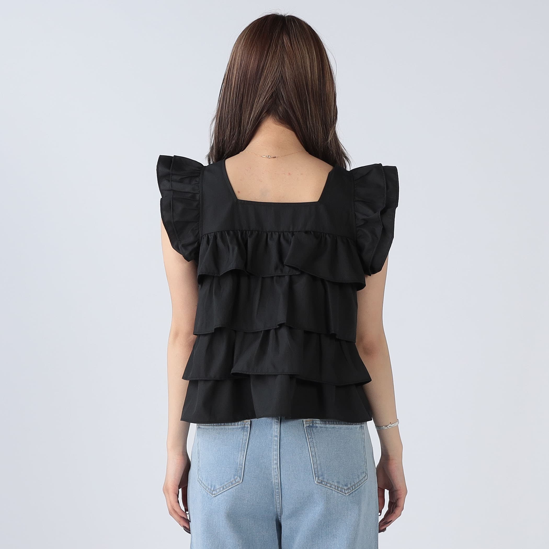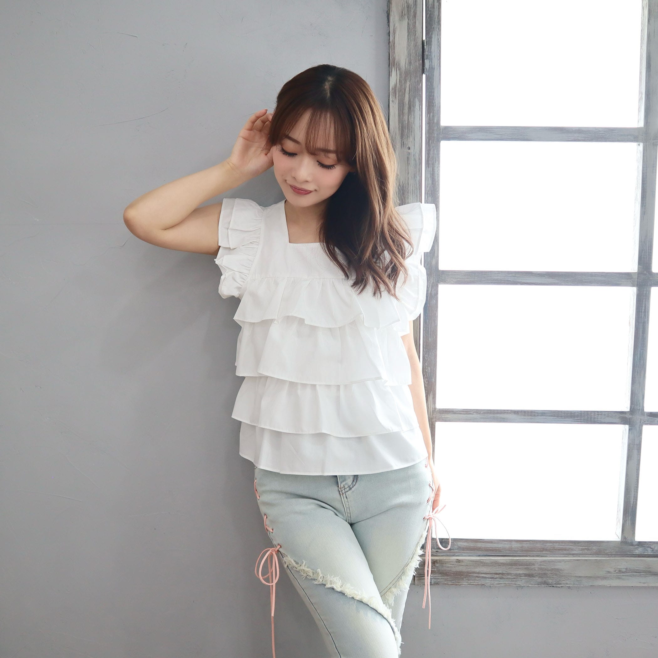 ティアードとフリルデザインが大人かわいいブラウス。フリルがフレンチスリーブのようなシルエットをメイクし、気になる二の腕もカバーしてくれます。短めの丈感でスタイルアップも叶います◎デニムに合わせるコーディネートがイチオシ!甘さを抑えたミックスコーデで大人の女性が着やすいスタイリングが完成します。きれいめなスラックスなどとも相性抜群。女性らしさがきゅっと詰まったブラウスは、パンツでカジュアルダウンしたコーデがおすすめです。普段使いから、お出かけまで幅広く活躍する一枚です。