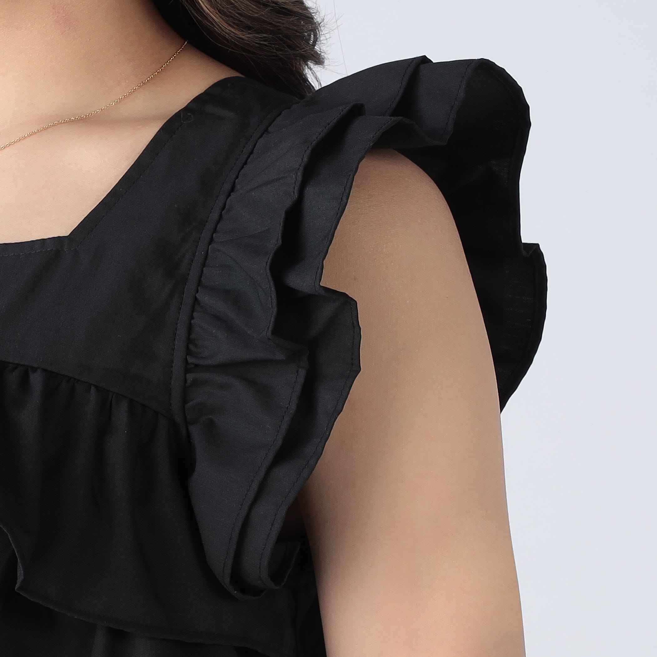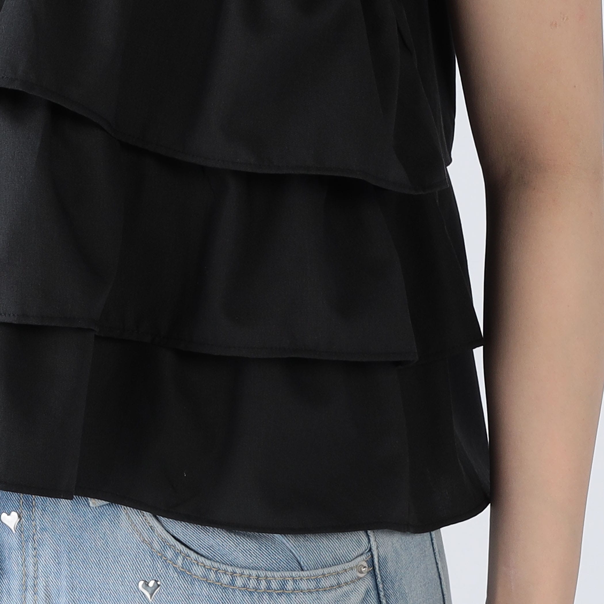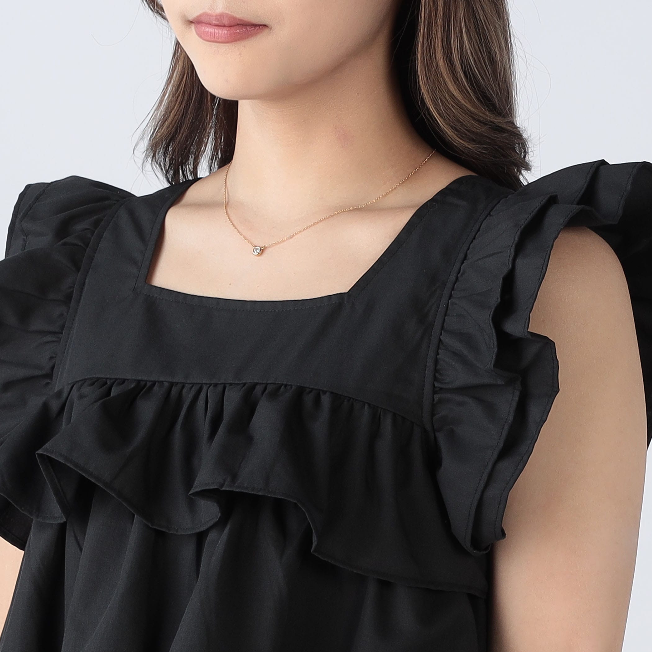 ティアードとフリルデザインが大人かわいいブラウス。フリルがフレンチスリーブのようなシルエットをメイクし、気になる二の腕もカバーしてくれます。短めの丈感でスタイルアップも叶います◎デニムに合わせるコーディネートがイチオシ!甘さを抑えたミックスコーデで大人の女性が着やすいスタイリングが完成します。きれいめなスラックスなどとも相性抜群。女性らしさがきゅっと詰まったブラウスは、パンツでカジュアルダウンしたコーデがおすすめです。普段使いから、お出かけまで幅広く活躍する一枚です。