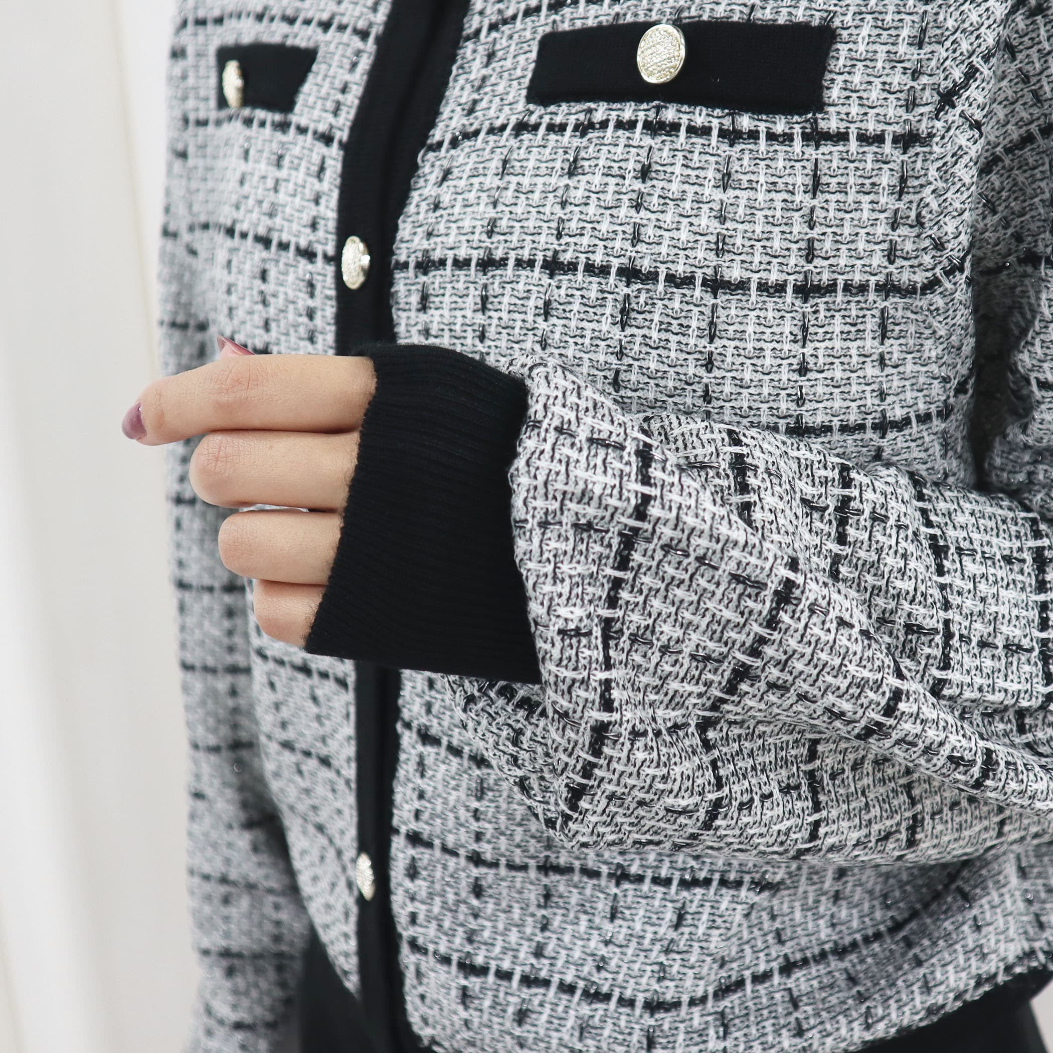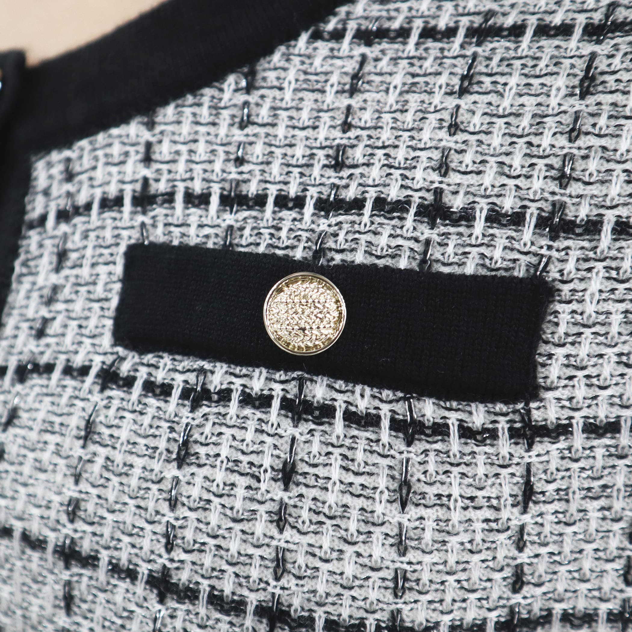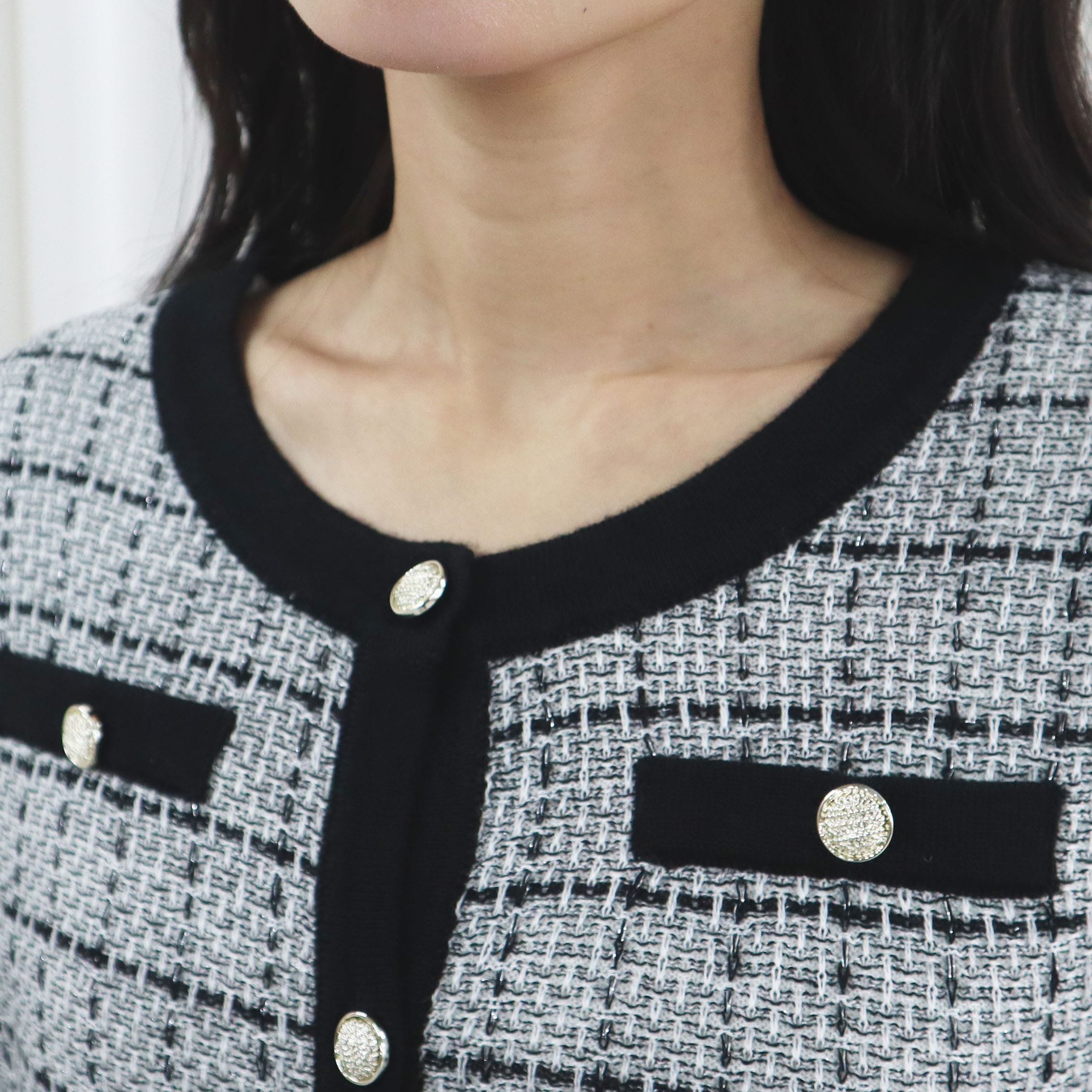 シーズンムード漂う上品カーディガン。ツイード風の編み柄に、ラメ糸を織り交ぜたきらめきが上品なクルーネックカーディガン。フロントにはキラッと光るビジューボタンを使用し、顔まわりを華やかに演出。きちんと感のあるデザインながら、ニットならではの柔らかさで着心地も抜群です。1枚で主役級の存在感があり、羽織としてはもちろんボタンを留めてトップス使いも◎幅広く着回せる万能アイテムです。