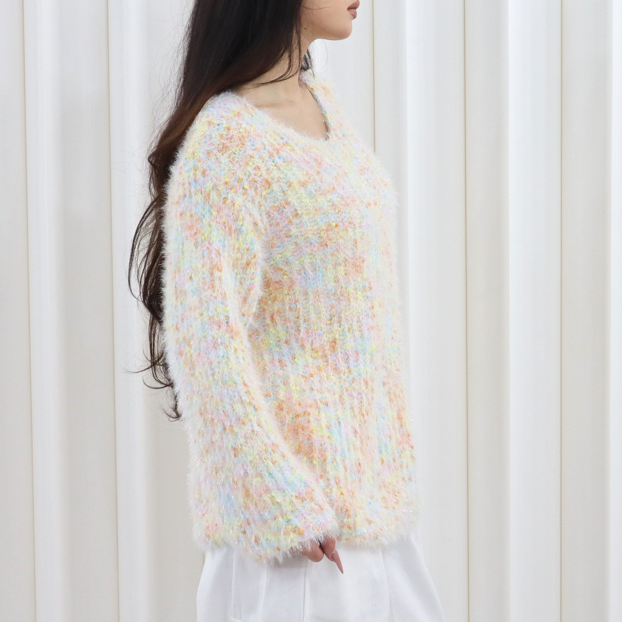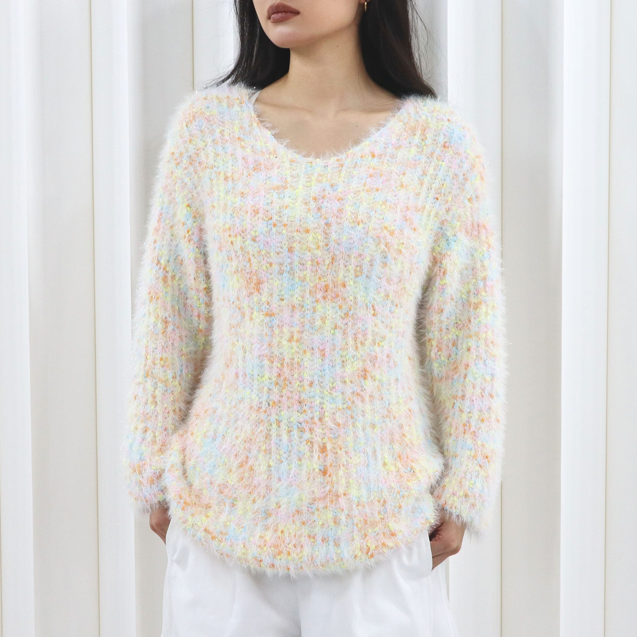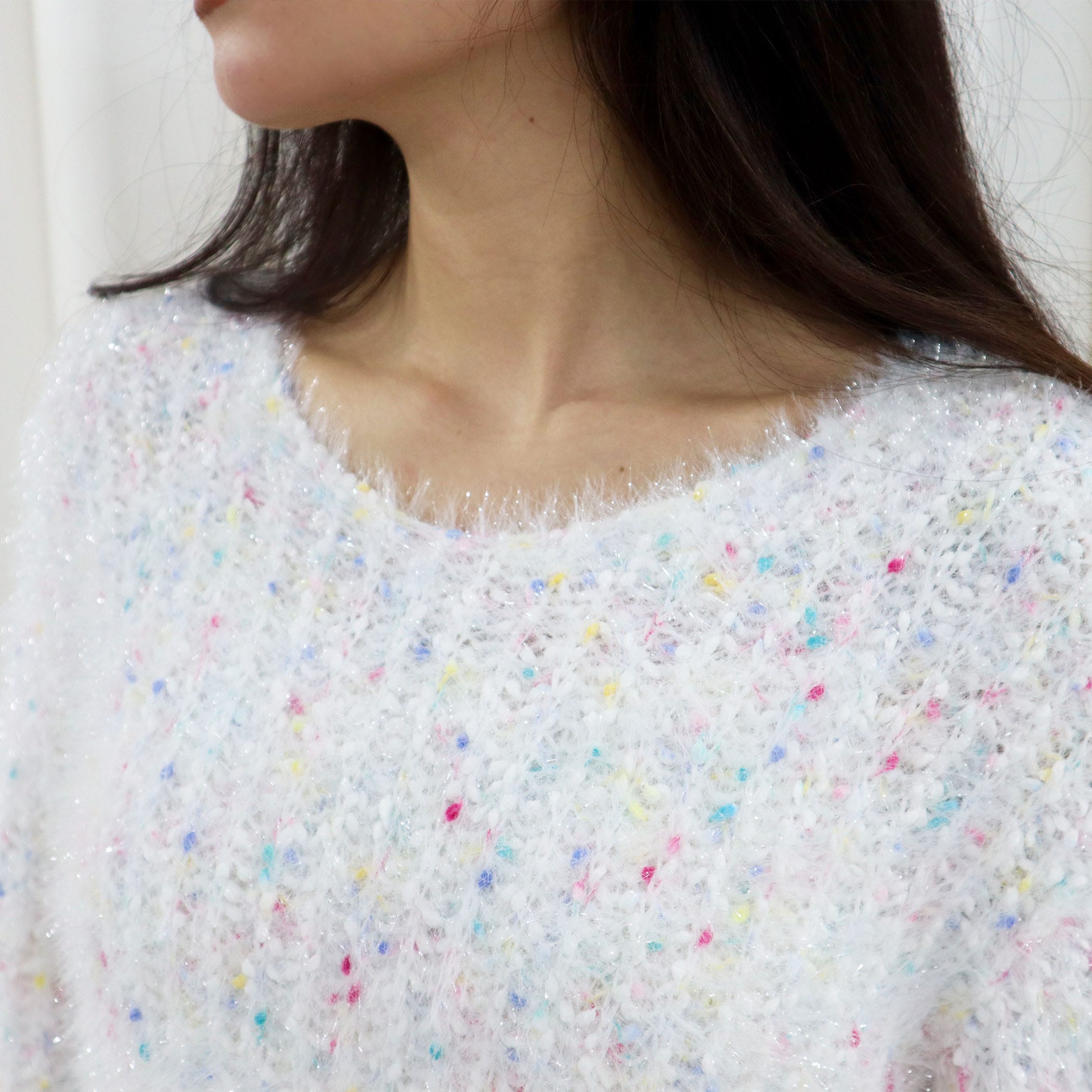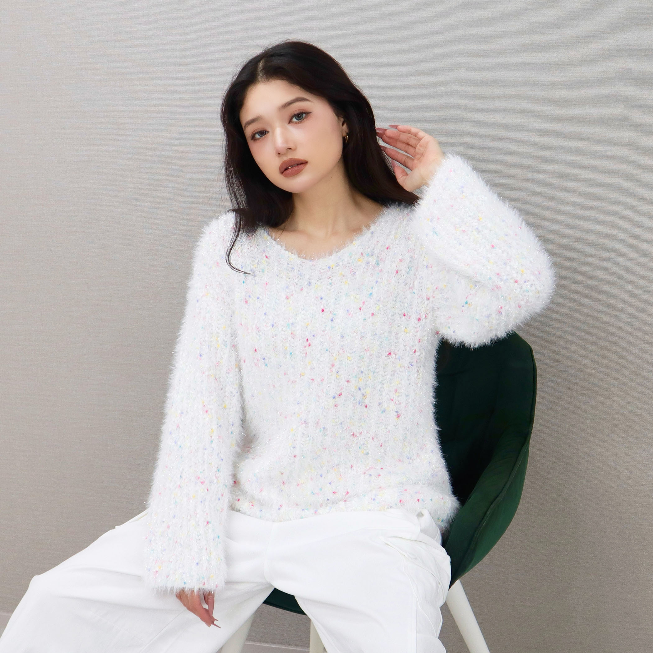 ぽてっとシルエットが可愛いMIXニットトップス。ポワッとしたシルエットが女性らしい印象に。Vネックで首元に抜け感を与えてくれます。MIX糸を使用したニット素材でコーデの主役に!シンプルなデニムやスラックス合わせでカジュアルスタイルに、スカートと合わせで女性らしいスタイルもおすすめです。Vネックなのでハイネックのインナーとレイヤードスタイルも◎