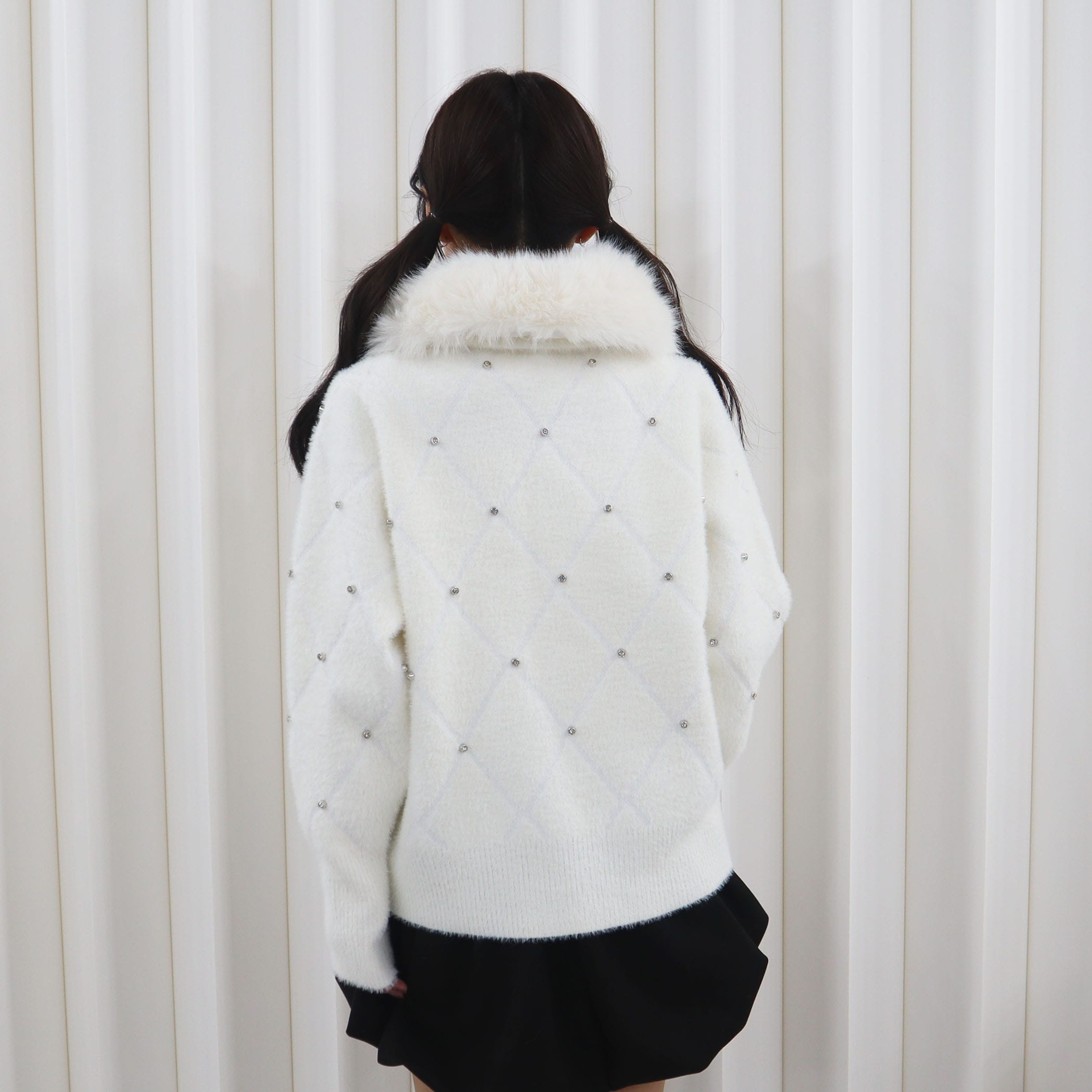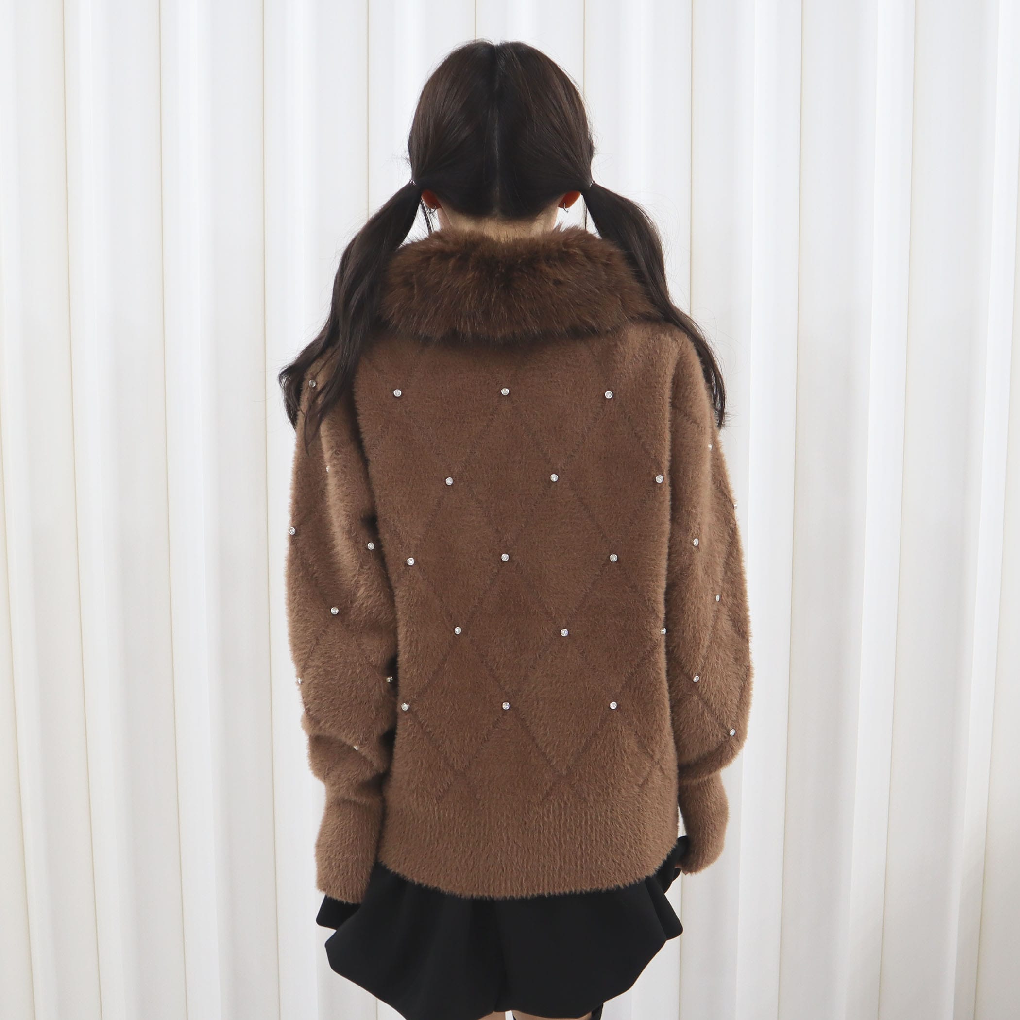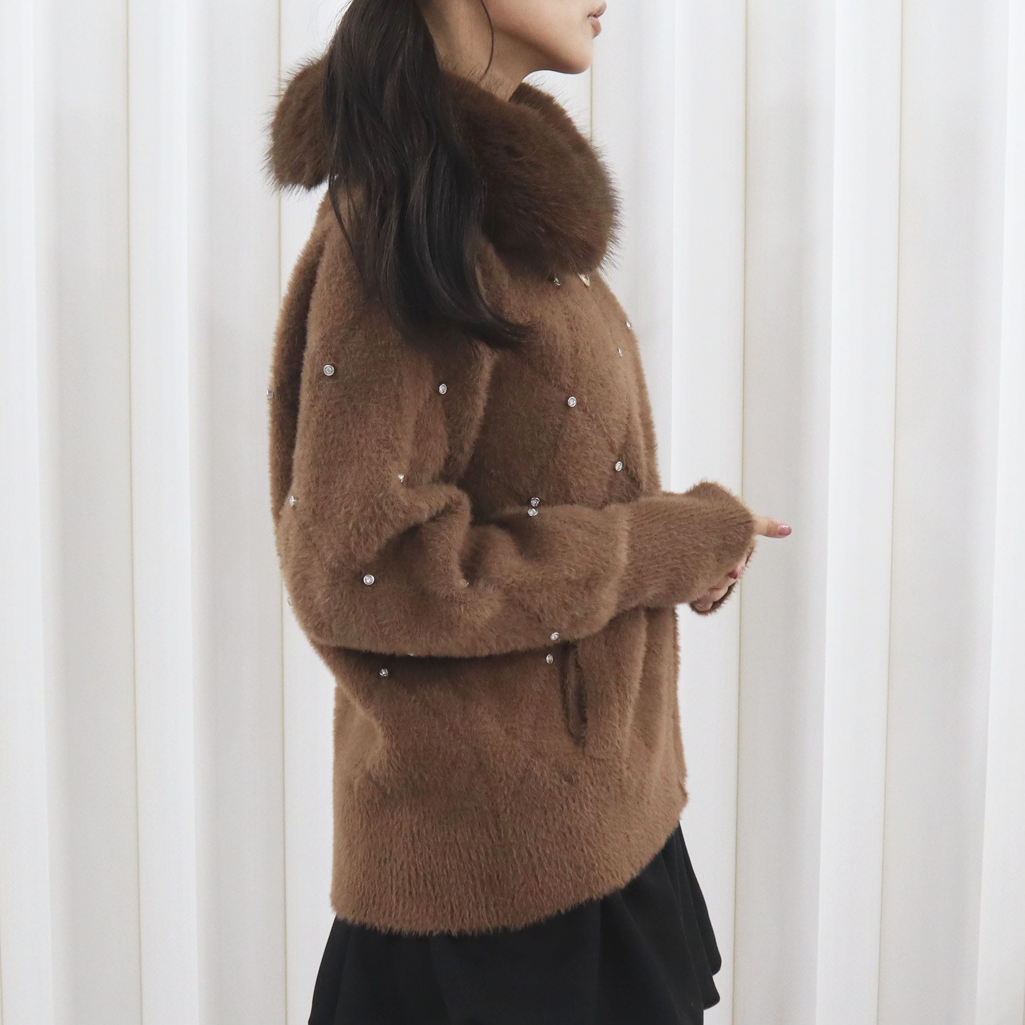 上品にな印象が叶うビジュー付きファー襟ニットカーデ。上品な印象ながら、ジップでカジュアルさをプラスしてバランスよく仕上げました。ファー付の襟は小顔効果も◎ファー襟は取り外し可能なので気分や気温で変えていただけます!ミニ丈のスカートやパンツ合わせがおすすめ。ファーを外してパンツ合わせもカジュアルに着ていただけます!ワンピースやロングスカート合わせも大人っぽくておすすめです◎