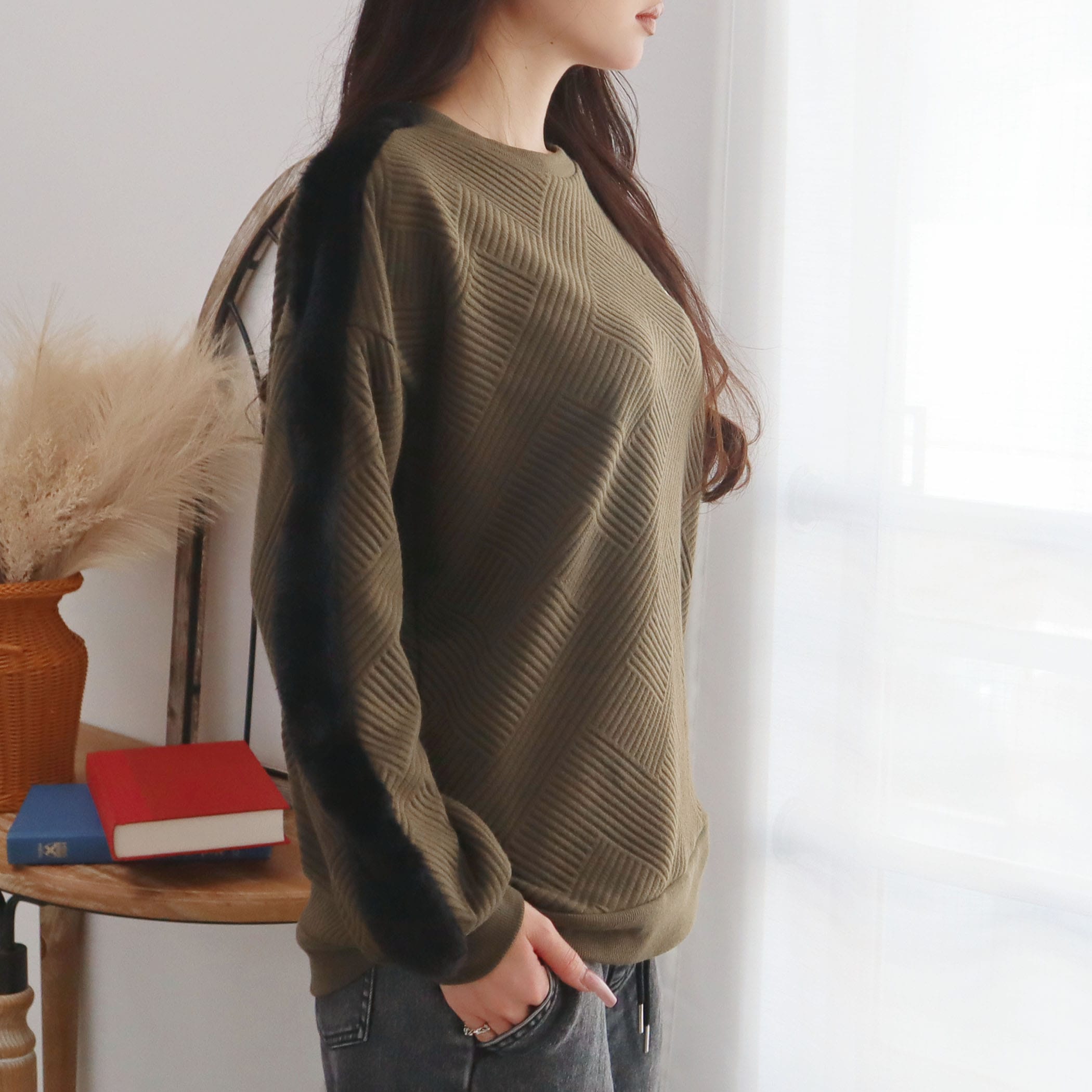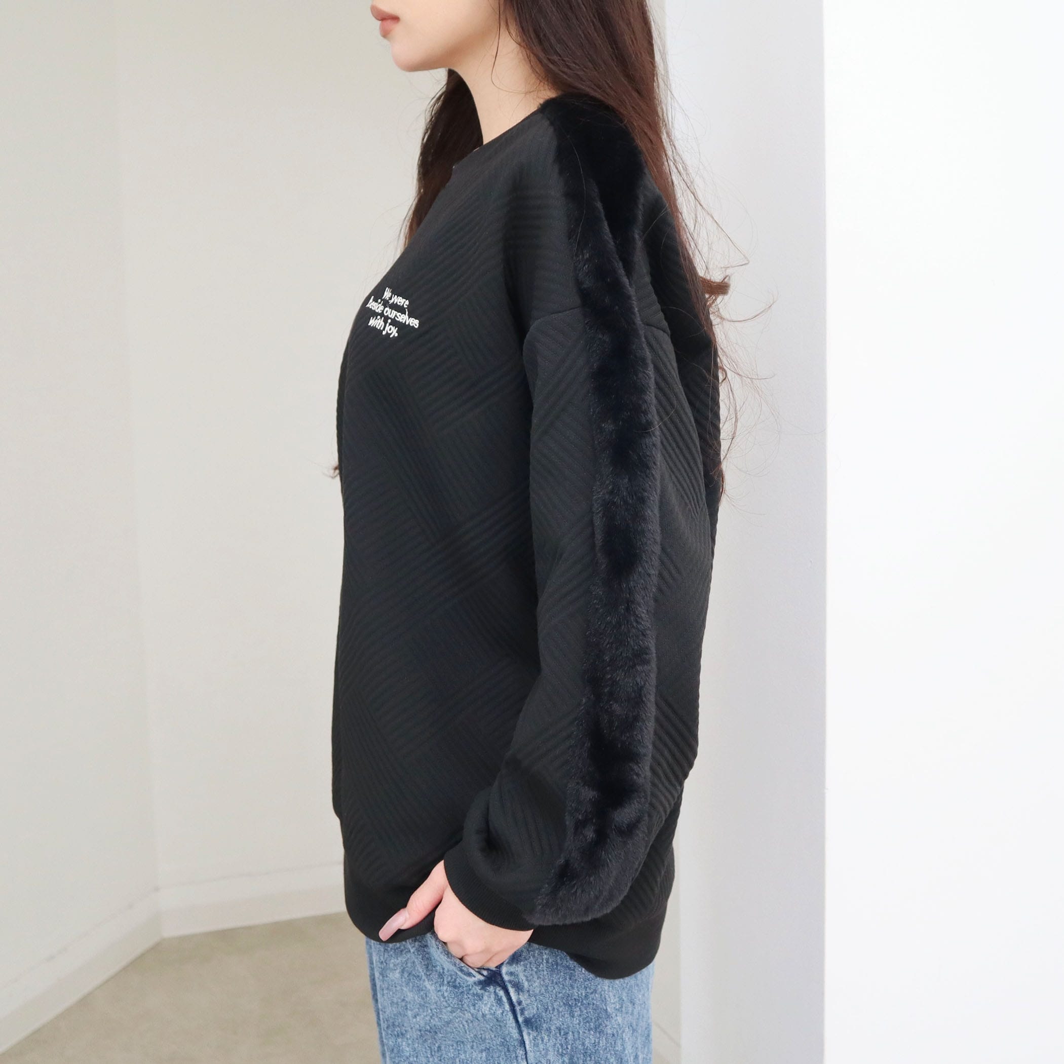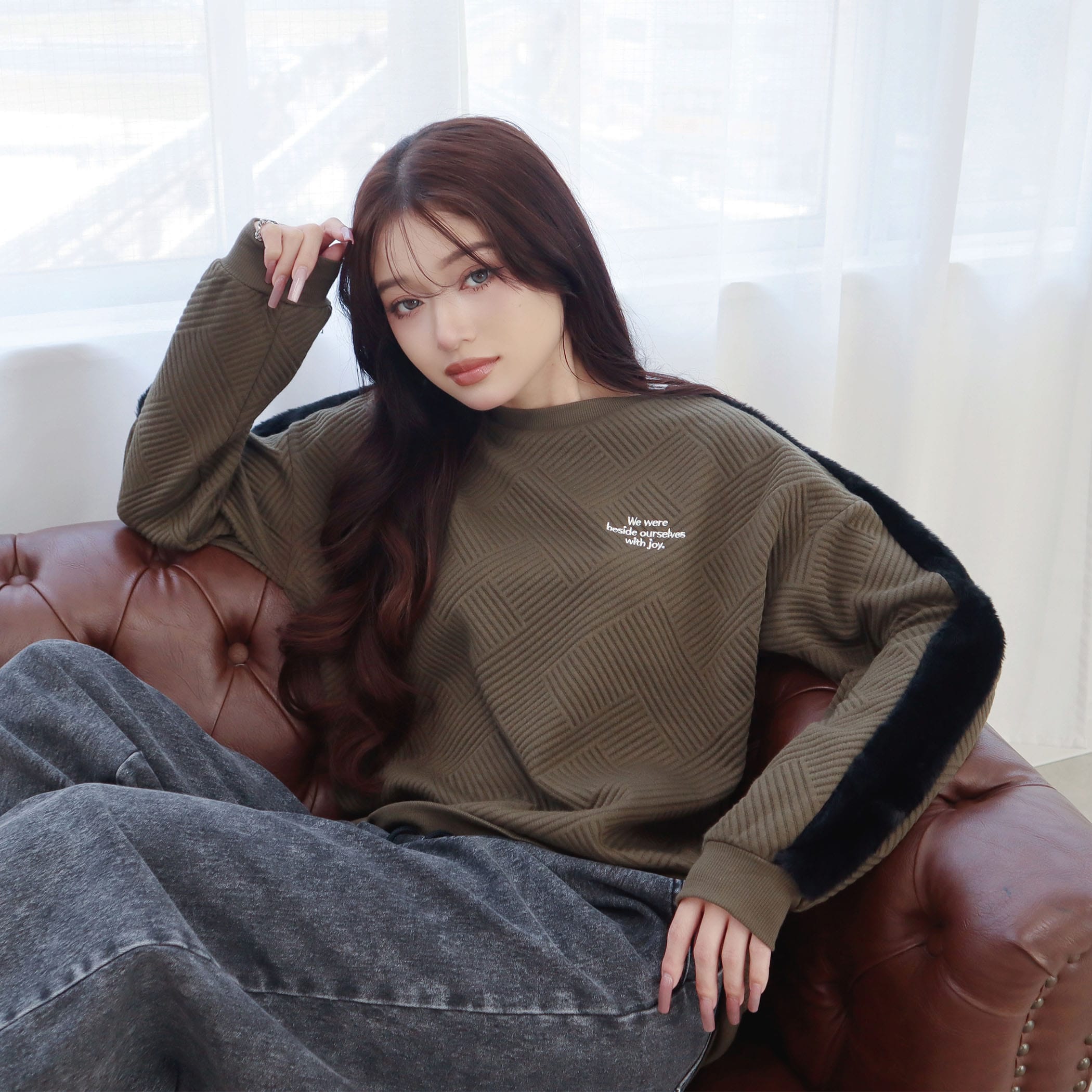 袖にあしらったファー×ライン配色が、コーデにほどよい甘さとトレンド感をプラス。ゆるっとしたドロップショルダーでこなれた雰囲気に仕上がるトップスです。シンプルボトムと合わせるだけでバランスよく決まる着映えアイテム。