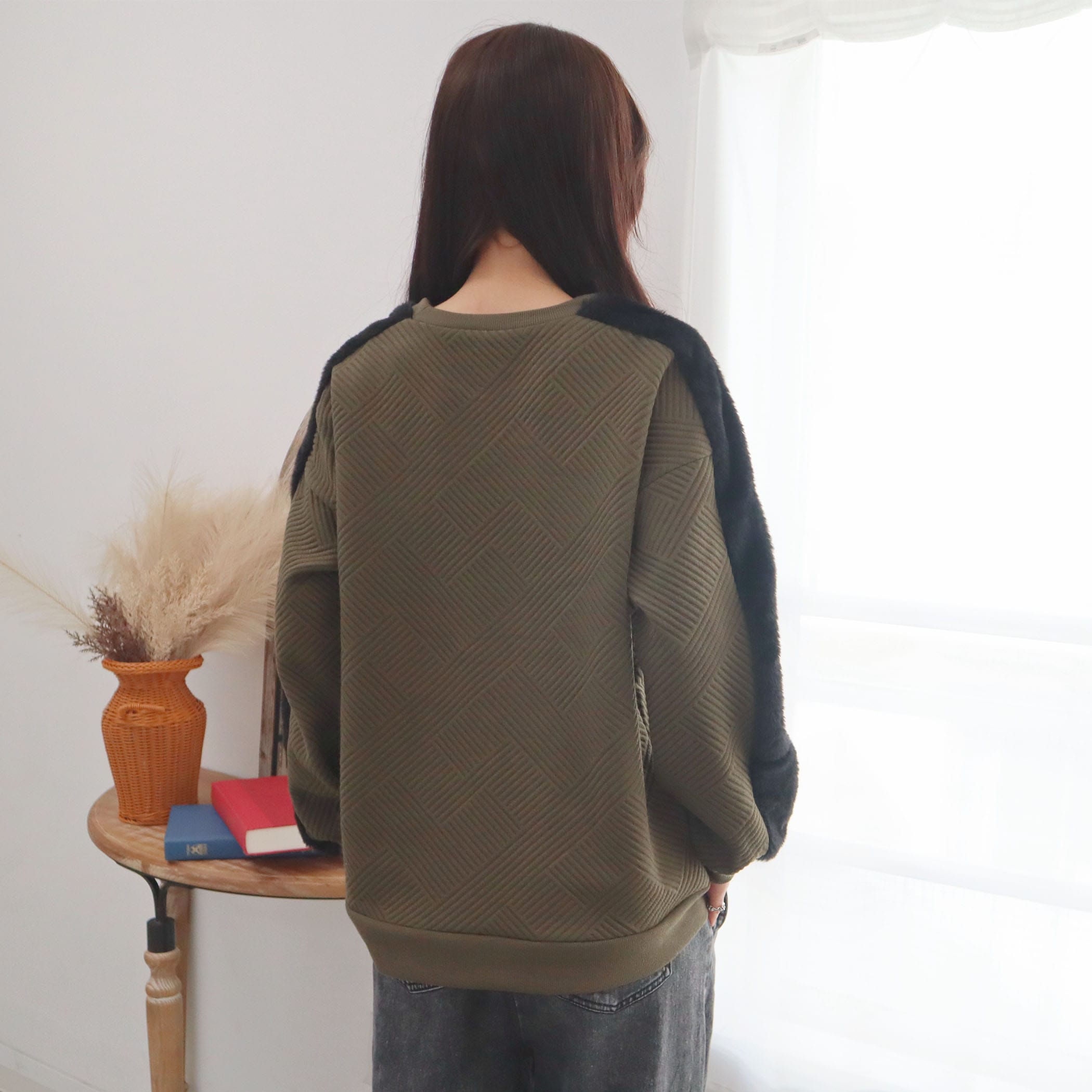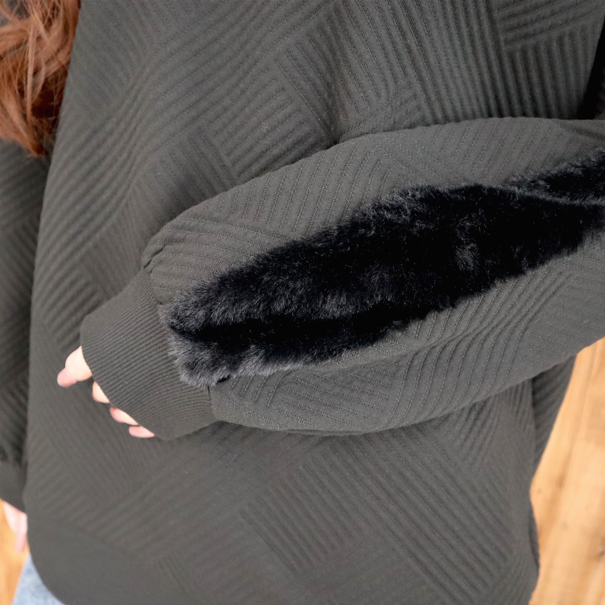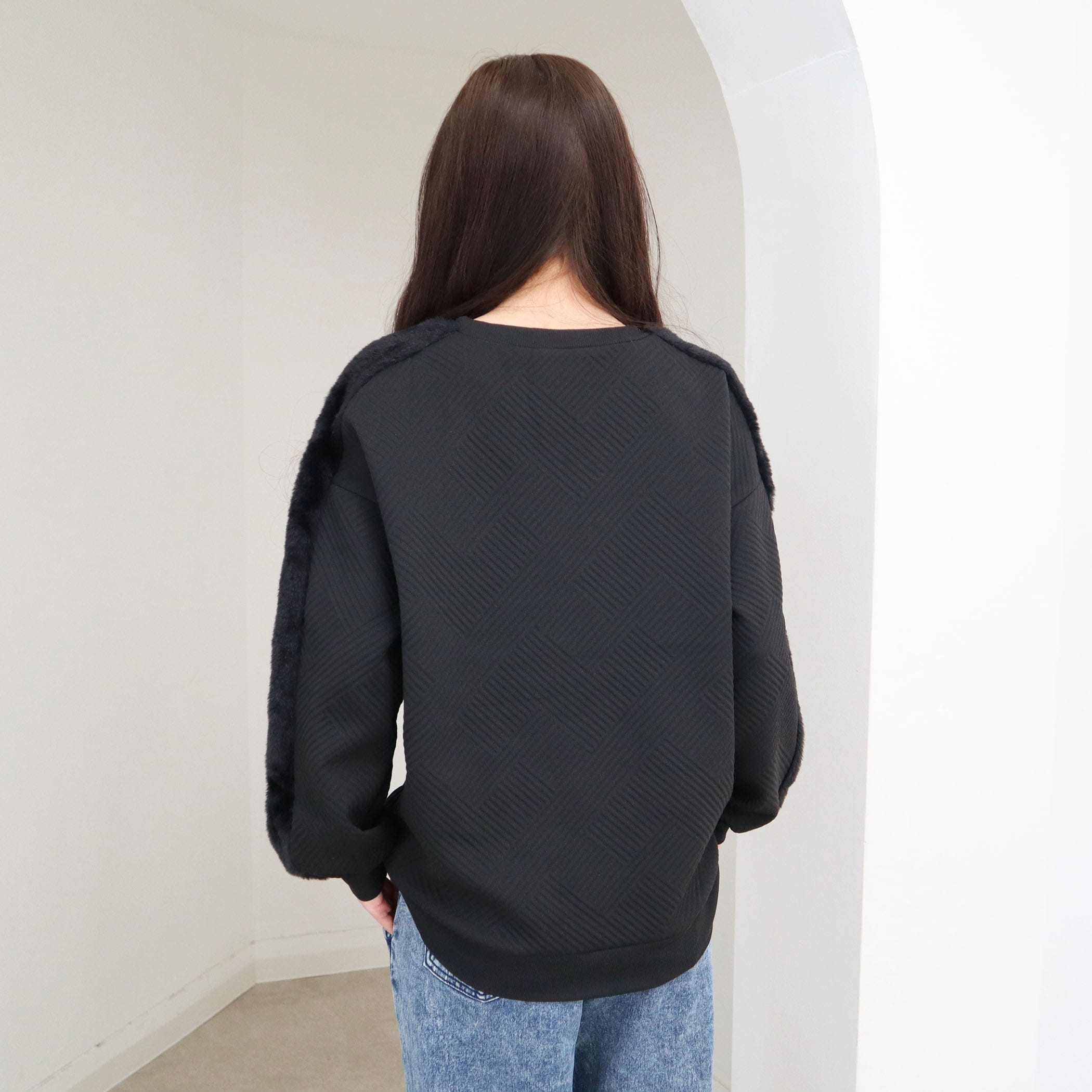 袖にあしらったファー×ライン配色が、コーデにほどよい甘さとトレンド感をプラス。ゆるっとしたドロップショルダーでこなれた雰囲気に仕上がるトップスです。シンプルボトムと合わせるだけでバランスよく決まる着映えアイテム。