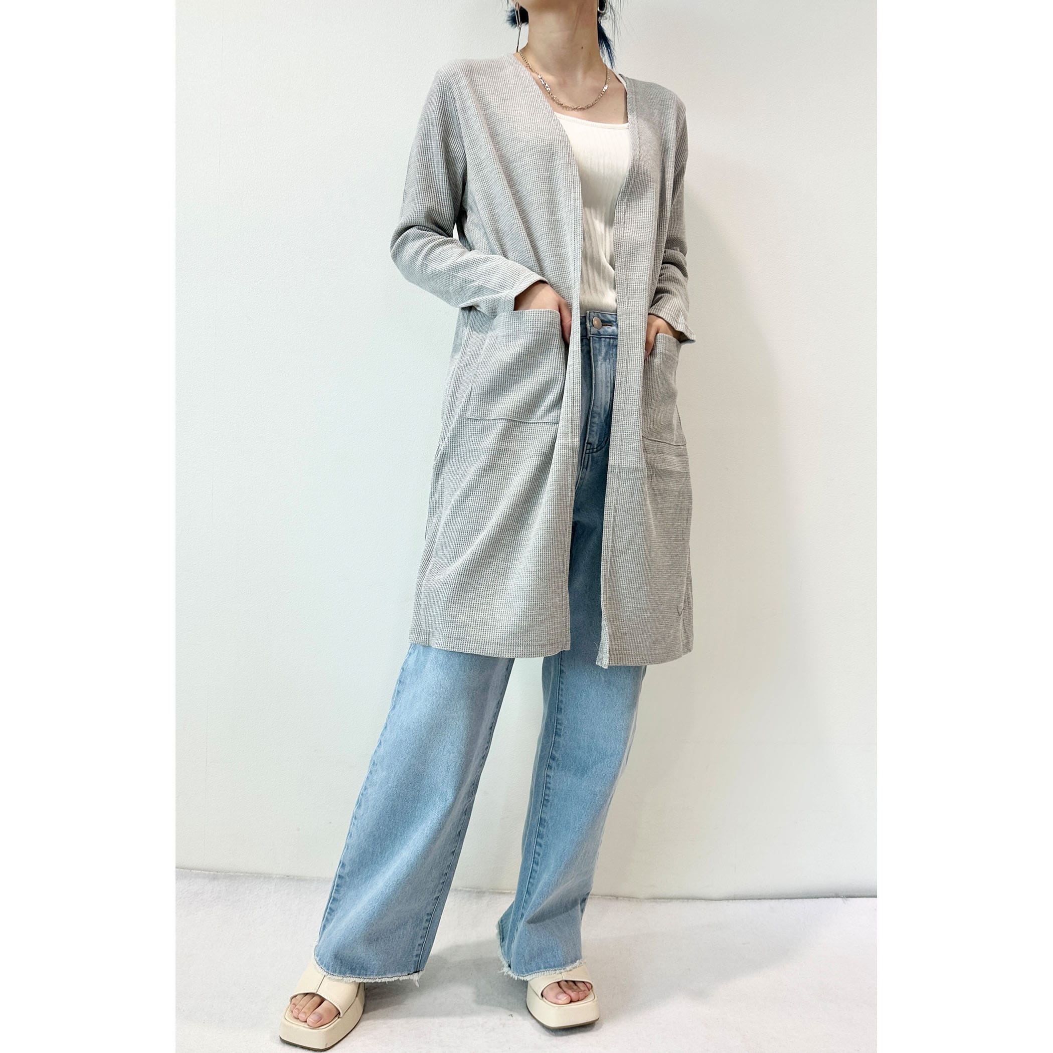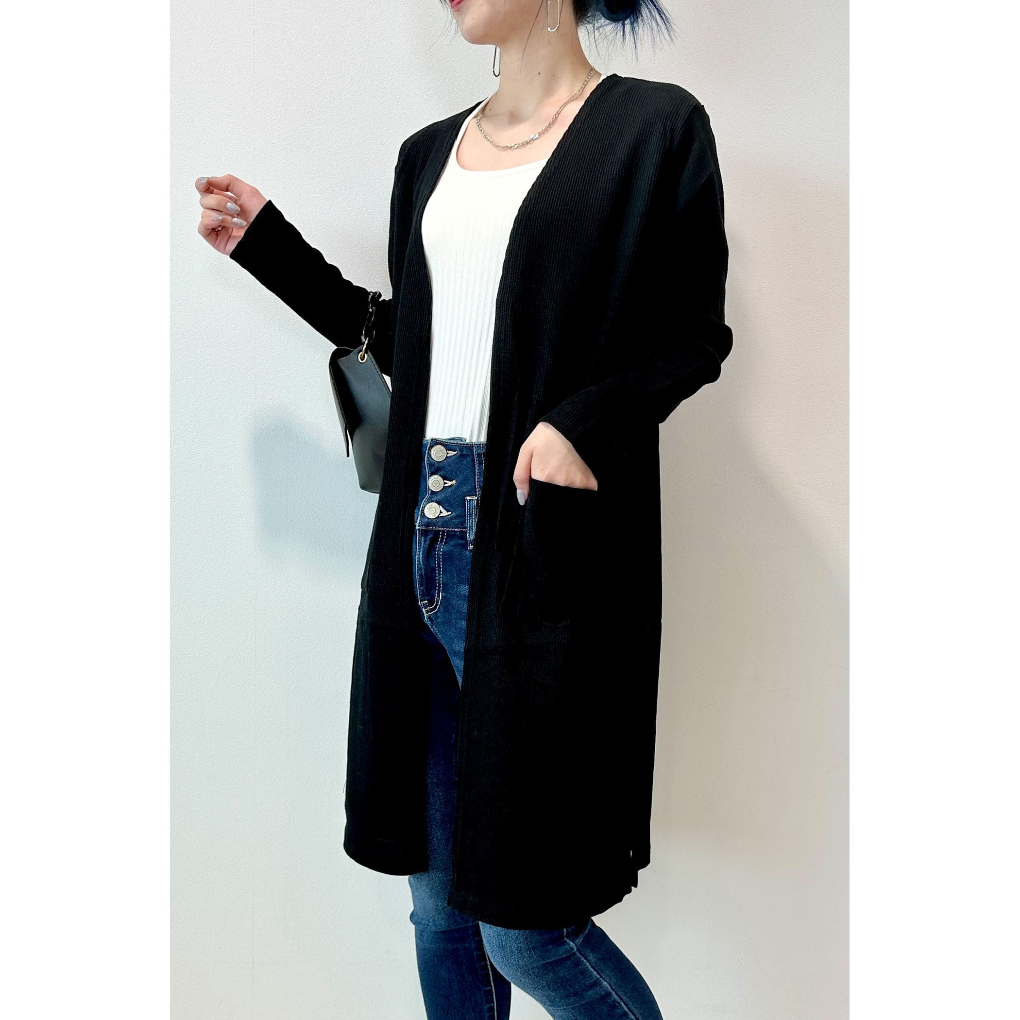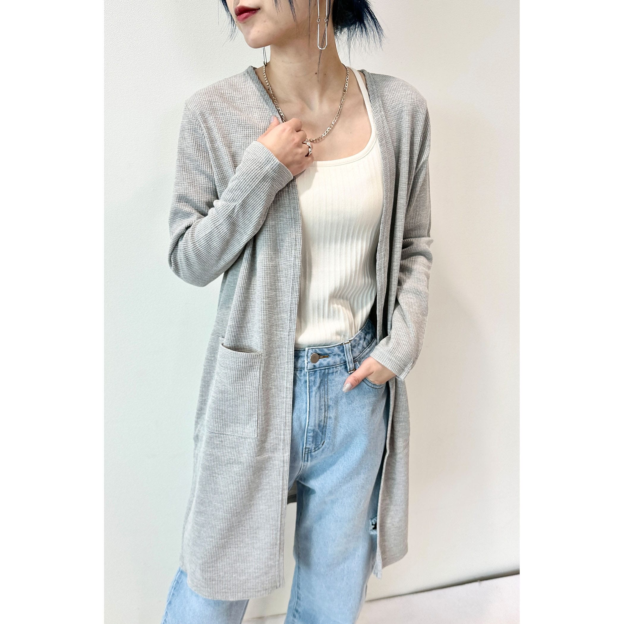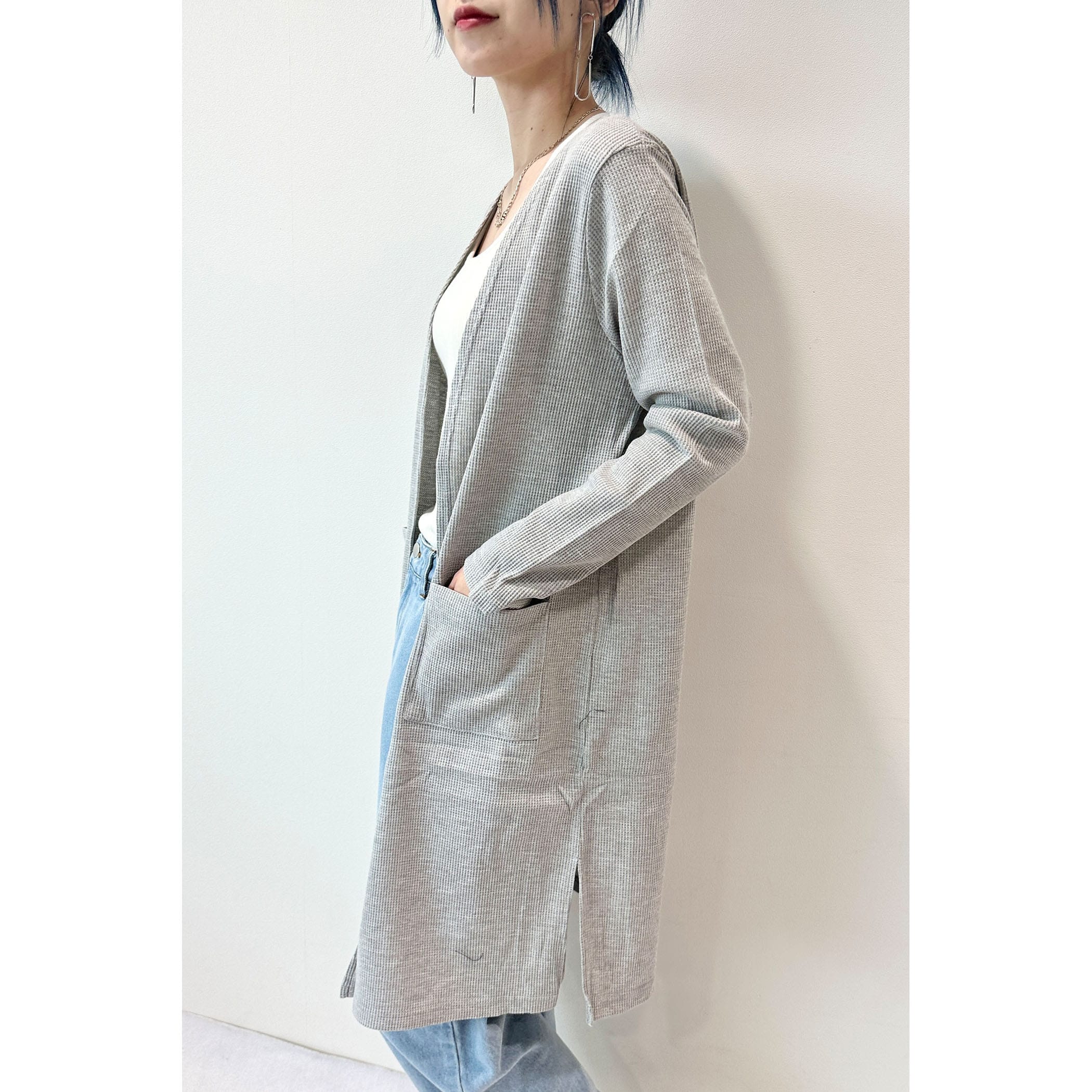 ワッフル編みのロングカーディガンです。ふっくらと柔らかい生地が特徴。スポーティに合わせたり、きれいめなスタイルに合わせてカジュアルな抜け感を出してもおすすめです。カット素材のカーディガンなので春先などにはアウター代わりとしても使って頂けます