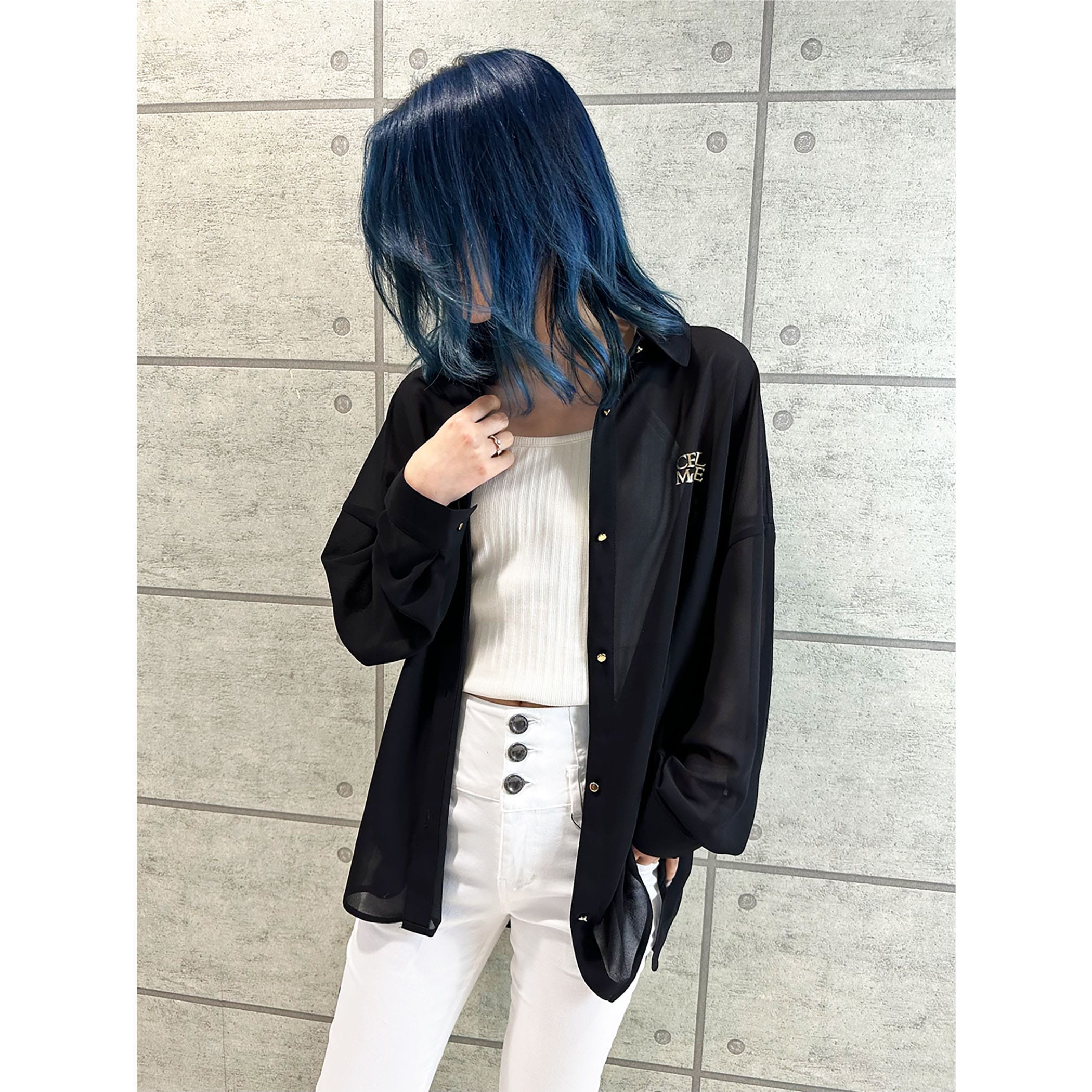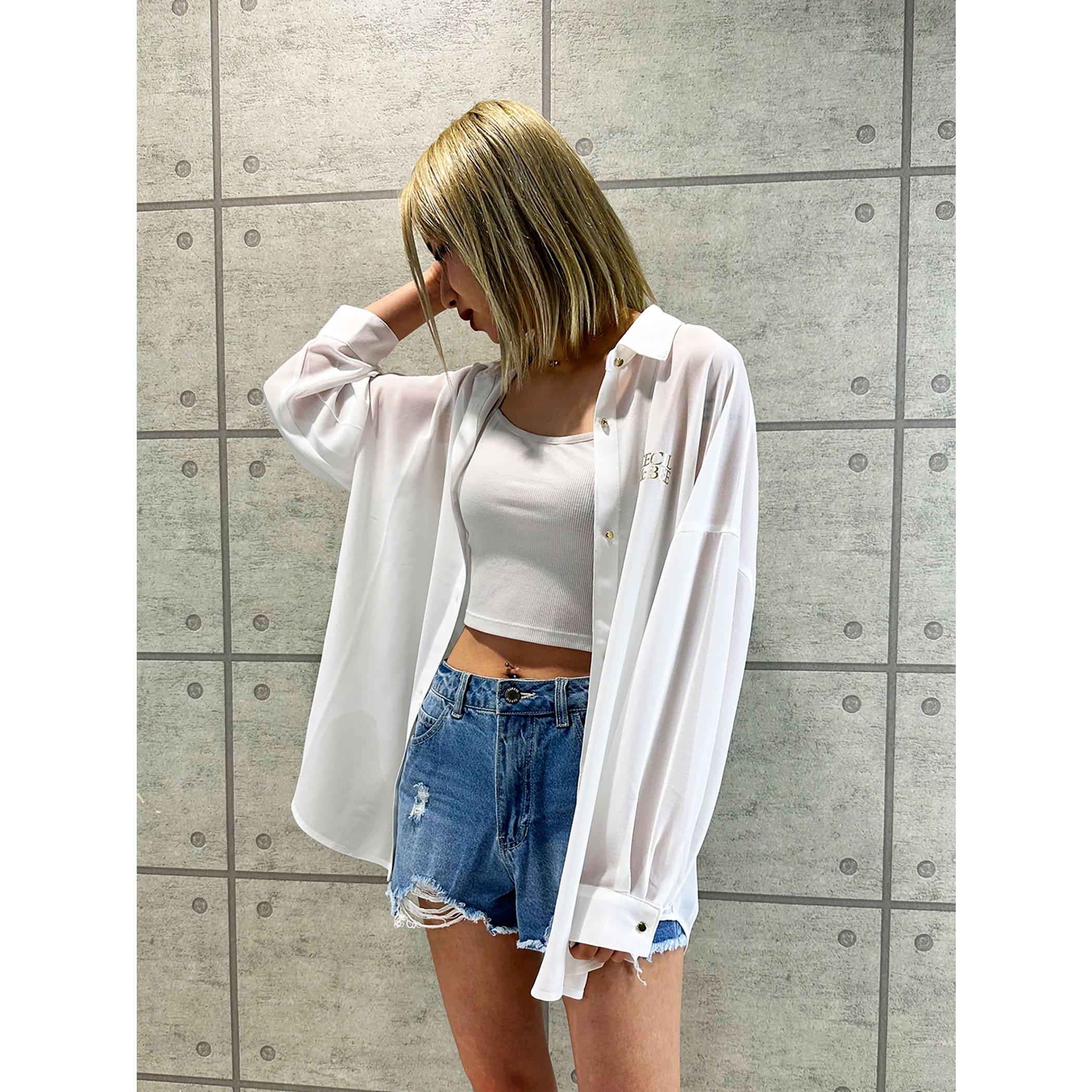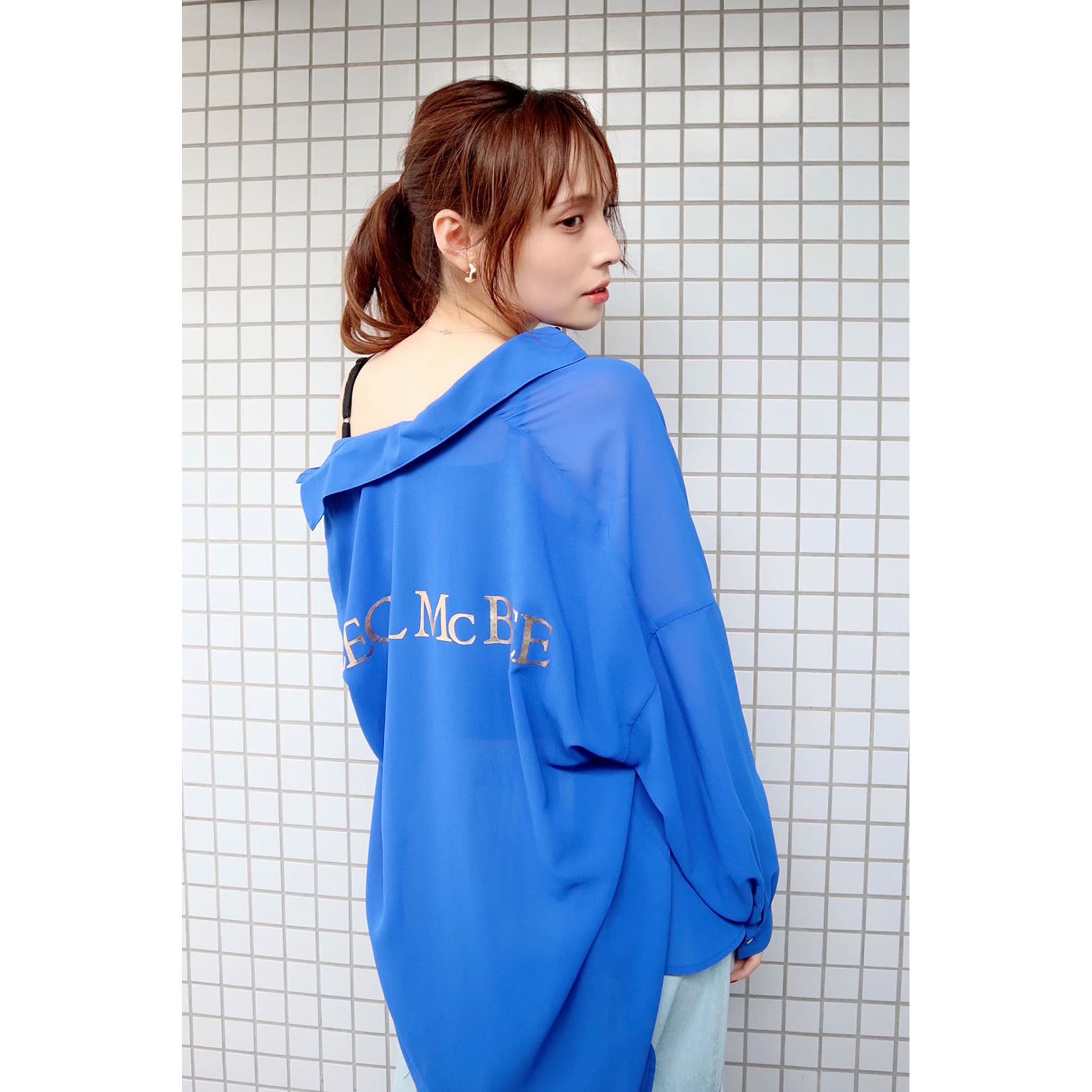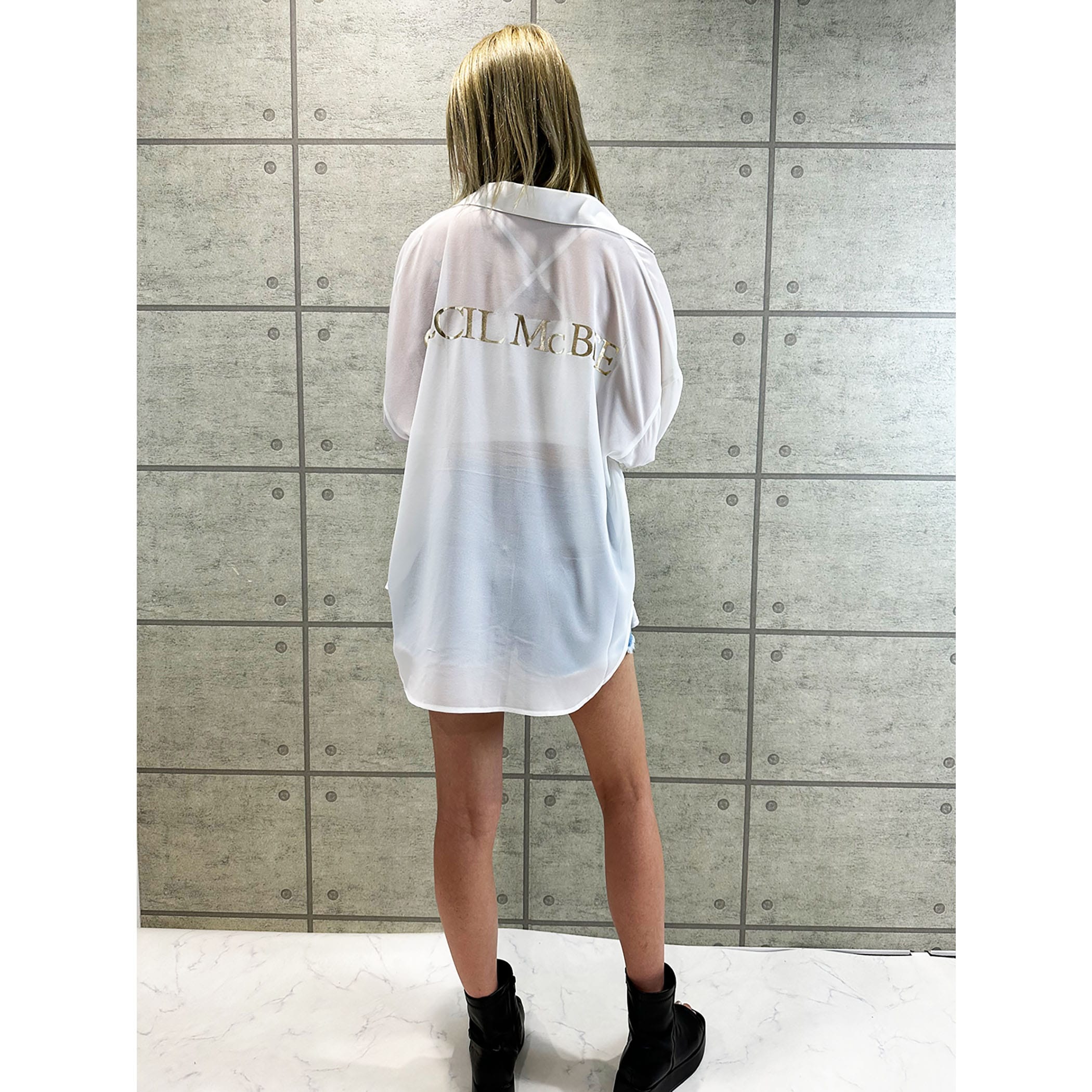 光沢のあるゴールドの箔プリントと金ボタンが目を引くシアーシャツ。ドロップショルダーでゆとりのあるサイズ感なので、抜け感を持ちつつクールな雰囲気も与えてきます。インナーやワンピの上の軽めの羽織りとしても着ていただけるのでコーディネートの巾が広がる一枚です。