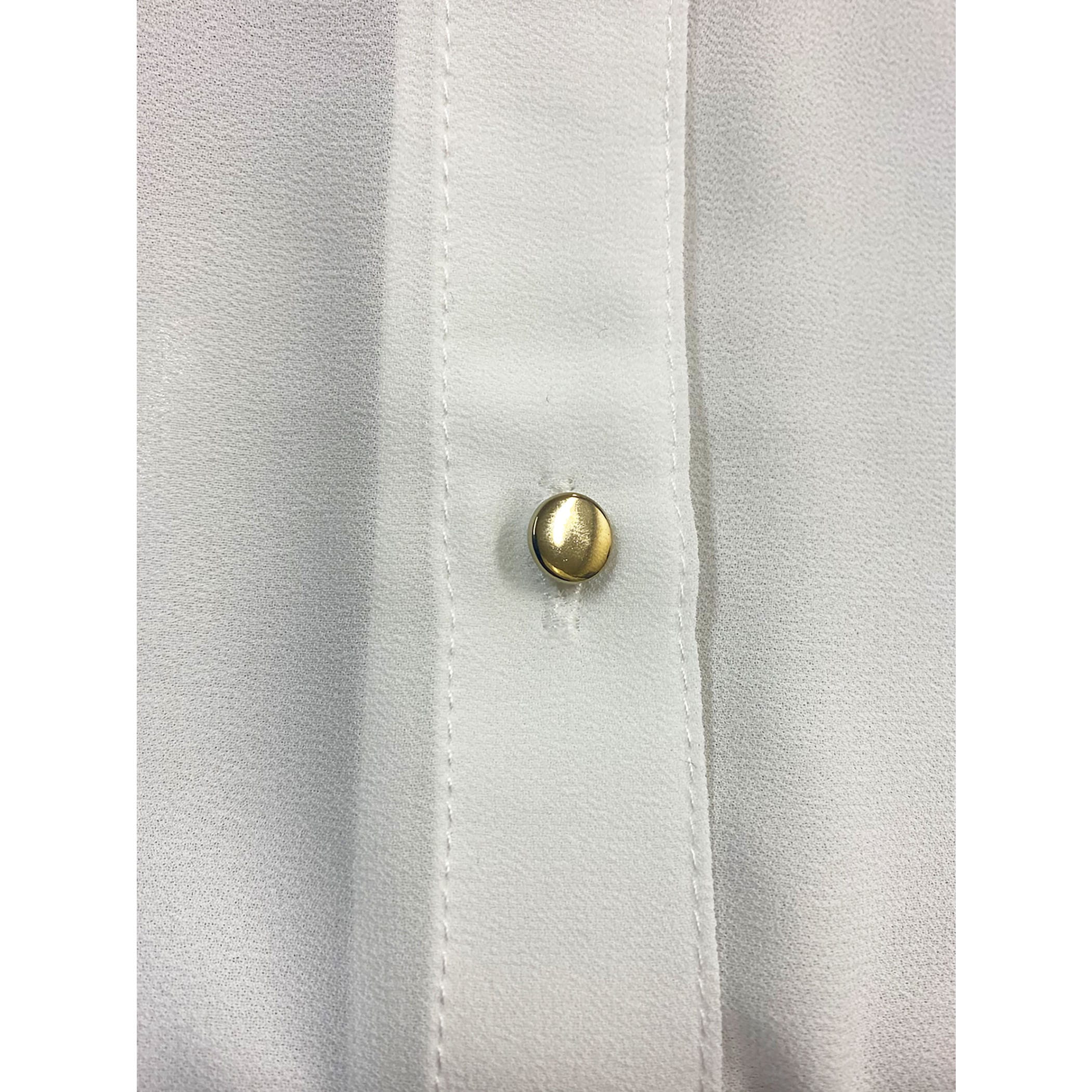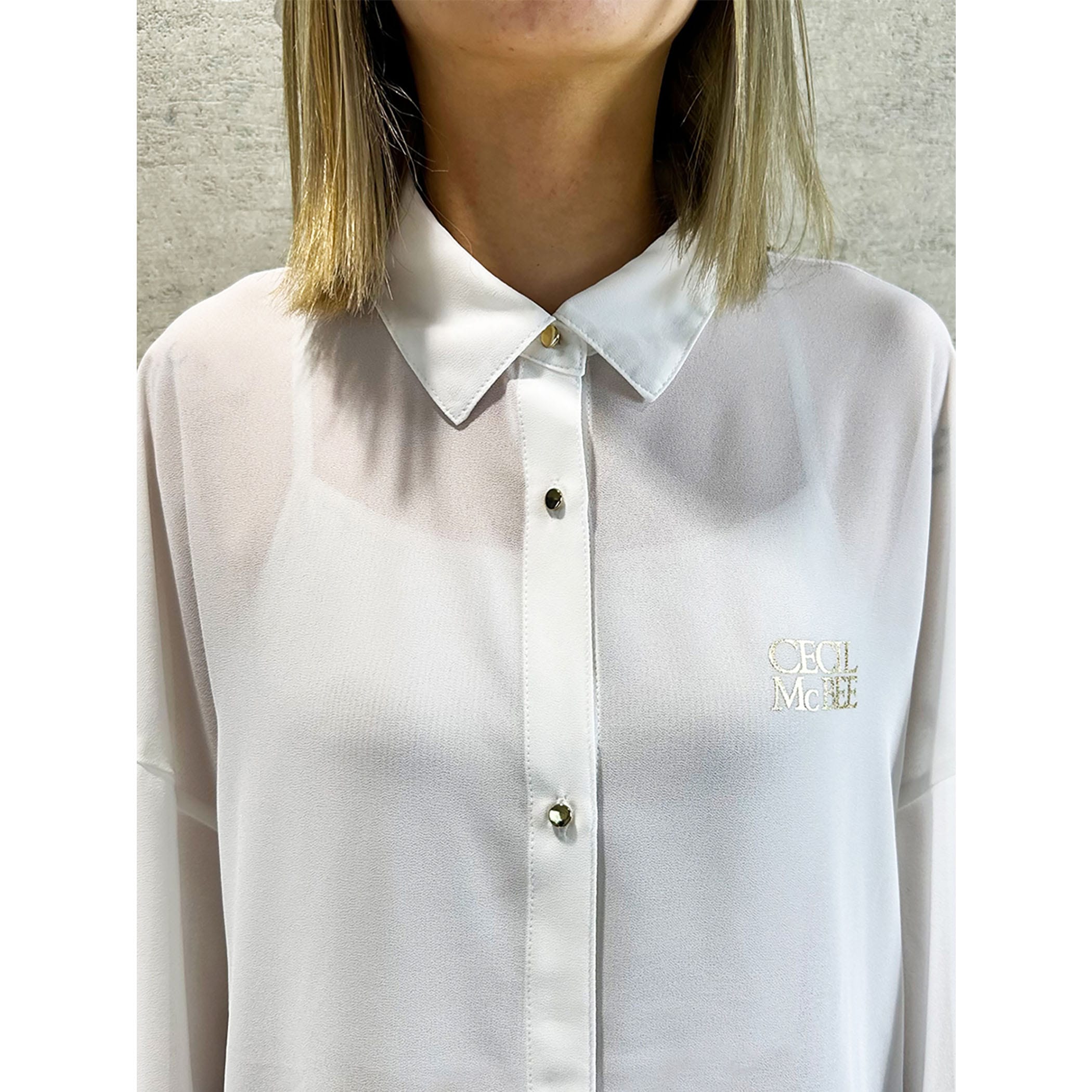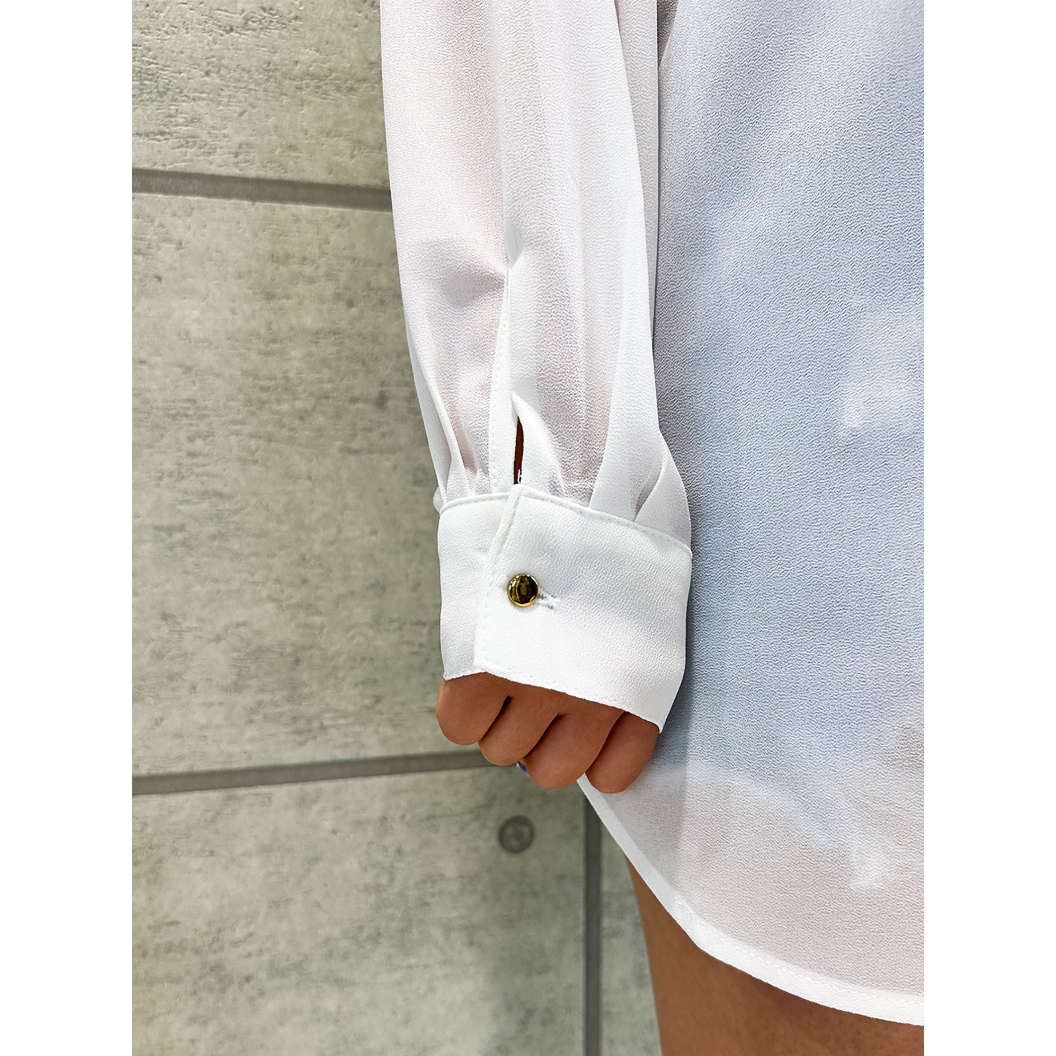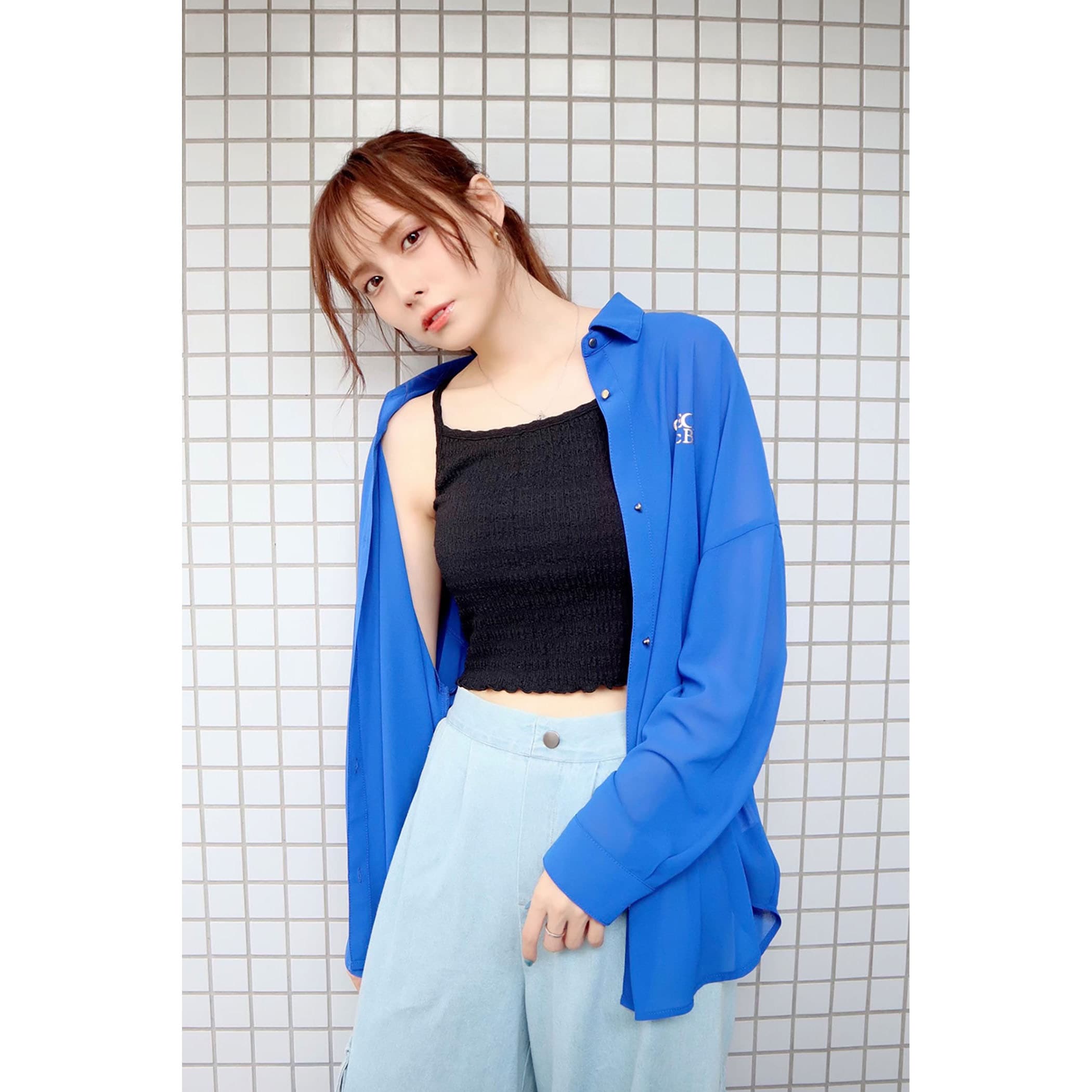光沢のあるゴールドの箔プリントと金ボタンが目を引くシアーシャツ。ドロップショルダーでゆとりのあるサイズ感なので、抜け感を持ちつつクールな雰囲気も与えてきます。インナーやワンピの上の軽めの羽織りとしても着ていただけるのでコーディネートの巾が広がる一枚です。