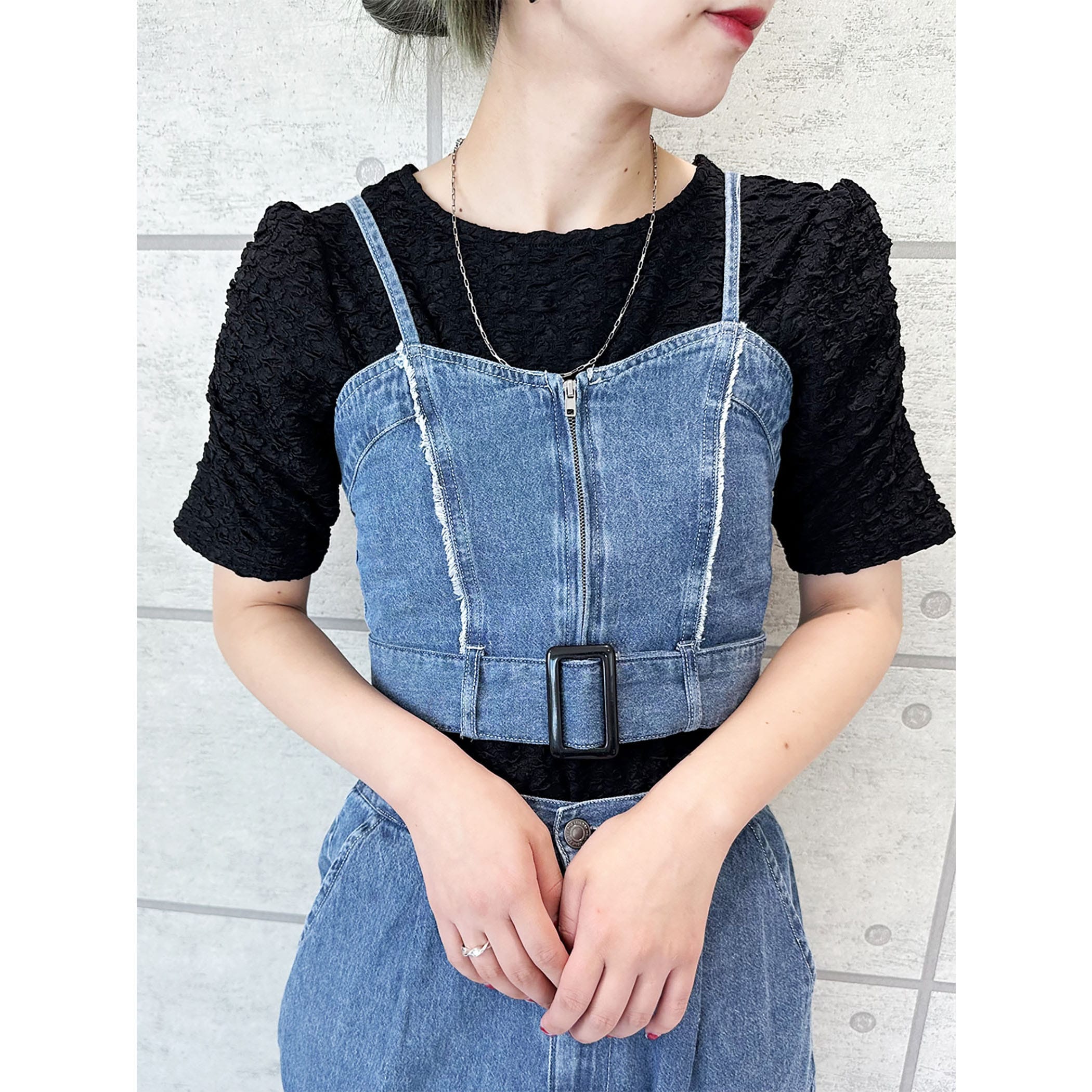フロントのデザインがアクセントになるビスチェ。
