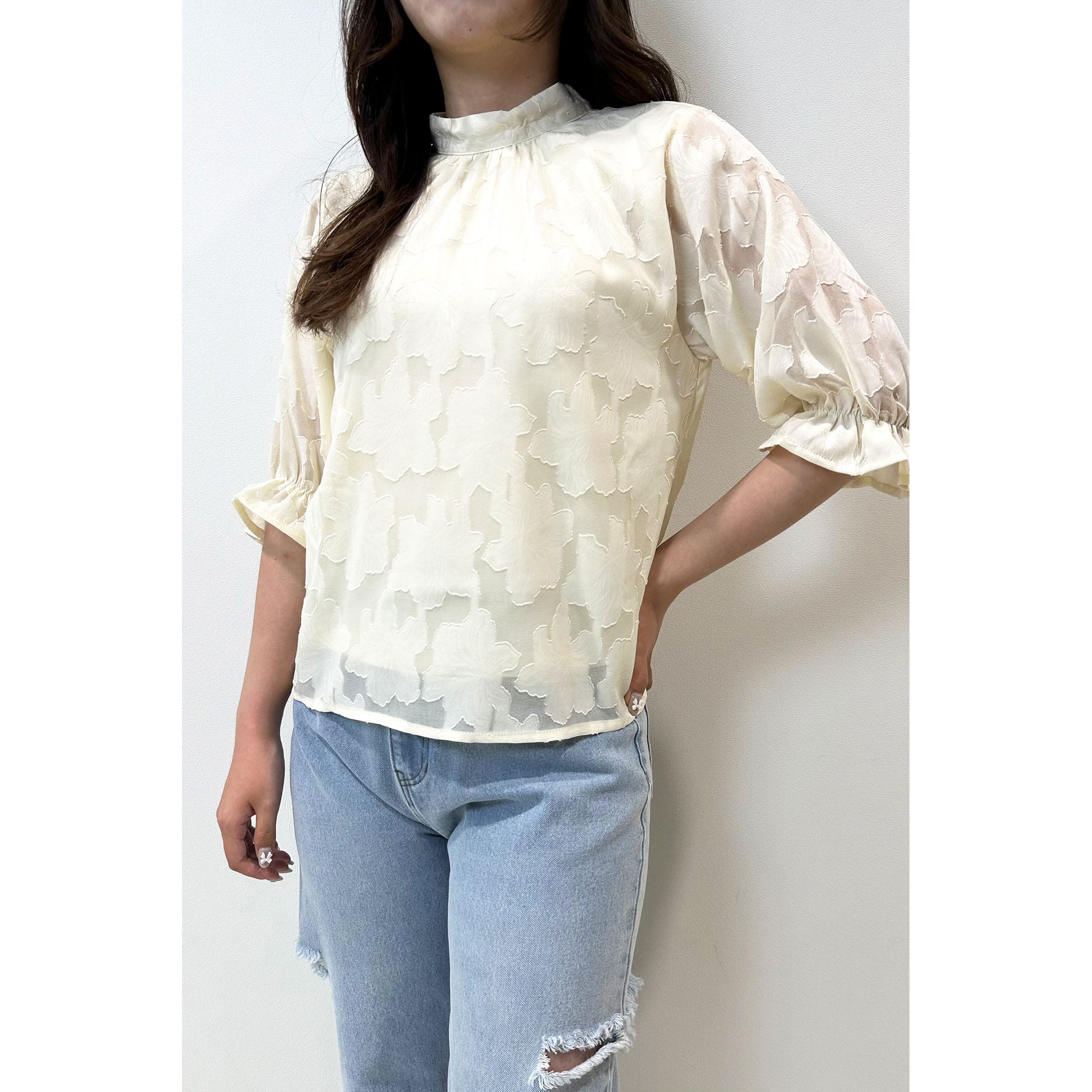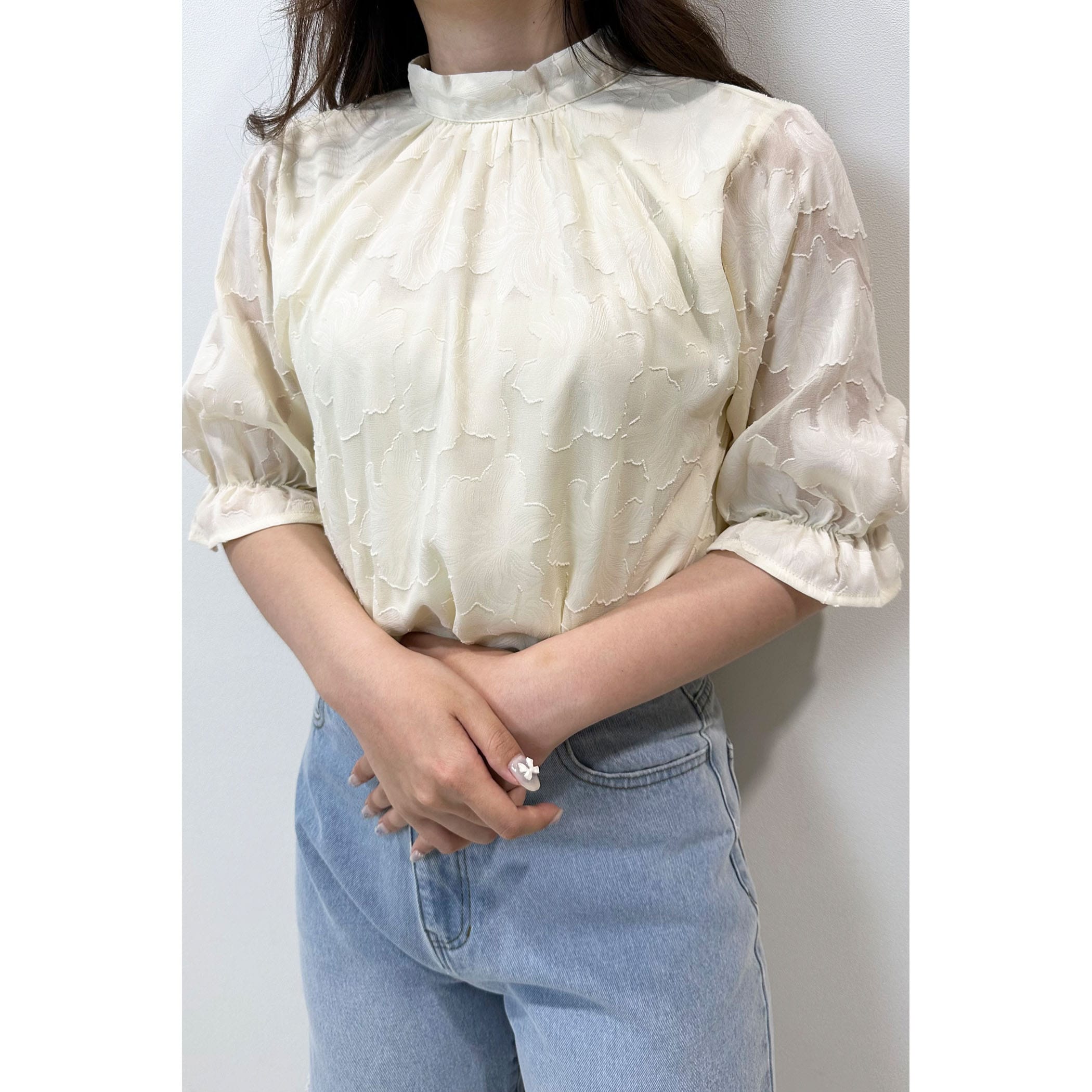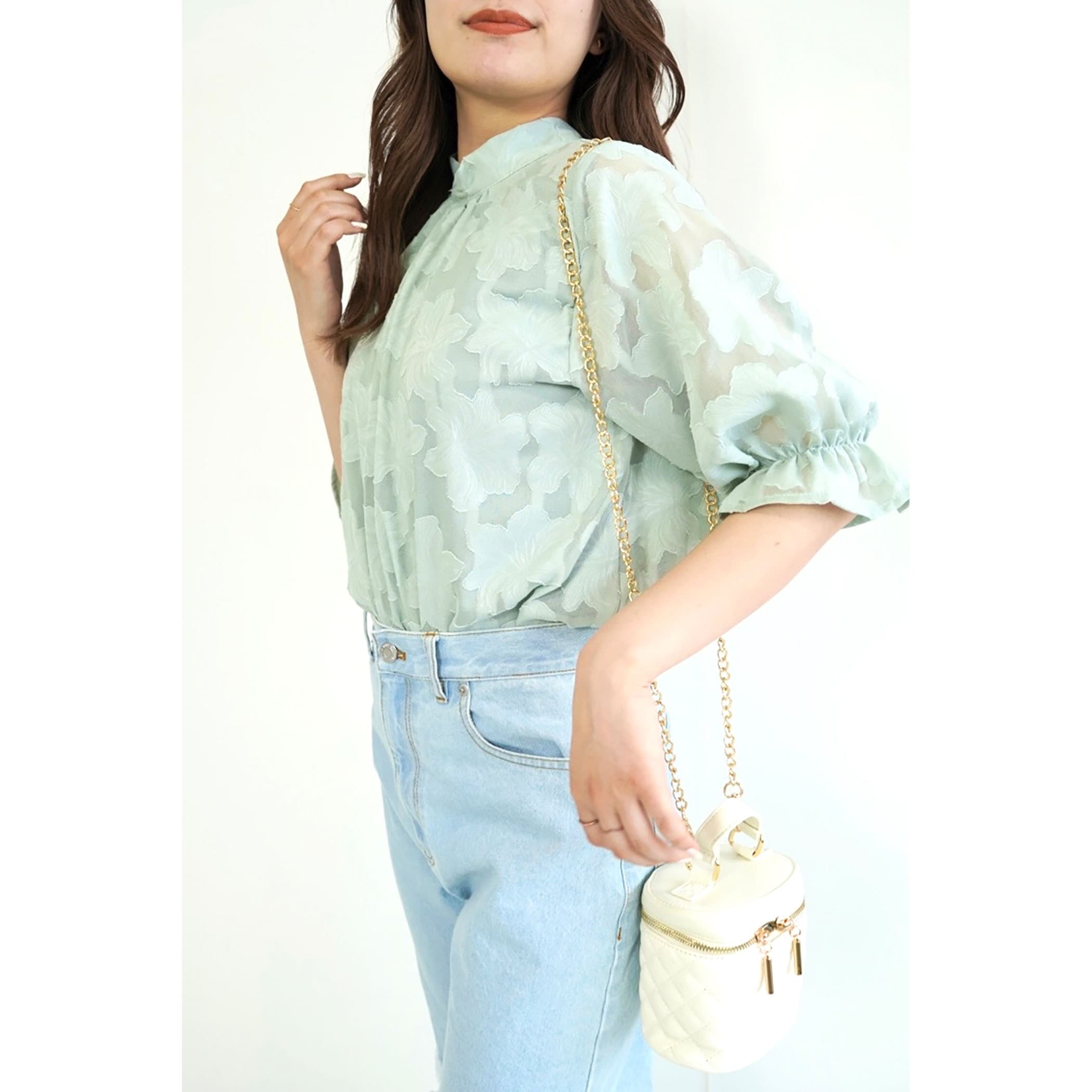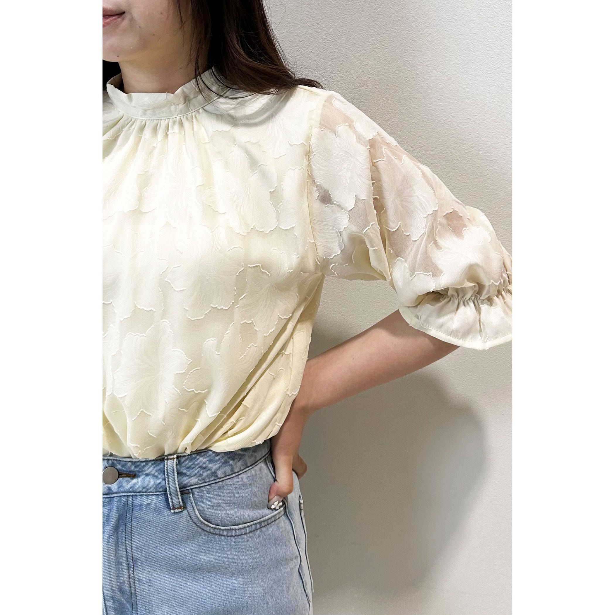 トレンドライクなジャガードブラウス。さりげなく肌が透けるシアー素材が大人っぽい印象に。立体的なフラワ-刺繍は高級感があるので、1枚で旬顔になること間違いなし?