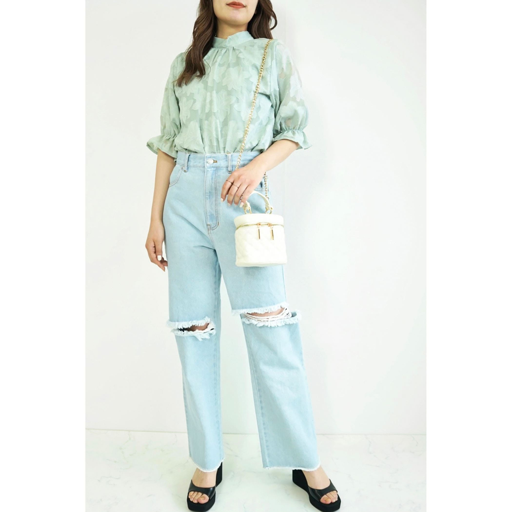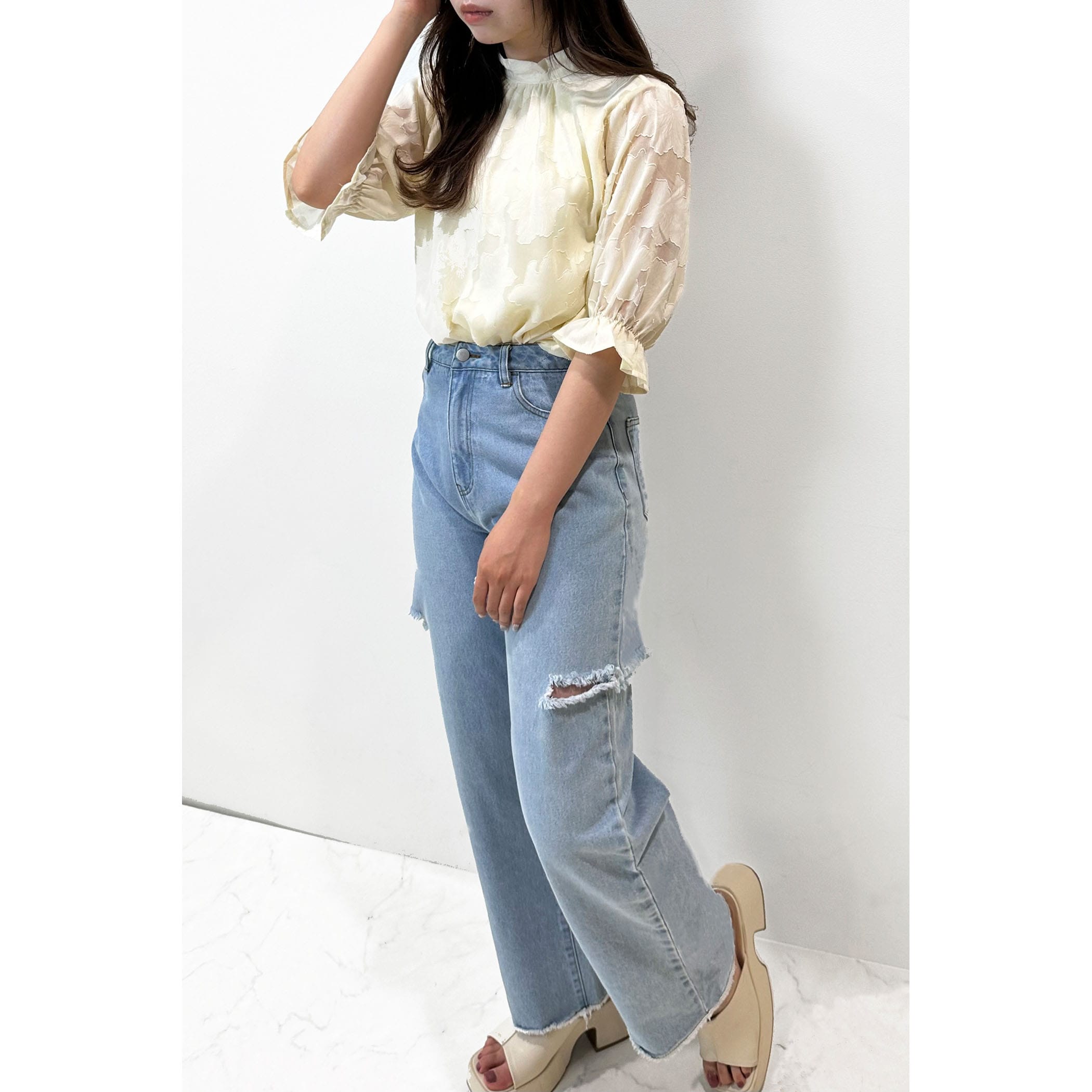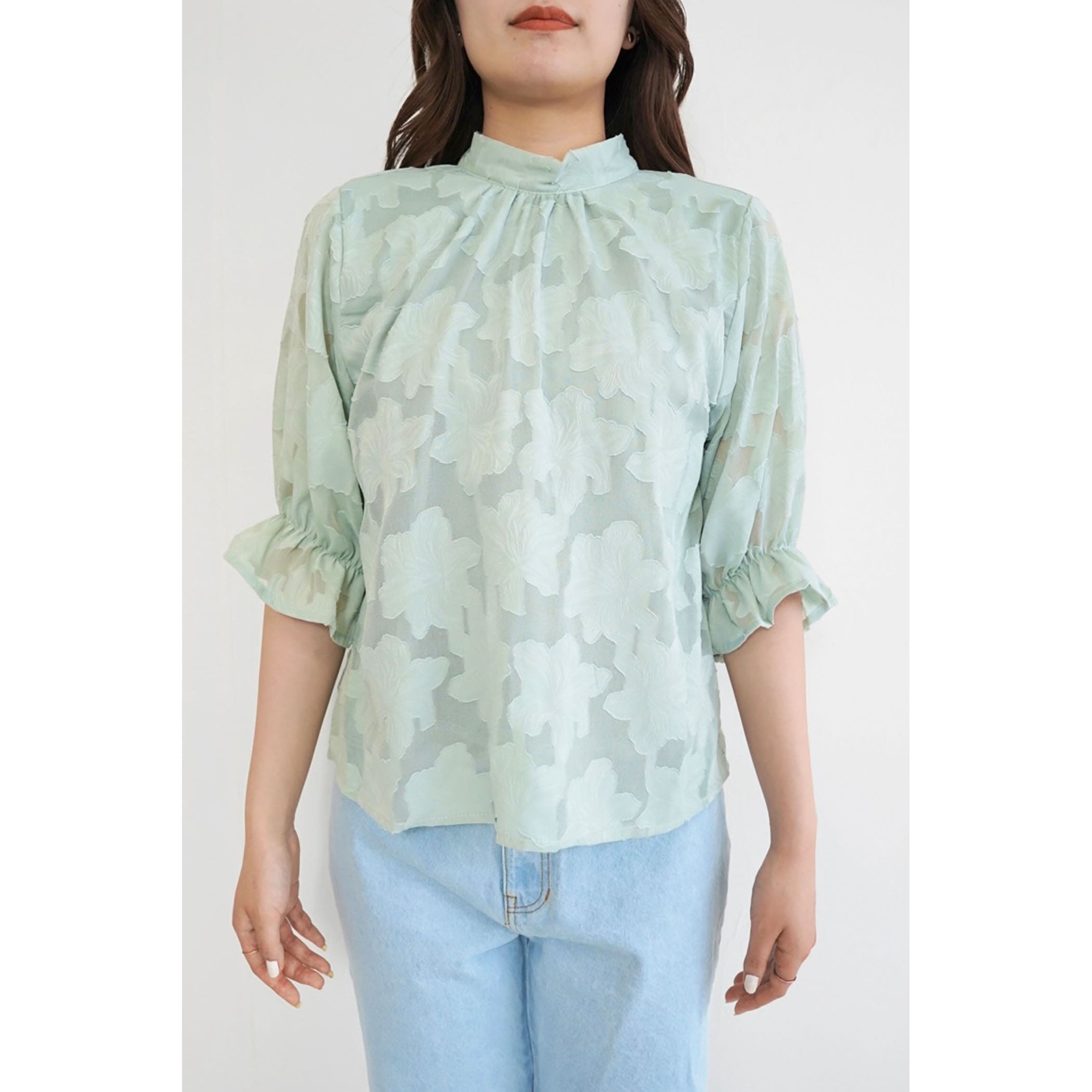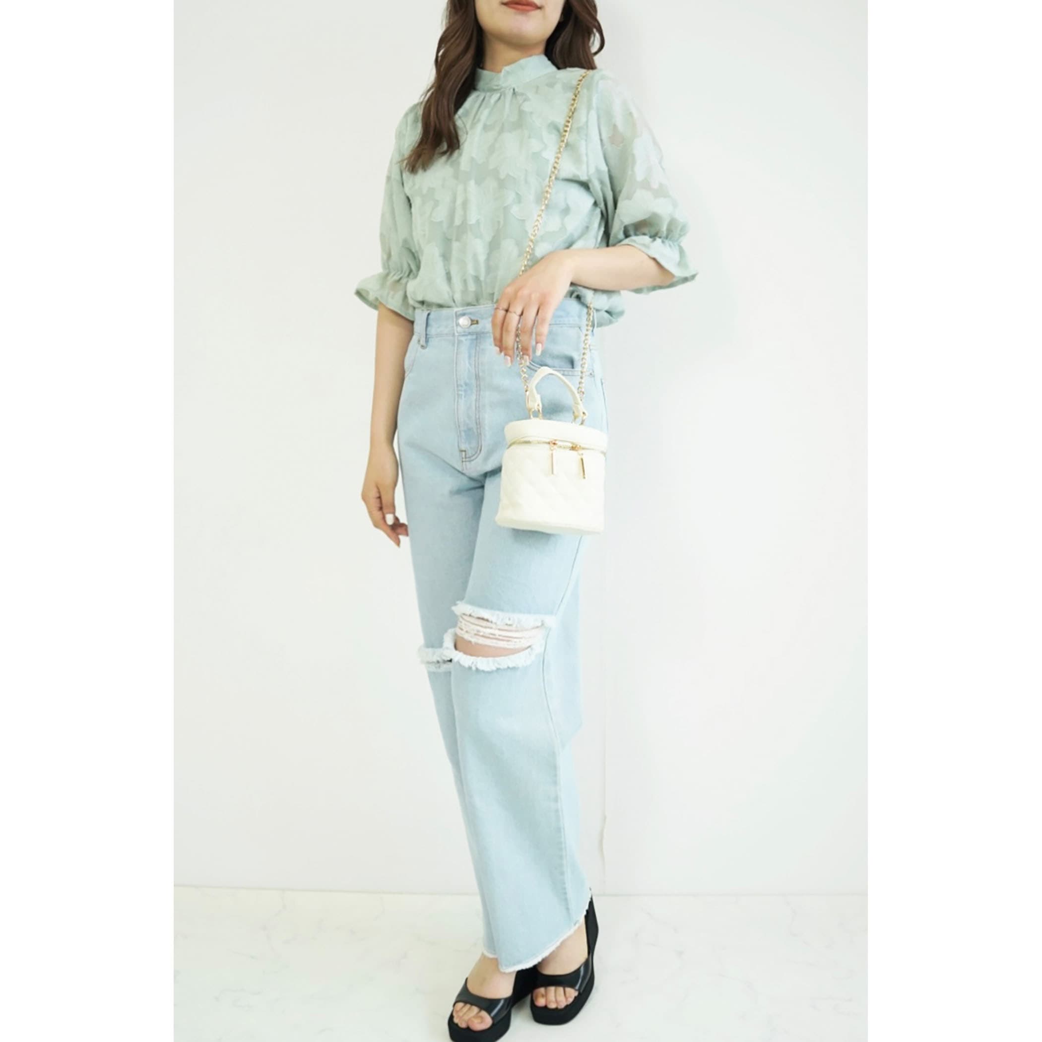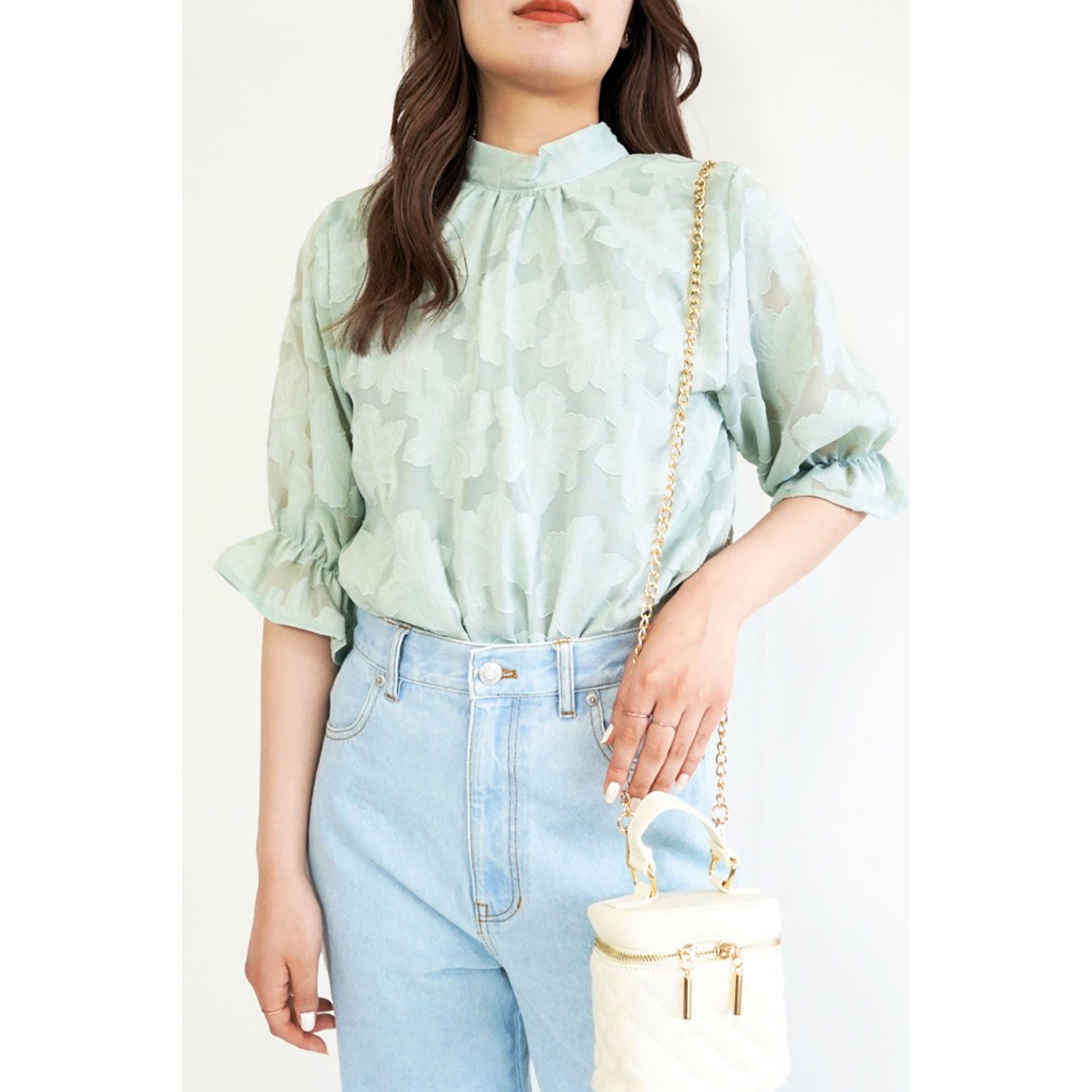 トレンドライクなジャガードブラウス。さりげなく肌が透けるシアー素材が大人っぽい印象に。立体的なフラワ-刺繍は高級感があるので、1枚で旬顔になること間違いなし?
