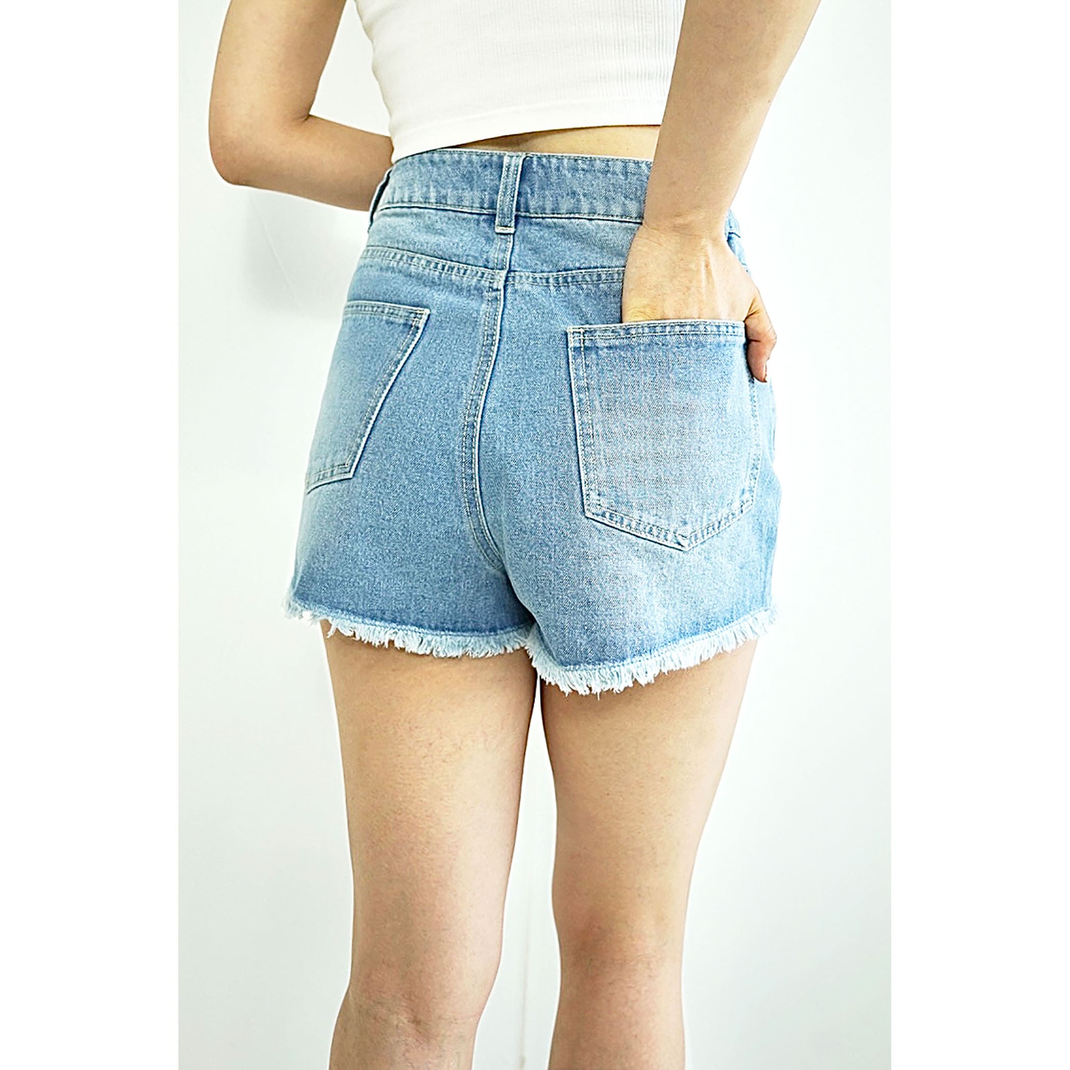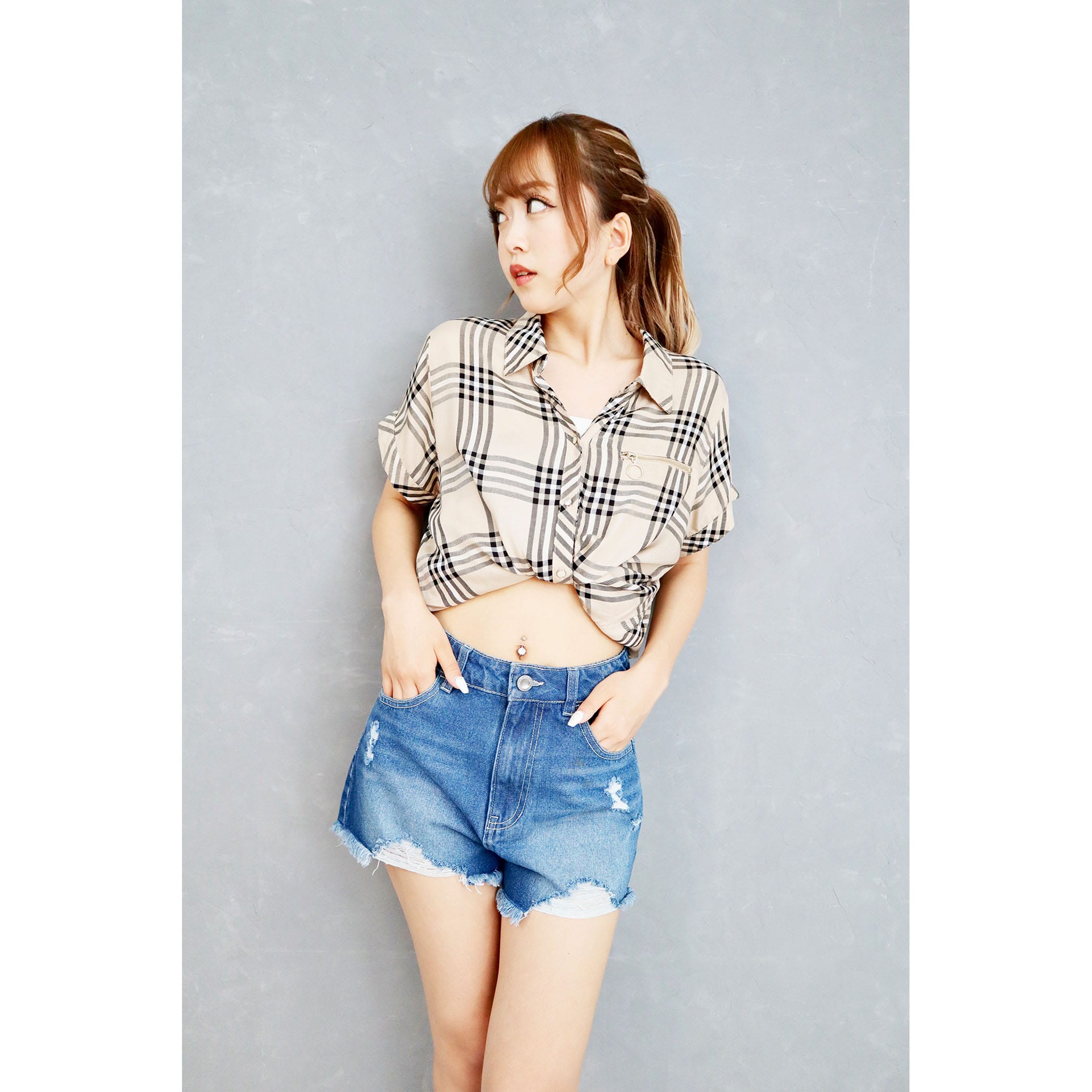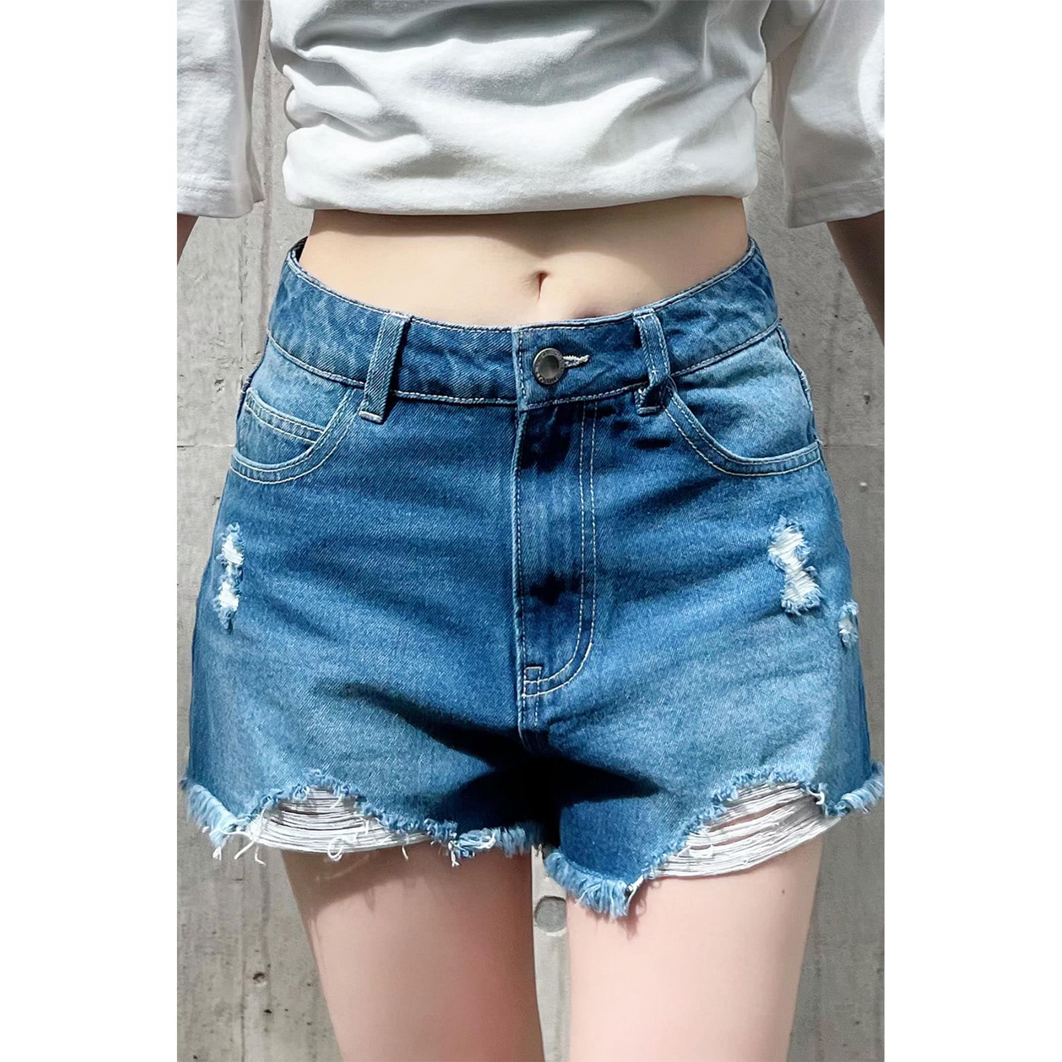 ジャストウエストのショートデニムパンツです。程よいダメージ加工で露出し過ぎず、着回ししやすいアイテムです。短丈トップスとの相性も良く、ウェスト位置が上に見えるので足が長く見えるのもポイントです。カジュアルスタイルにマッチし着回し力抜群です♪