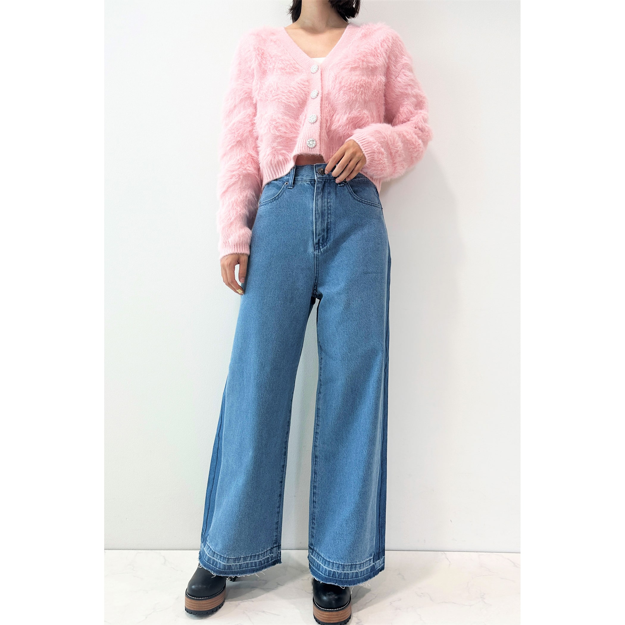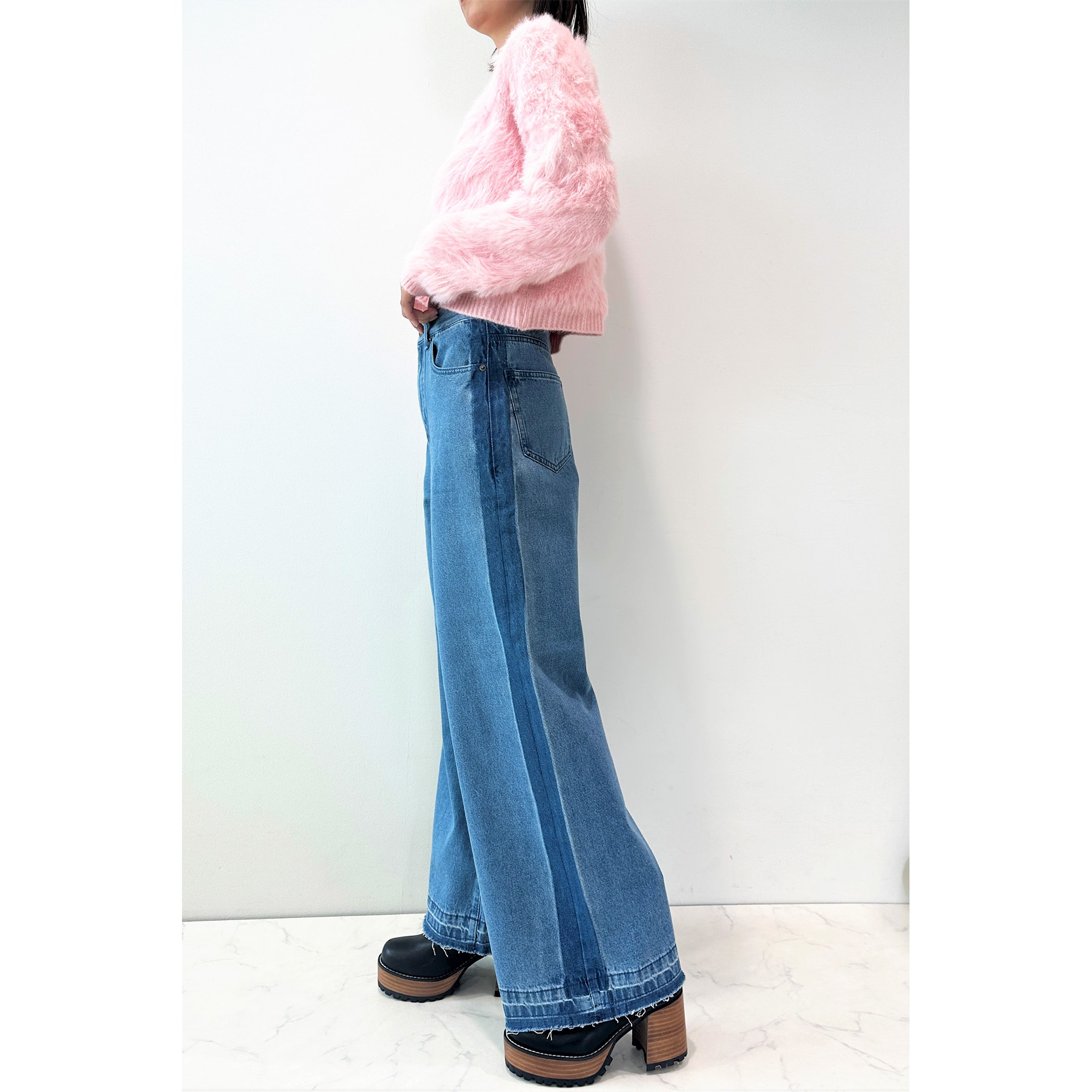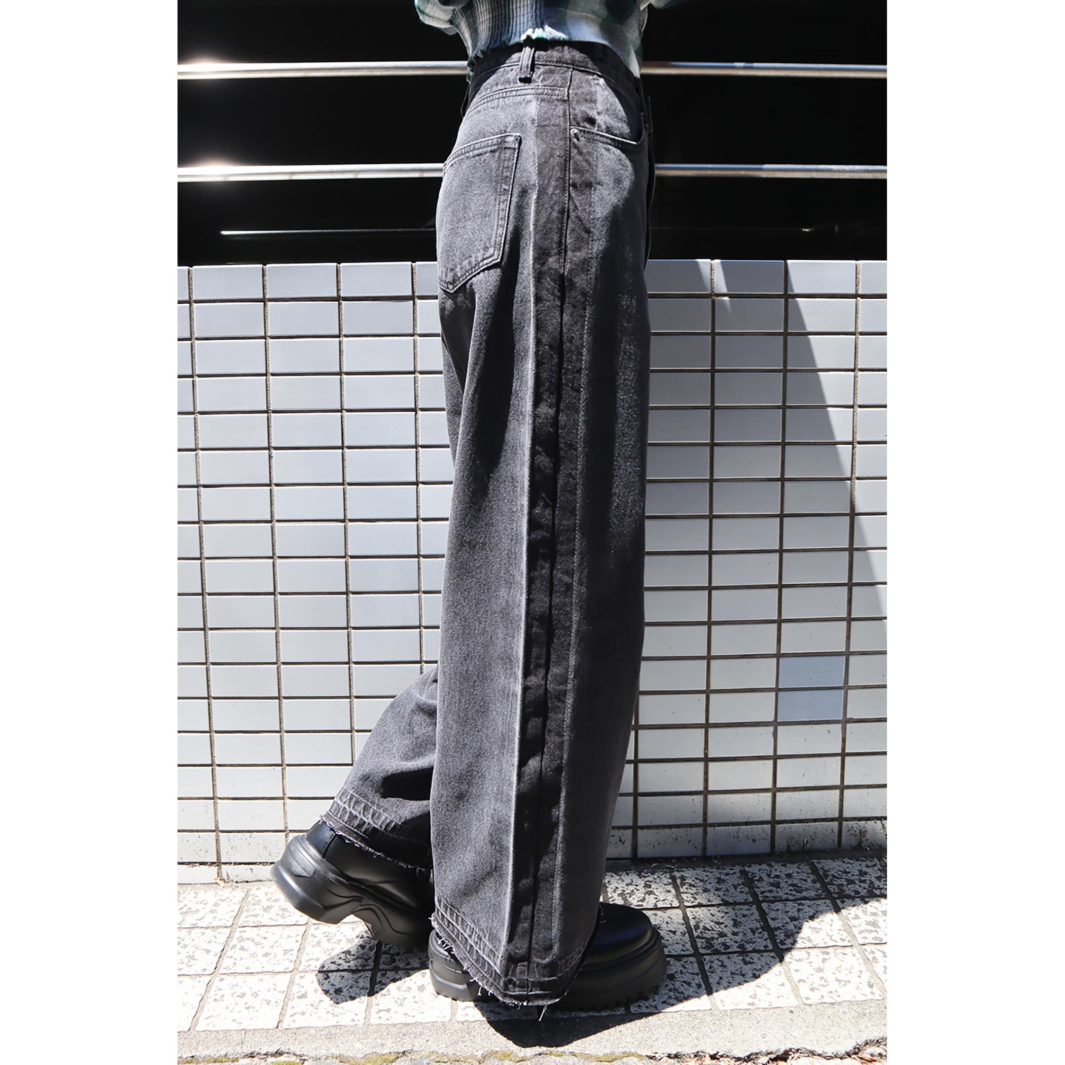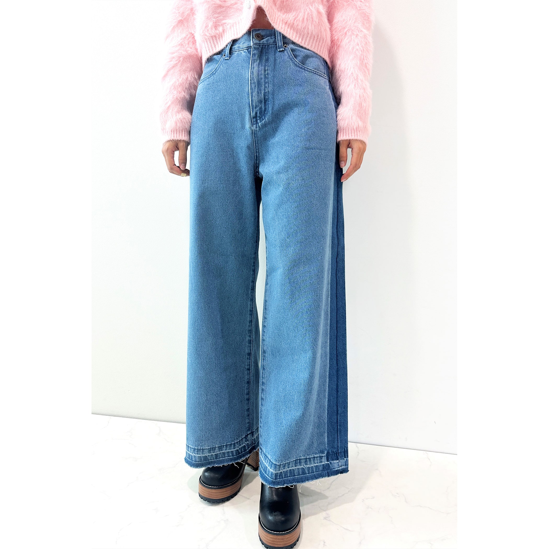 サイドにさりげなくラインが入ったデニムパンツラインが入っていることで美脚効果も◎カジュアルコーデからキレイめコーデまで着回しのきく1枚です。オールシーズン履ける定番アイテムです。