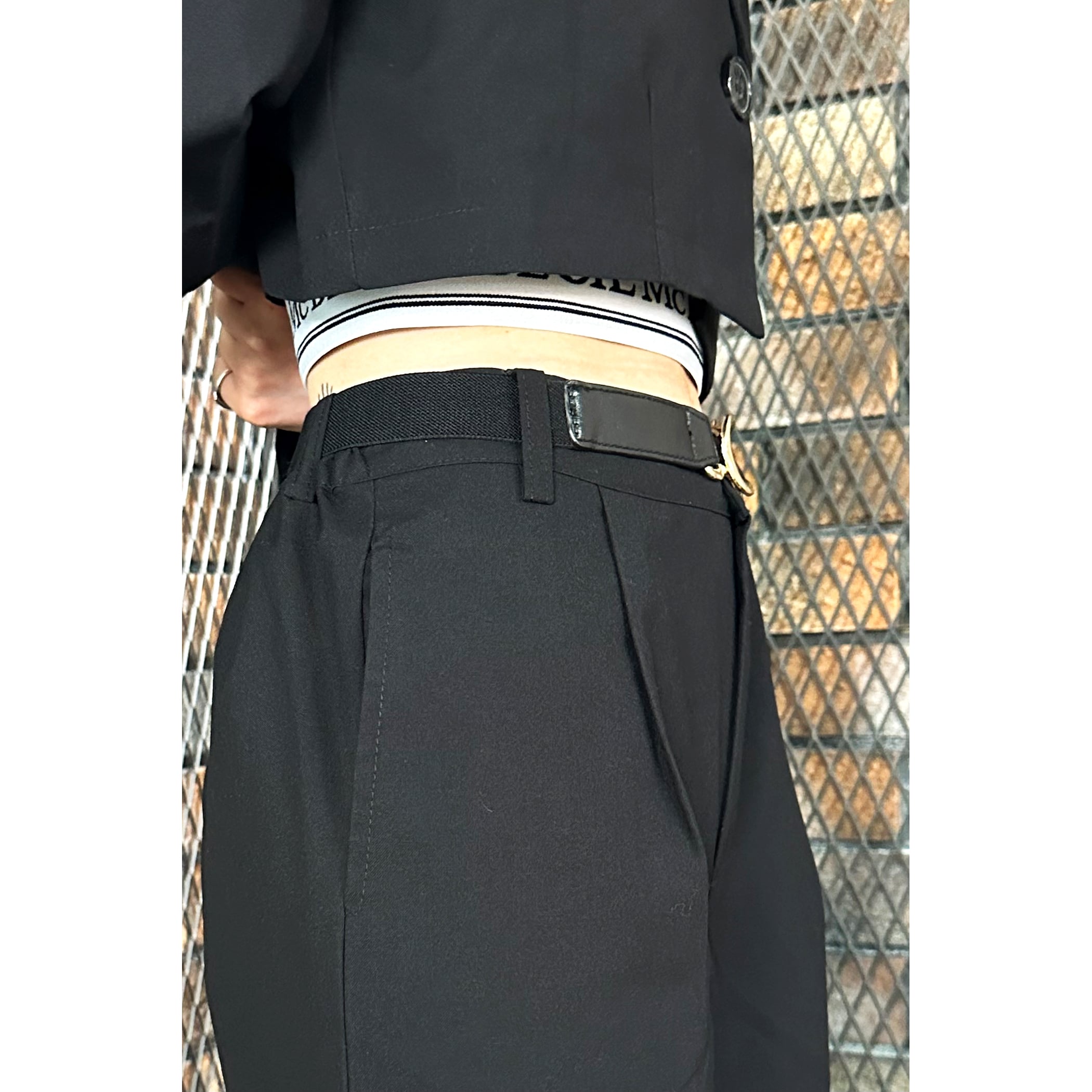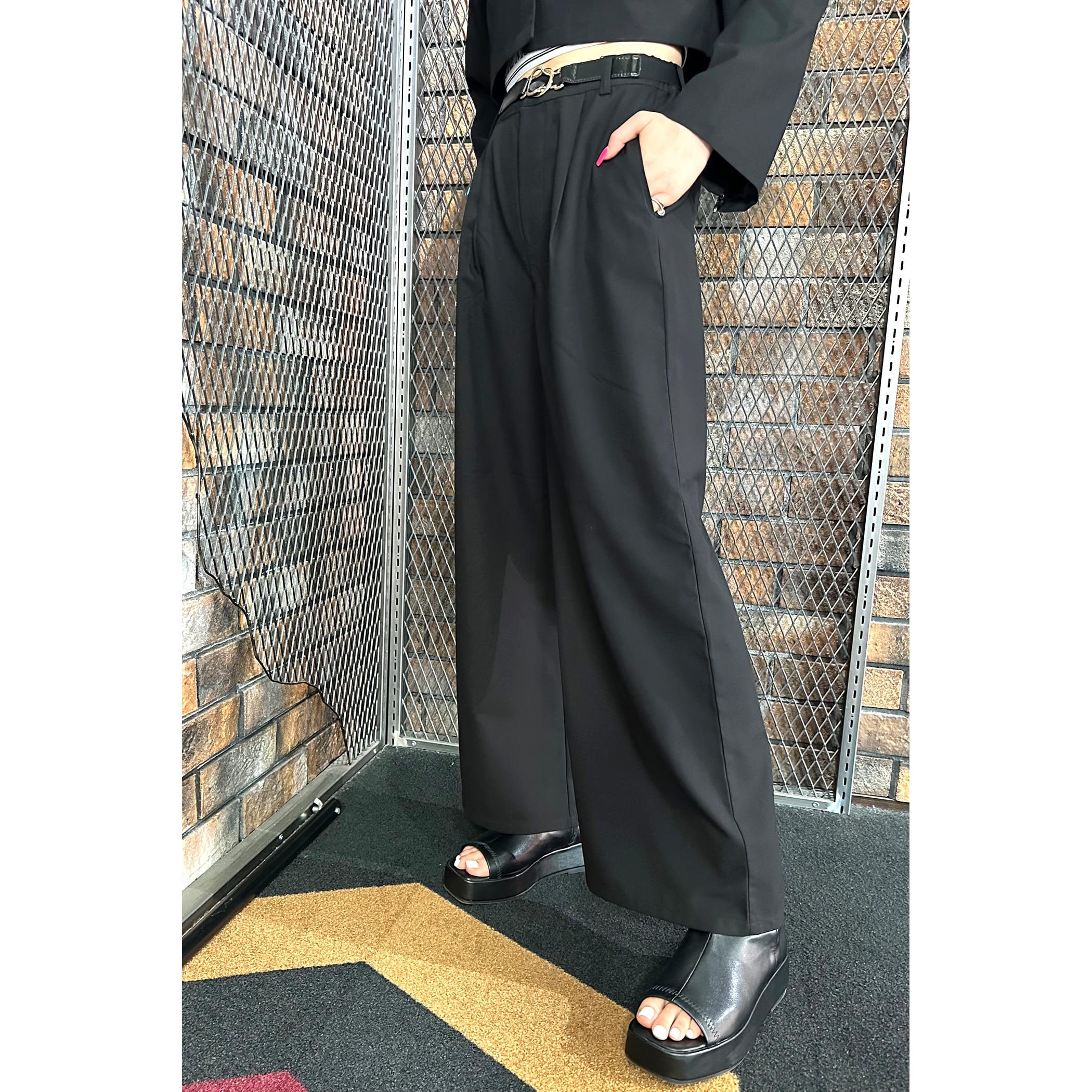 シンプルなデザインでオフィスカジュアルにも最適なワイドパンツ。タック入りで脚ラインを綺麗魅せできるパンツです。ベルト付きも嬉しいポイント◎※袖スリットショート丈ジャケット(0313646)とセットアップ可能