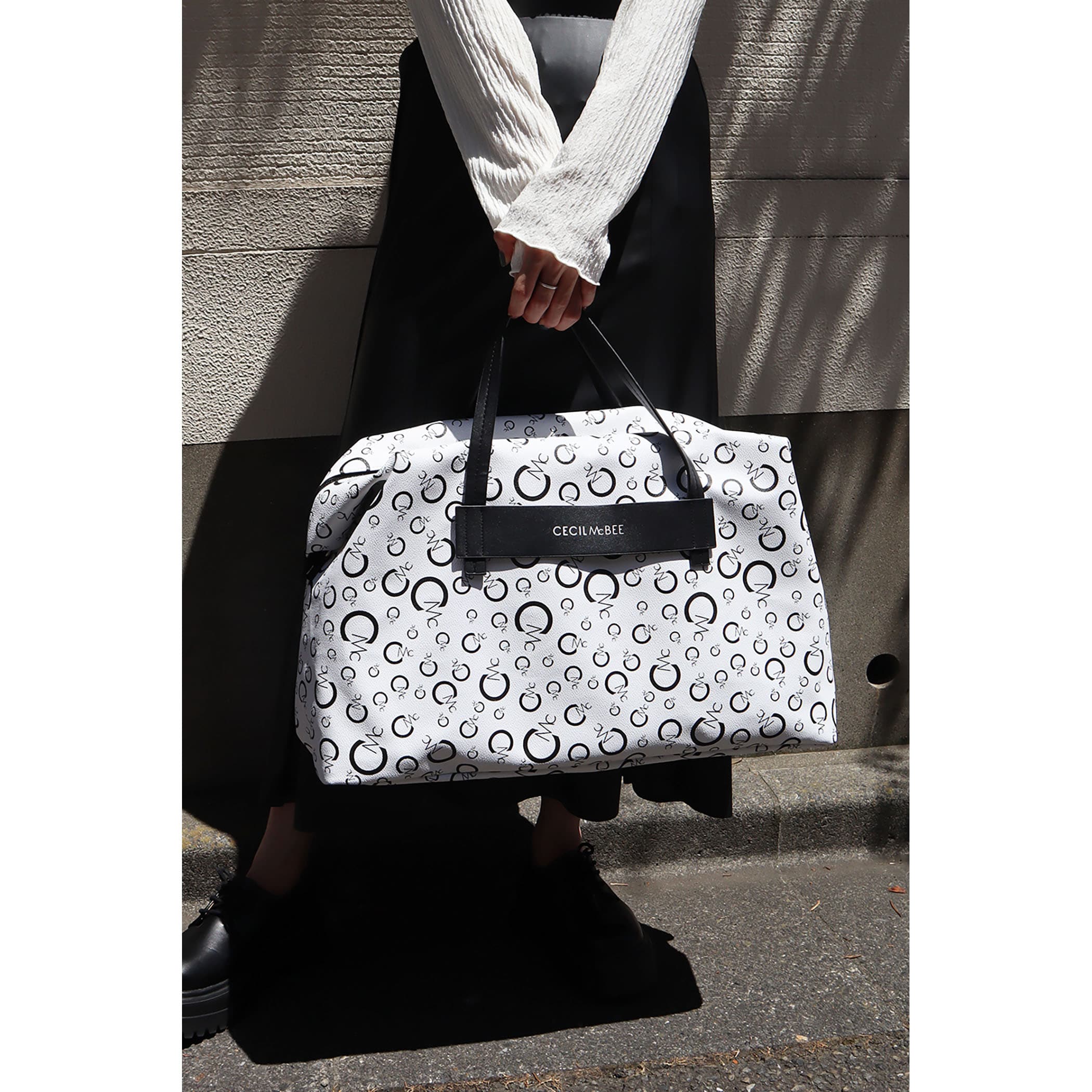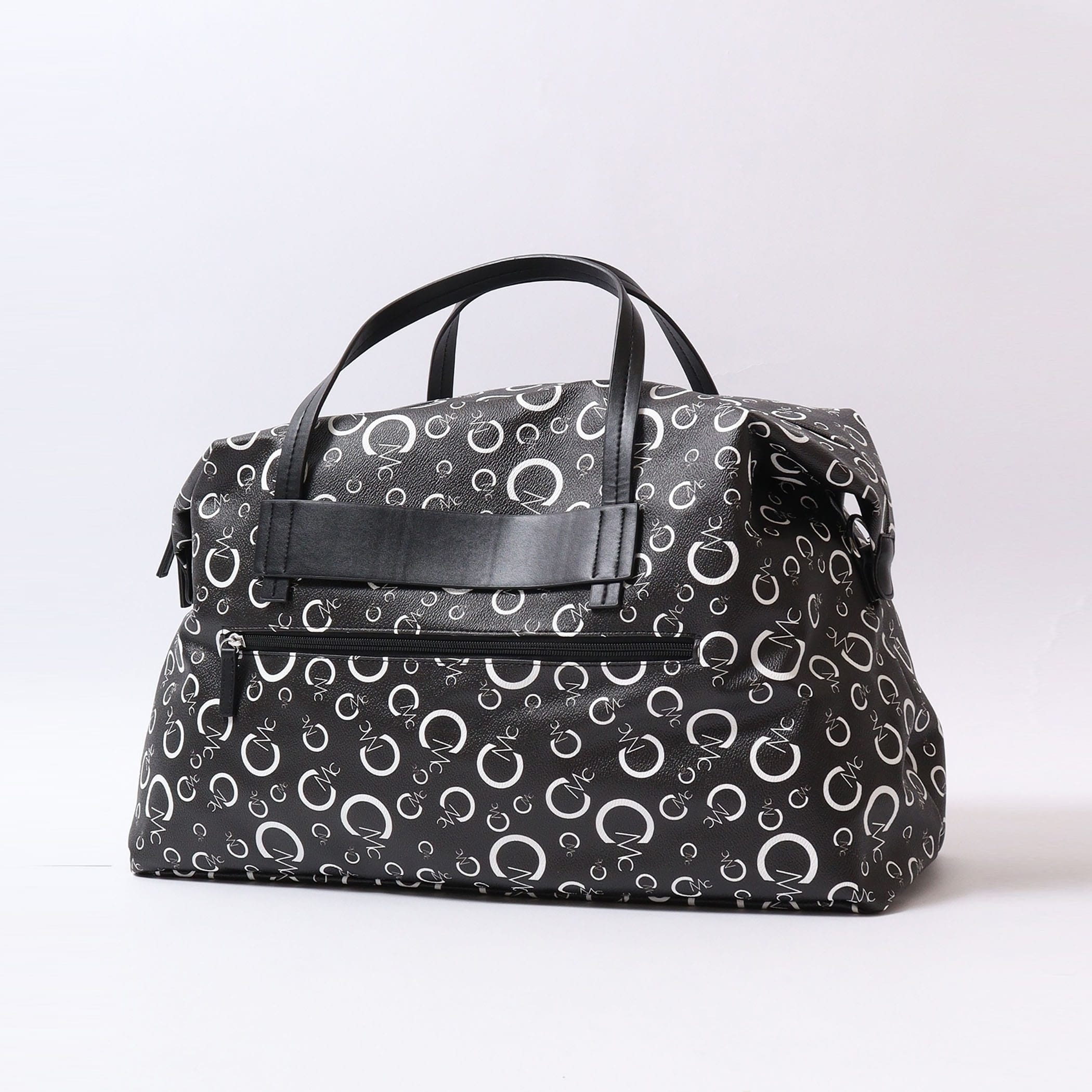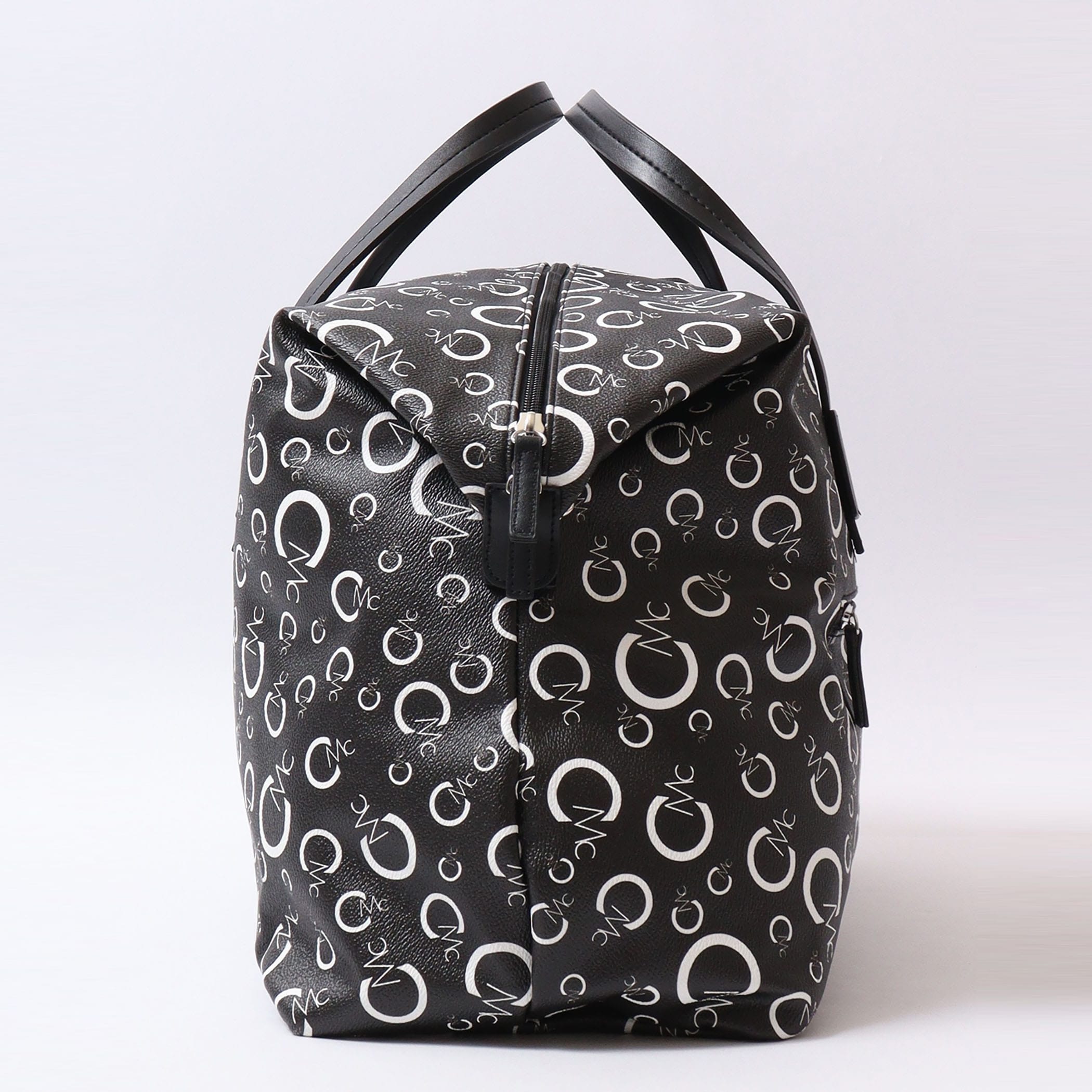 CECIL McBEEオリジナルのモノグラムプリントのボストンバッグ。2~3泊の旅行なども安心な大容量サイズ。背胴側に通し穴が付いているのでスーツケースのキャリーバーに固定できるのもポイント◎                  背胴ファスナーポケット/内装ファスナーポケットx1/オープンポケットx2