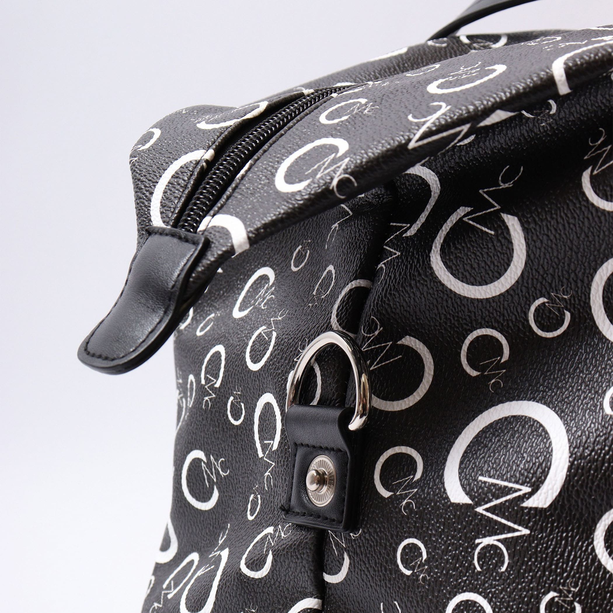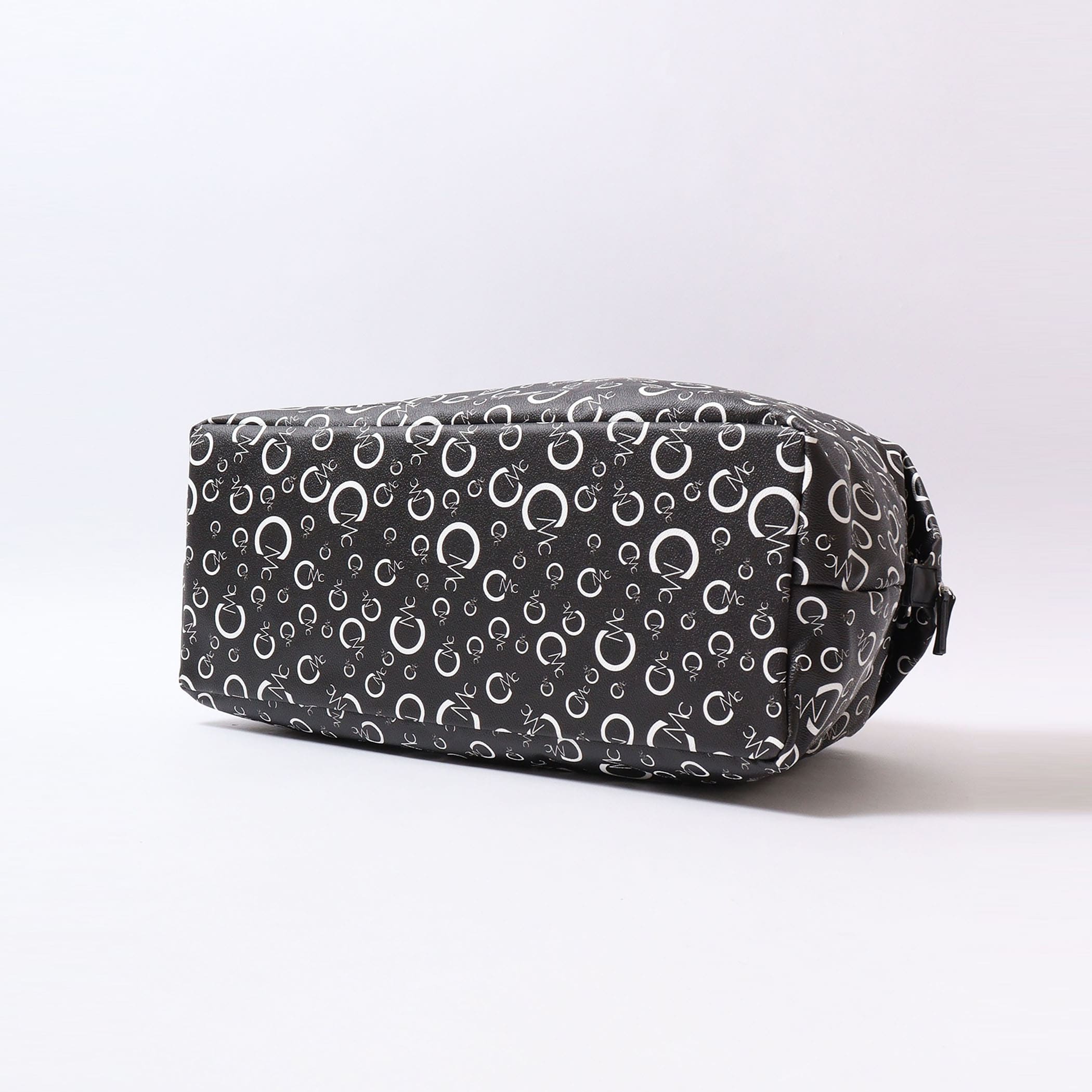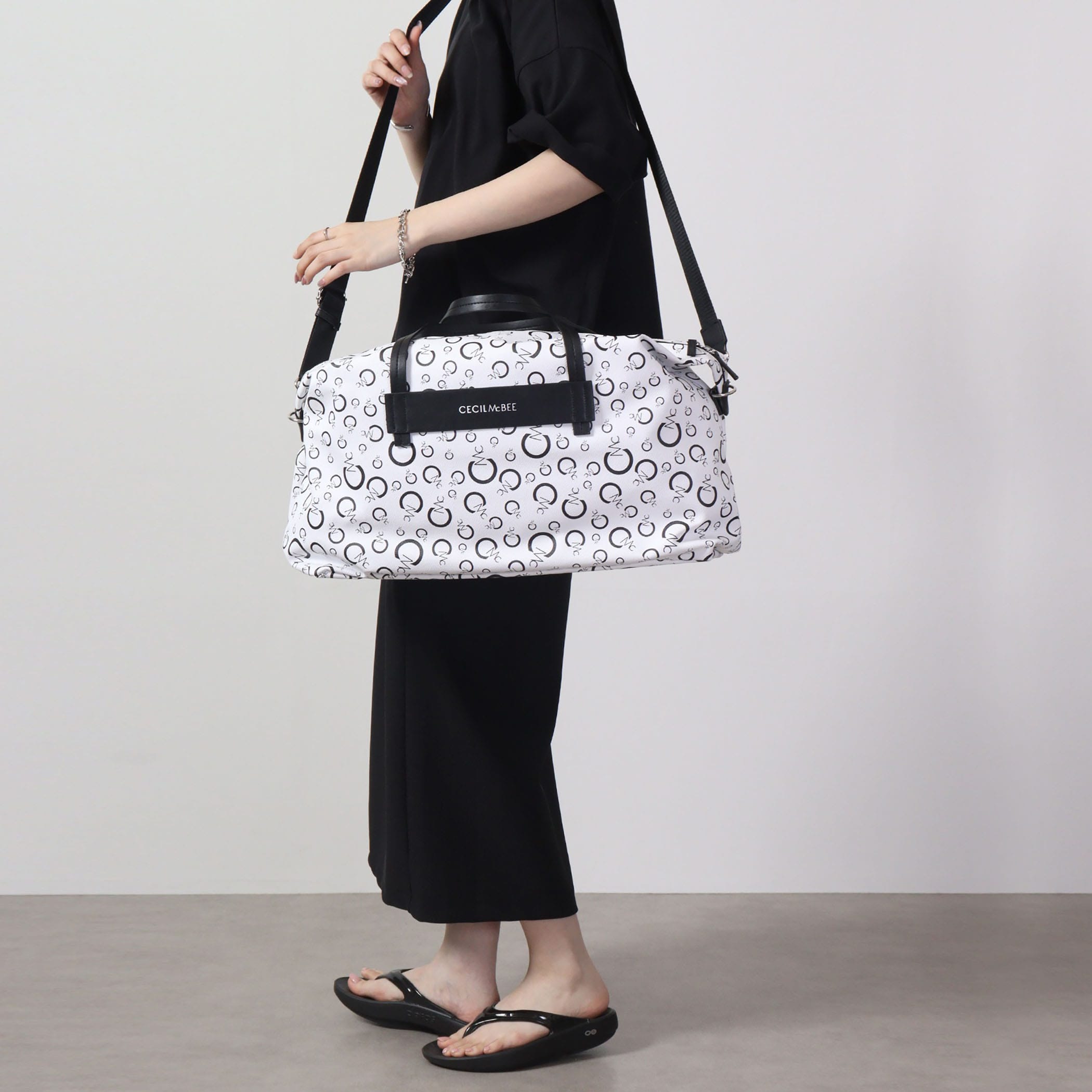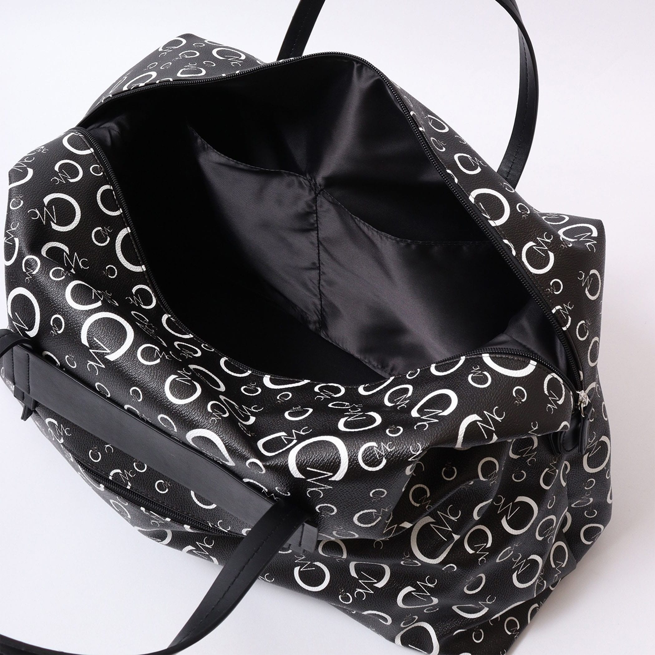 CECIL McBEEオリジナルのモノグラムプリントのボストンバッグ。2~3泊の旅行なども安心な大容量サイズ。背胴側に通し穴が付いているのでスーツケースのキャリーバーに固定できるのもポイント◎                  背胴ファスナーポケット/内装ファスナーポケットx1/オープンポケットx2