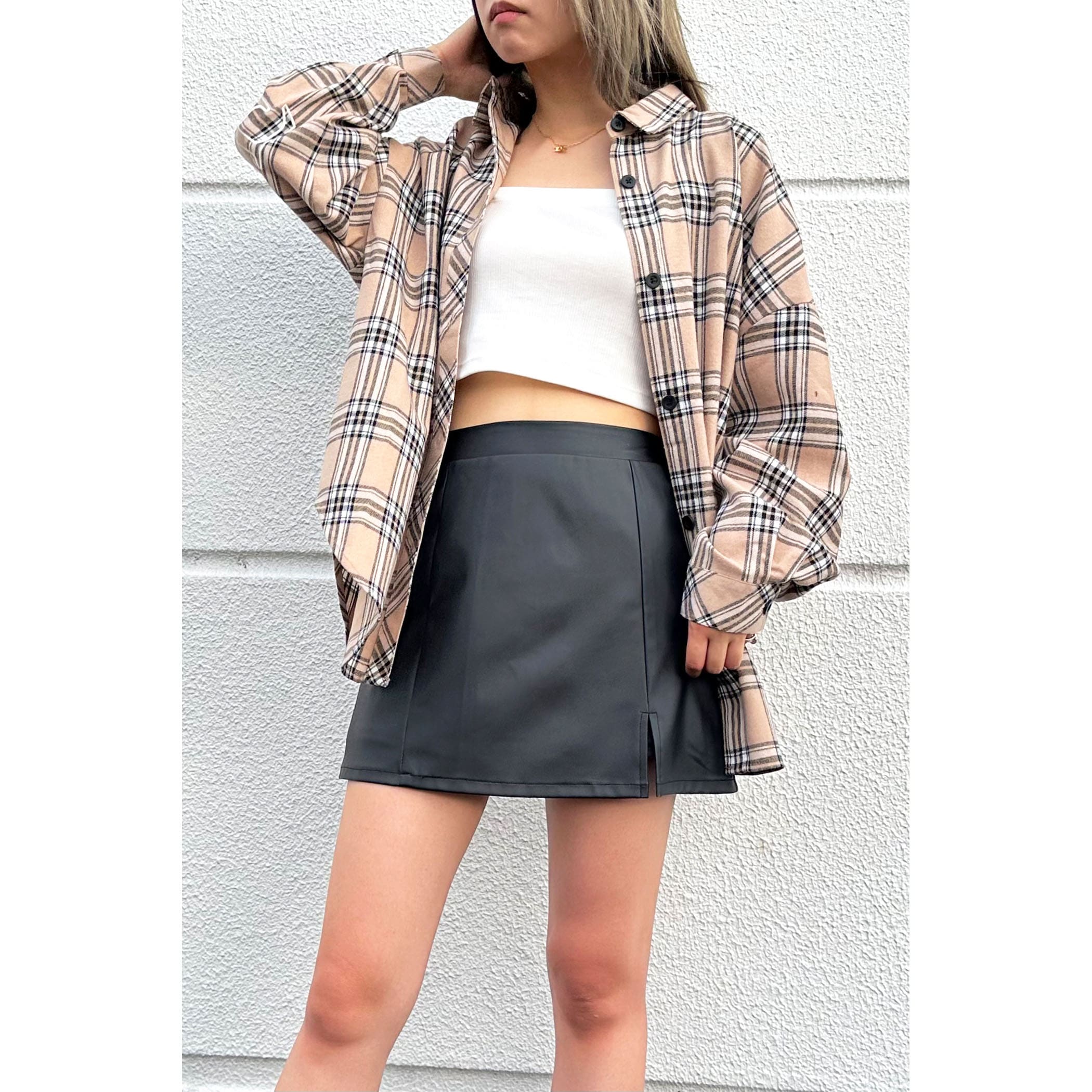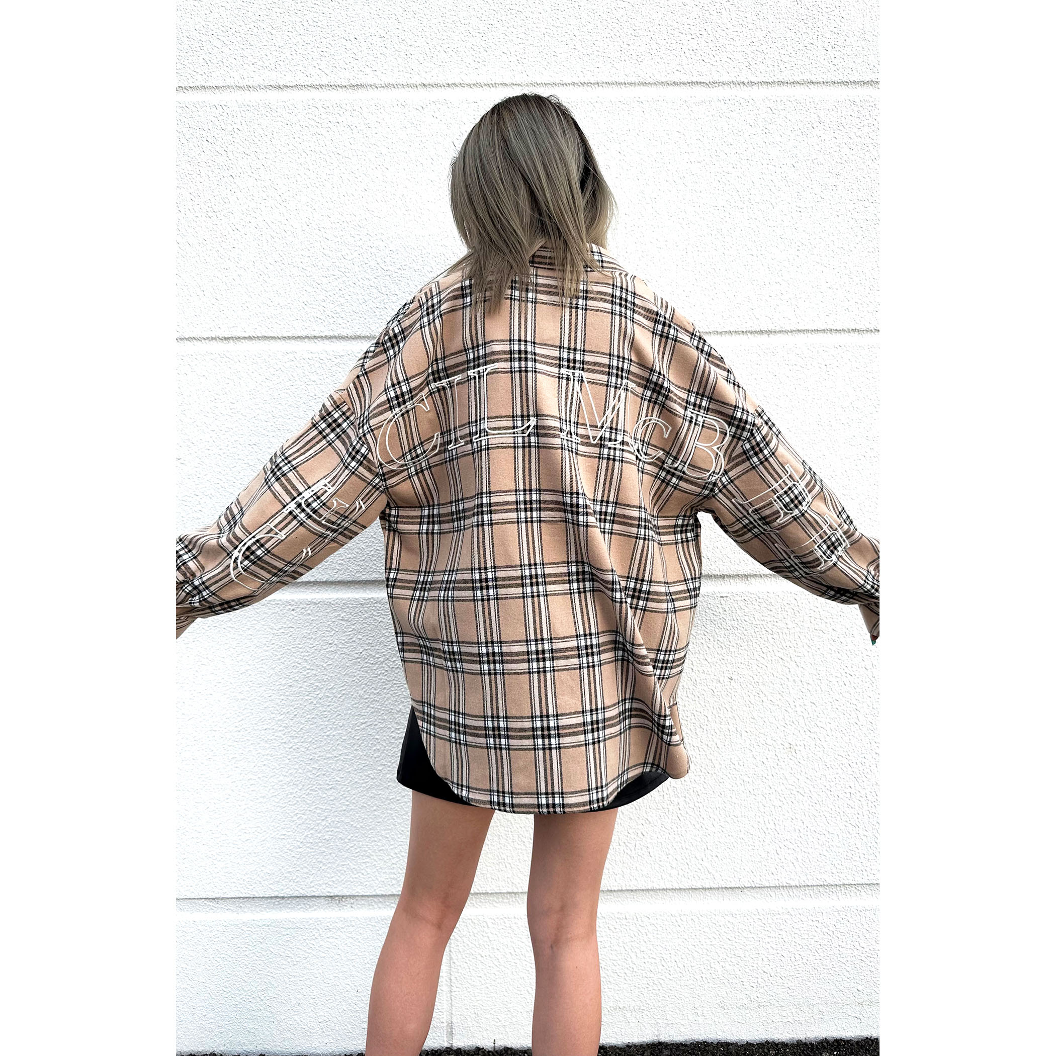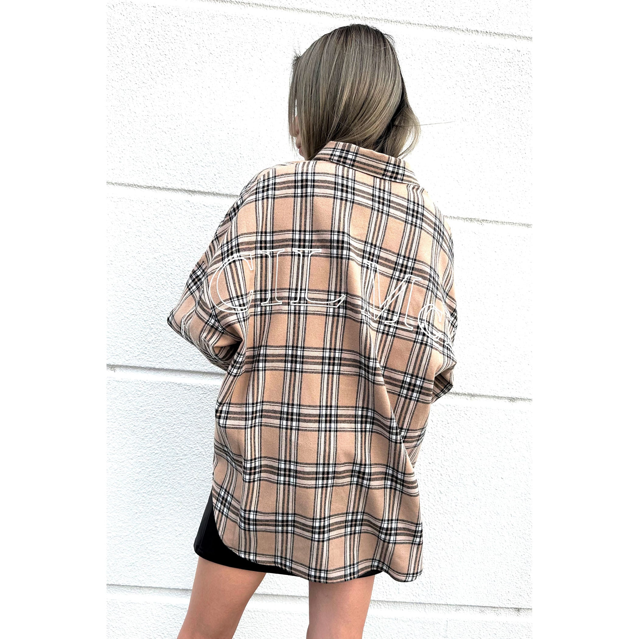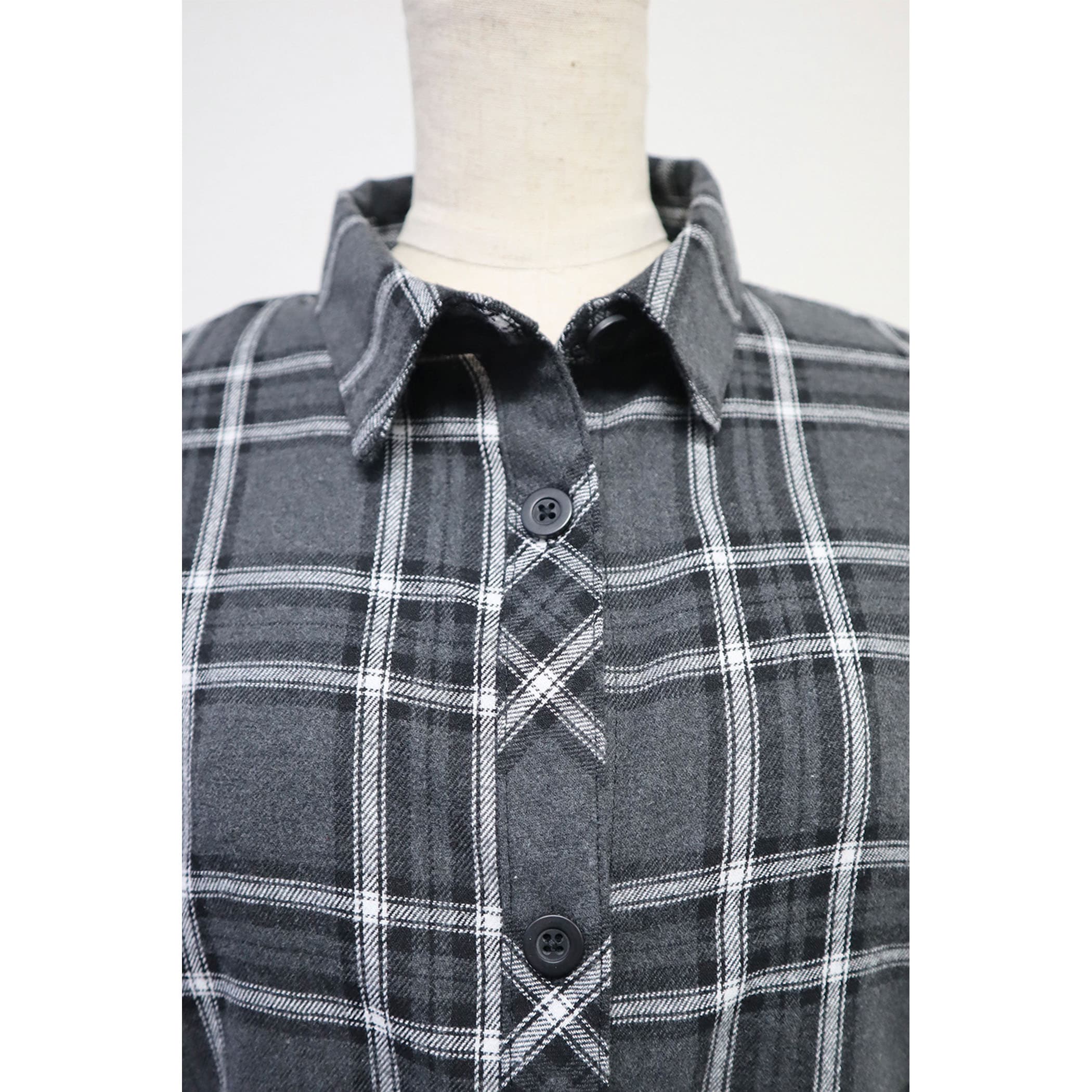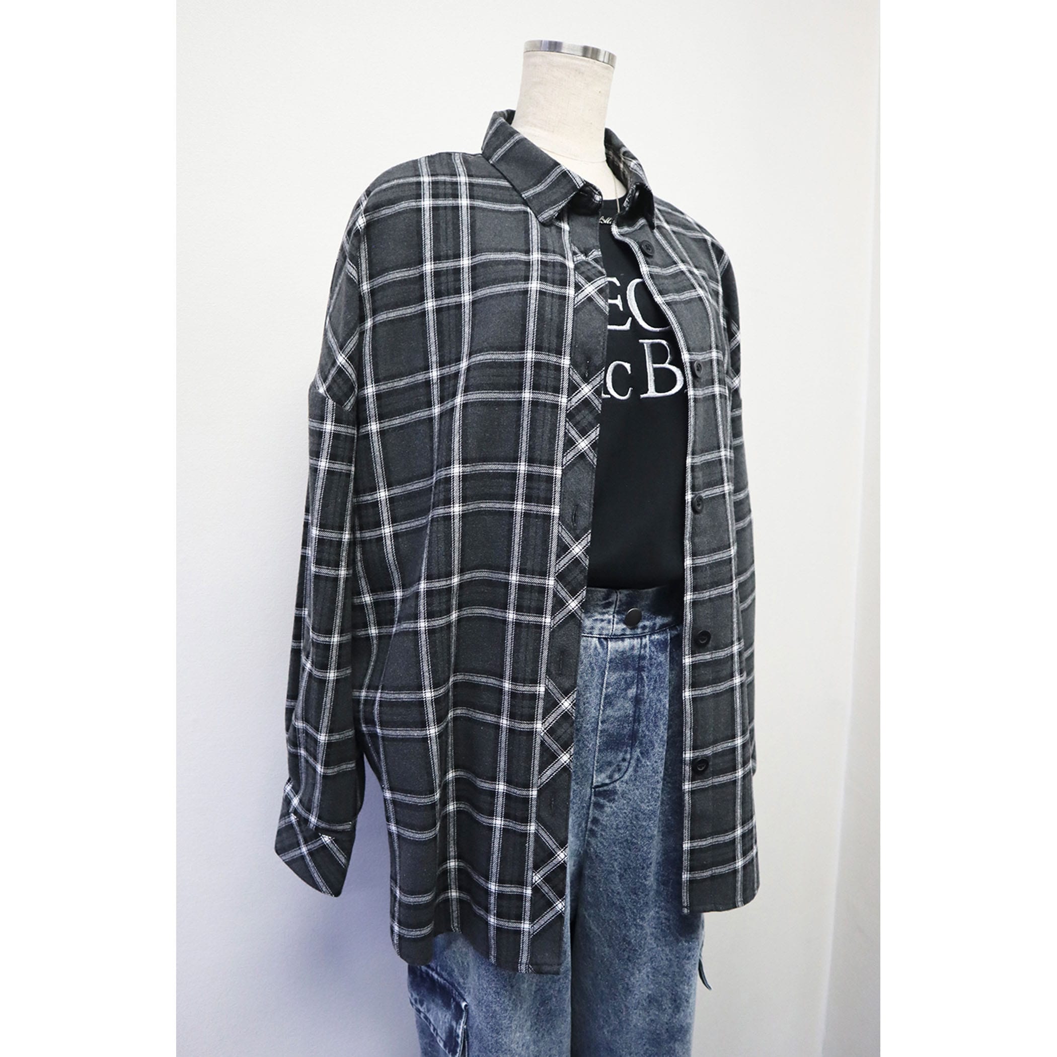 後ろ身頃の大き目ロゴ刺繍がポイントのチェックシャツ☆長めの着丈とゆるめのシルエット感が可愛い1枚です。