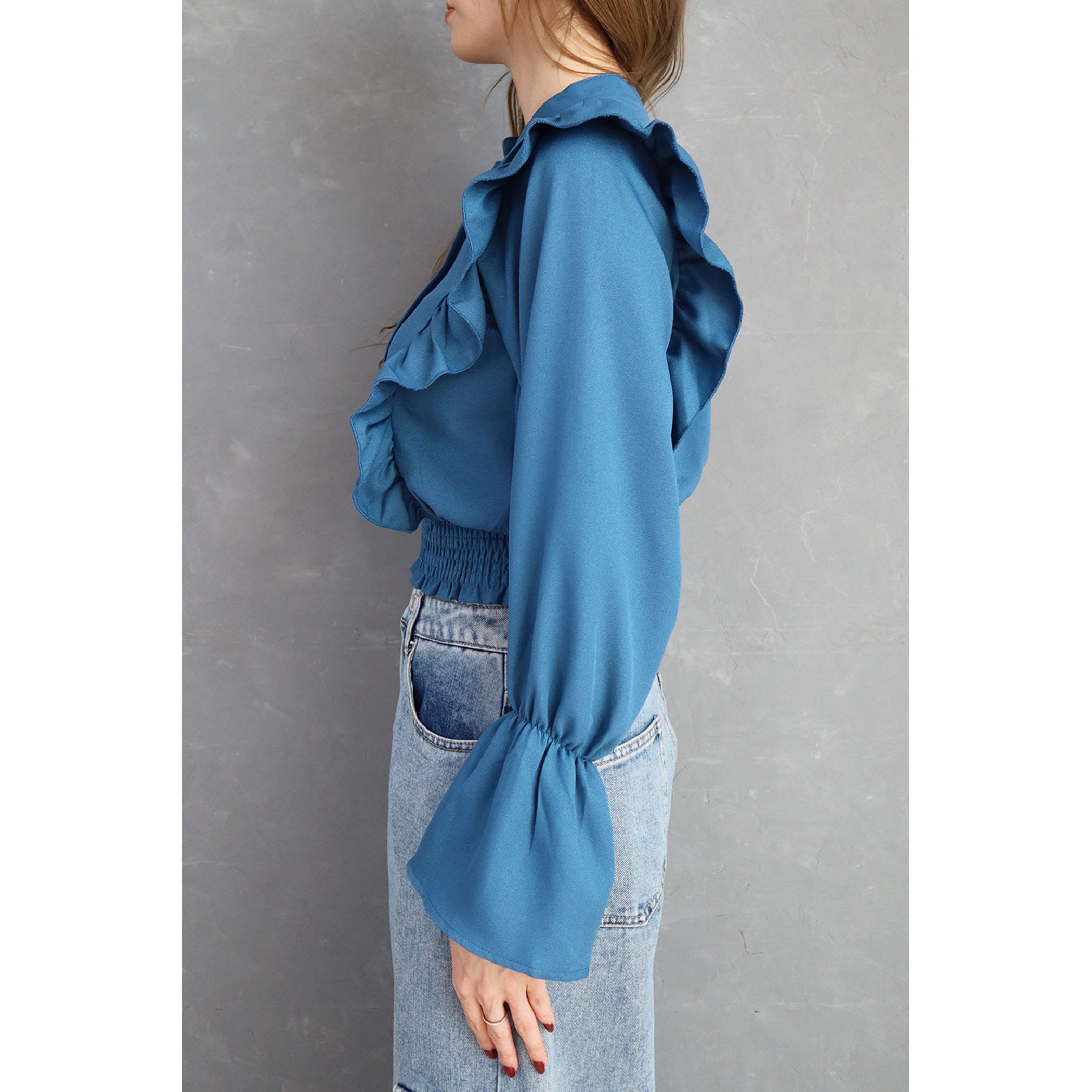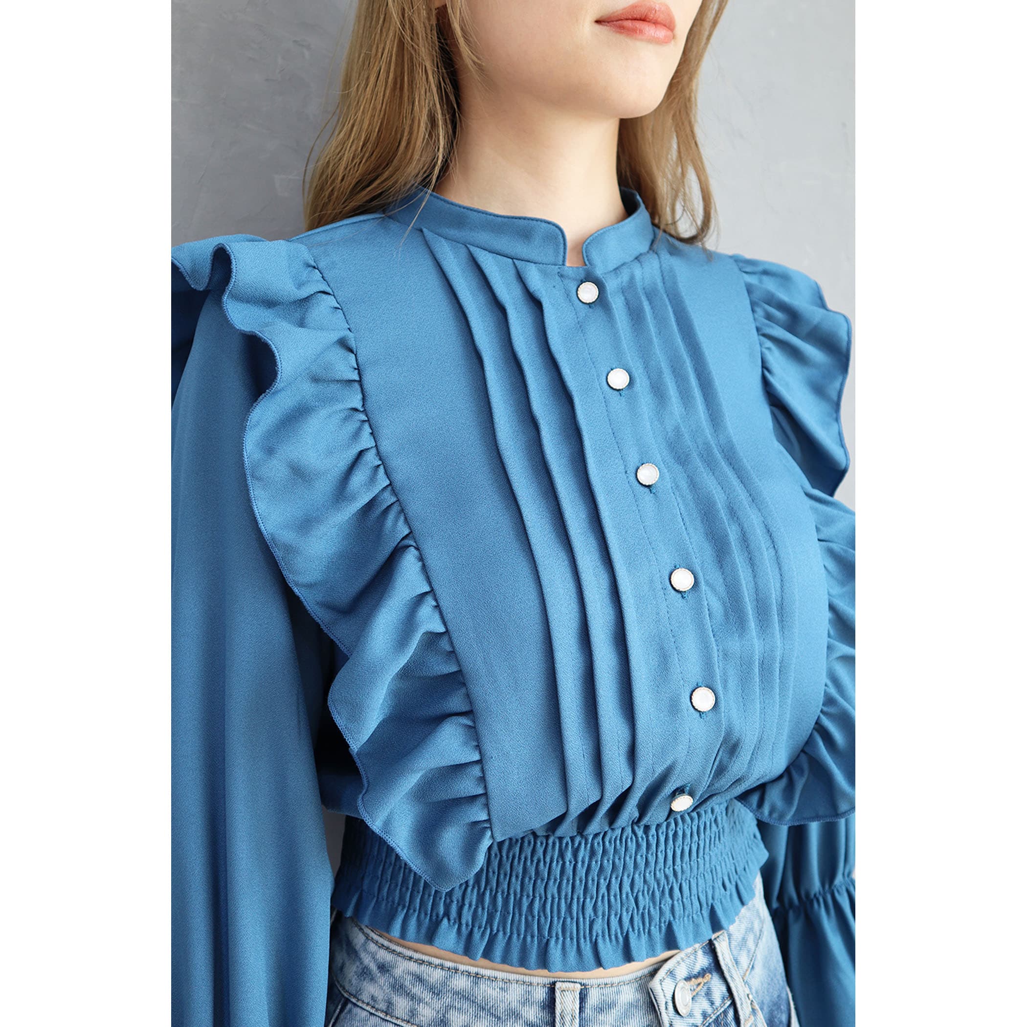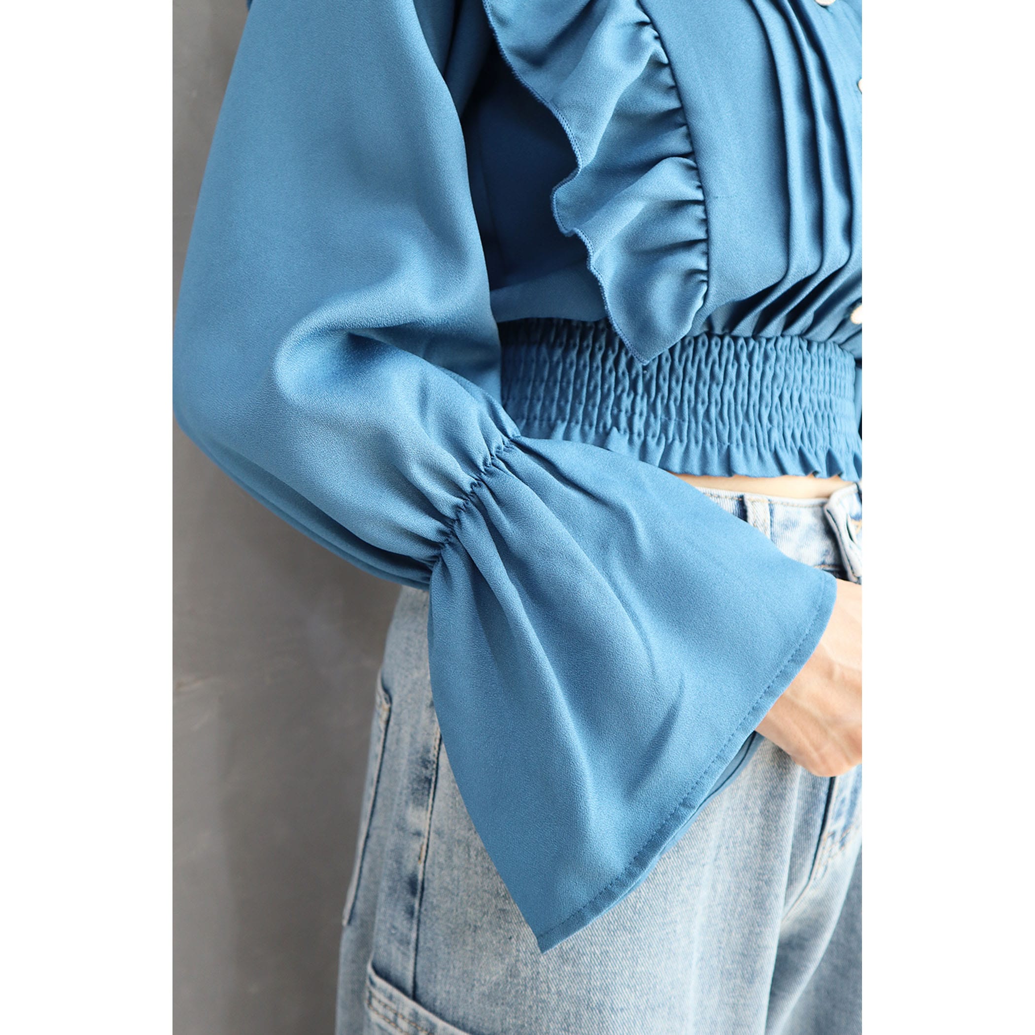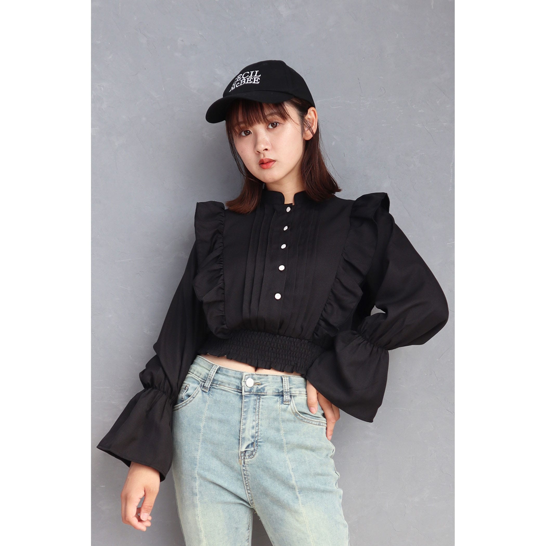 フレアデザインとキャンディースリーブがフェミニンムードを演出してくれるブラウス。パールボタンもとってもキュート?ウエストのシャーリングがアクセントになっており、ウエストを細く見せてくれます。パンツスタイルにもスカートスタイルにも幅広く着用できる万能アイテムです♪