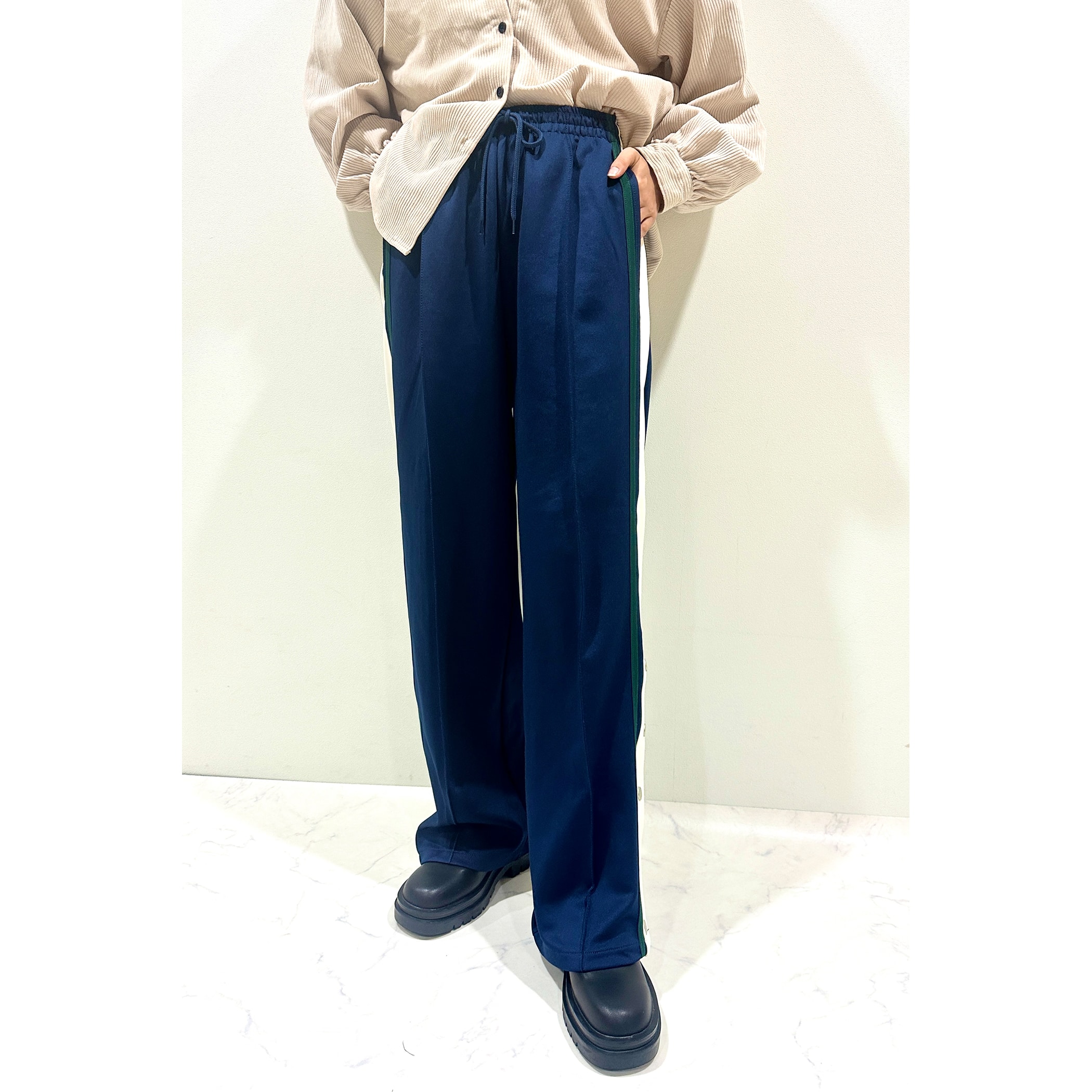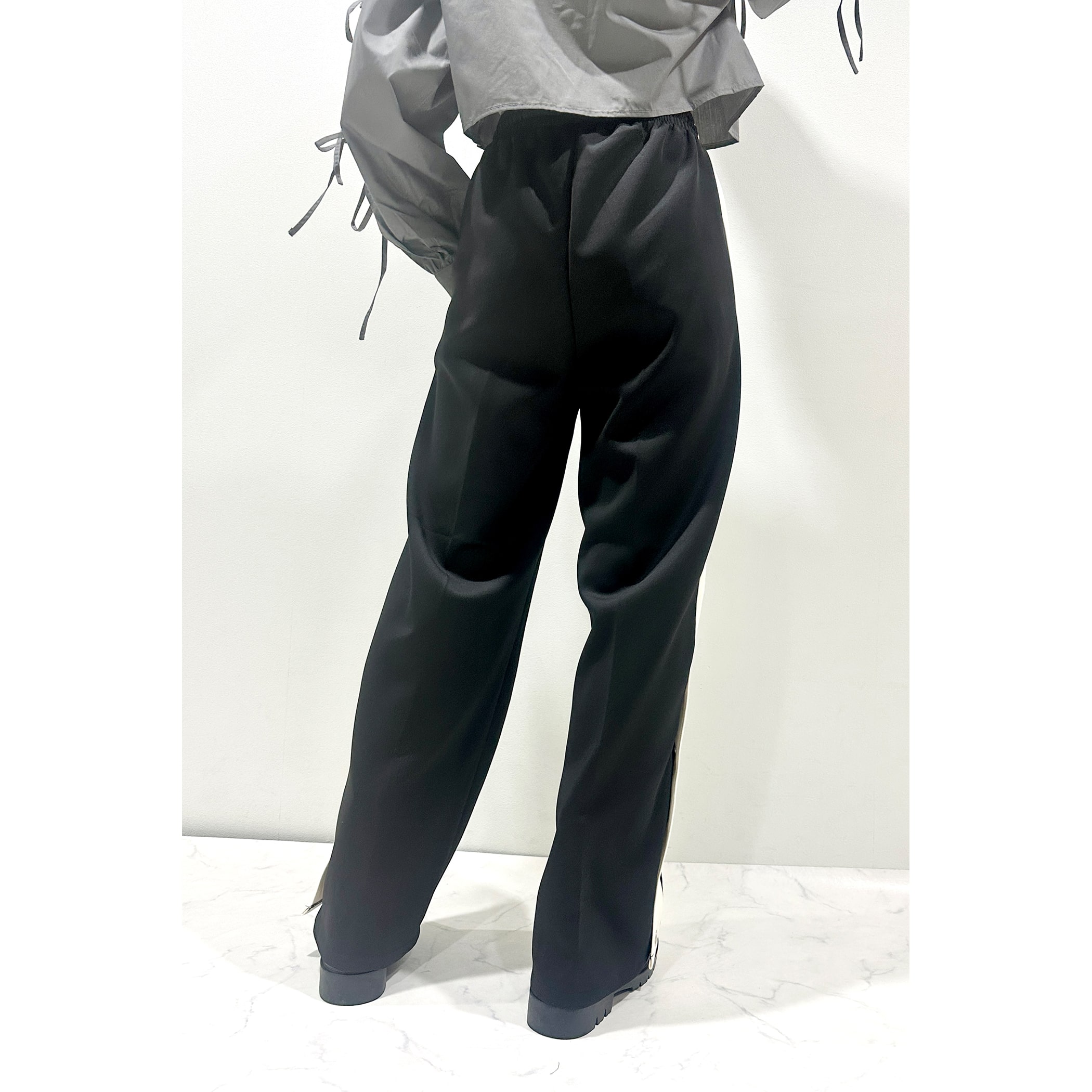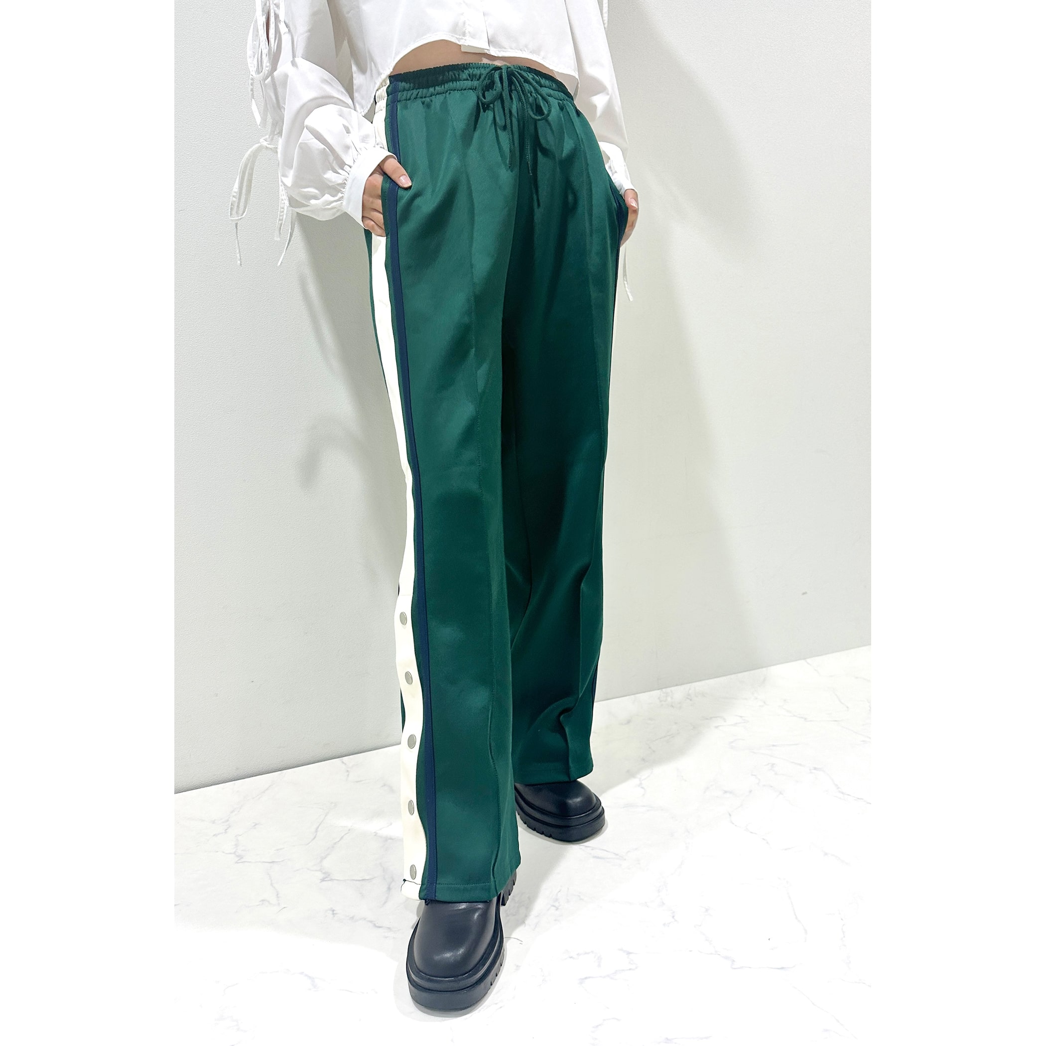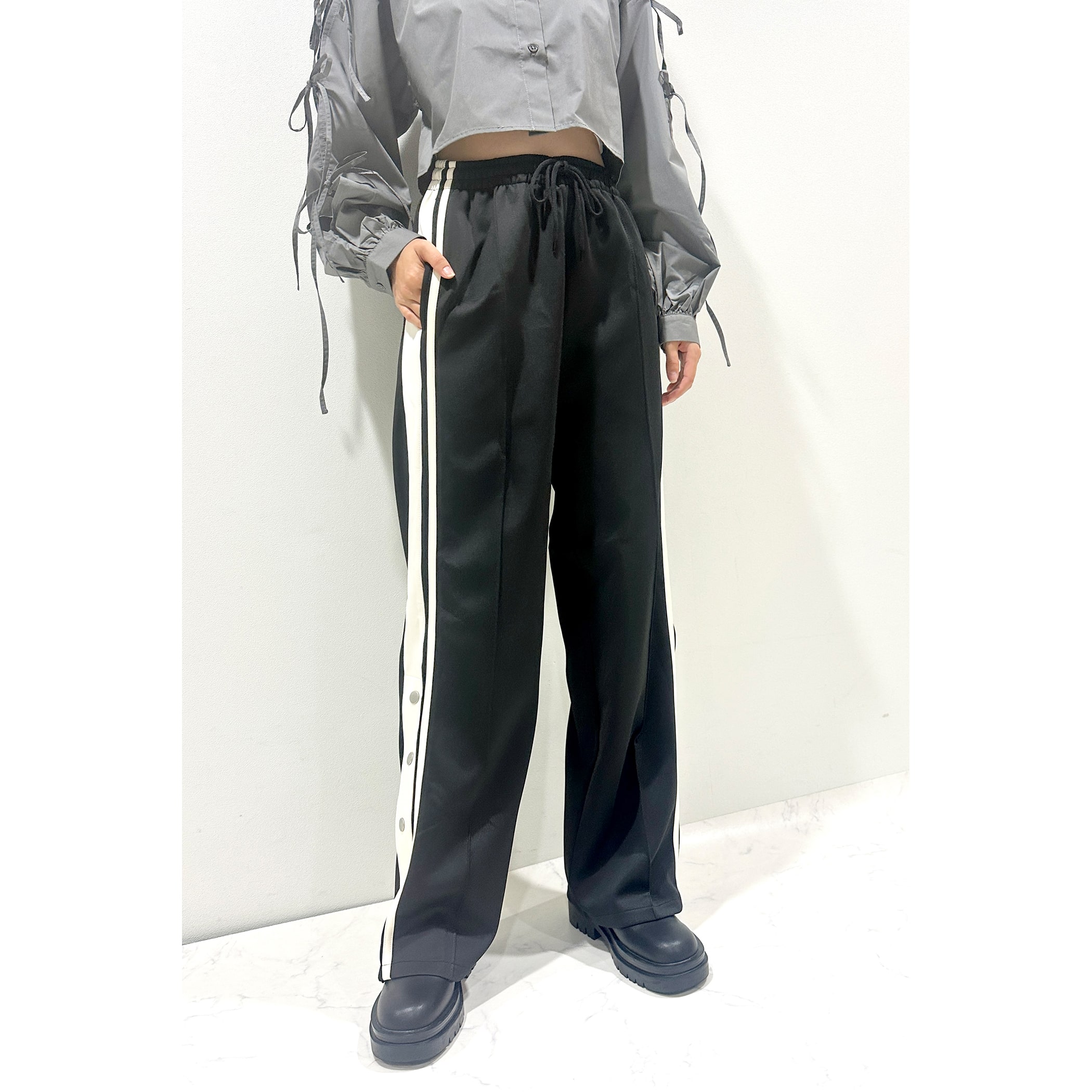 トレンドのラインパンツは幅広いコーデに合わせやすい1着。ワイドシルエットが抜け感のあるストリートスタイルを演出。裾にはボタンが付いているので、フレアシルエットも楽しめる2WAY仕様。ウエストはゴムなので履き心地抜群◎