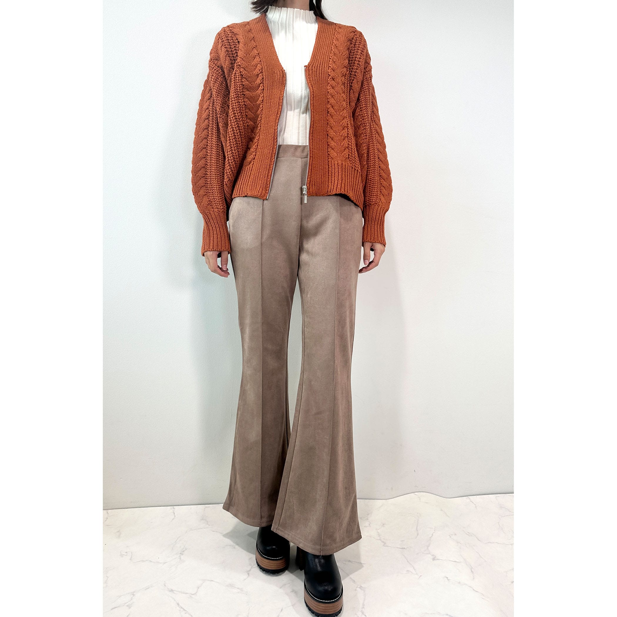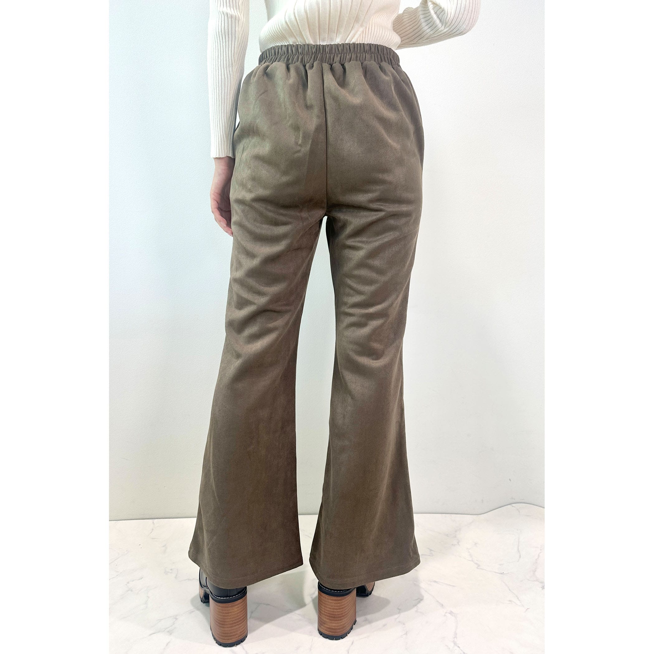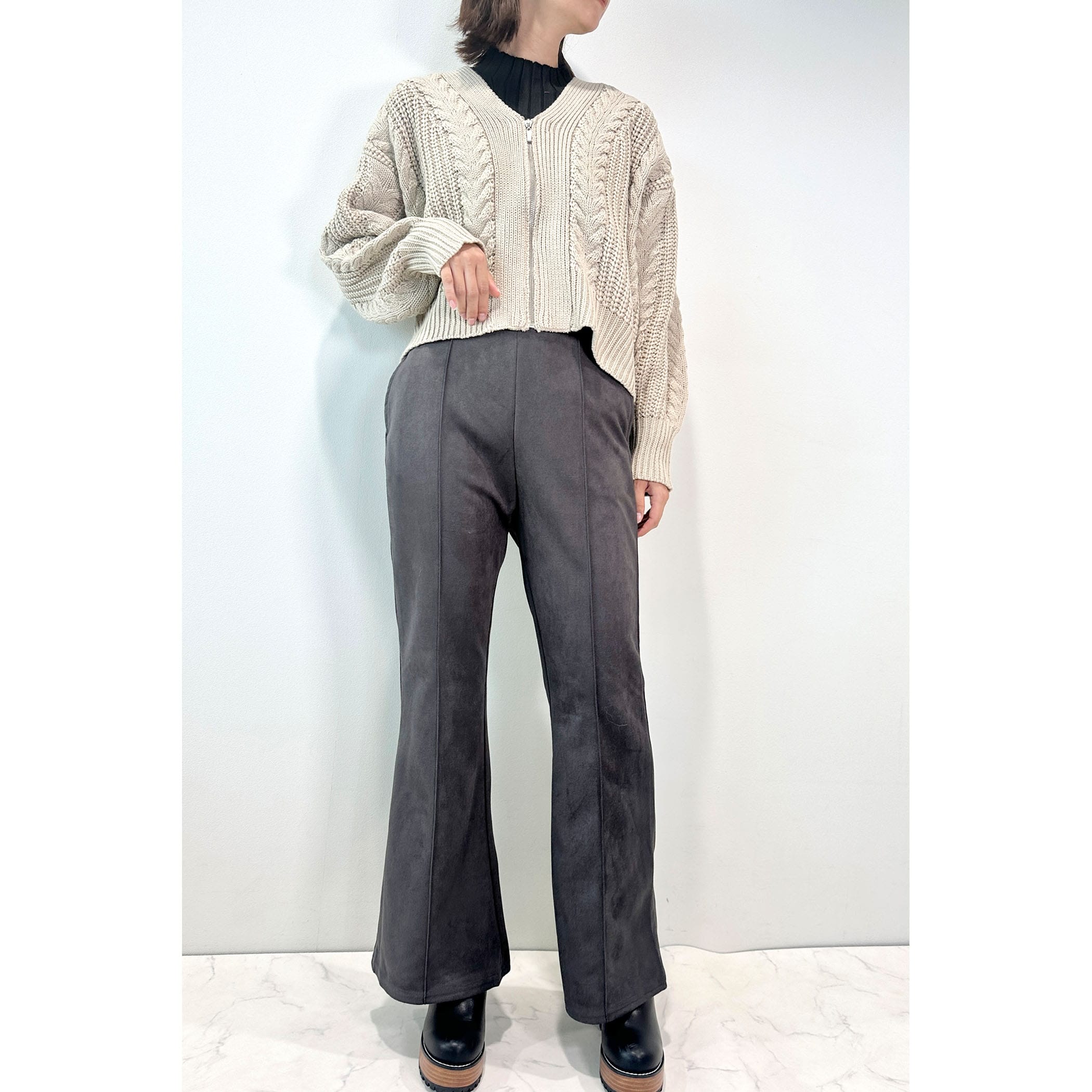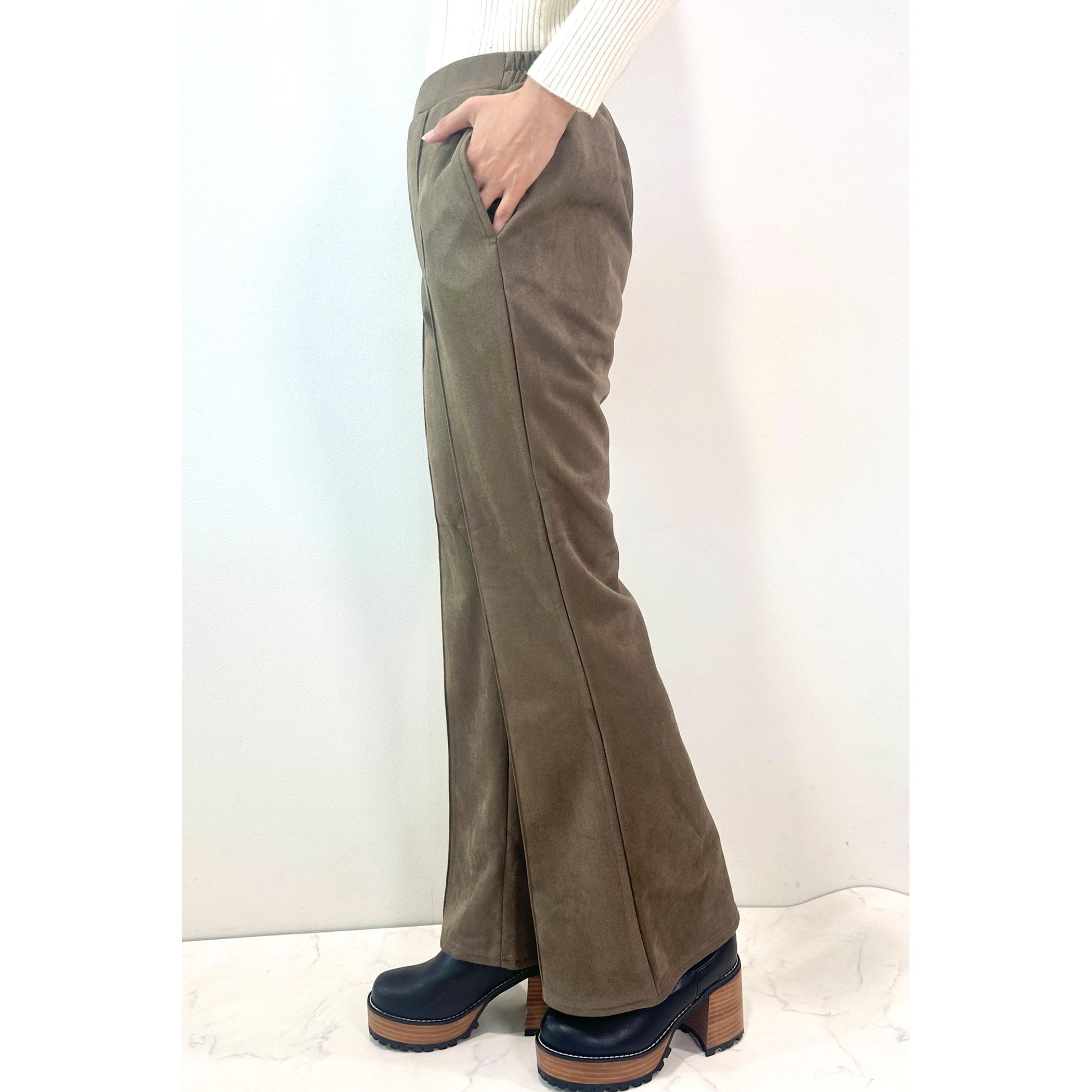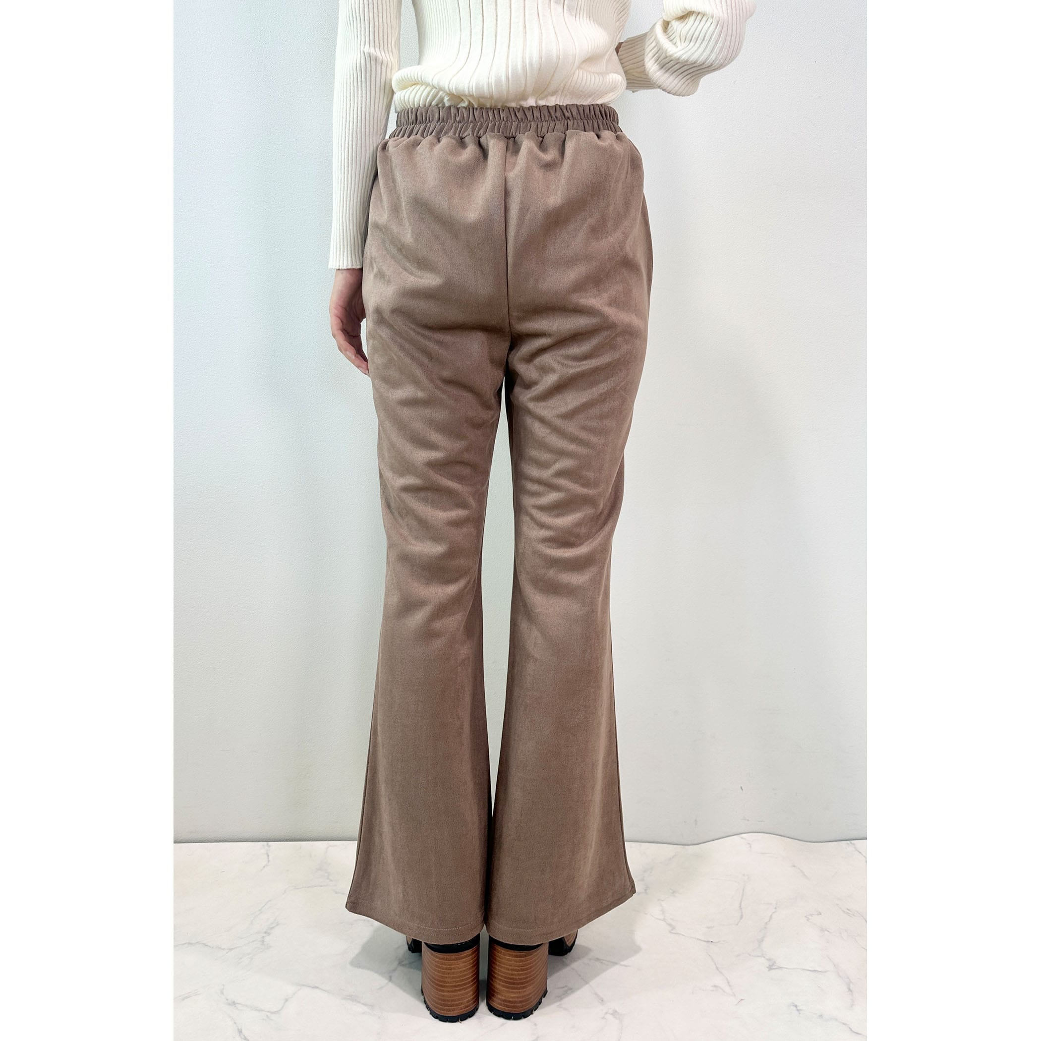 腰回りがスッキリ見えするハイウエストデザインのセミフレアパンツ。伸縮性のあるスエードライクな柔らかな素材を使用しており、リラックスした履き心地です。ベーシックなブラックに加え、やわらかなニュアンスカラーを揃えました。
