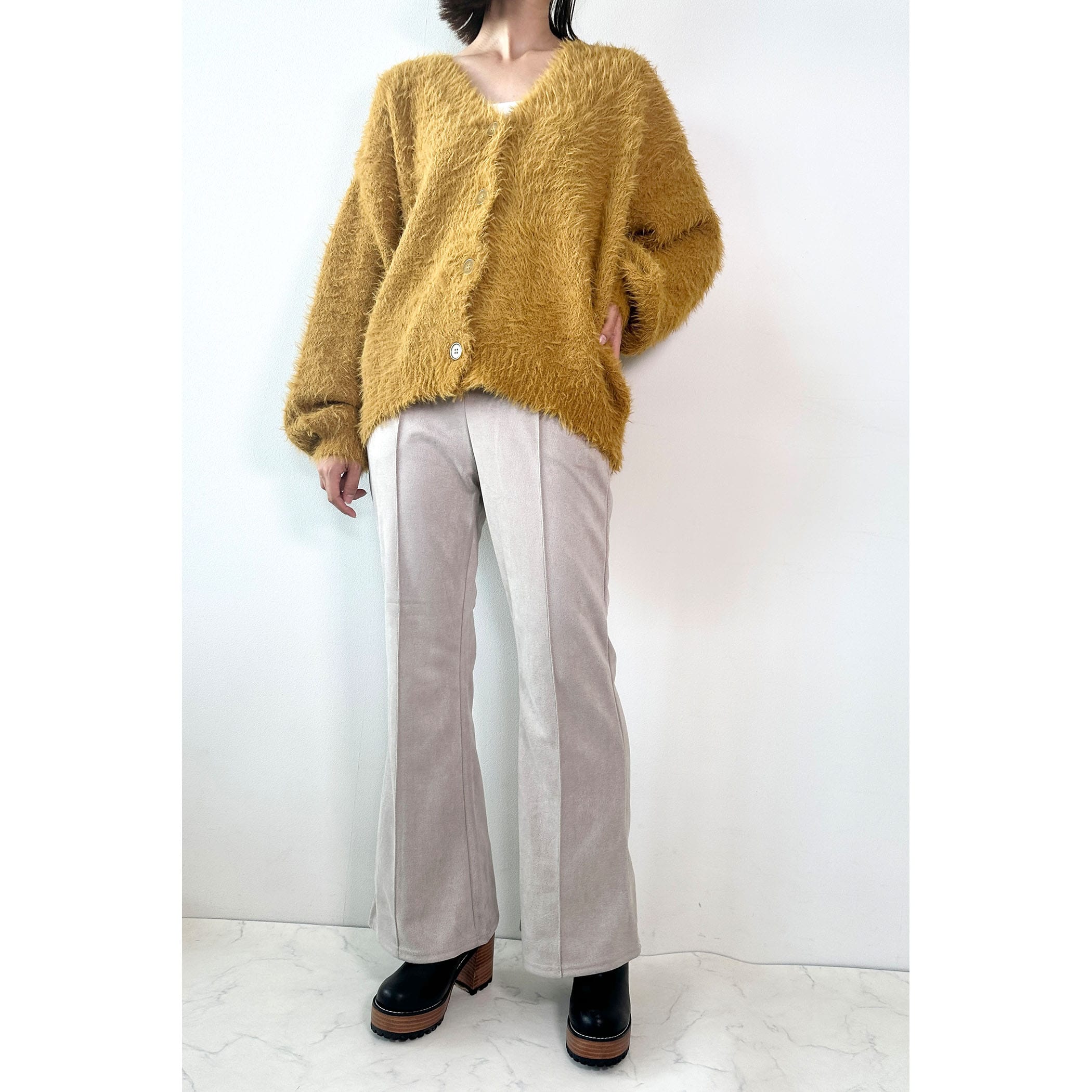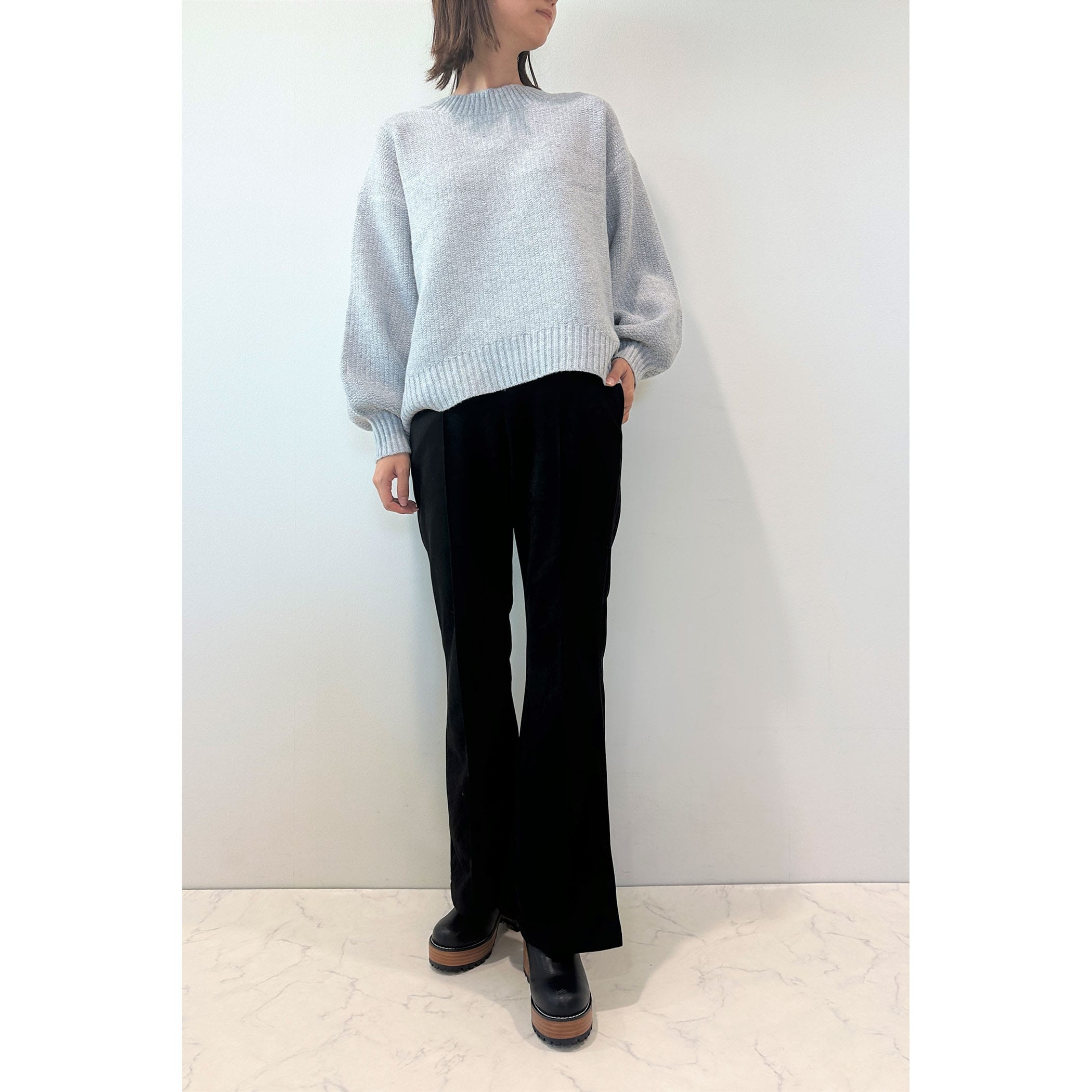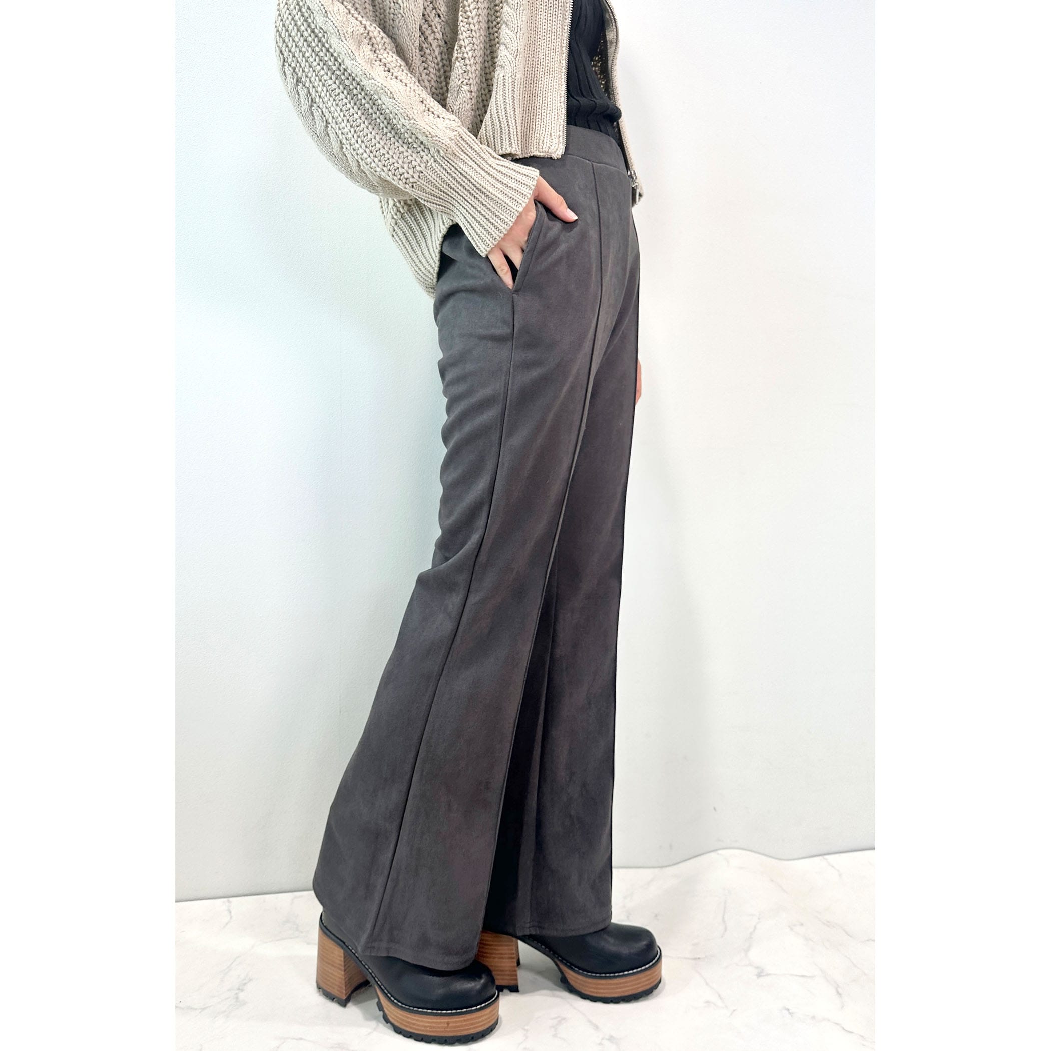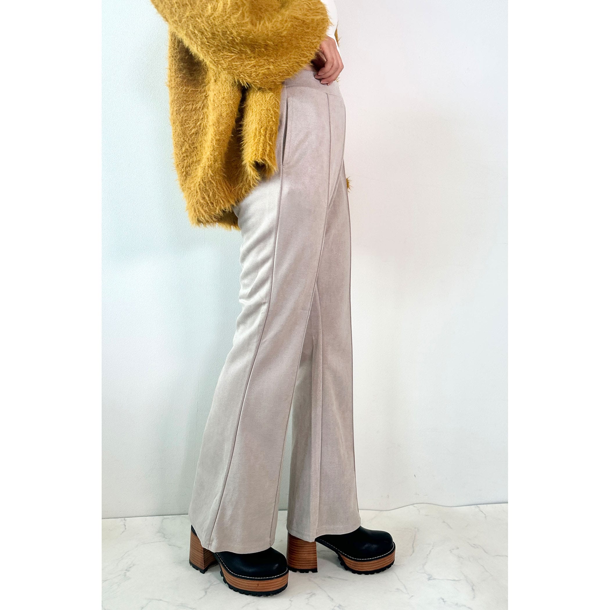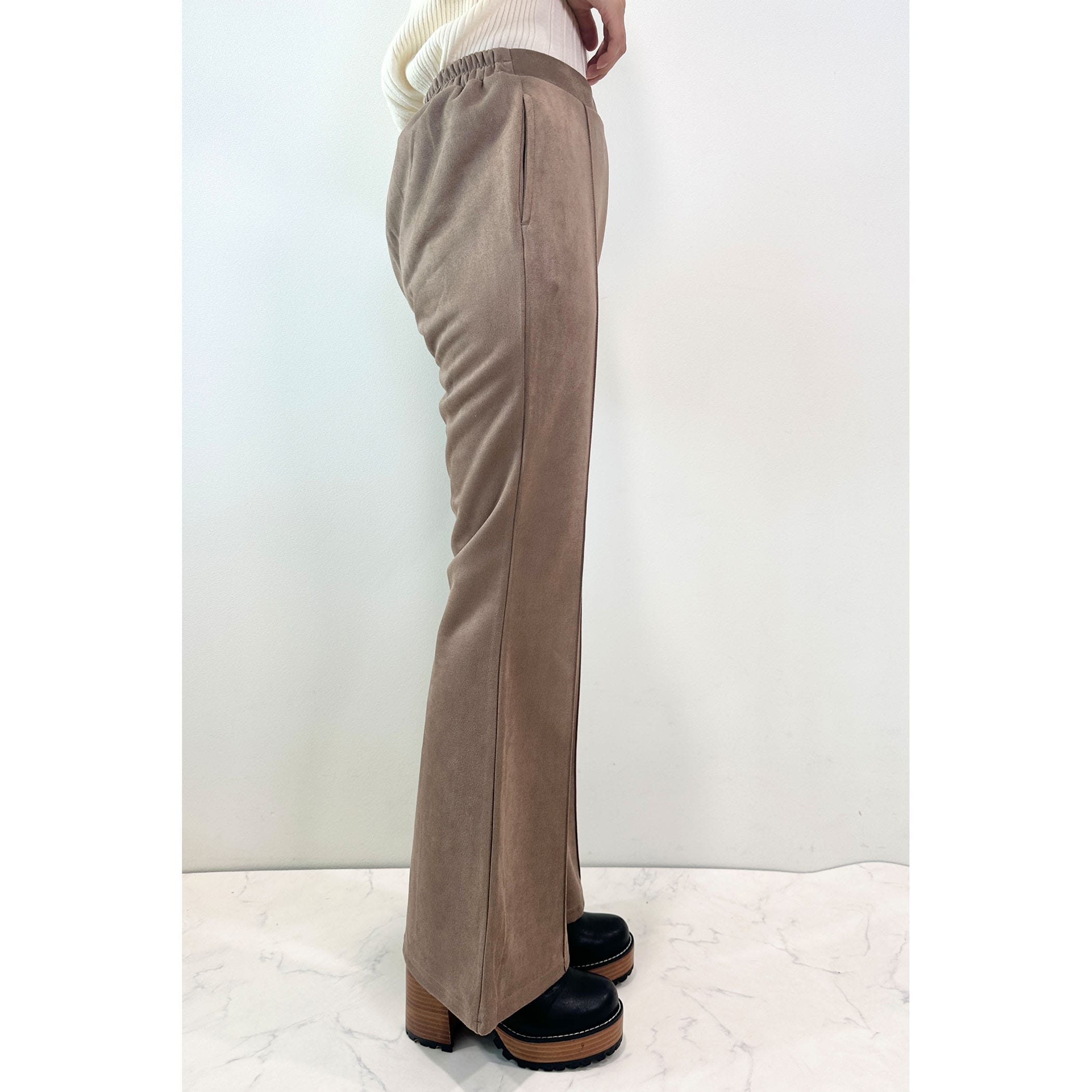 腰回りがスッキリ見えするハイウエストデザインのセミフレアパンツ。伸縮性のあるスエードライクな柔らかな素材を使用しており、リラックスした履き心地です。ベーシックなブラックに加え、やわらかなニュアンスカラーを揃えました。