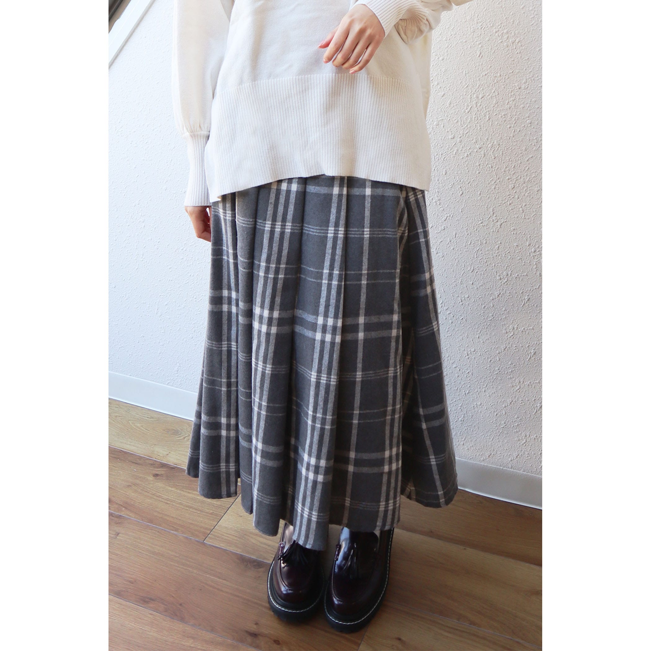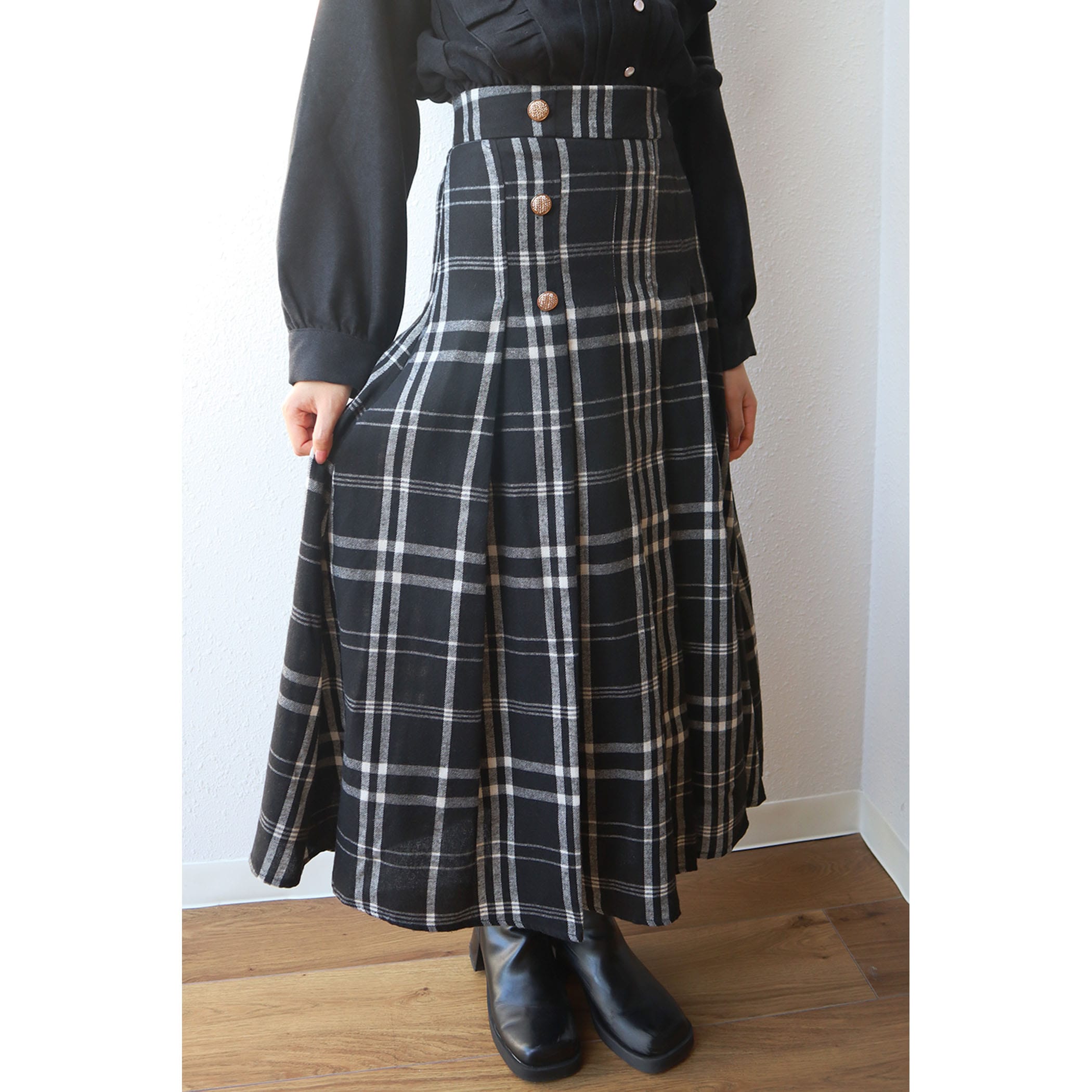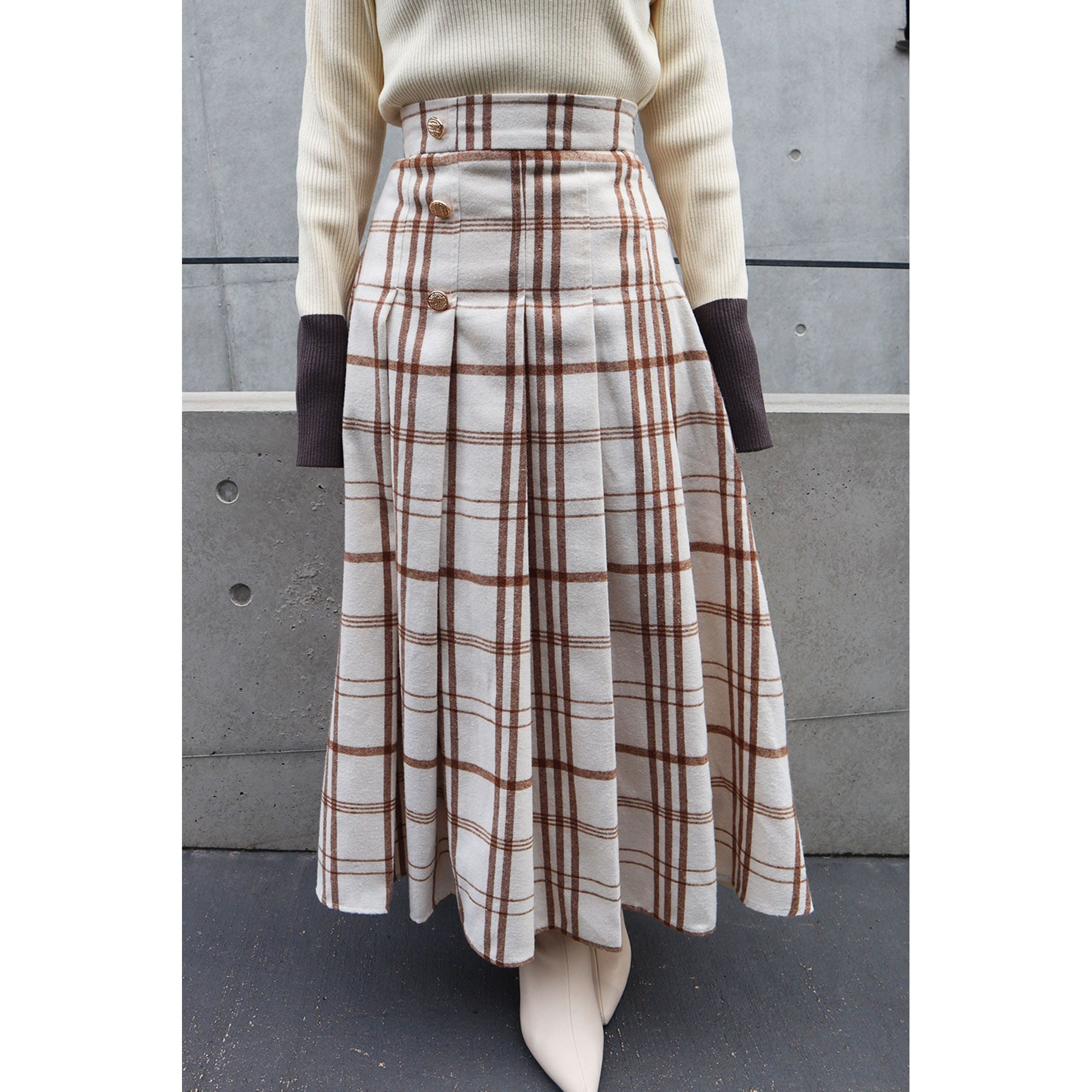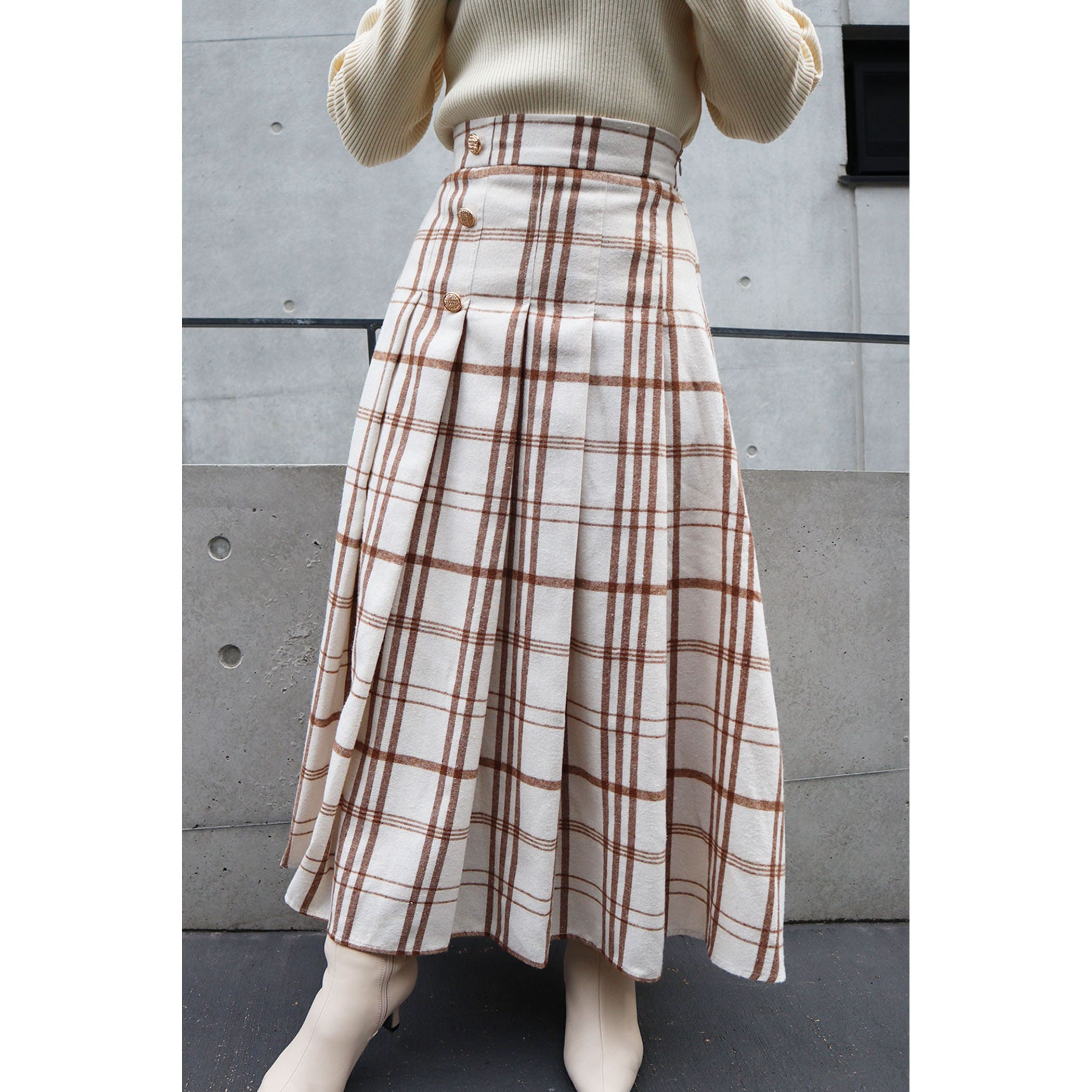 サイドボタンチェックプリーツスカート
