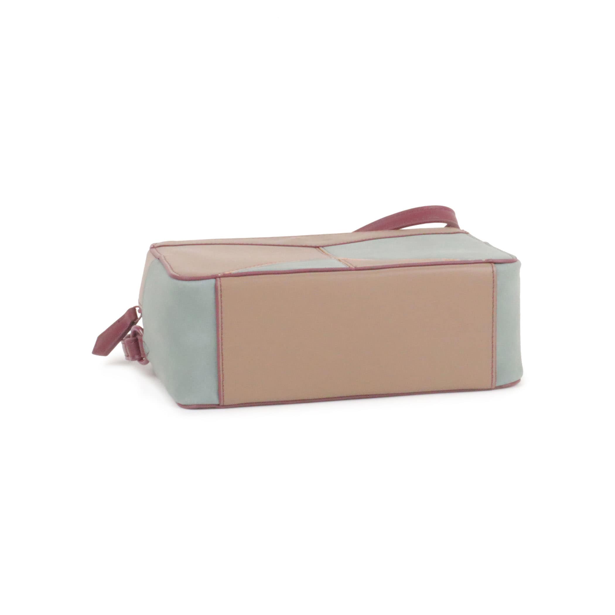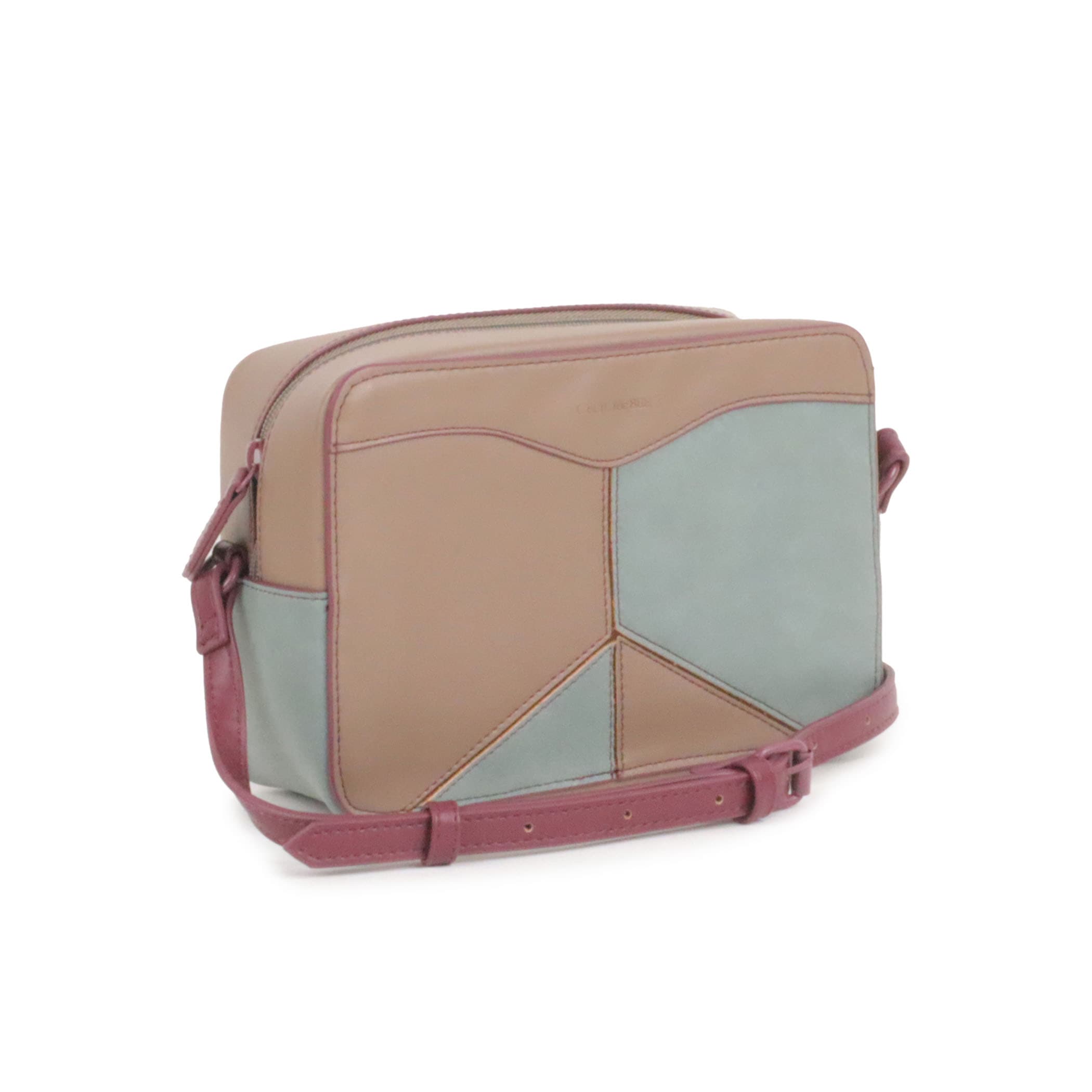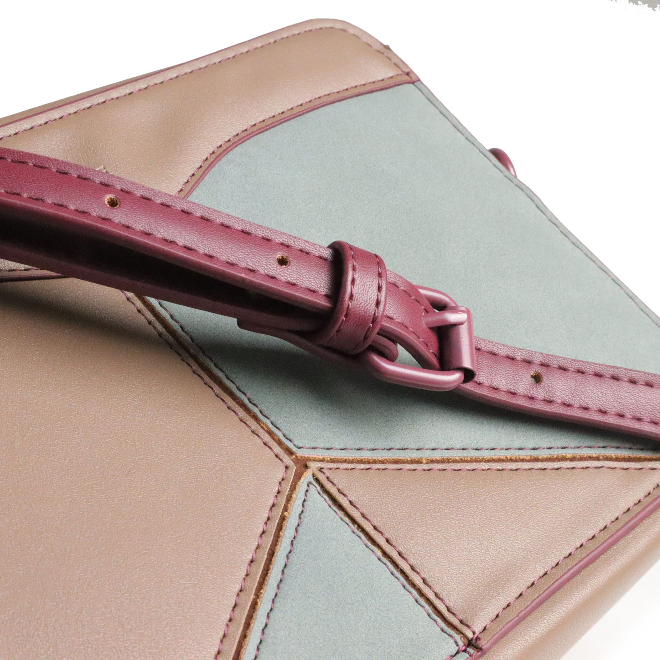 くすみカラーの配色とヌバック調素材が秋らしいパッチワークのデザイン。金具をマットカラーにしレトロ感を表現しています。