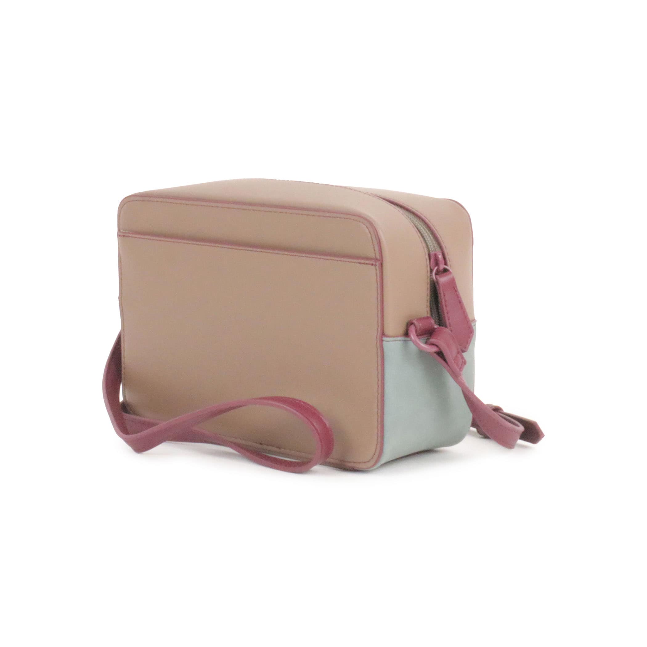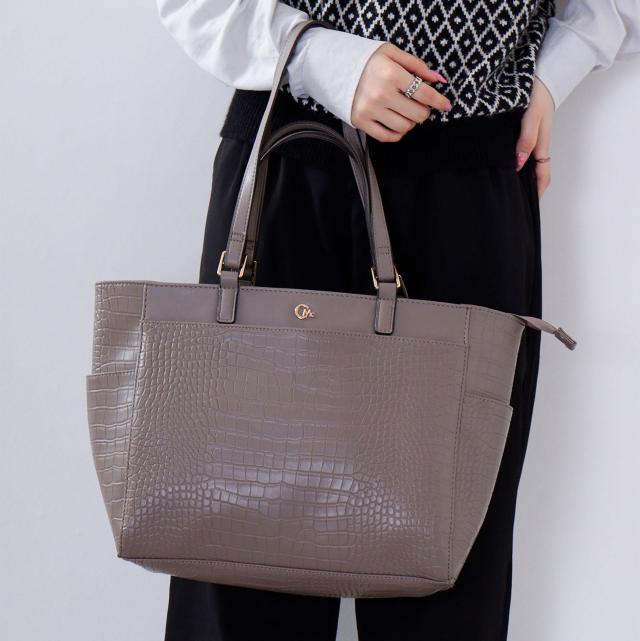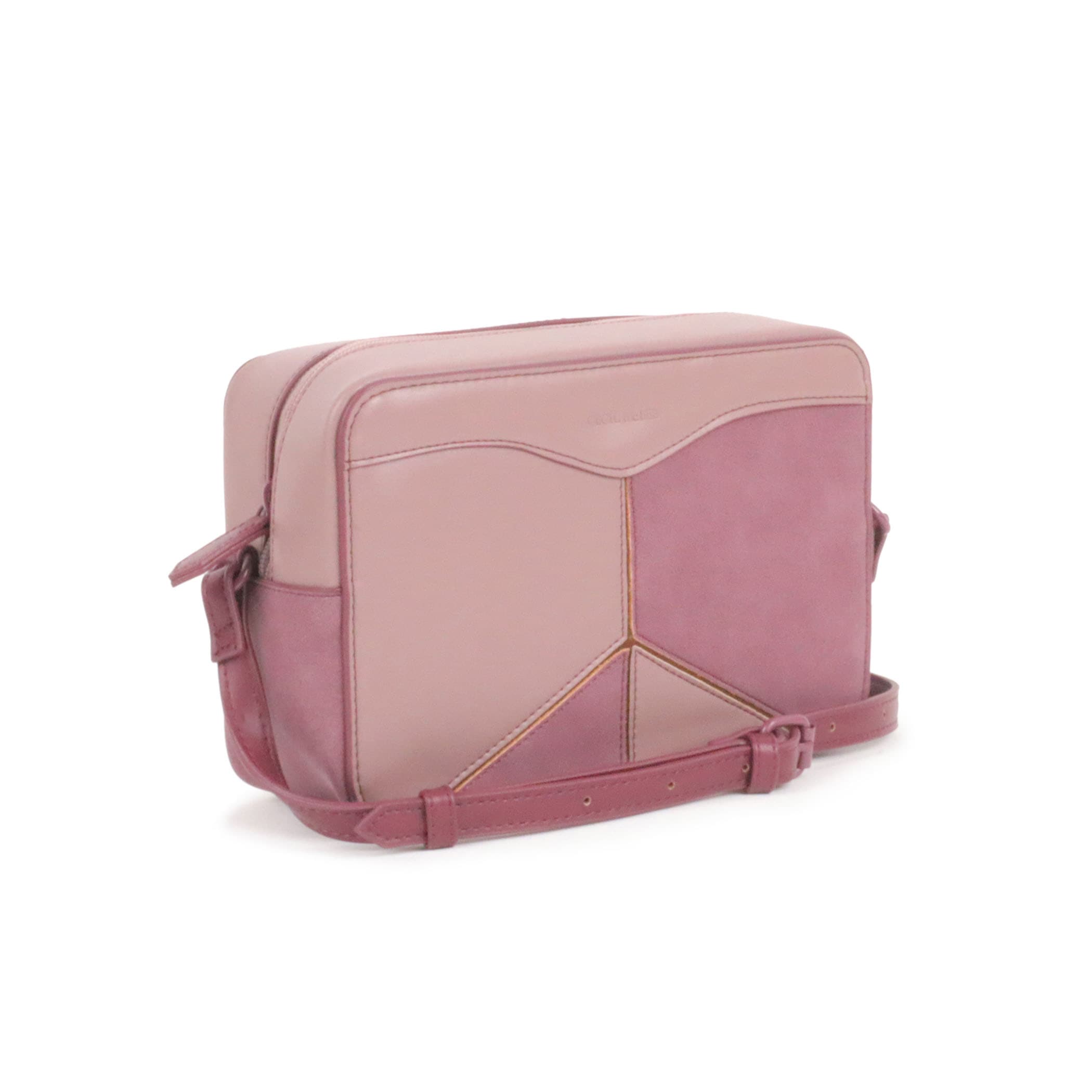くすみカラーの配色とヌバック調素材が秋らしいパッチワークのデザイン。金具をマットカラーにしレトロ感を表現しています。