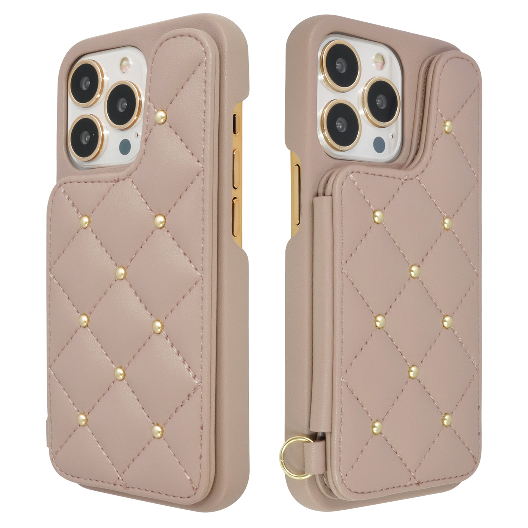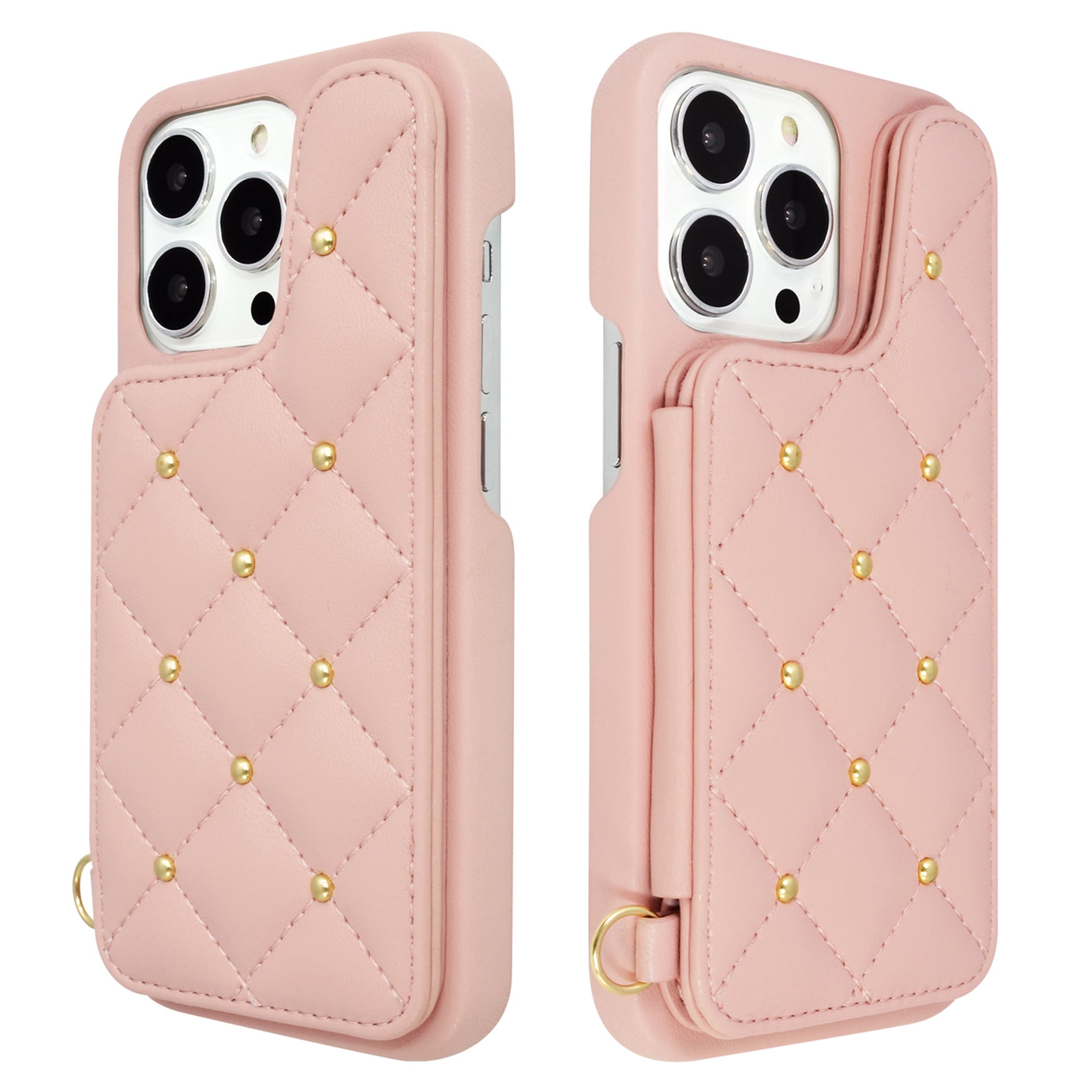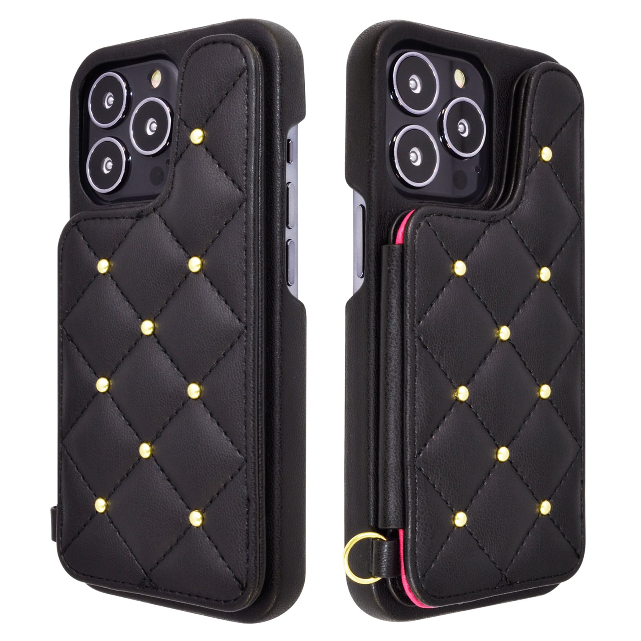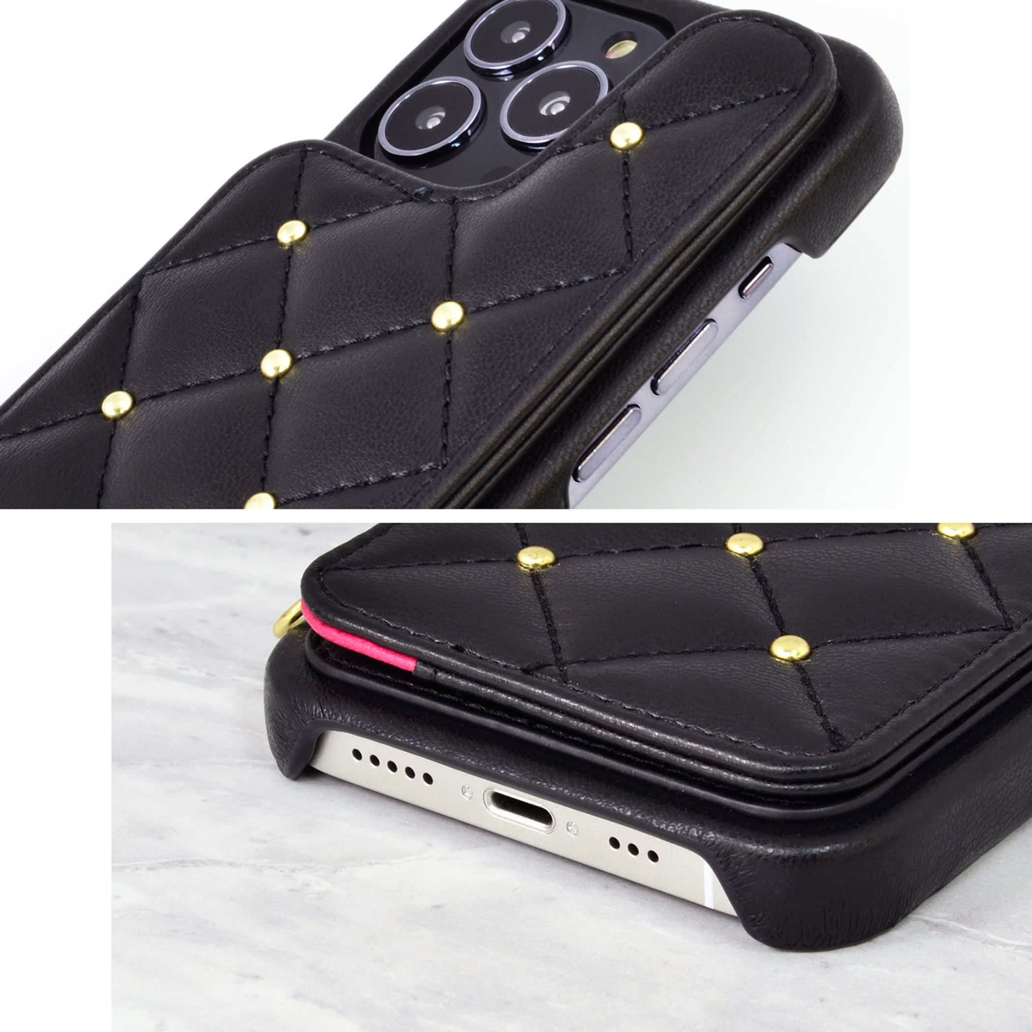 ふっくらして触り心地の良いキルティングレザー生地に、ゴールドのスタッズがアクセントとなって、高級感のある仕上がりになっています。【特徴】●肌触りが良く、ふっくらしたキルティングレザー●マグネット開閉で収納カードの落下を防止。収納ポケット×1ヶ所●出先で使える大きめのミラー付き●ストラップ用リング付き