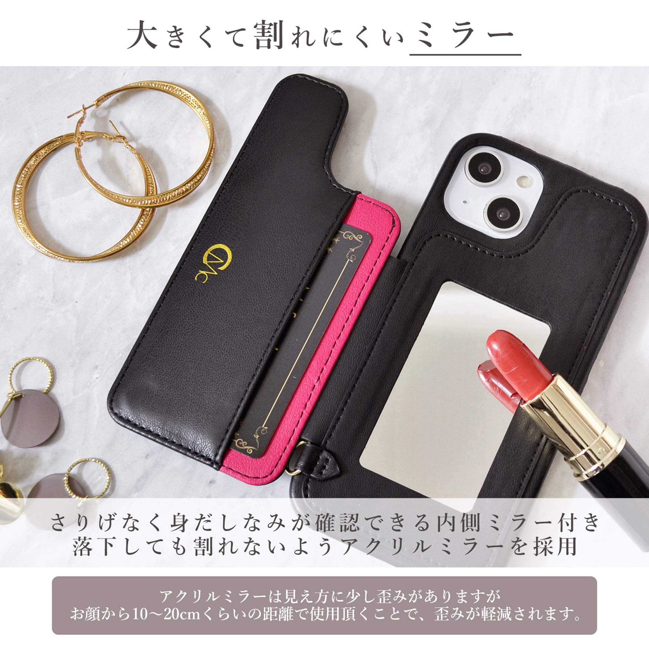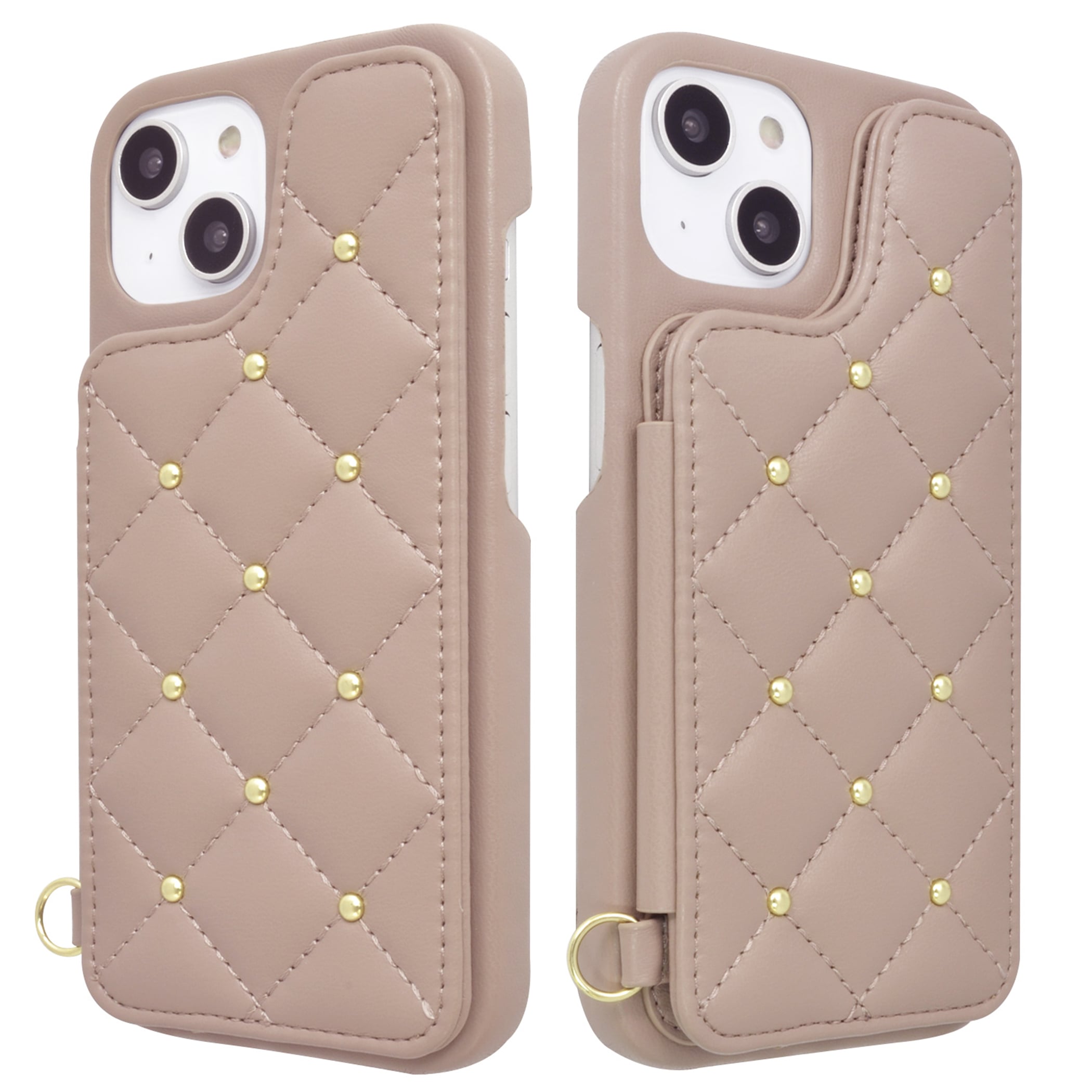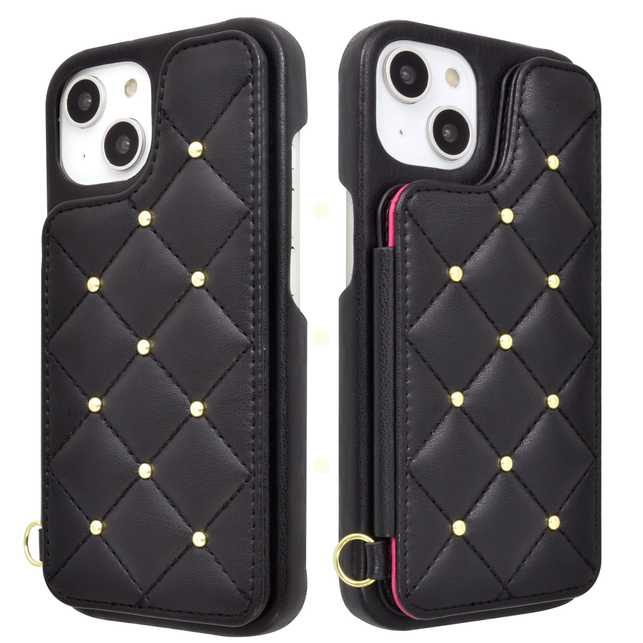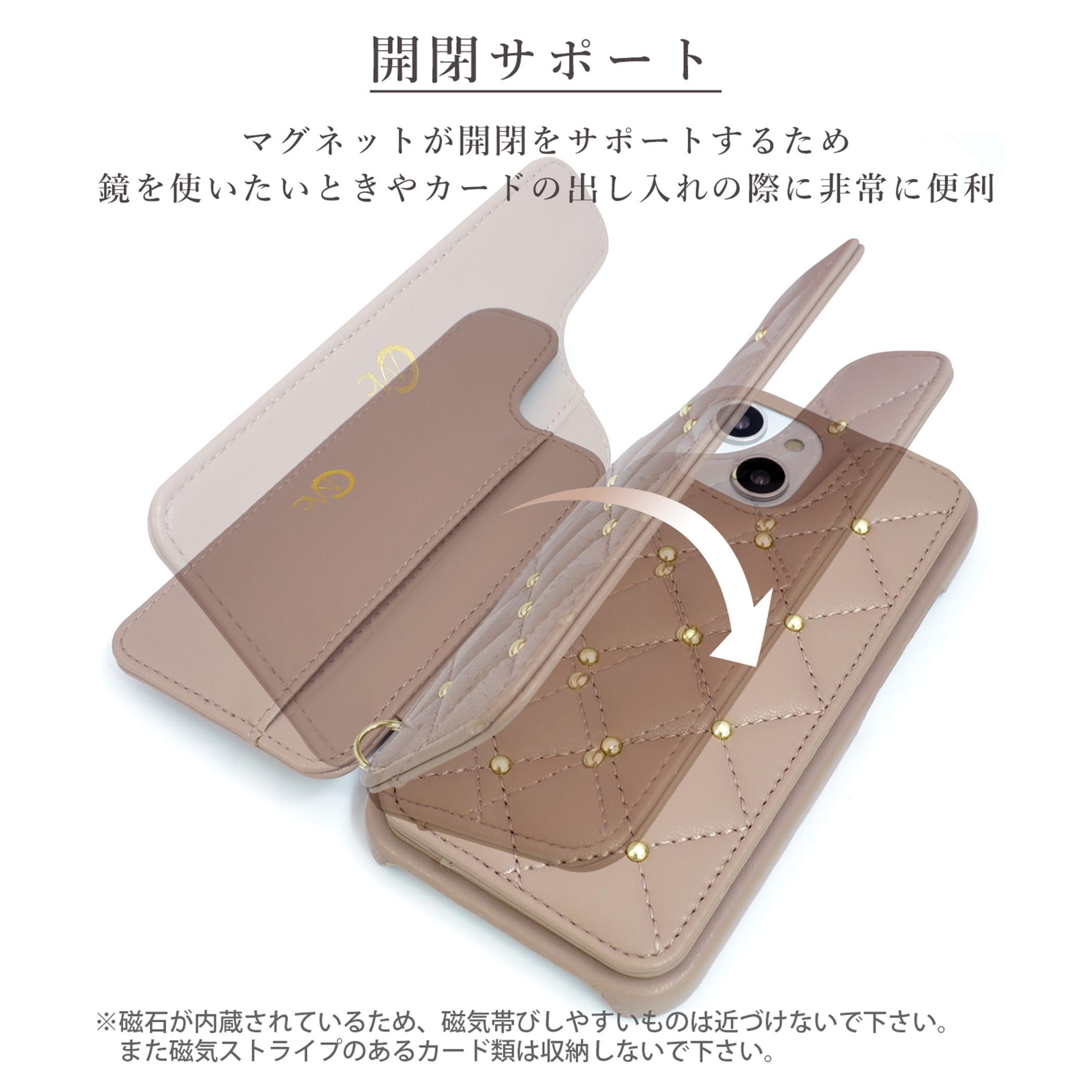 ふっくらして触り心地の良いキルティングレザー生地に、ゴールドのスタッズがアクセントとなって、高級感のある仕上がりになっています。【特徴】●肌触りが良く、ふっくらしたキルティングレザー●マグネット開閉で収納カードの落下を防止。収納ポケット×1ヶ所●出先で使える大きめのミラー付き●ストラップ用リング付き