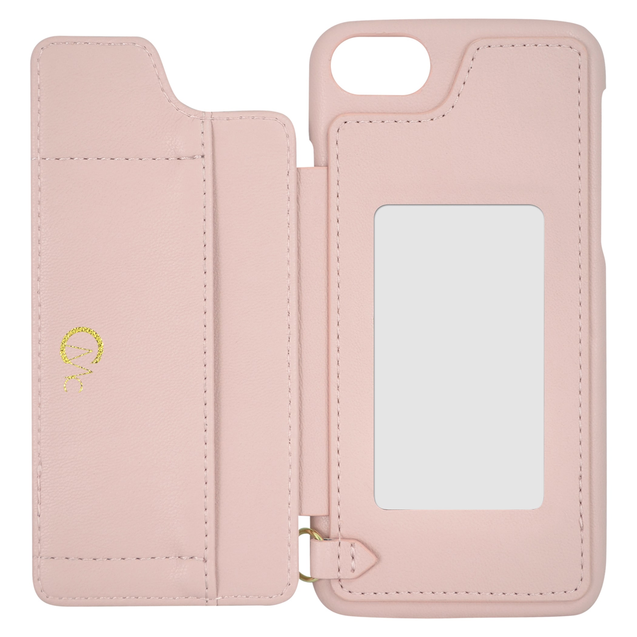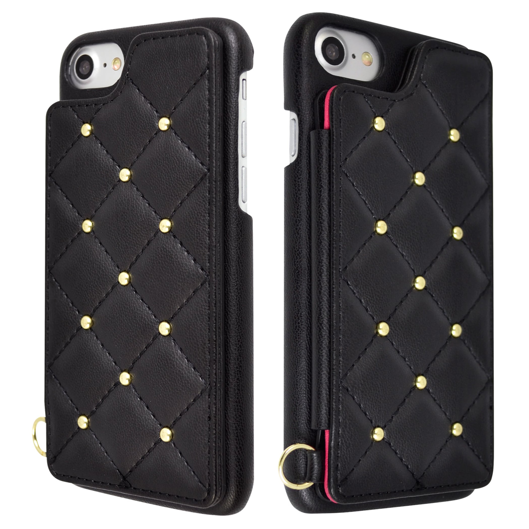 ふっくらして触り心地の良いキルティングレザー生地に、ゴールドのスタッズがアクセントとなって、高級感のある仕上がりになっています。【特徴】●肌触りが良く、ふっくらしたキルティングレザー●マグネット開閉で収納カードの落下を防止。収納ポケット×1ヶ所●出先で使える大きめのミラー付き●ストラップ用リング付き