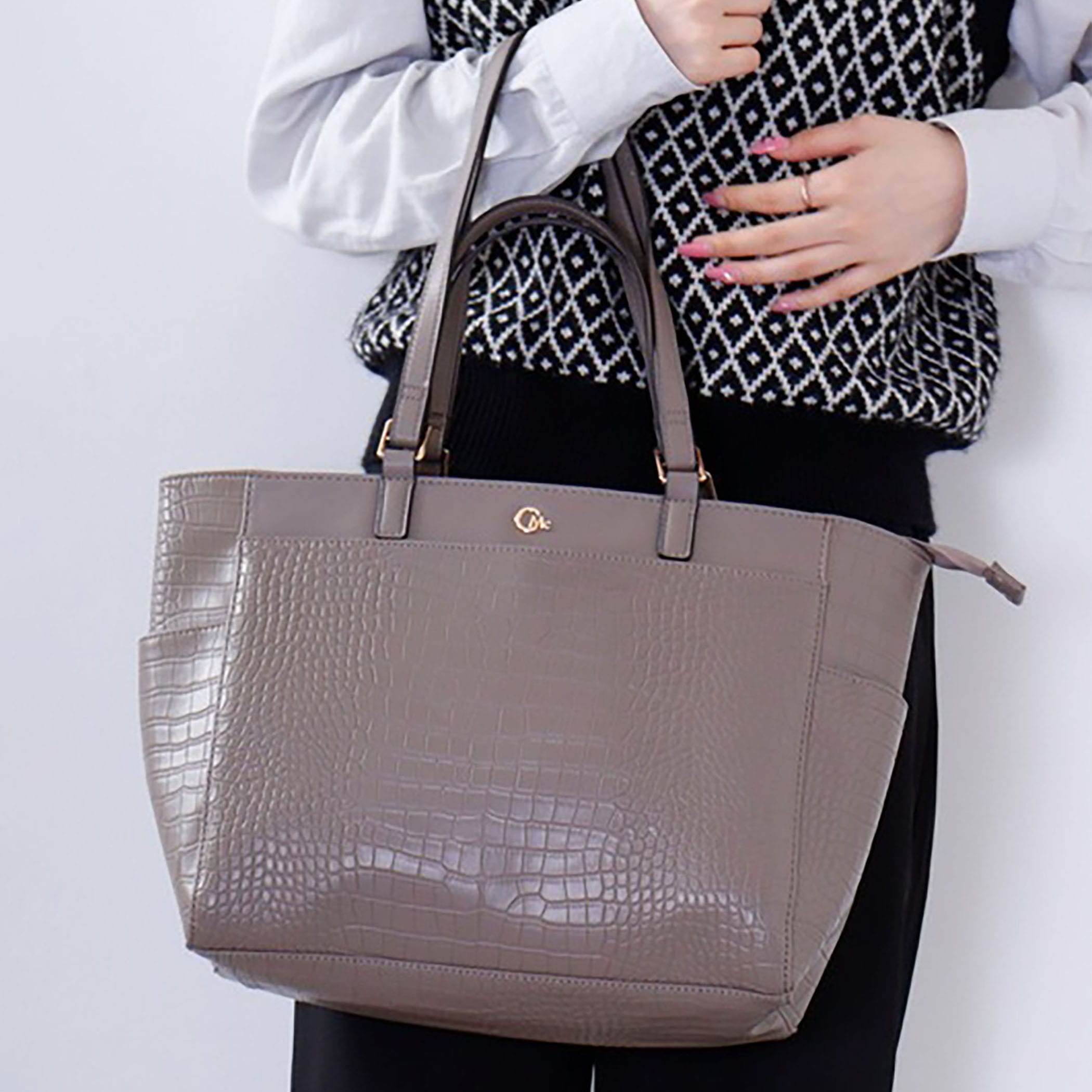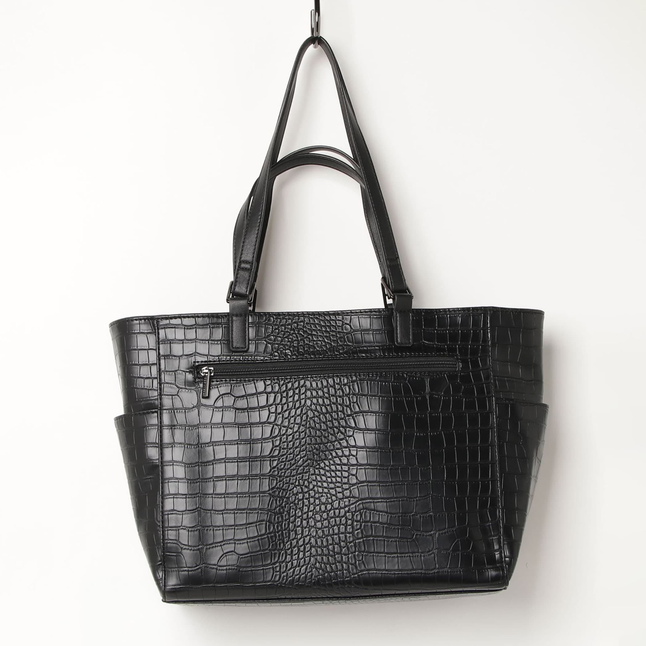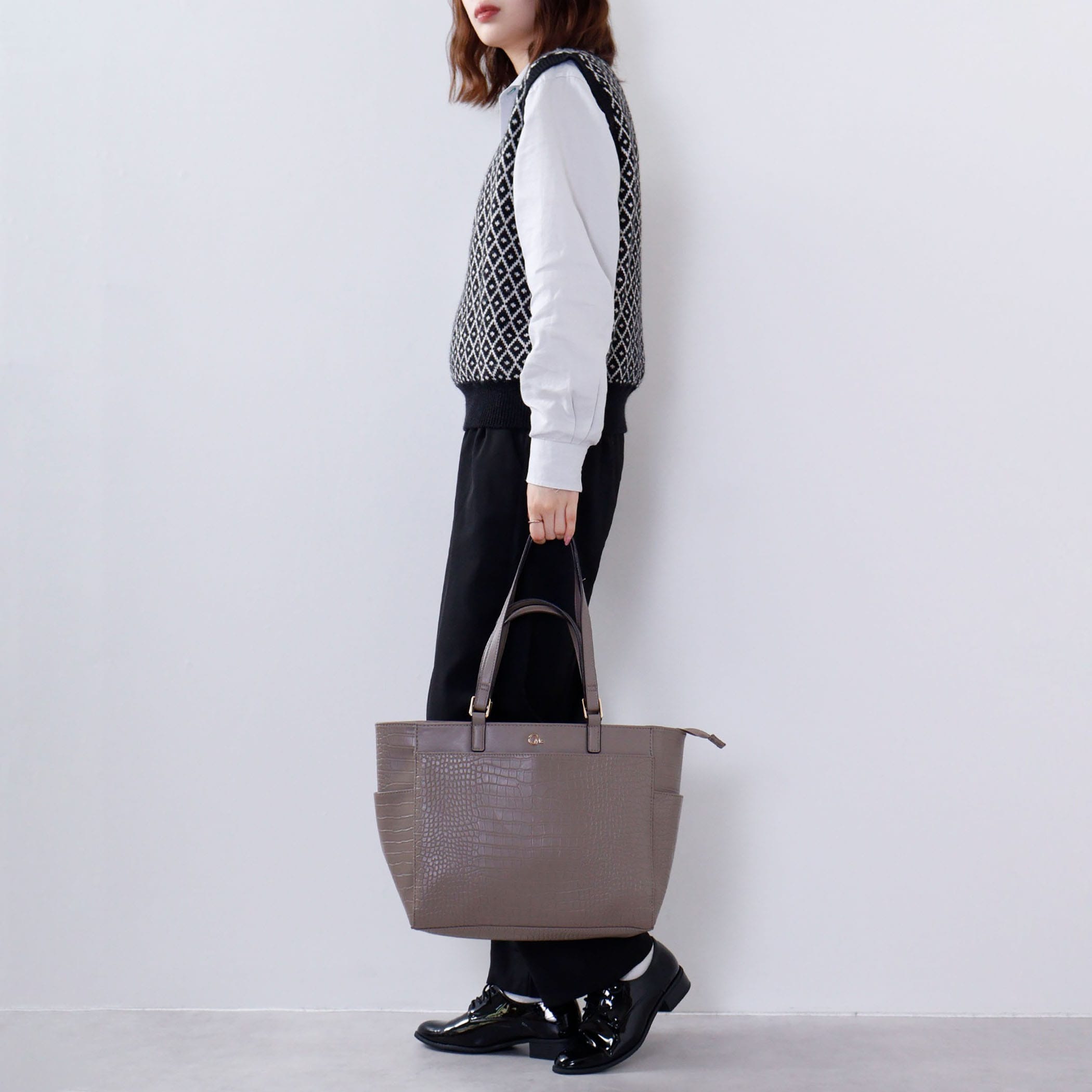 クロコの型押し生地がどんなスタイルにも合わせやすいバッグシリーズです。開口ファスナー。前胴側マグネット付きオープンポケット、背胴側ファスナーポケット。両サイドにオープンポケット各1。内装前胴側オープンポケット2。背胴側ファスナーポケット1。