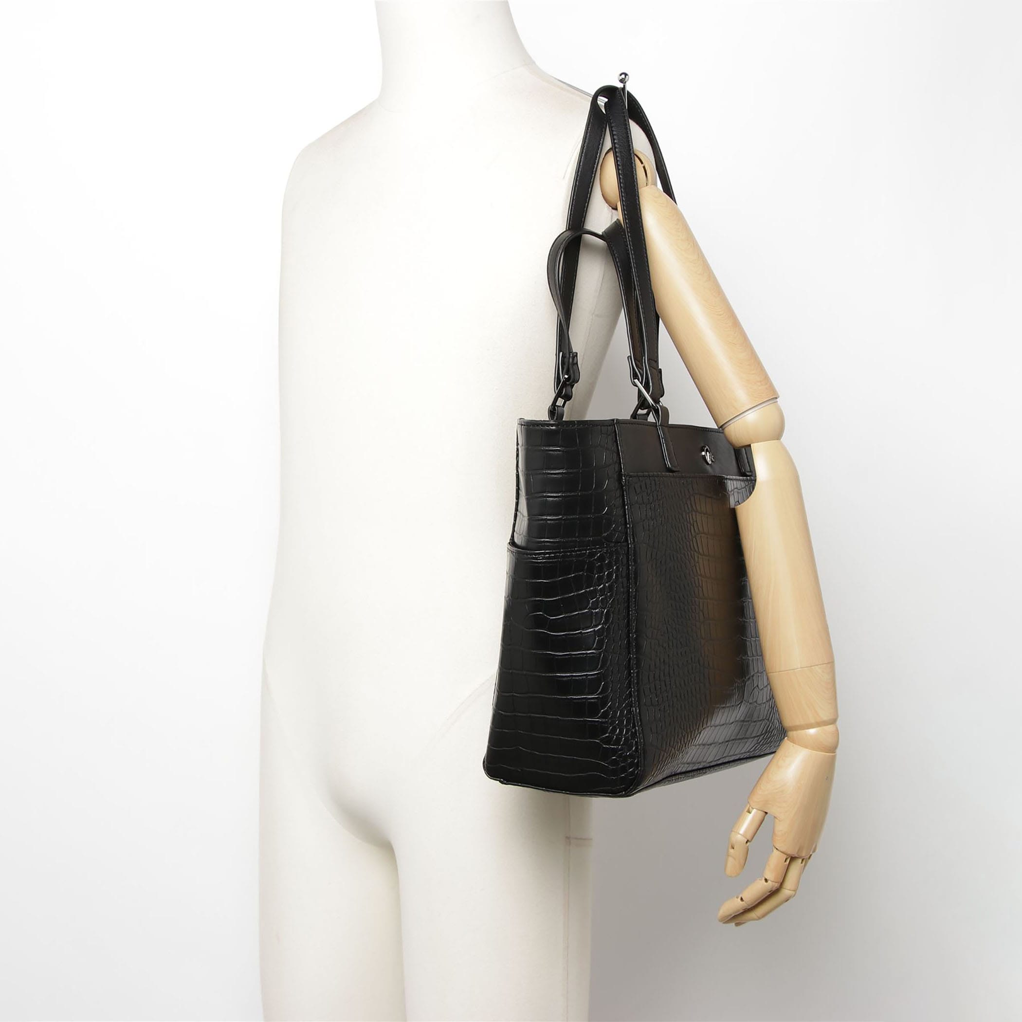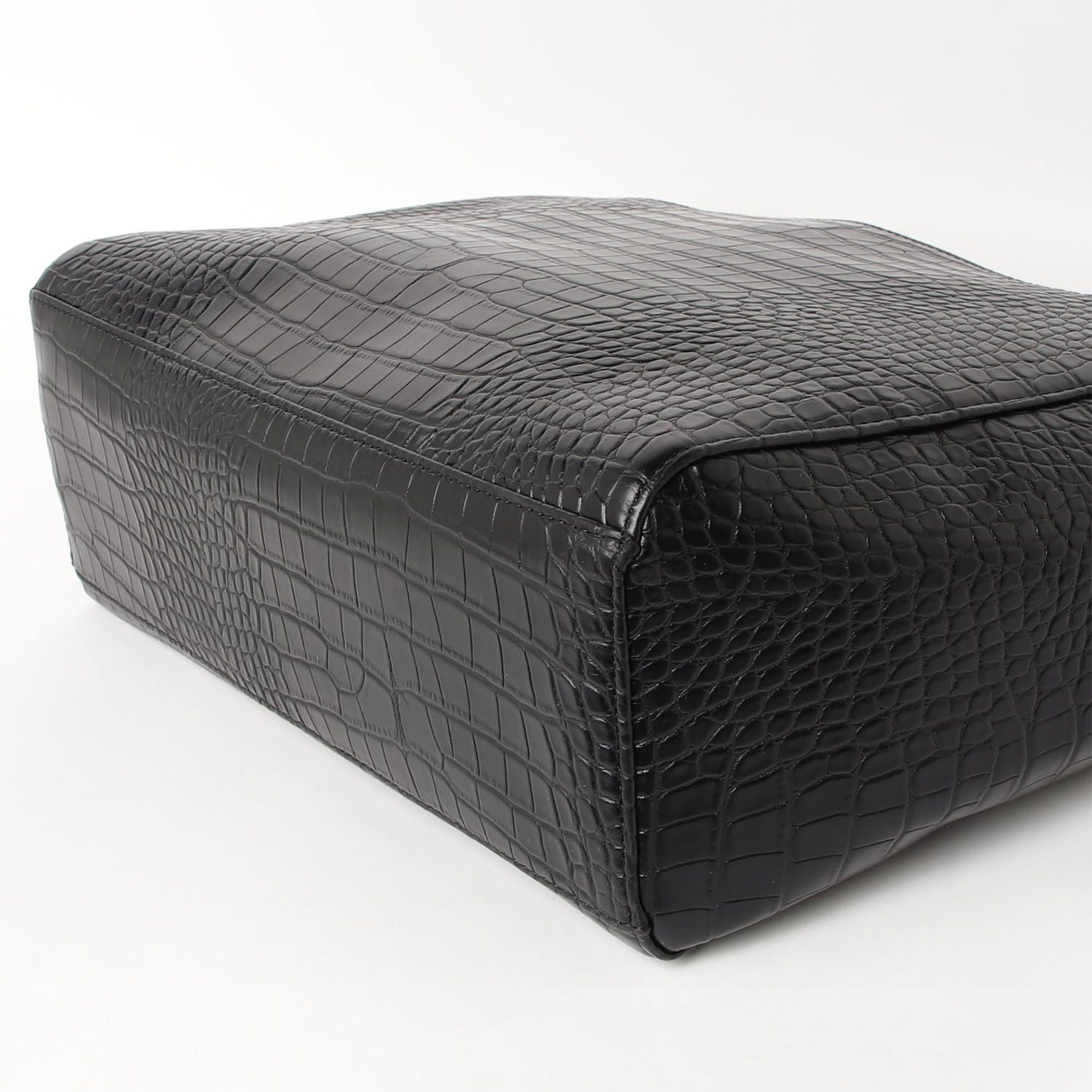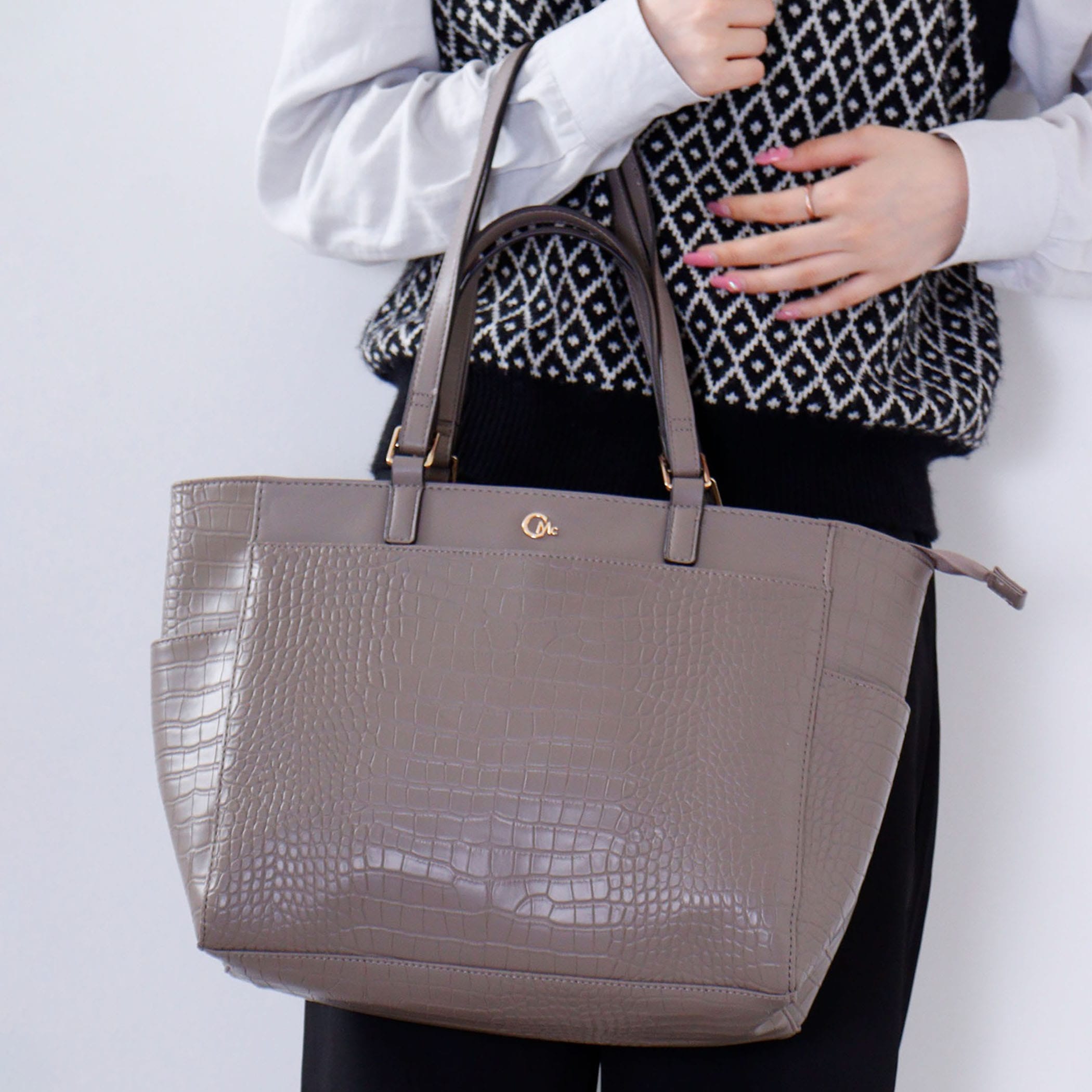 クロコの型押し生地がどんなスタイルにも合わせやすいバッグシリーズです。開口ファスナー。前胴側マグネット付きオープンポケット、背胴側ファスナーポケット。両サイドにオープンポケット各1。内装前胴側オープンポケット2。背胴側ファスナーポケット1。