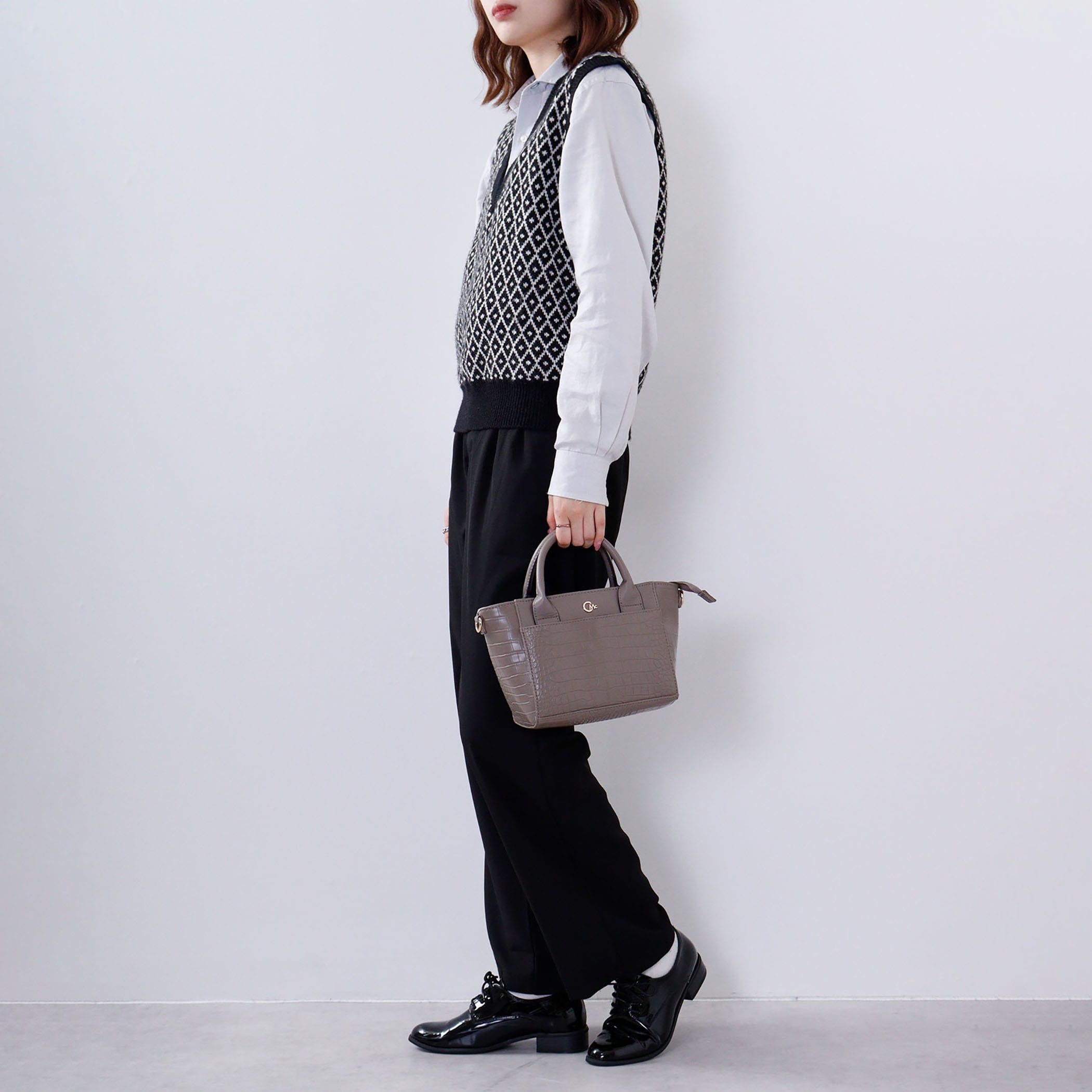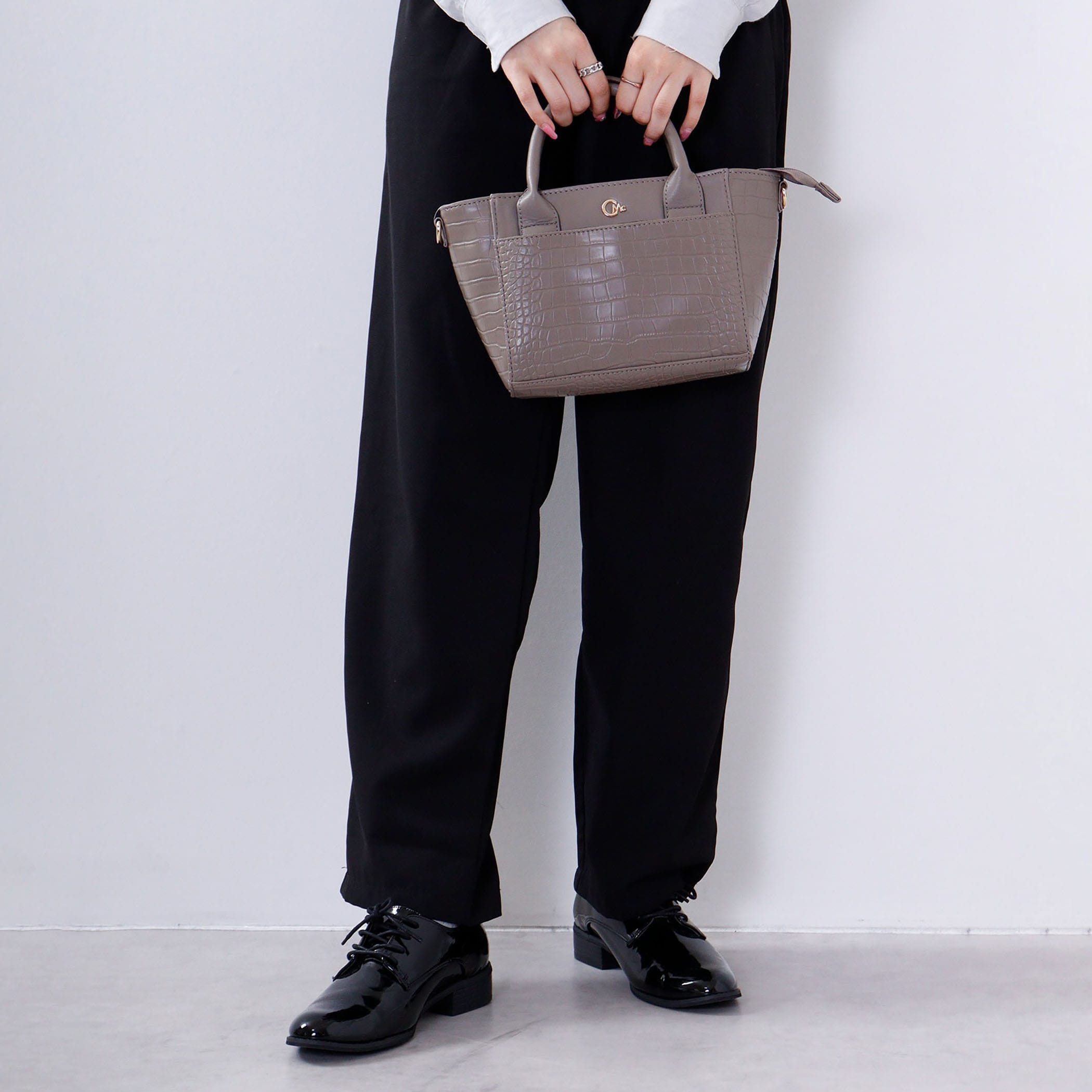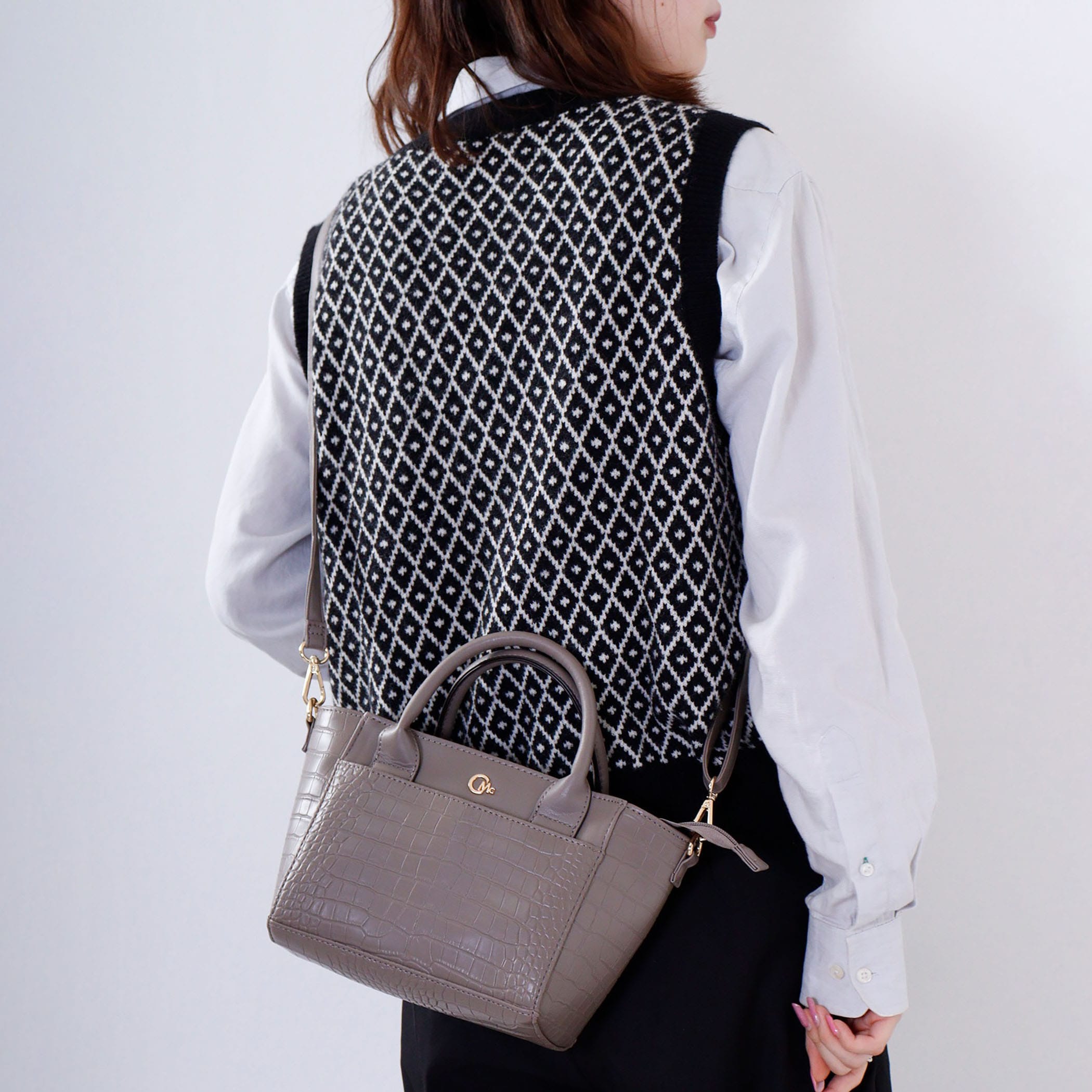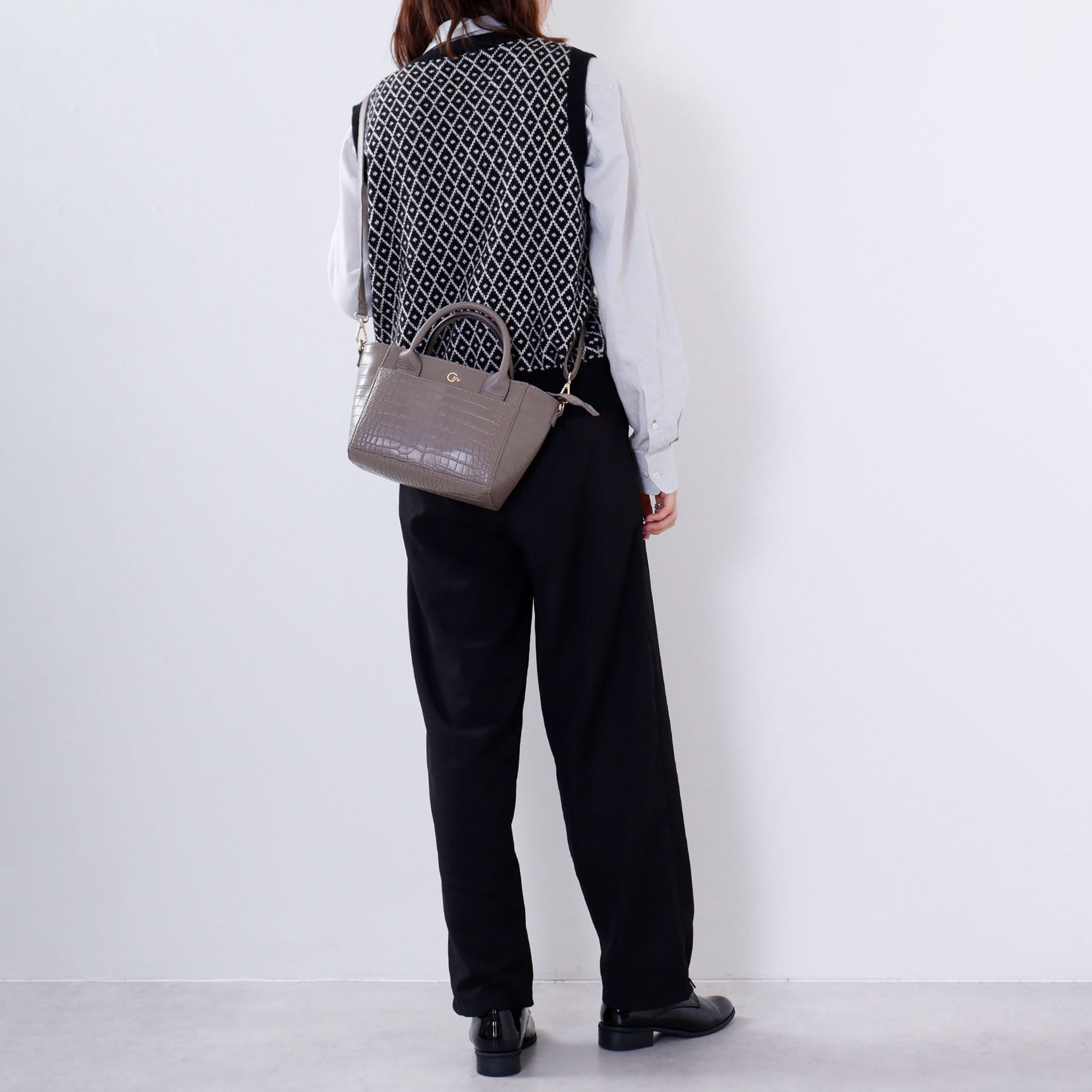 クロコの型押し生地がどんなスタイルにも合わせやすいバッグシリーズです。開口ファスナー。前胴側、背胴側にマグネット付きオープンポケット各1。内装前胴側オープンポケット1。背胴側ファスナーポケット1。