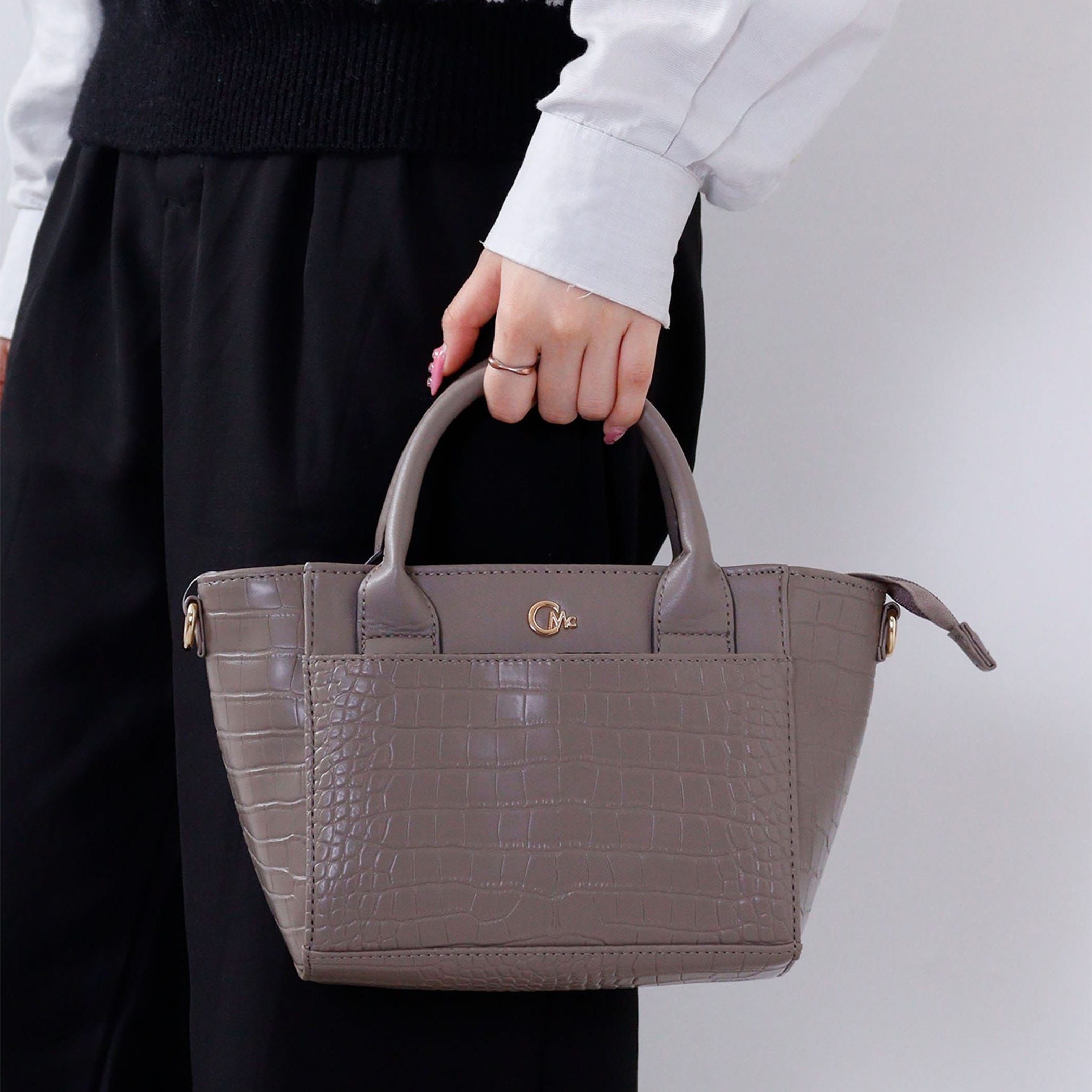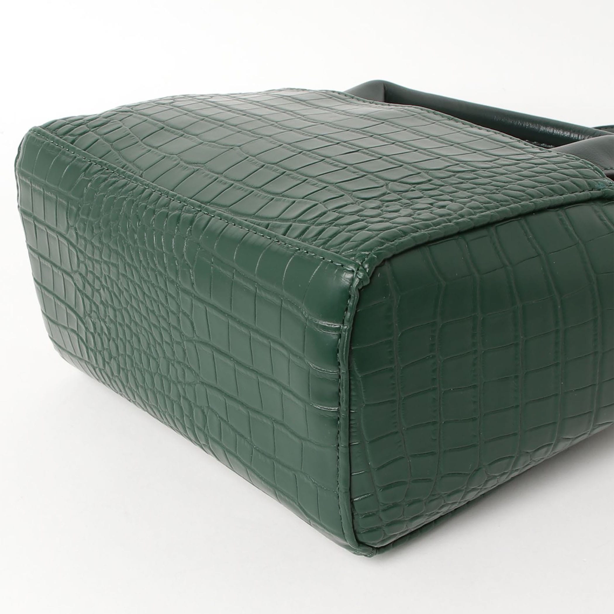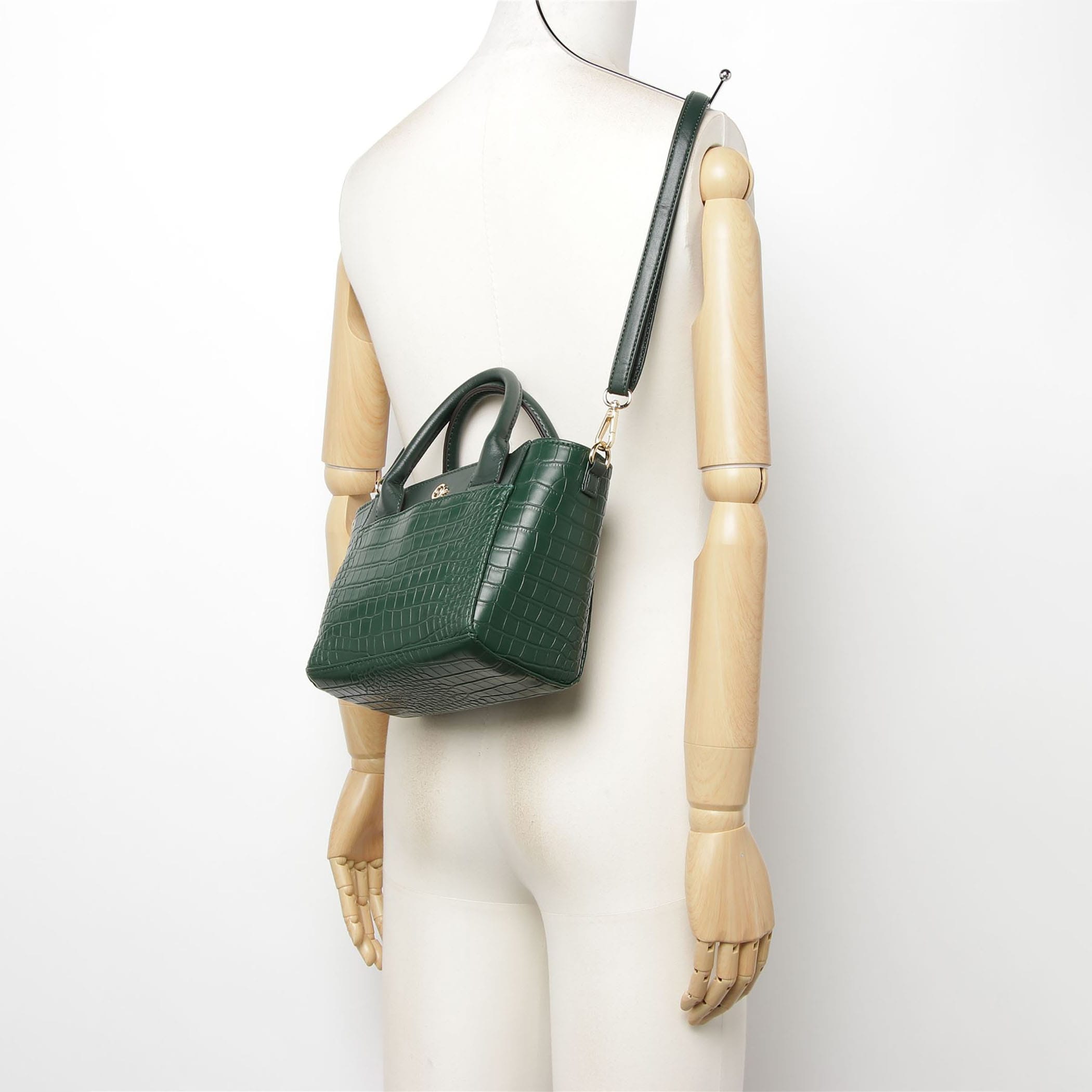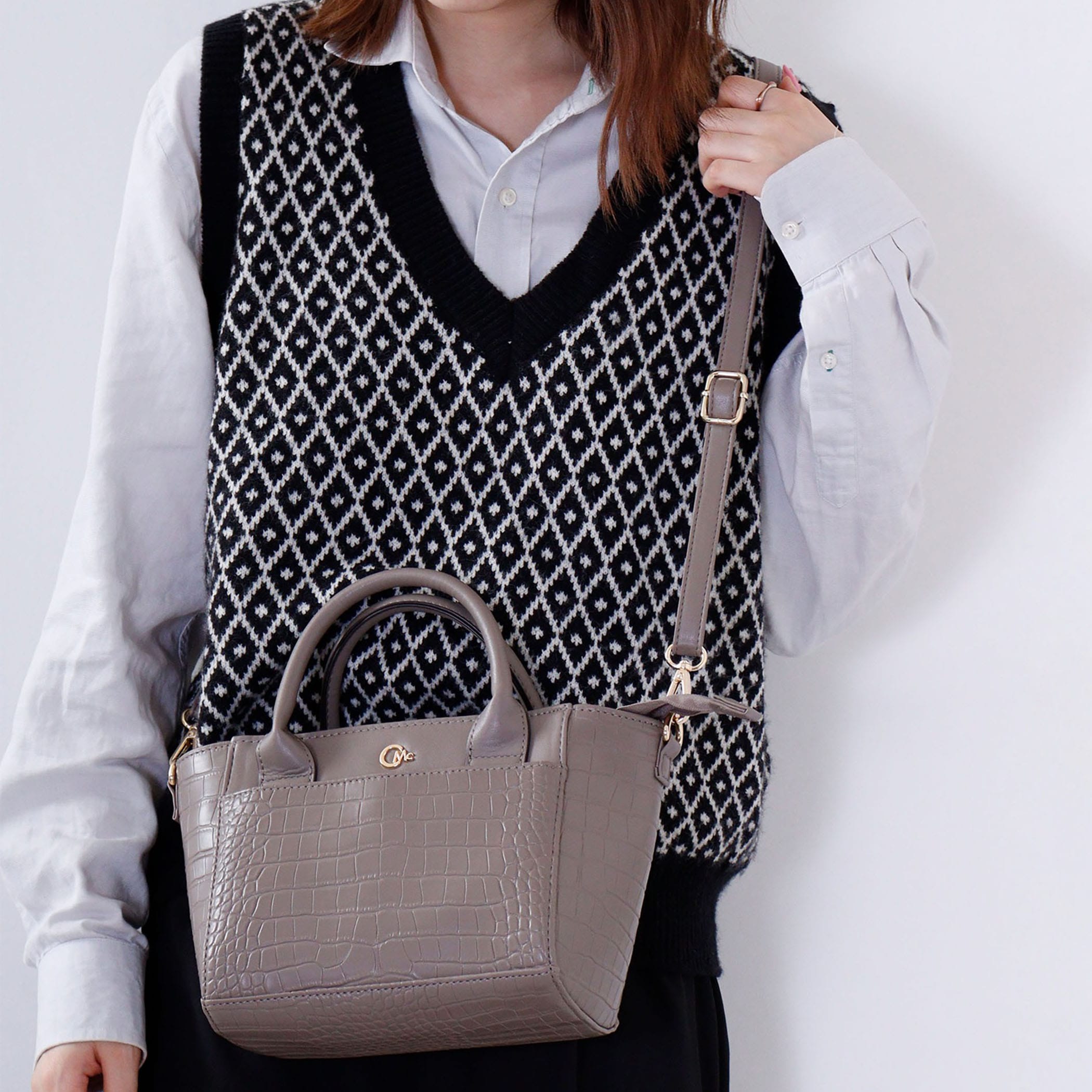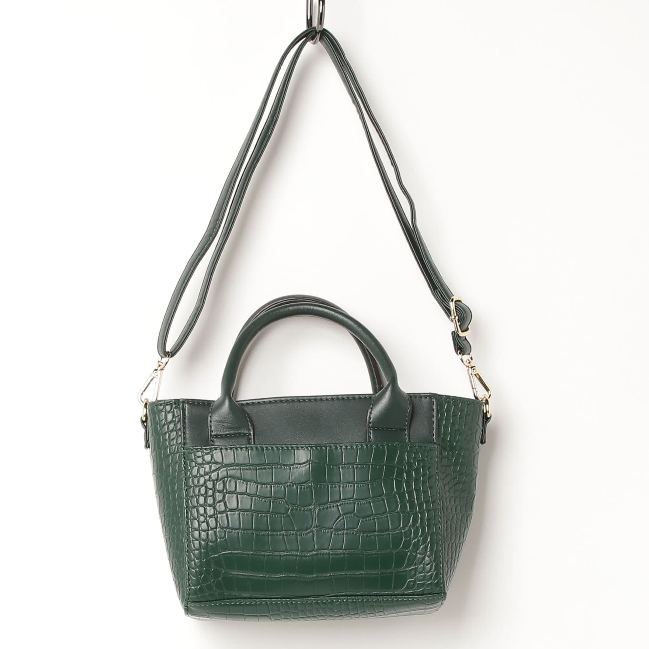 クロコの型押し生地がどんなスタイルにも合わせやすいバッグシリーズです。開口ファスナー。前胴側、背胴側にマグネット付きオープンポケット各1。内装前胴側オープンポケット1。背胴側ファスナーポケット1。