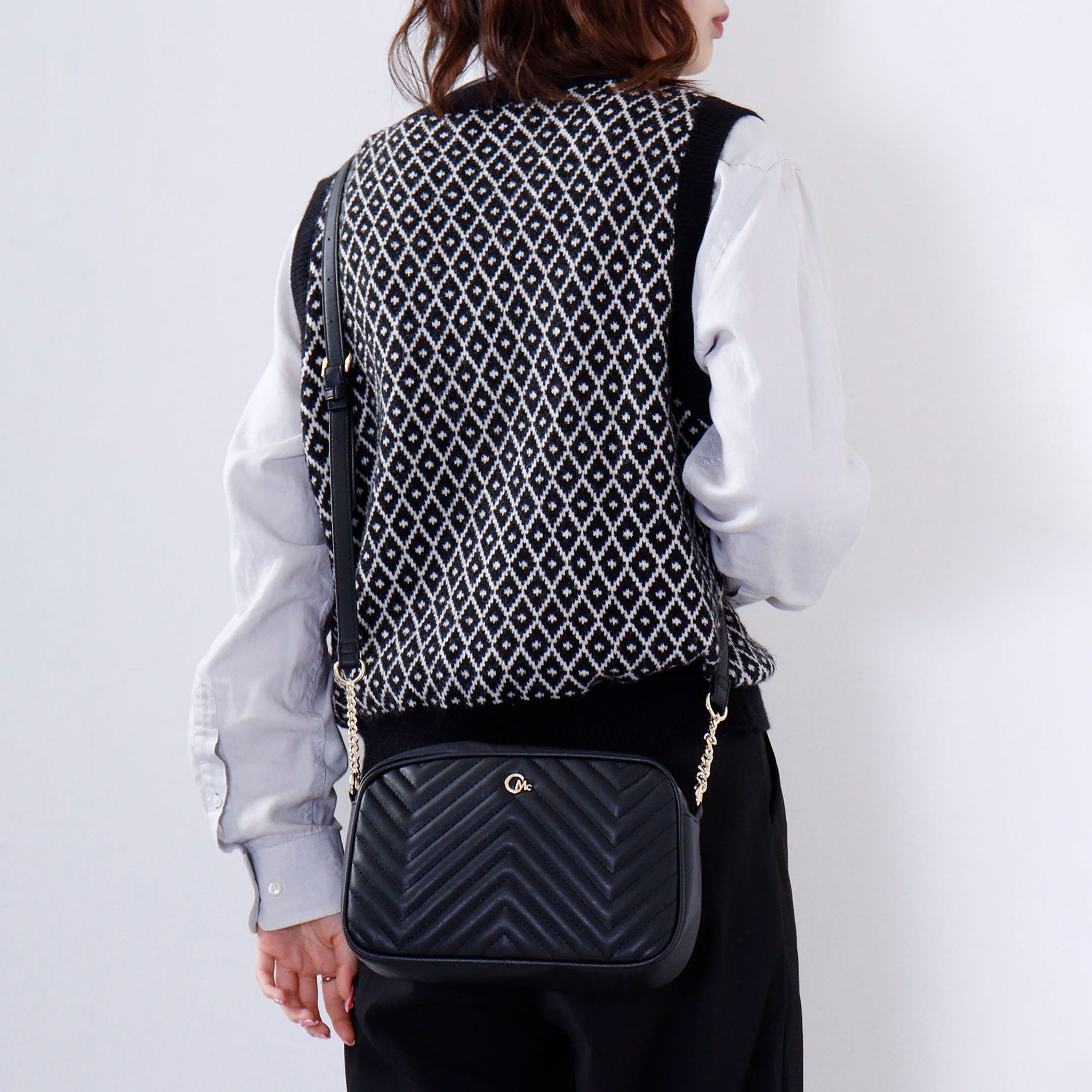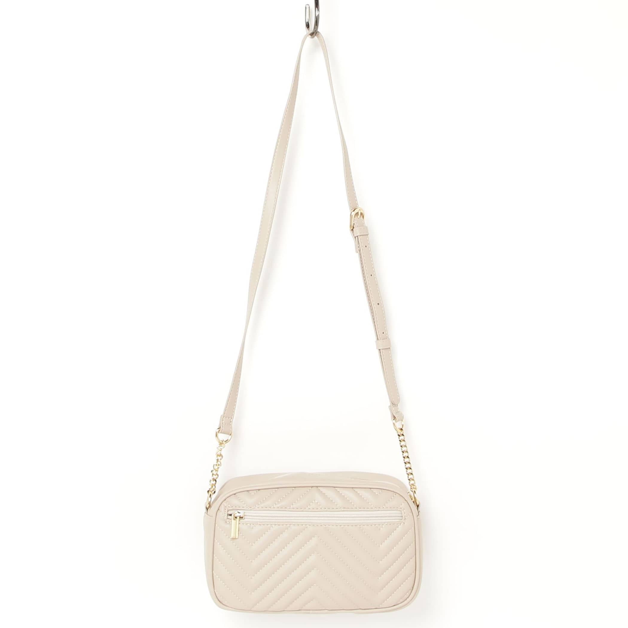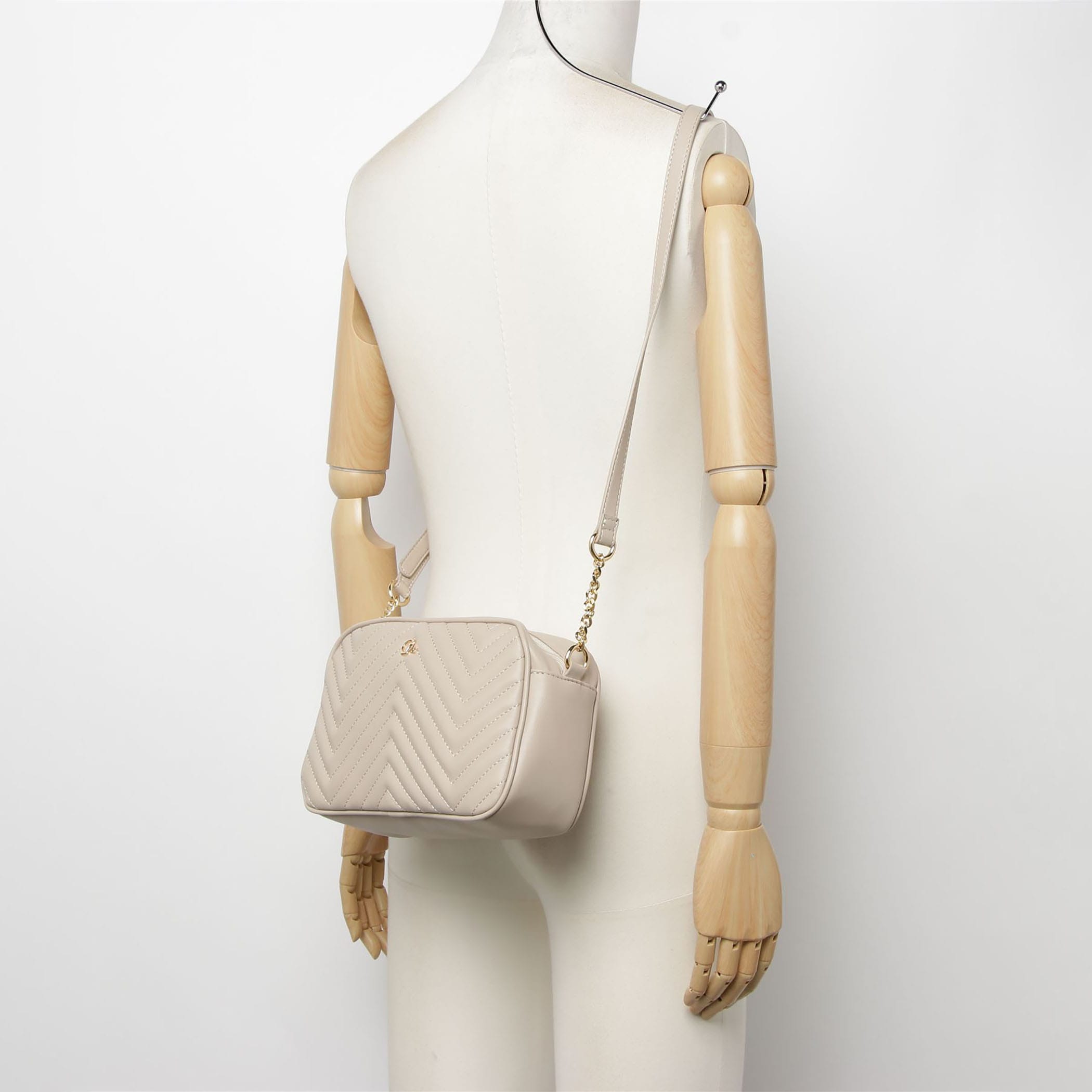 CECIL McBEEの定番アイコン、キルティング加工を施したバッグシリーズ。開口ファスナー。背胴側ファスナーポケット1。内装前胴側オープンポケット1。背胴側ファスナーポケット1。