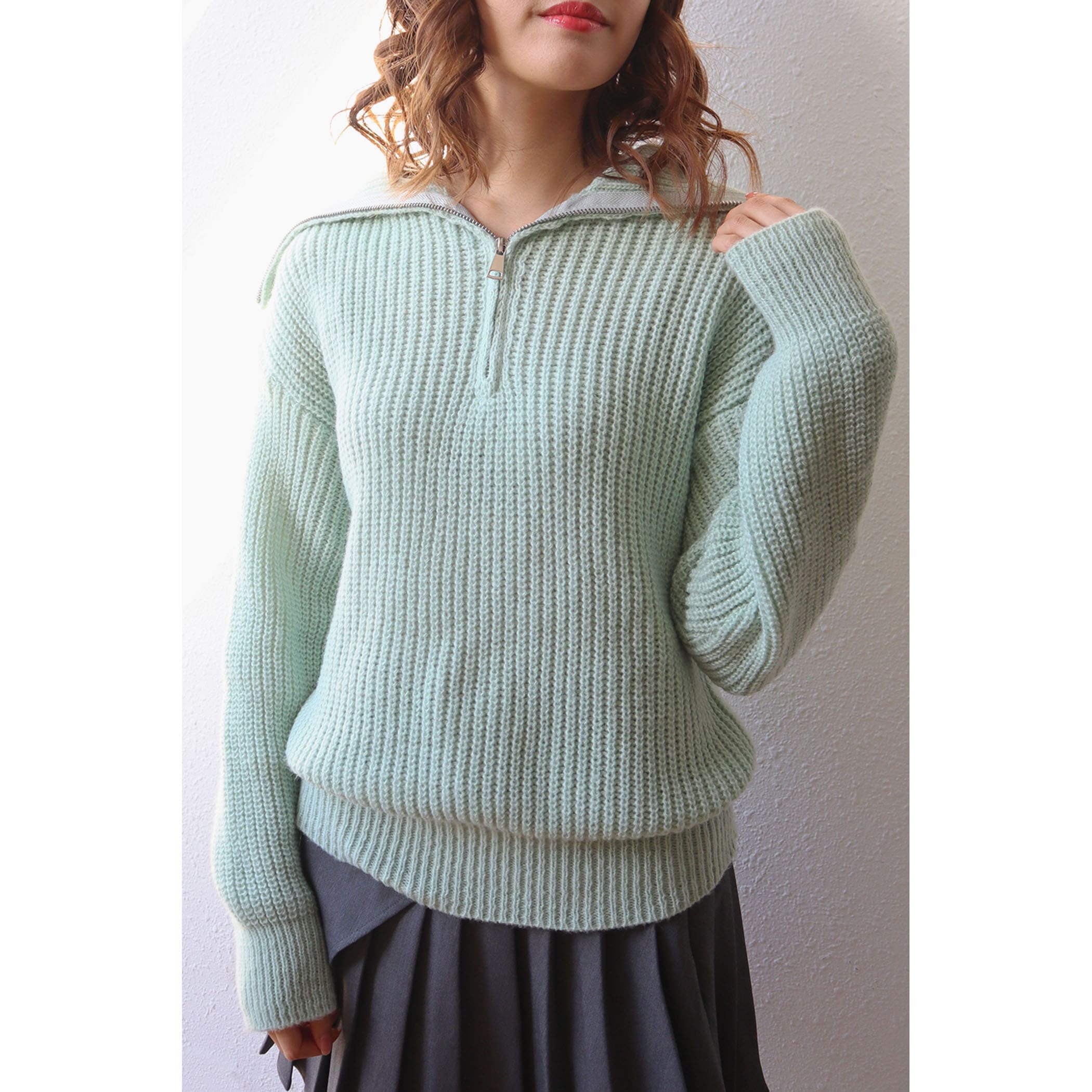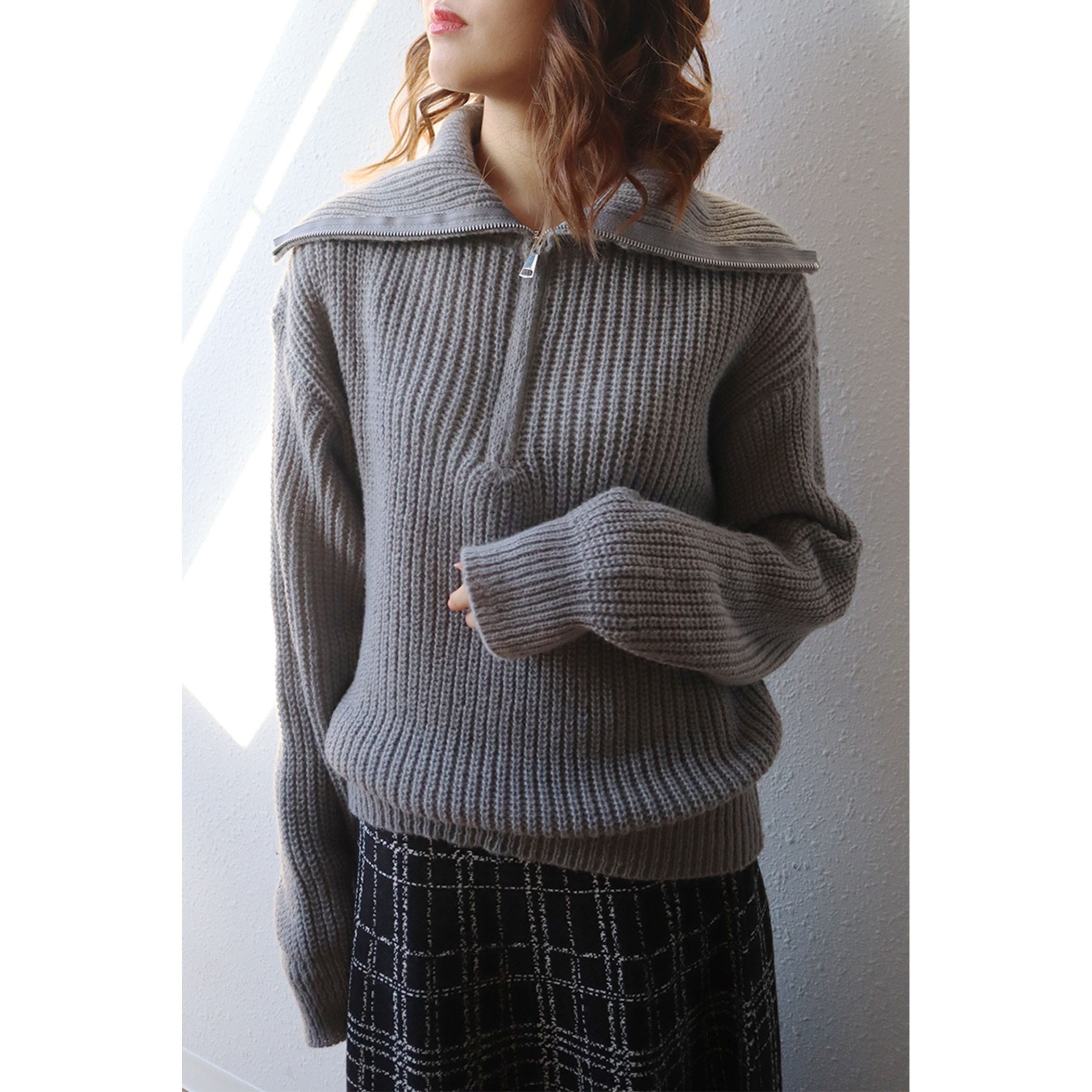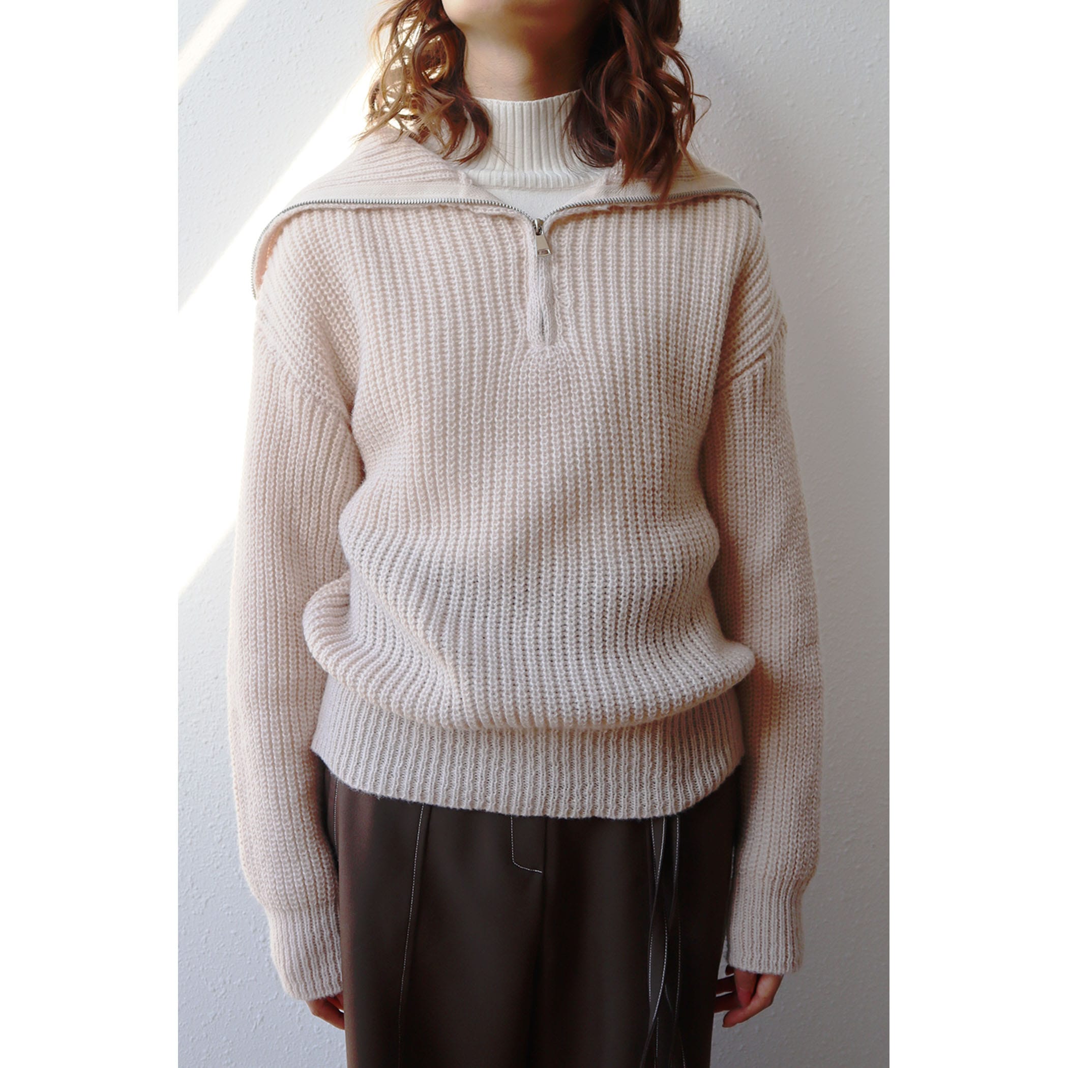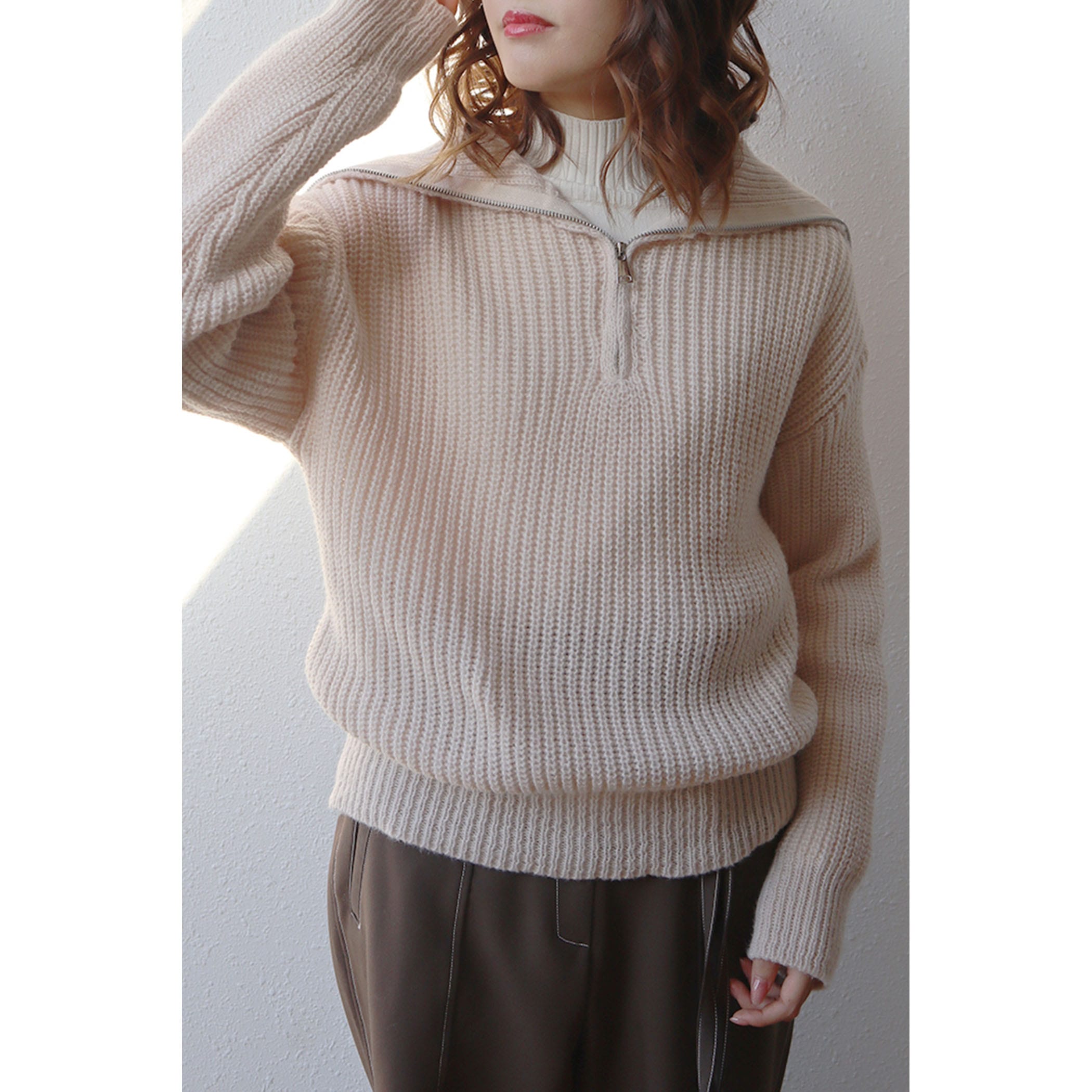 ハーフジップアップがトレンドライクなニットプルオーバー。大きめに作られた衿と膨らみのある柔らかい糸で、カジュアルすぎないフェミニンな印象に。パンツはもちろんのこと、ミニボトムスやロングスカートとのスタイリングもおすすめです◎