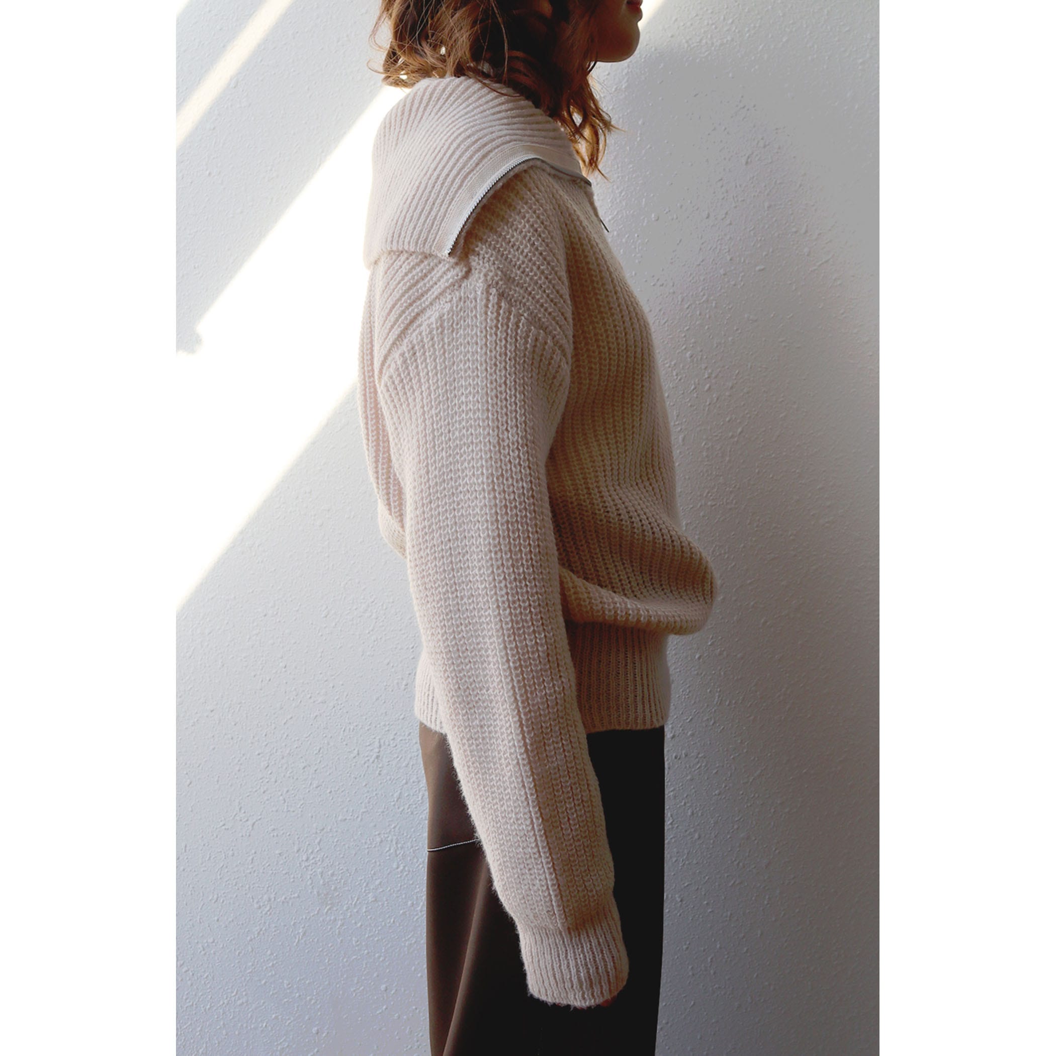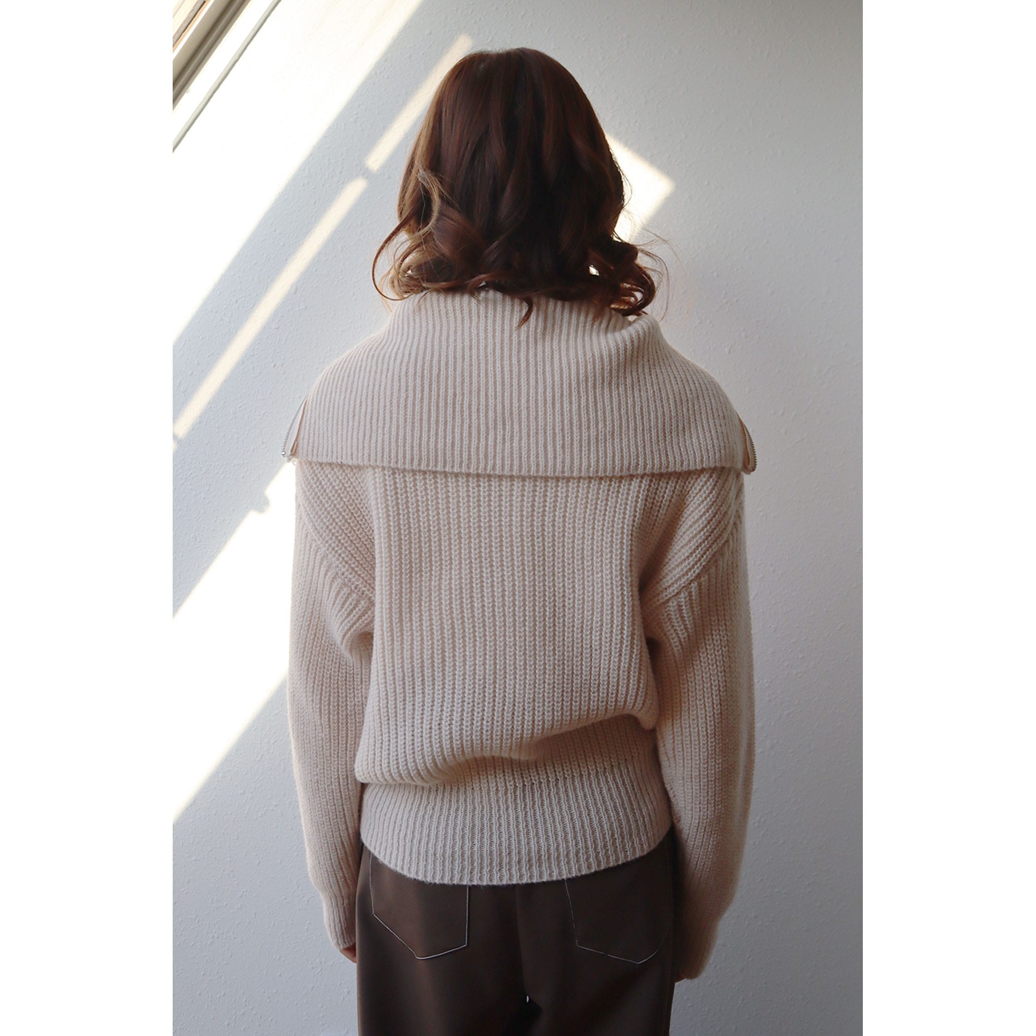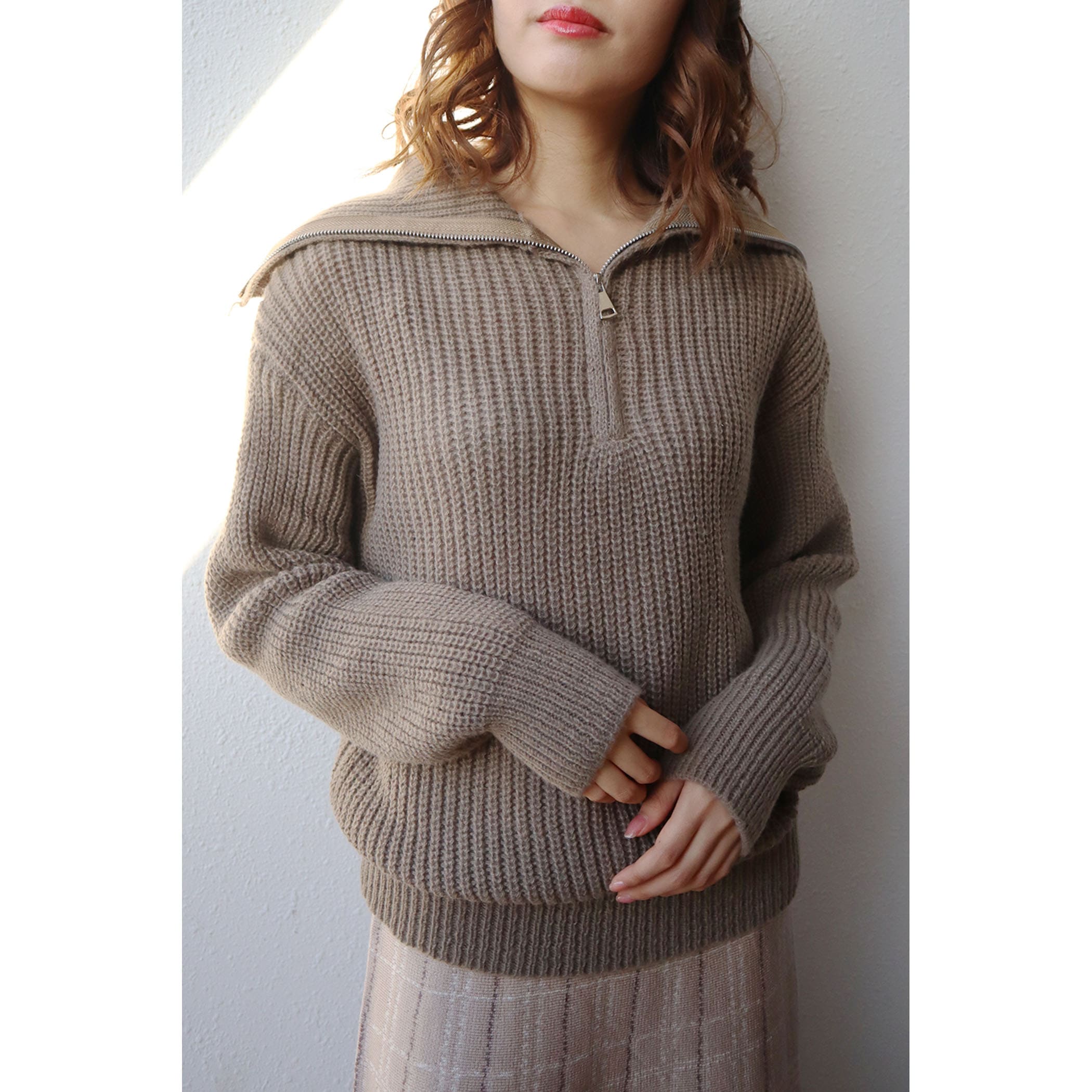 ハーフジップアップがトレンドライクなニットプルオーバー。大きめに作られた衿と膨らみのある柔らかい糸で、カジュアルすぎないフェミニンな印象に。パンツはもちろんのこと、ミニボトムスやロングスカートとのスタイリングもおすすめです◎