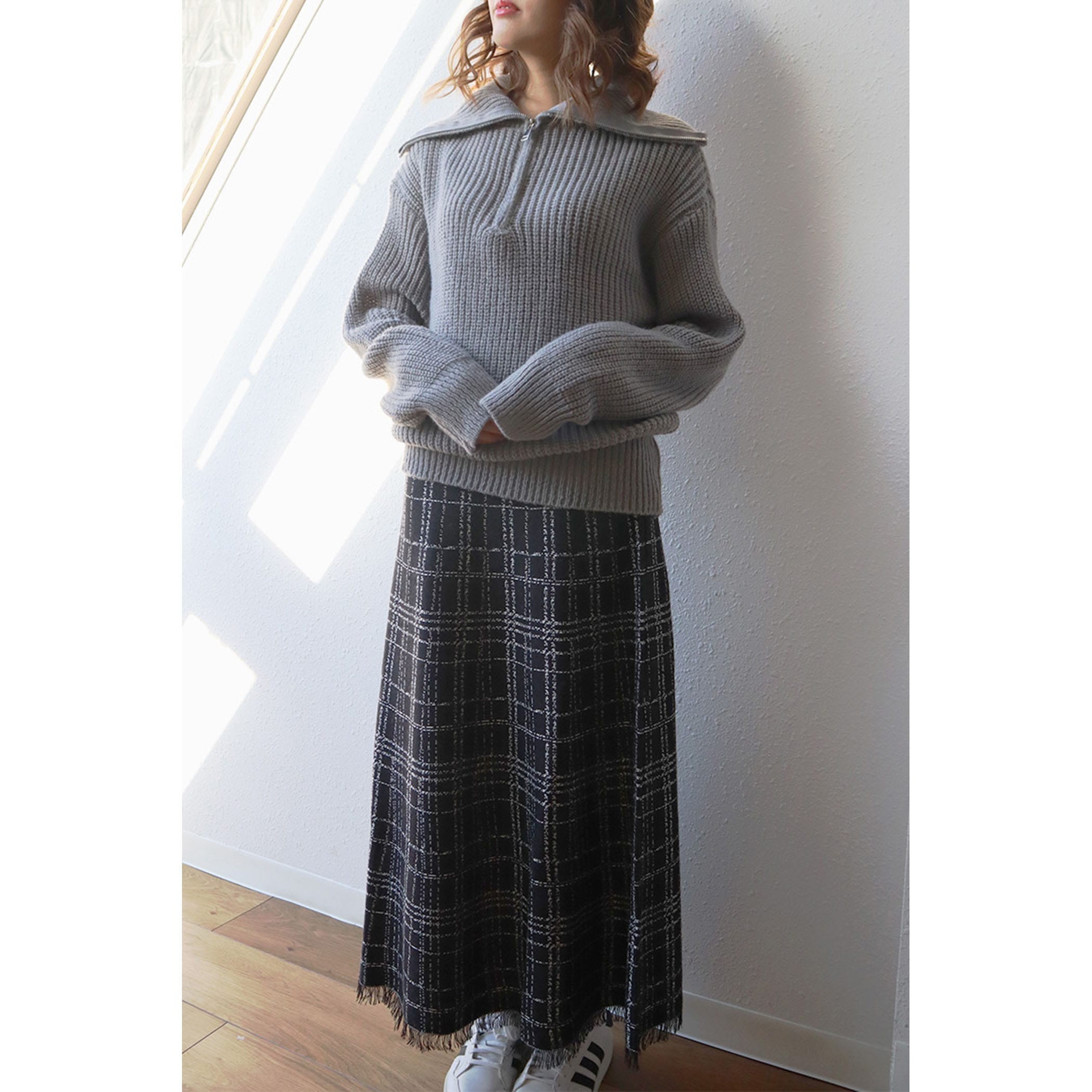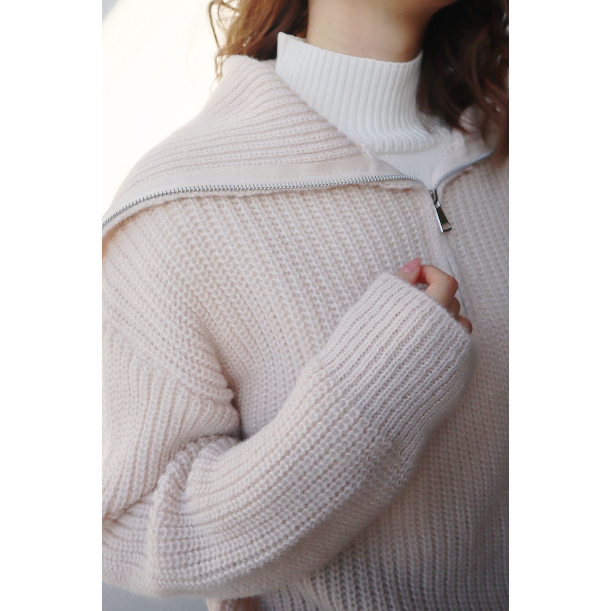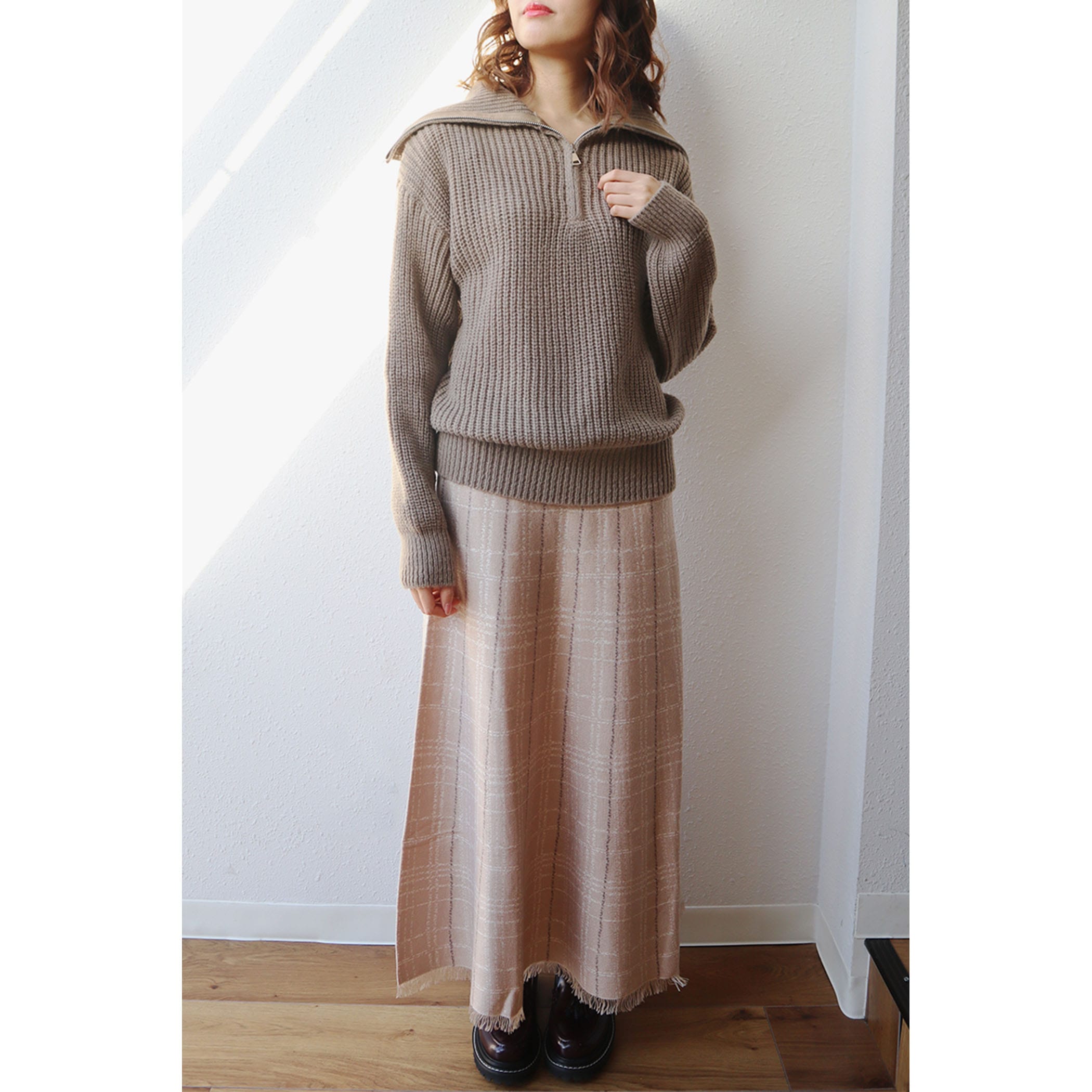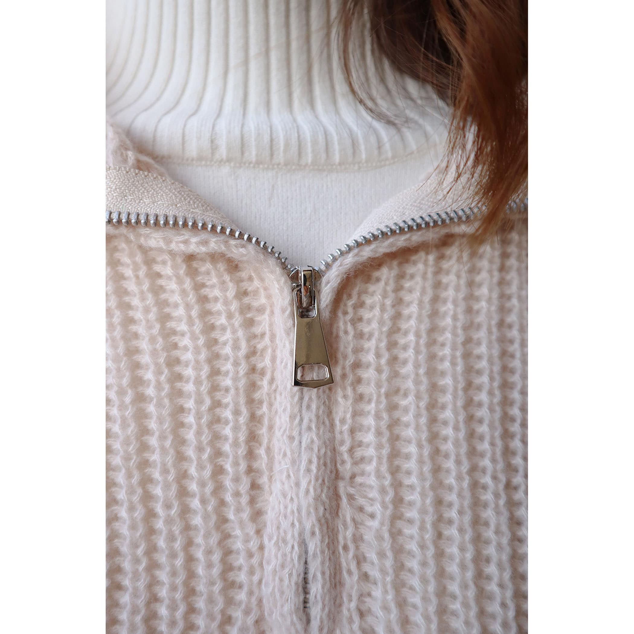ハーフジップアップがトレンドライクなニットプルオーバー。大きめに作られた衿と膨らみのある柔らかい糸で、カジュアルすぎないフェミニンな印象に。パンツはもちろんのこと、ミニボトムスやロングスカートとのスタイリングもおすすめです◎