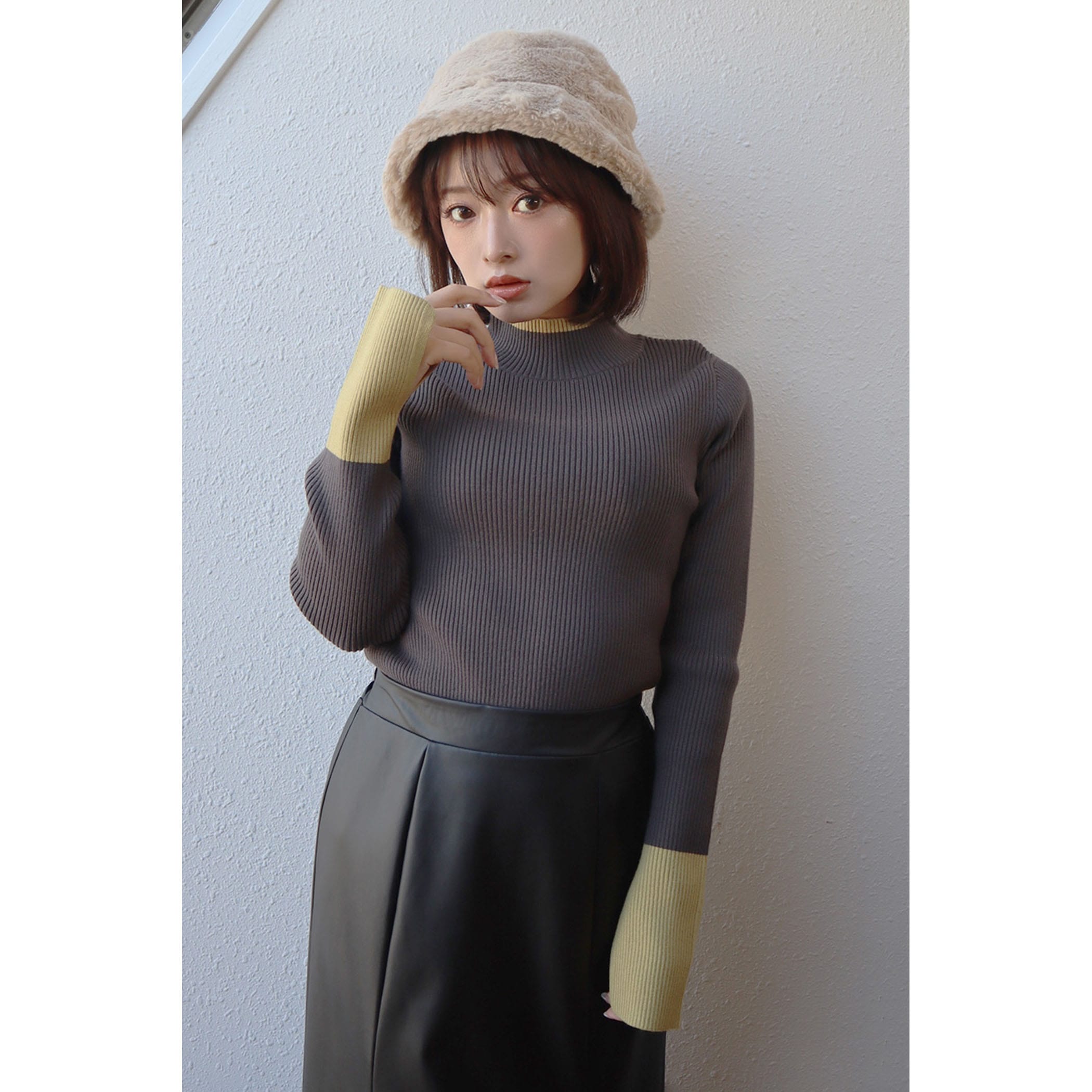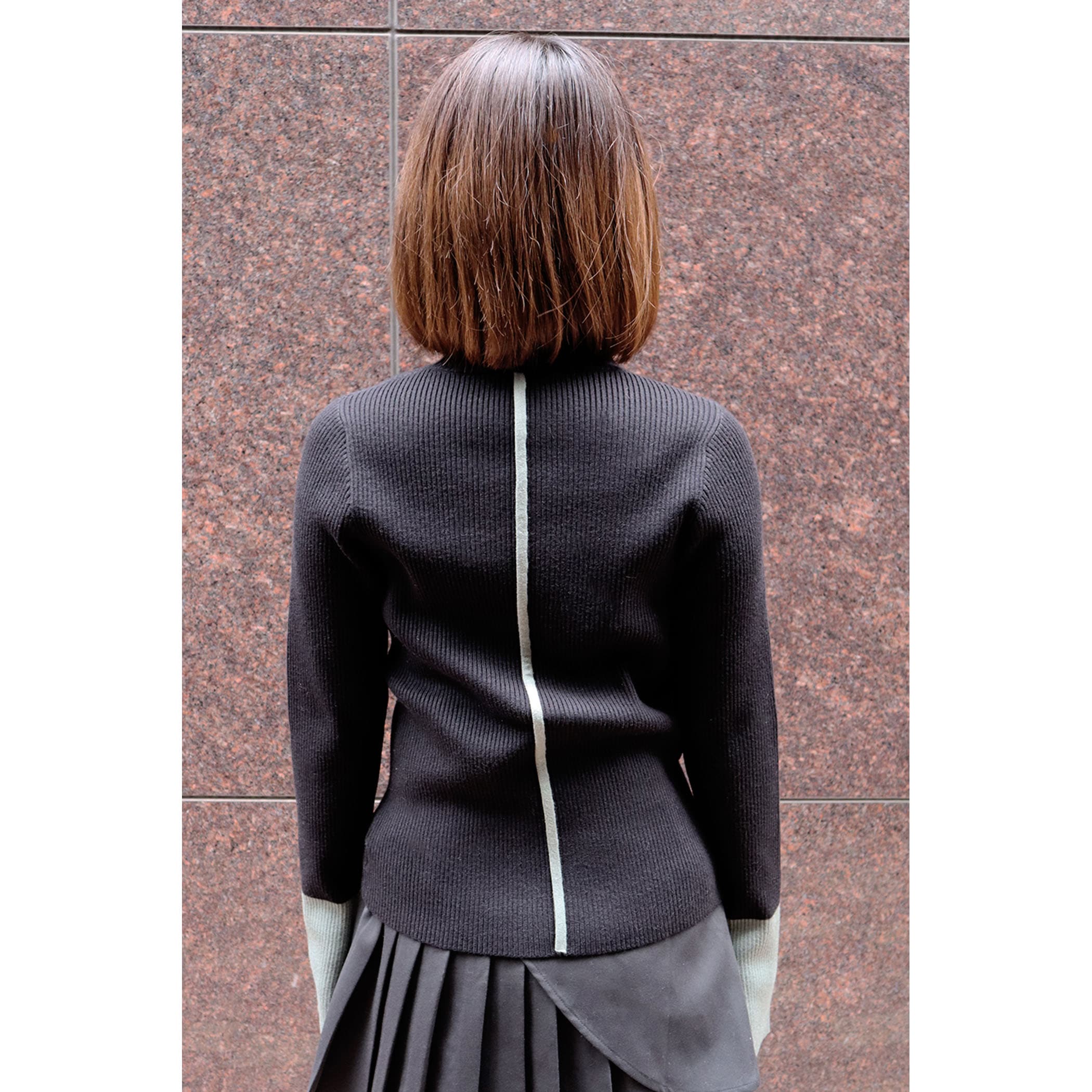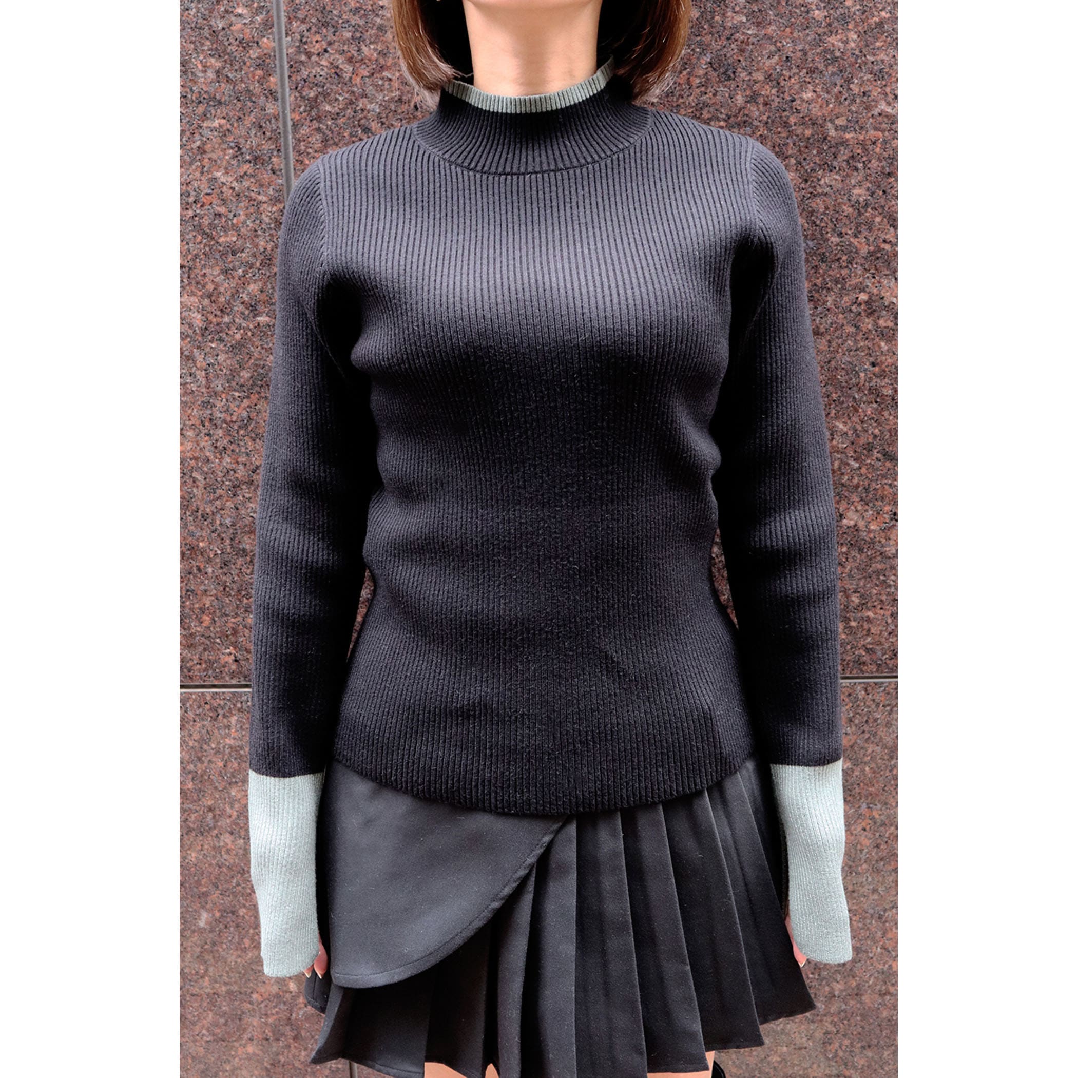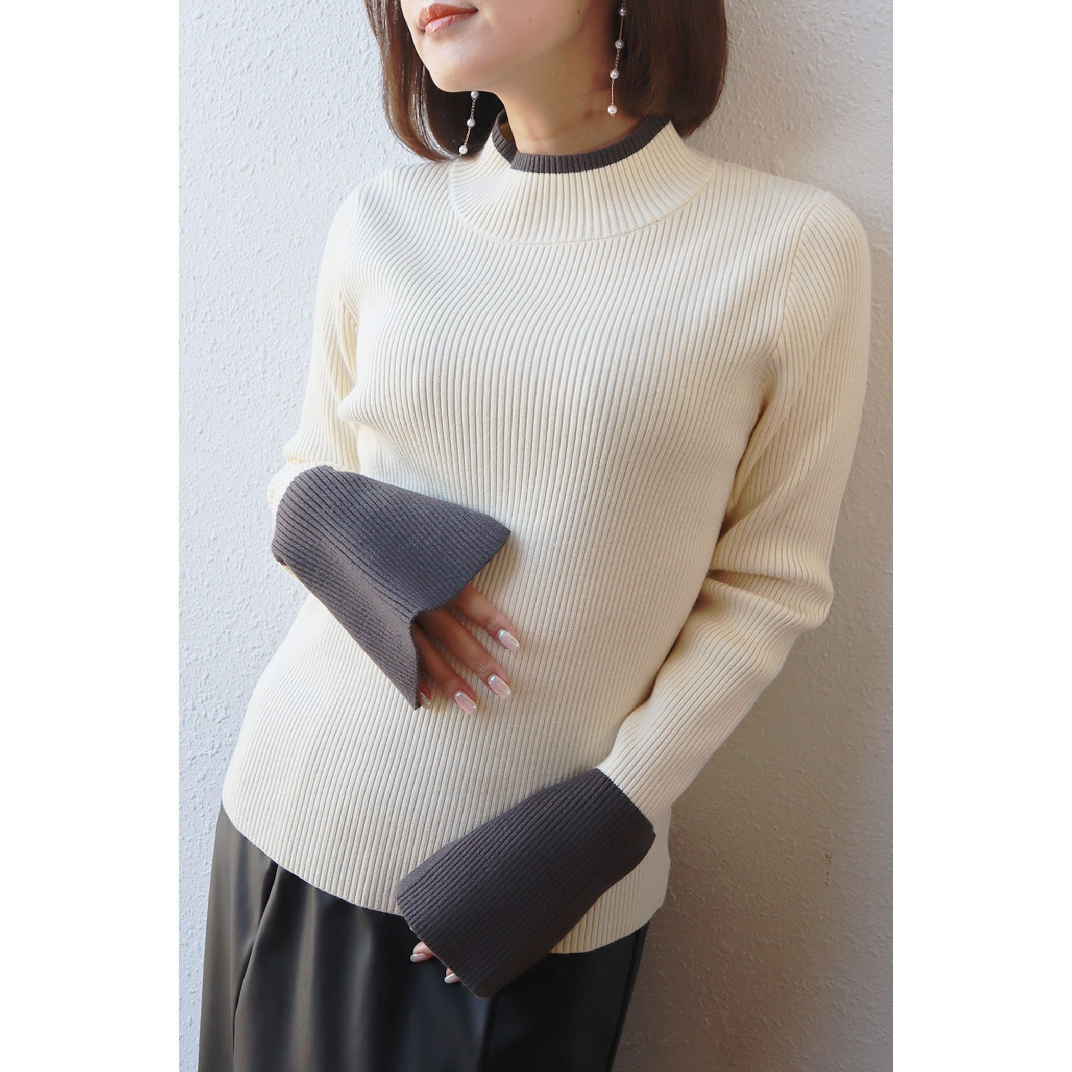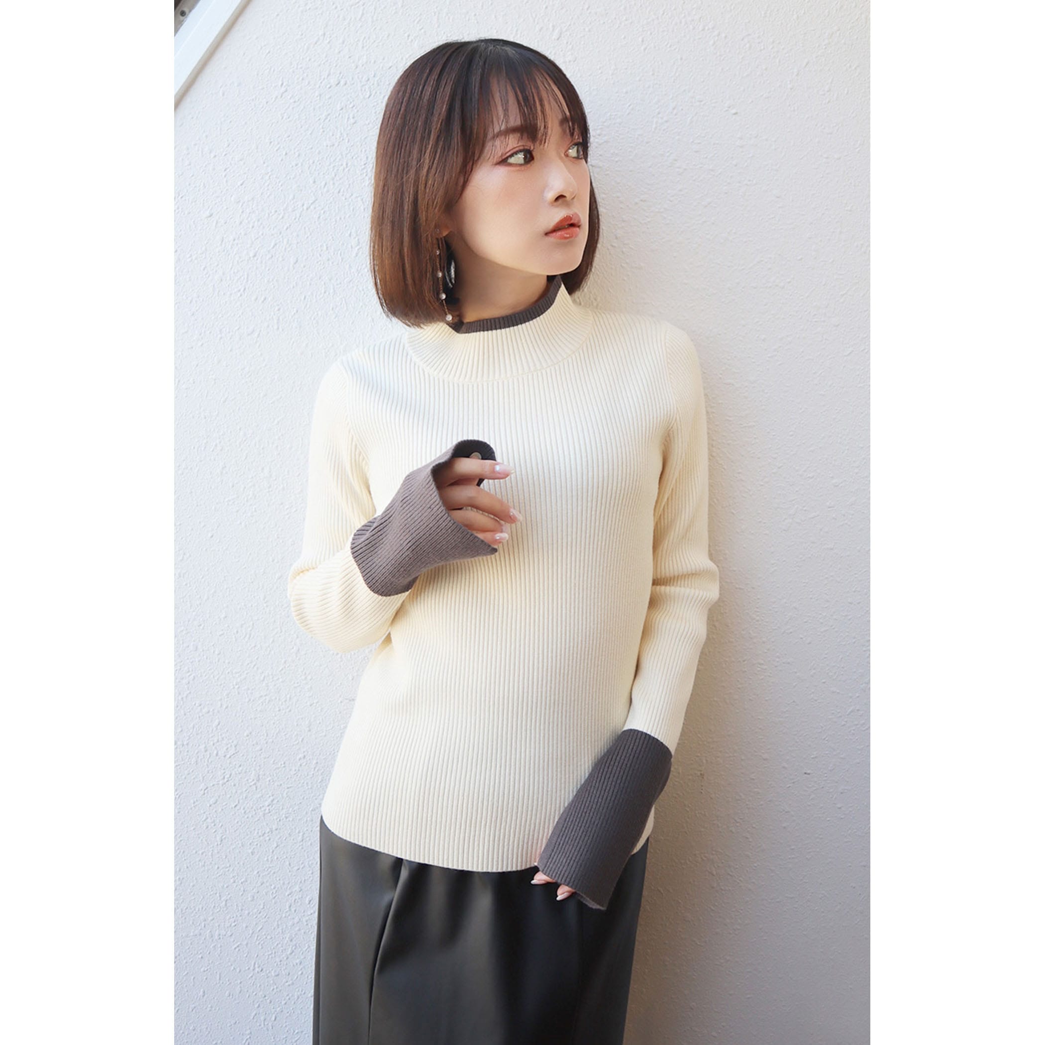 バイカラーがアクセントになるリブニット。安心感のある肉厚な生地とややハリ感のある素材で、伸縮性もあり着心地抜群です!ニット特有のチクチク感もありません!配色デザインですがシンプルなので着回しのきく一枚です。