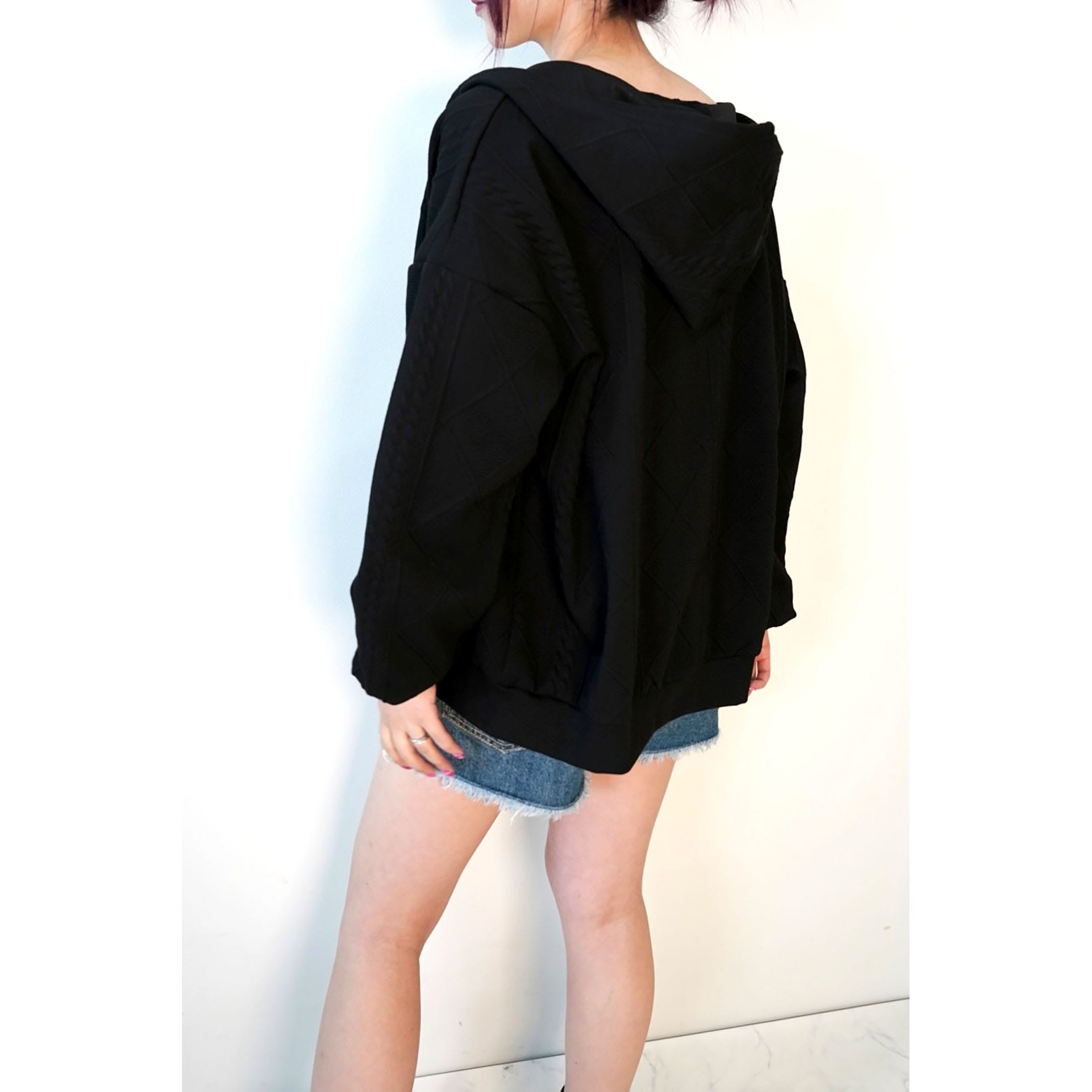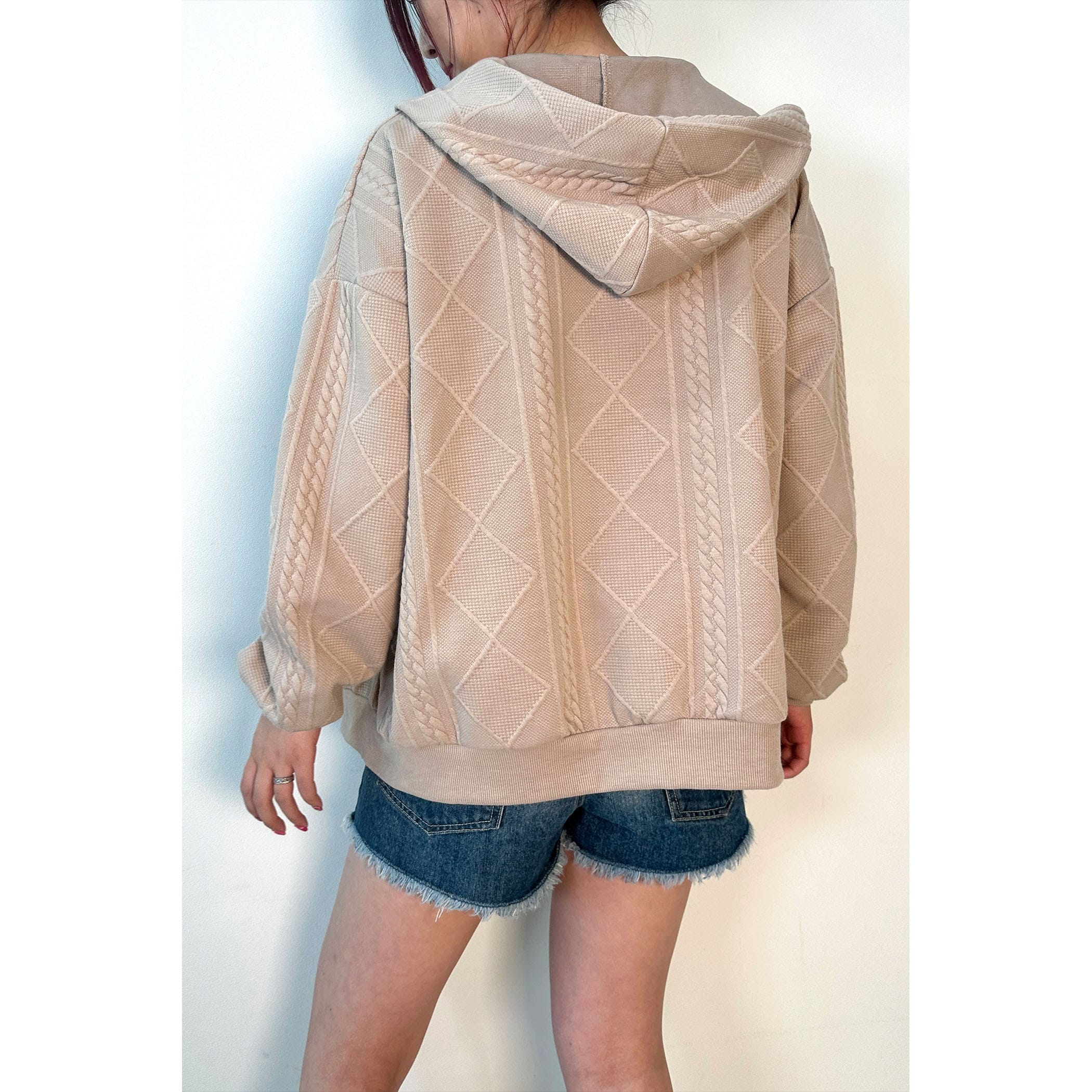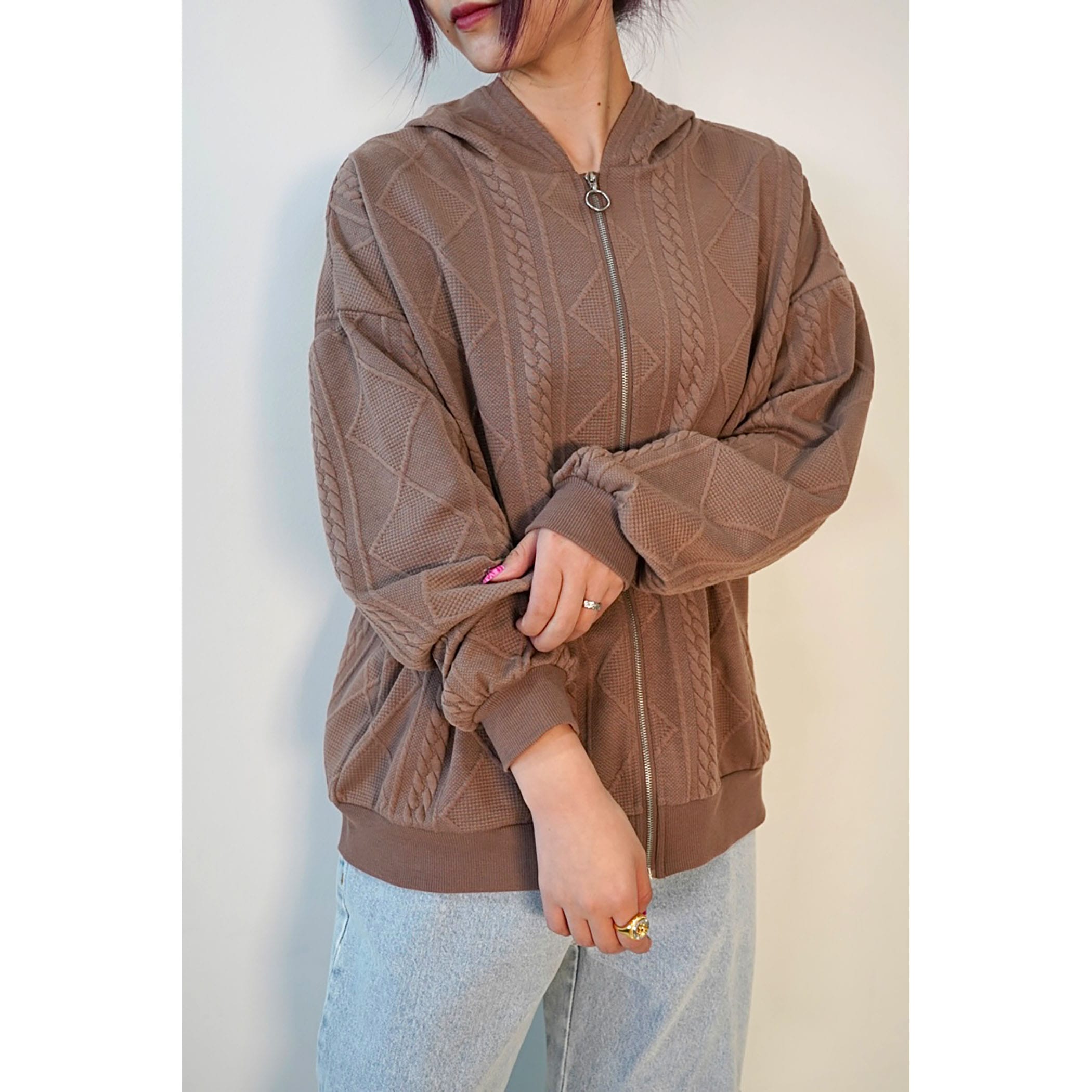 ケーブル柄が可愛いフード付きZIPパーカー。ゆったりした身丈、身巾感で着心地抜群です。ファスナーのリング引手がアクセントに◎