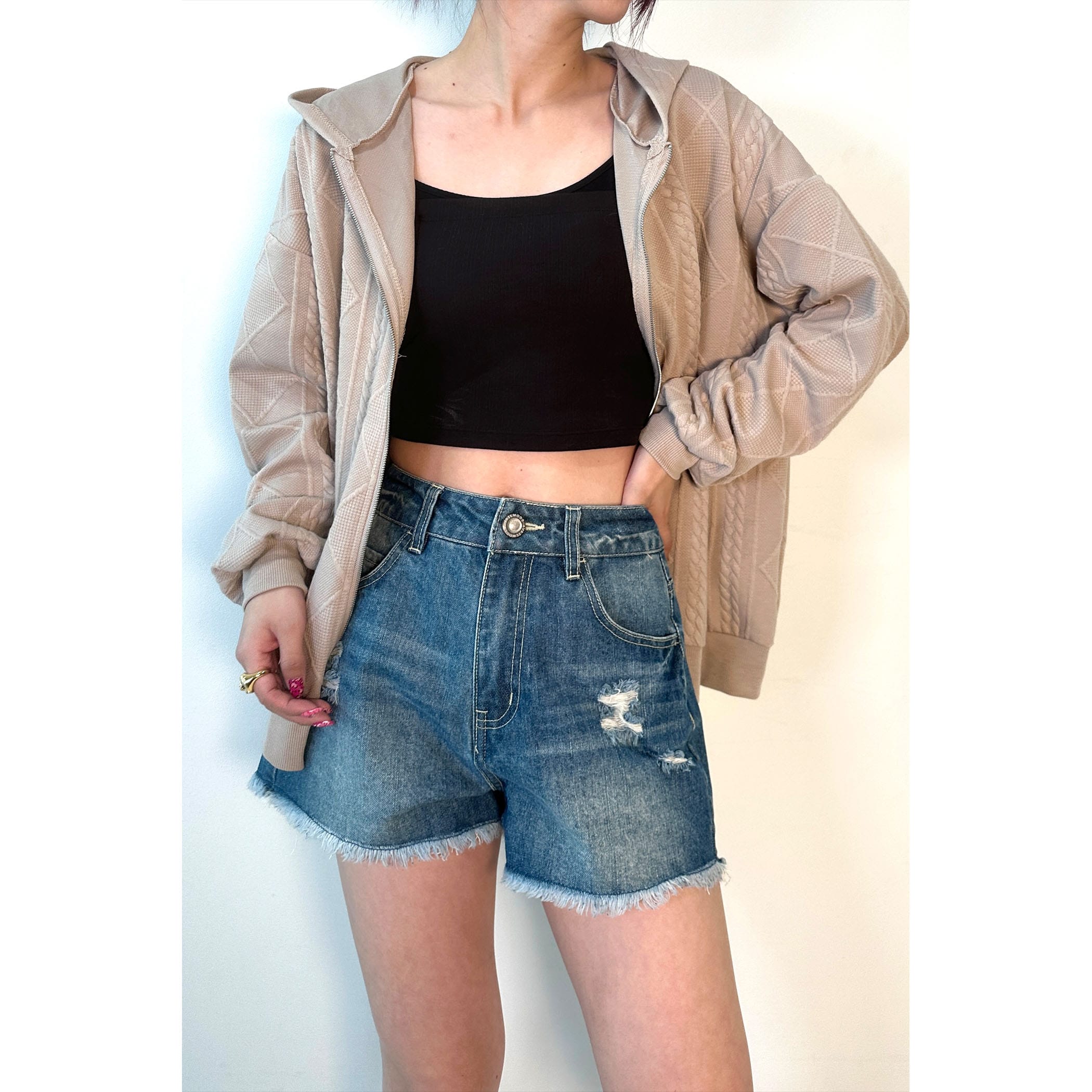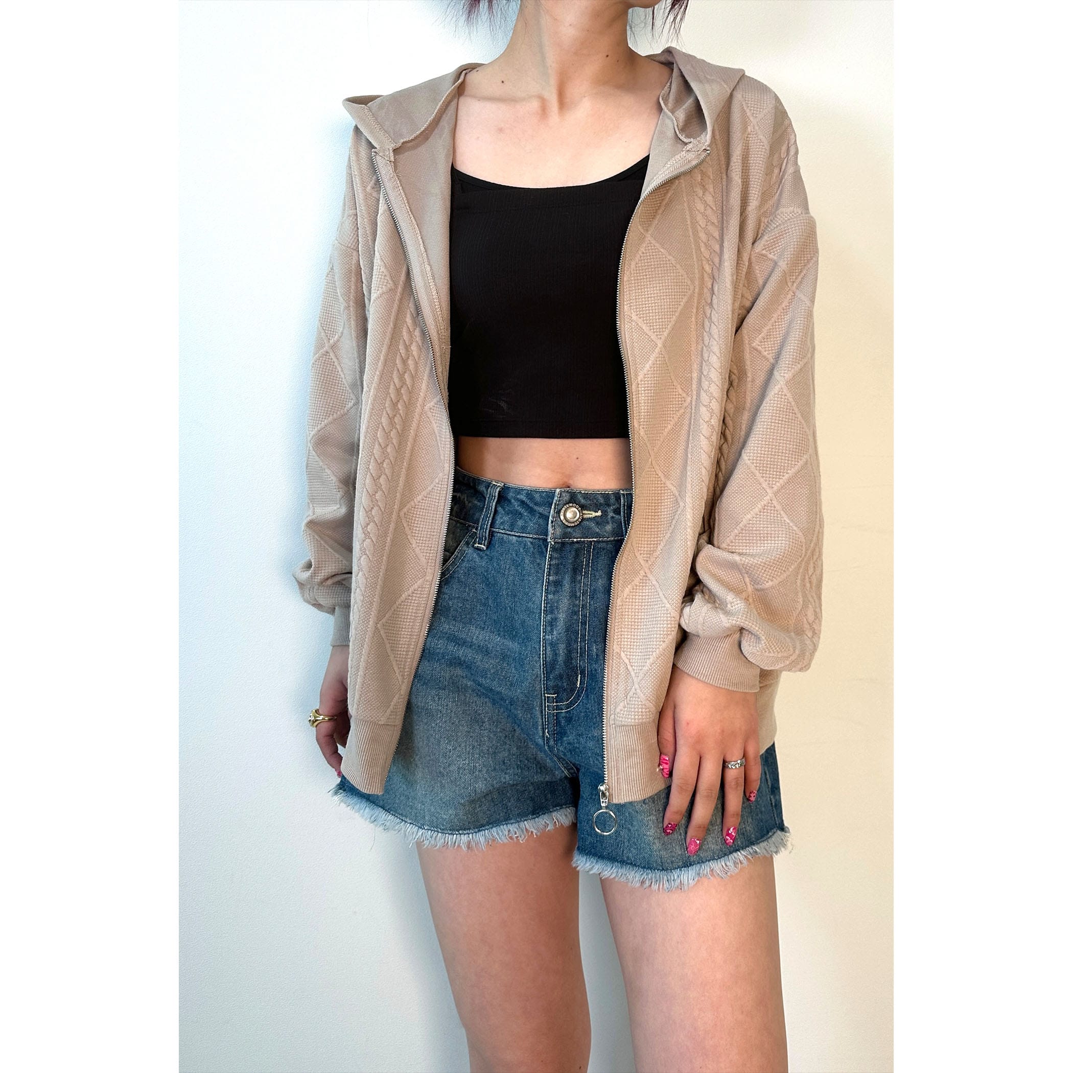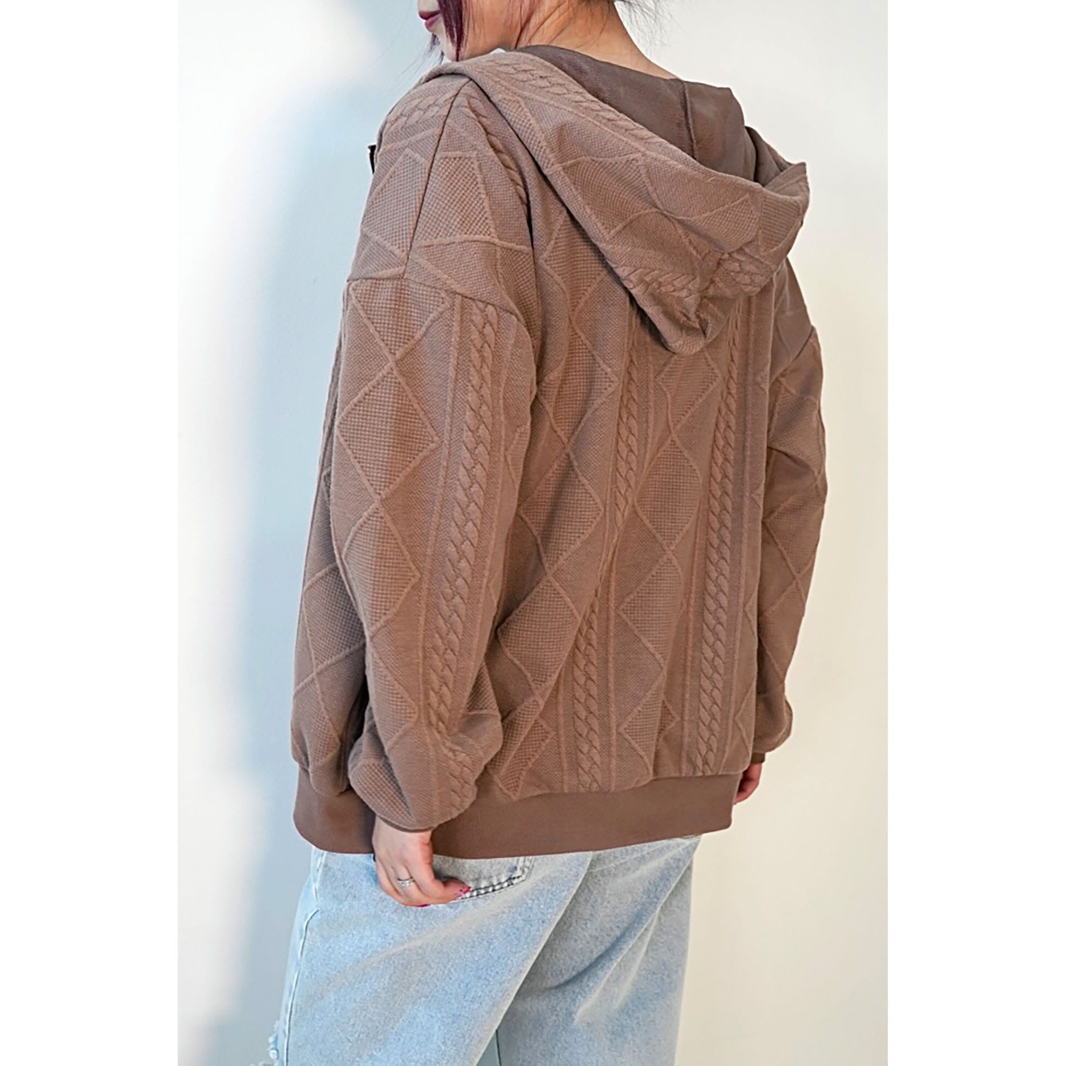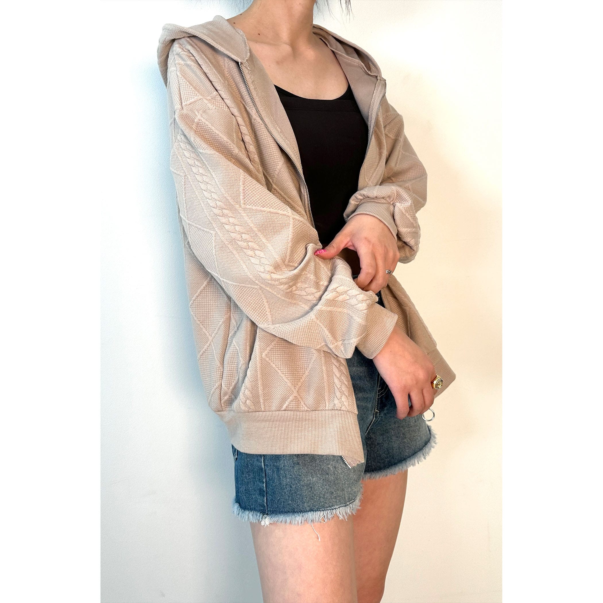 ケーブル柄が可愛いフード付きZIPパーカー。ゆったりした身丈、身巾感で着心地抜群です。ファスナーのリング引手がアクセントに◎