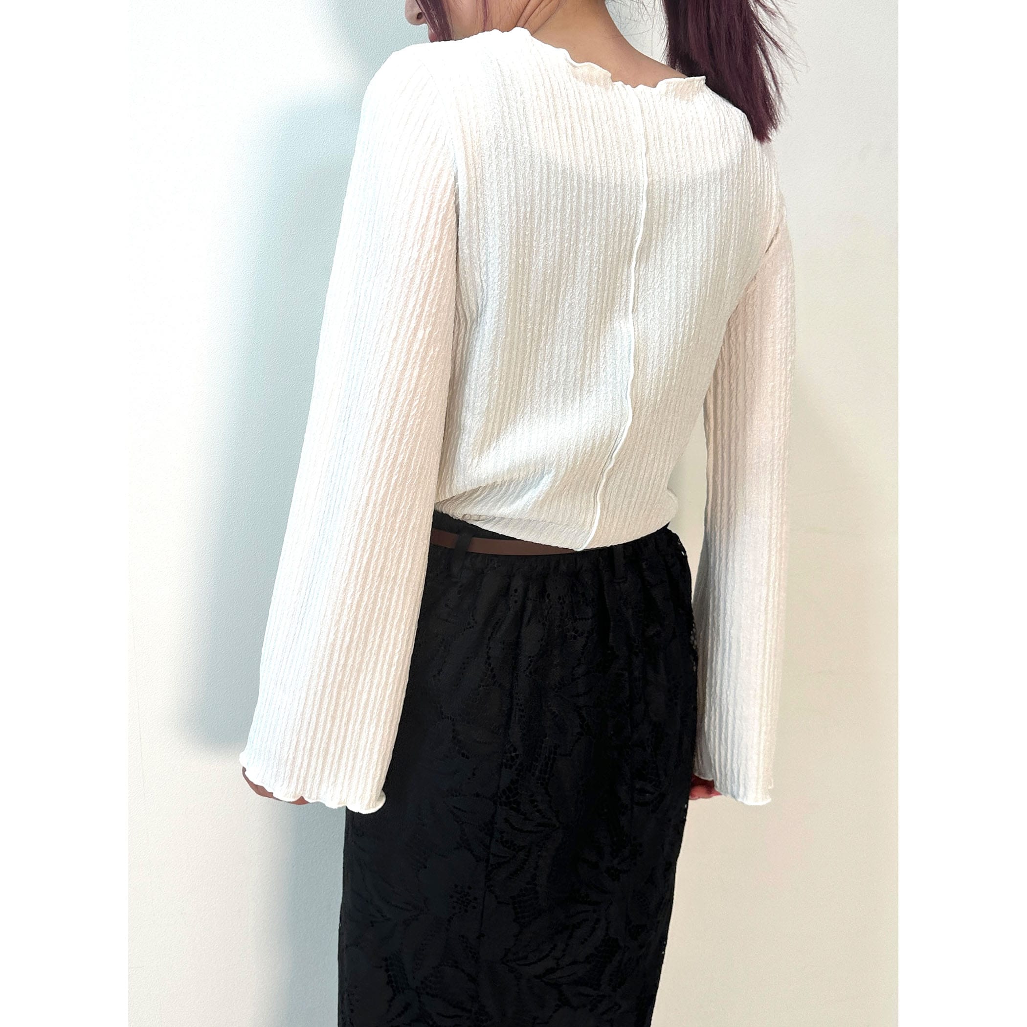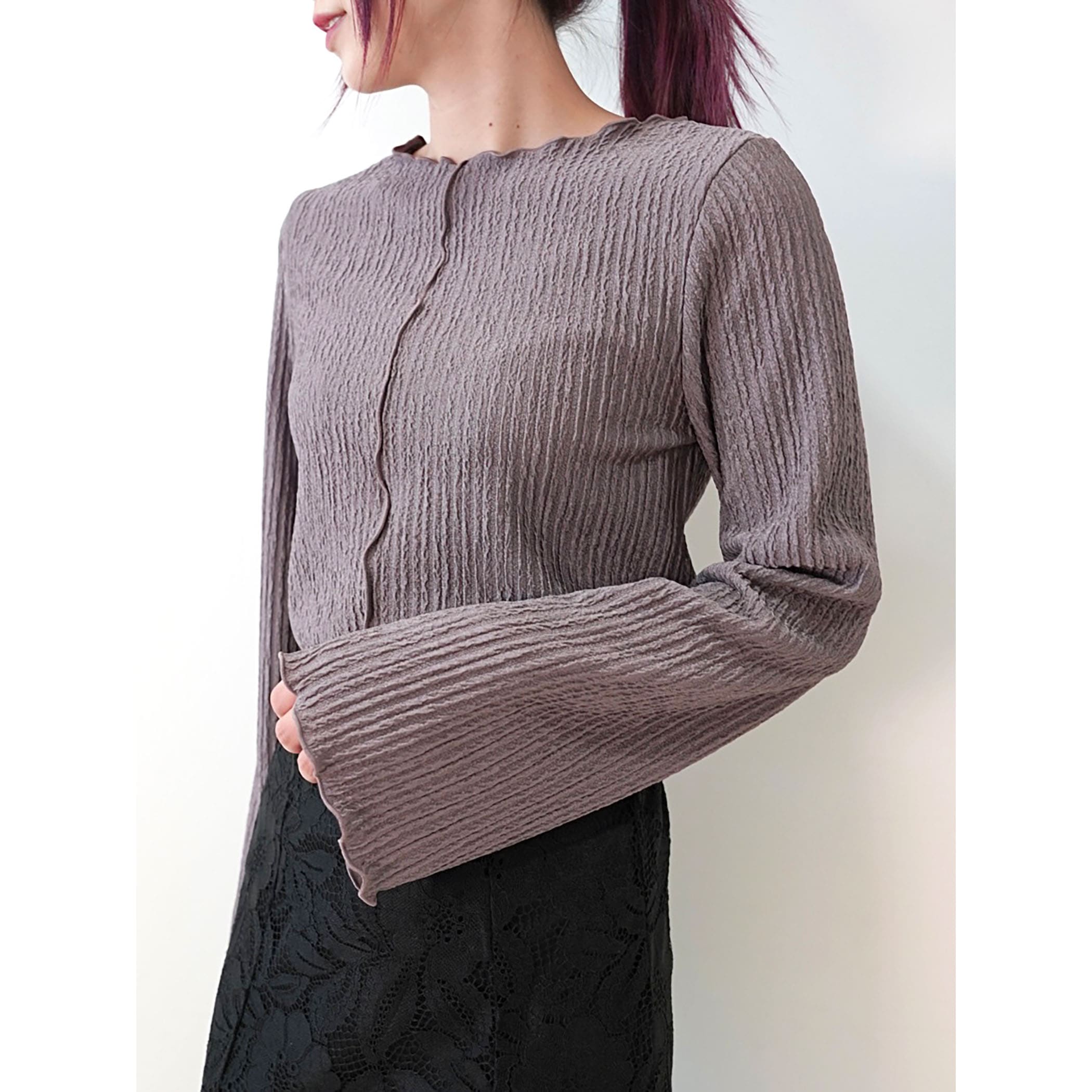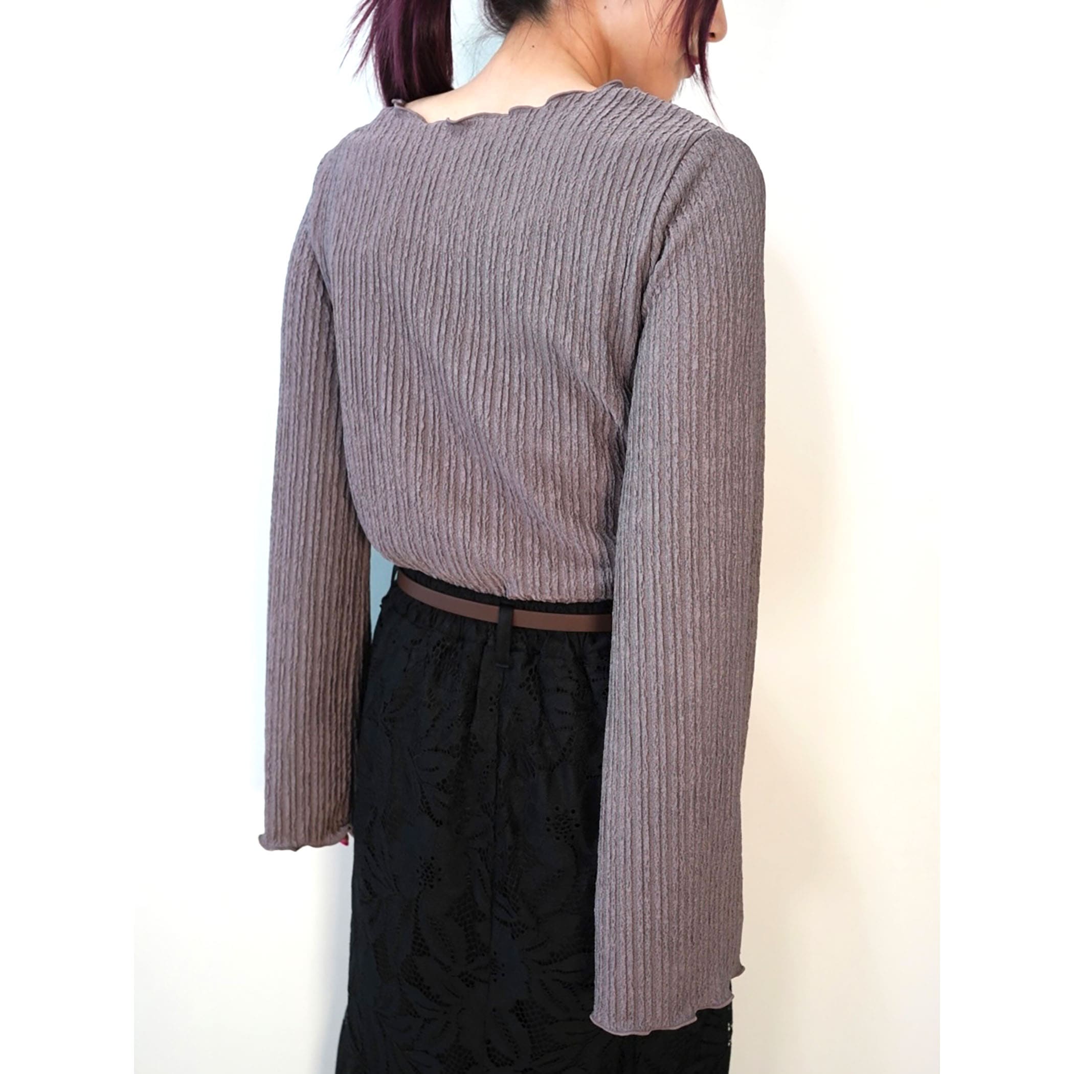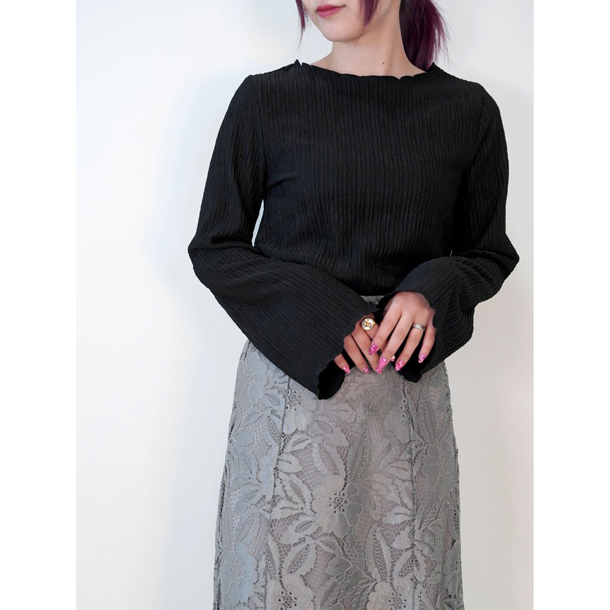 メロー仕様が可愛い、前後2WAYで着用可能なお得感のあるトップス。袖口に向かって広がったベルスリーブがアクセント☆さりげなく柄が入ったおしゃれ感のある素材でこの1着でもコーディネートのポイントに。