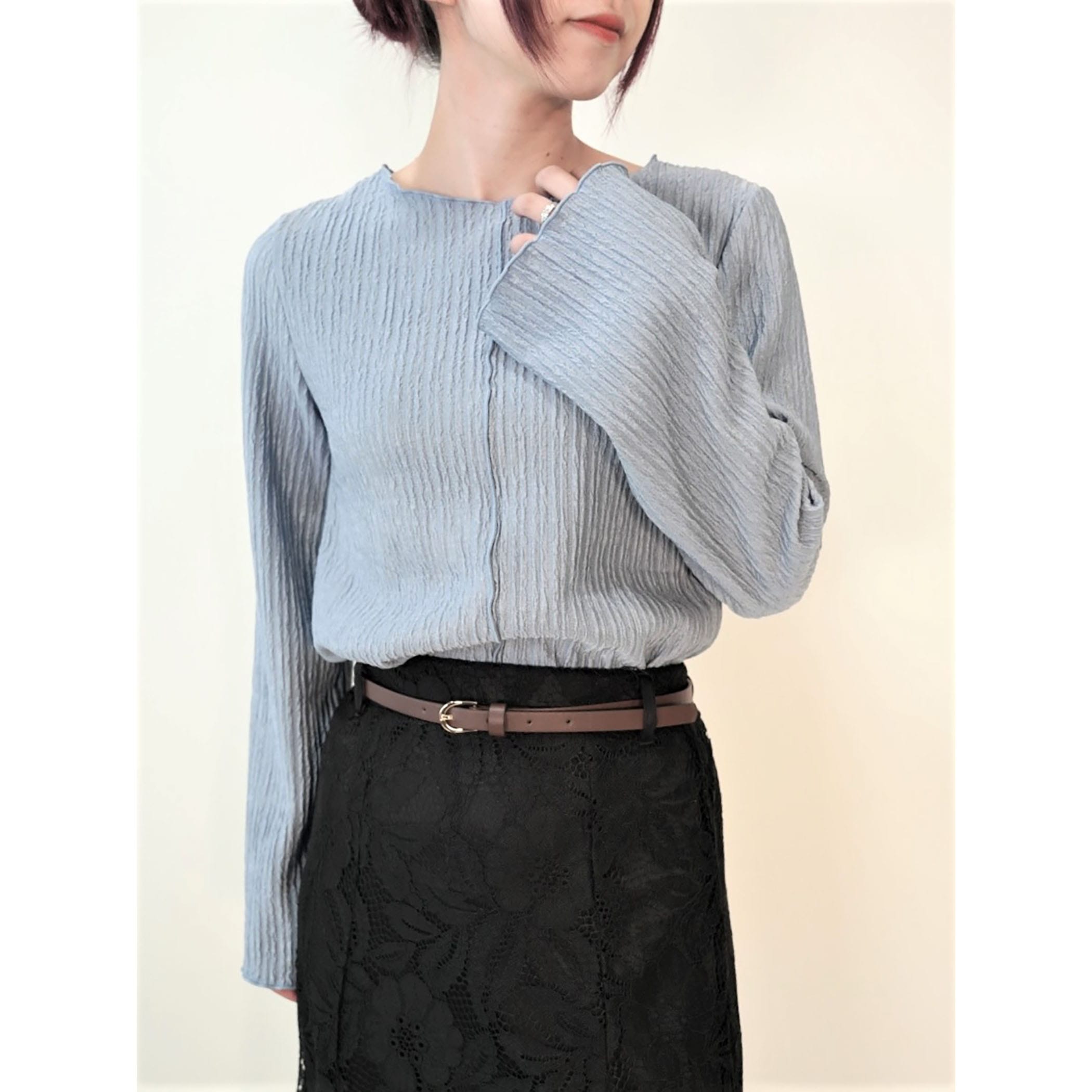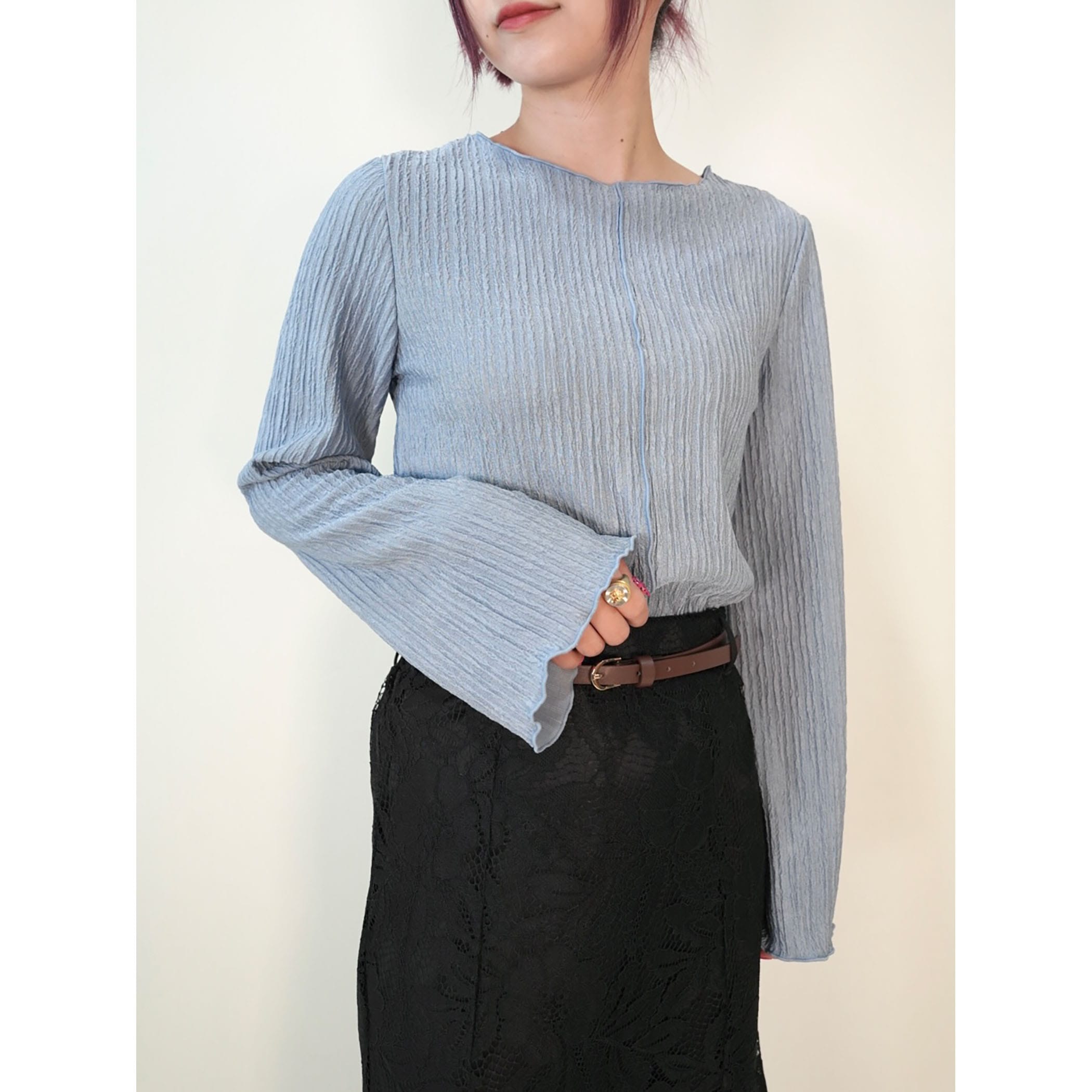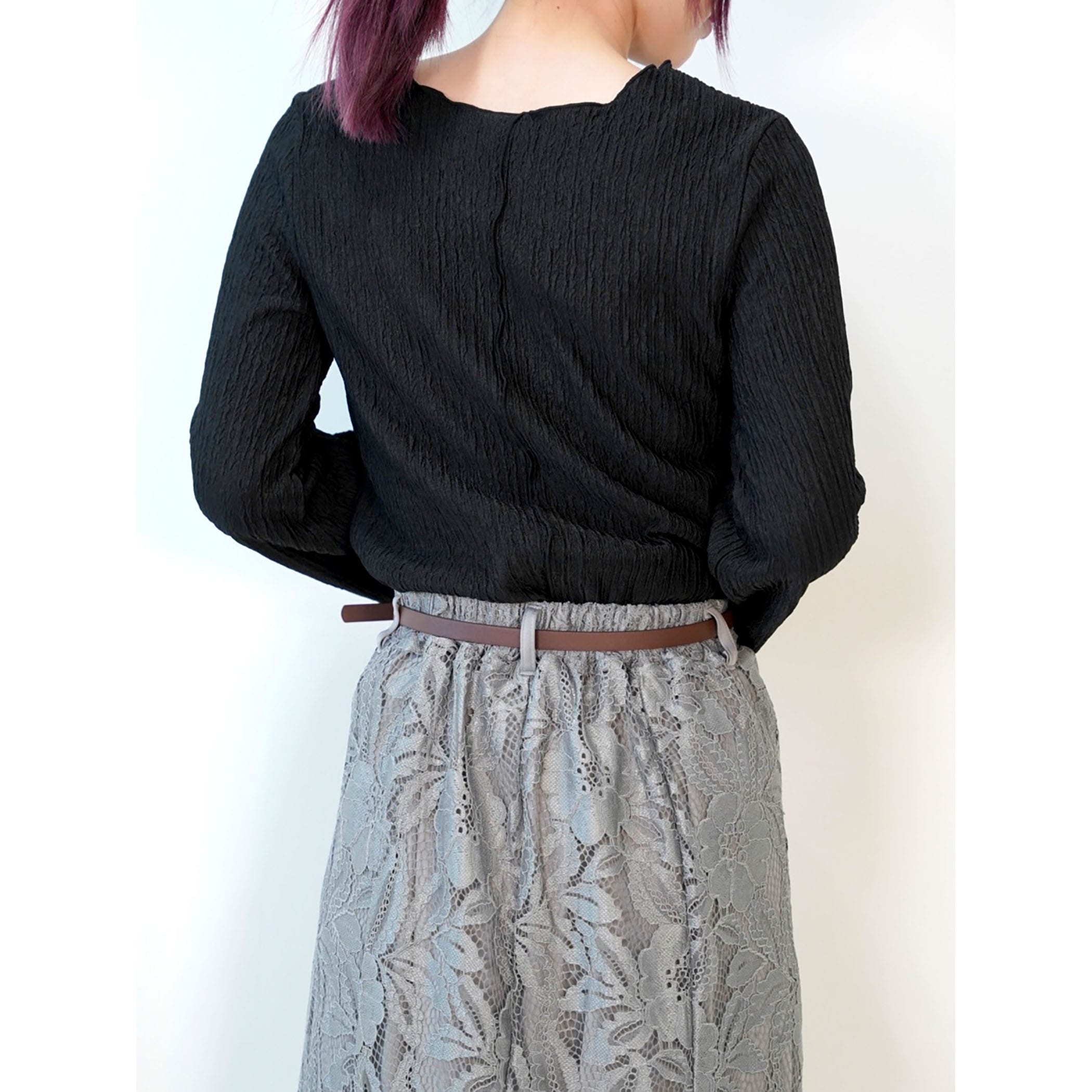 メロー仕様が可愛い、前後2WAYで着用可能なお得感のあるトップス。袖口に向かって広がったベルスリーブがアクセント☆さりげなく柄が入ったおしゃれ感のある素材でこの1着でもコーディネートのポイントに。